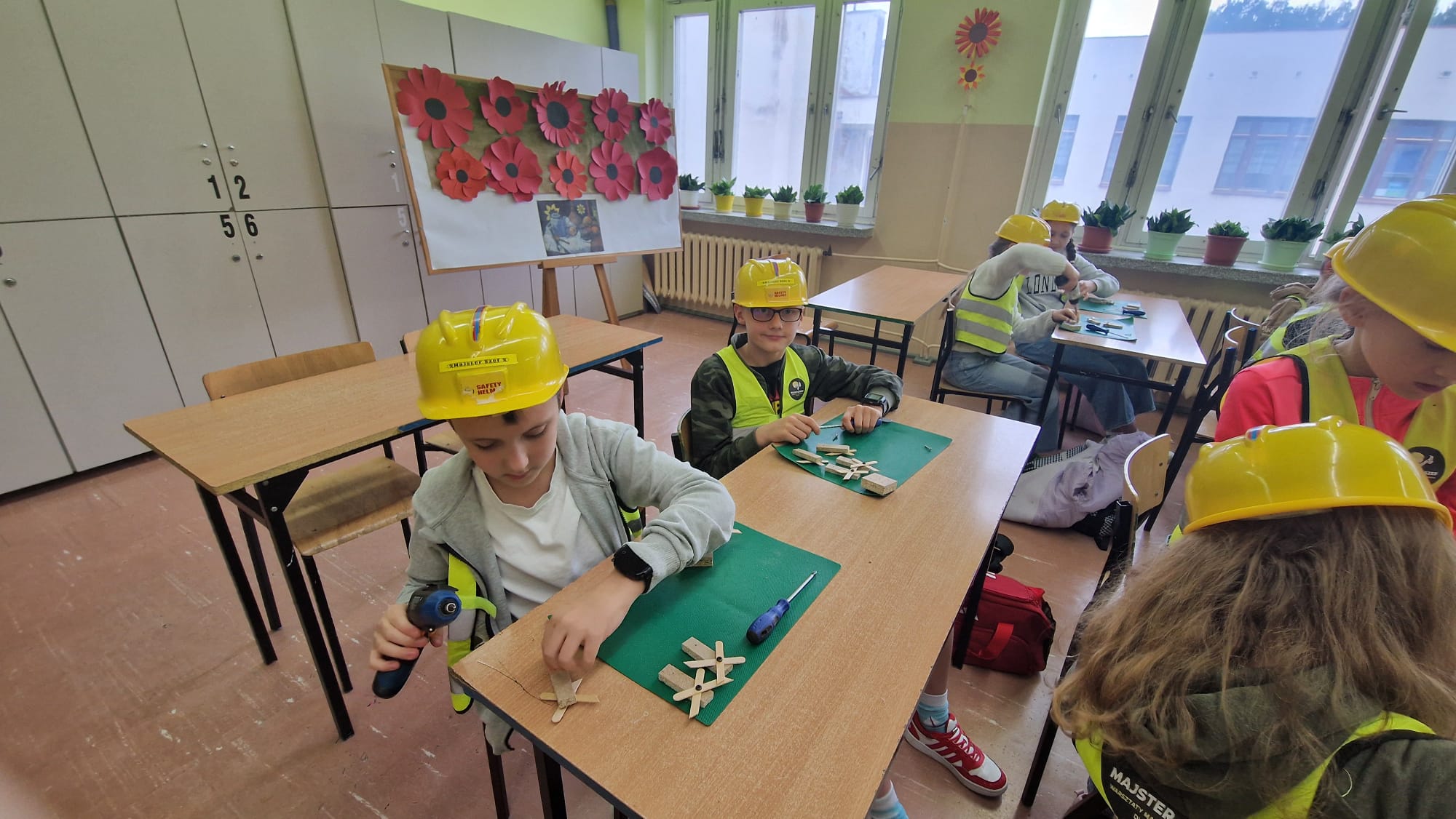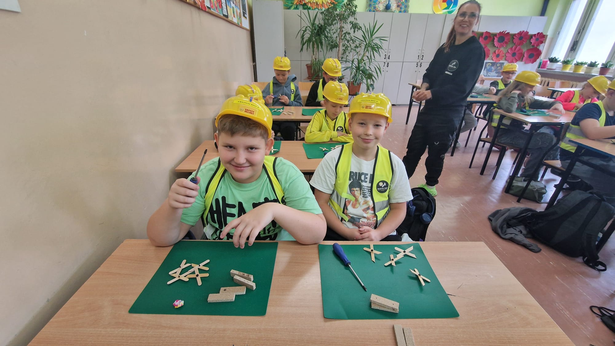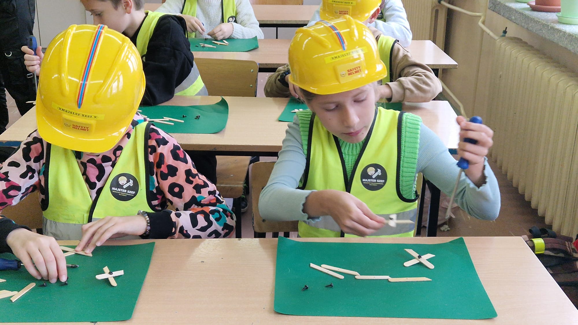 Zarówno chłopcy jak i dziewczynki doskonale poradzili sobie z wierceniem, wykręcaniem i przebijaniem drewnianych elementów.