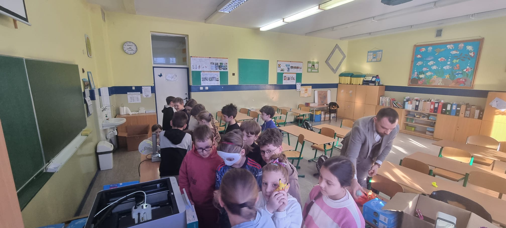 Dzieci z ogromnym zainteresowaniem obserwowały pracę drukarki 3D i mogły zobaczyć, jak krok po kroku powstają przedmioty. Zobaczyły także gotowe wydruki – w tym ciekawe zabawki wykonane przy użyciu tej technologii.