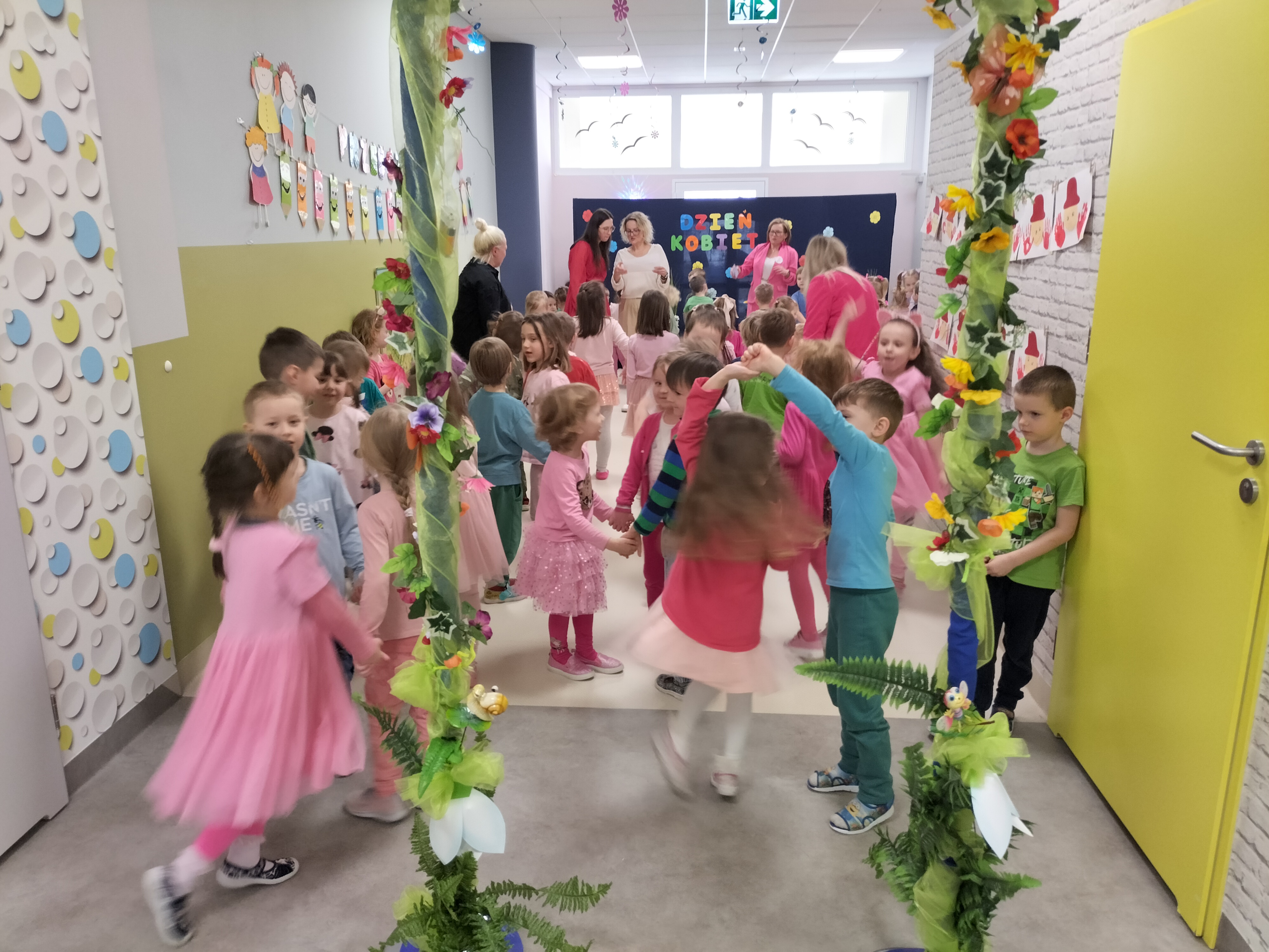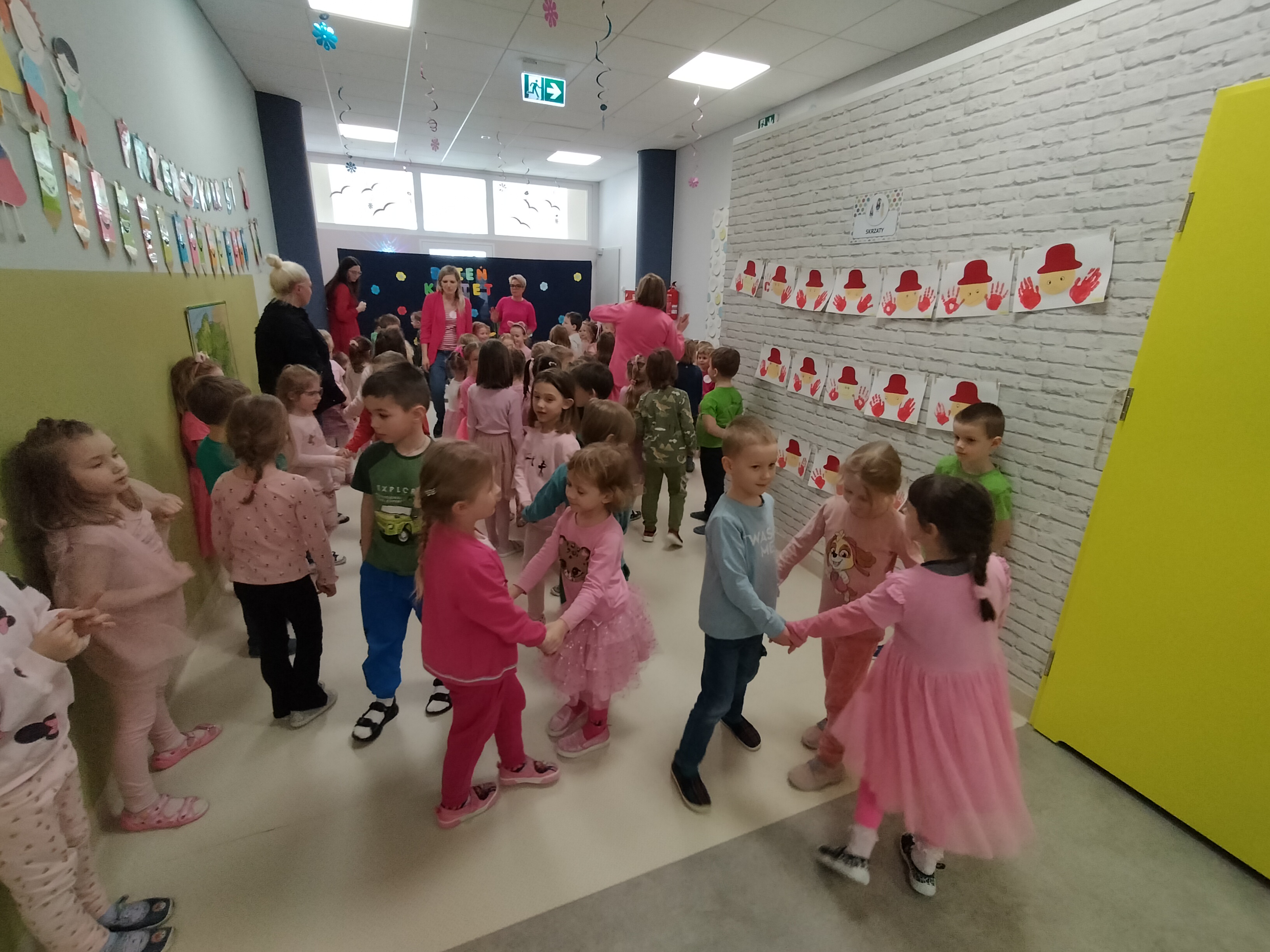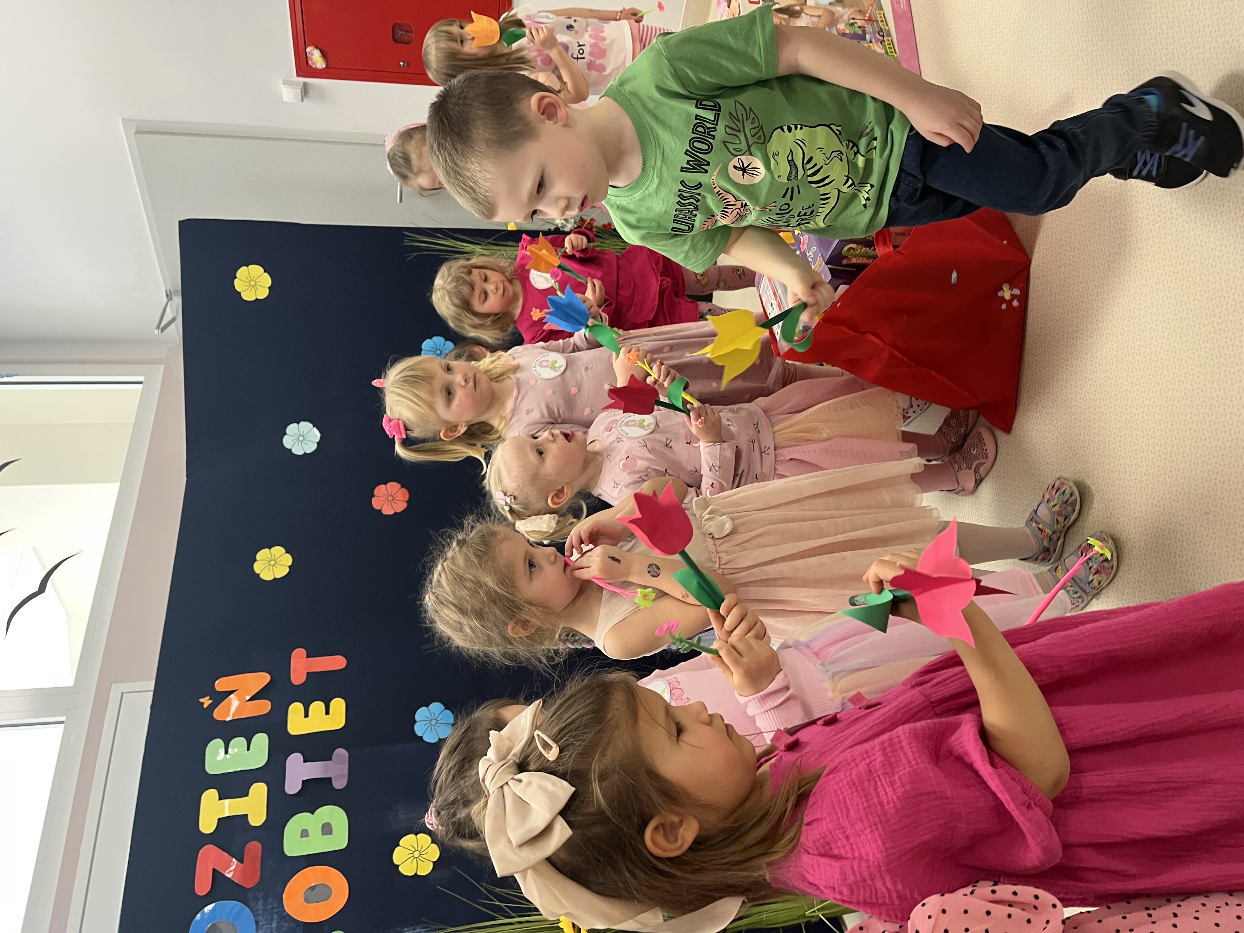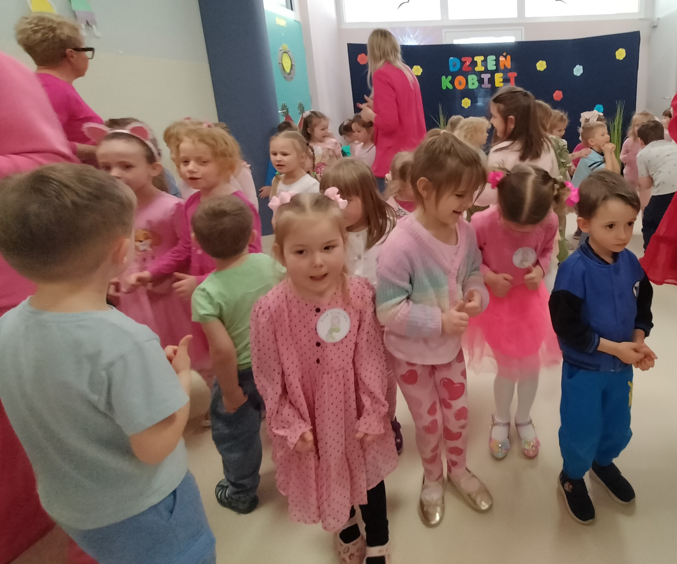 Piątek upłynął w bardzo miłej i radosnej atmosferze. Dziewczynki ubrane na różowo, a chłopcy w odcieniach zieleni i niebieskiego wspólnie świętowali Dzień Kobiet.