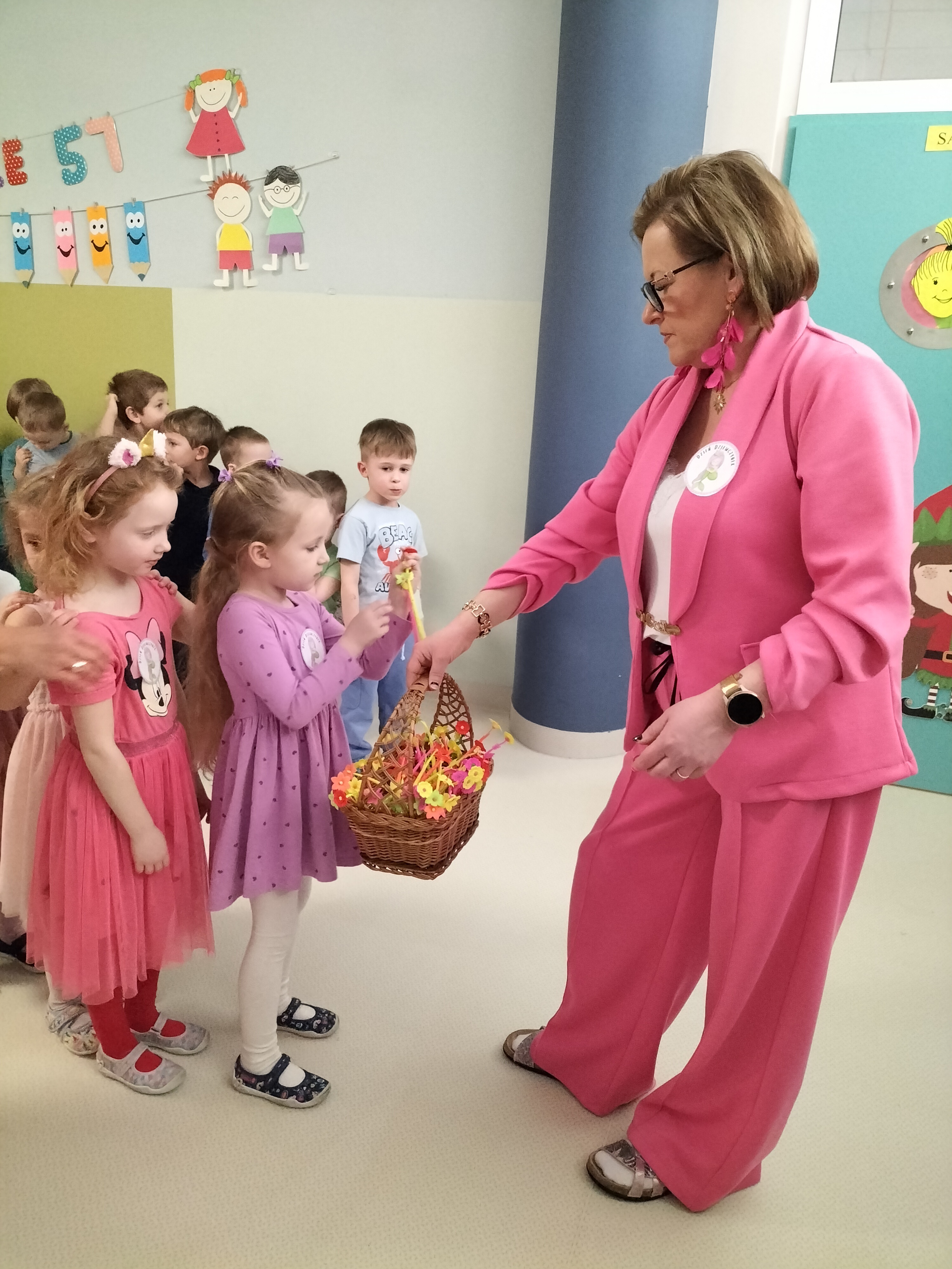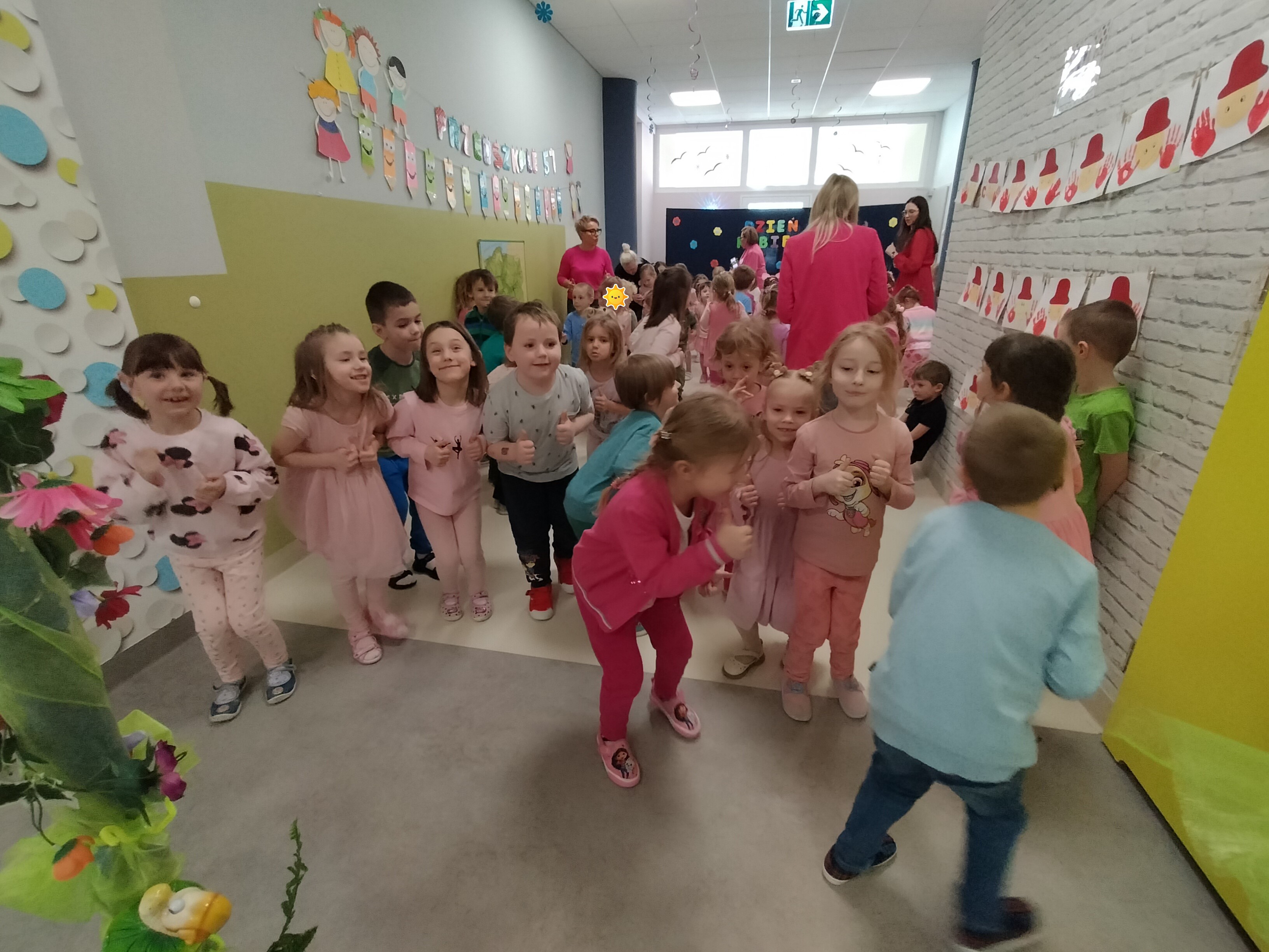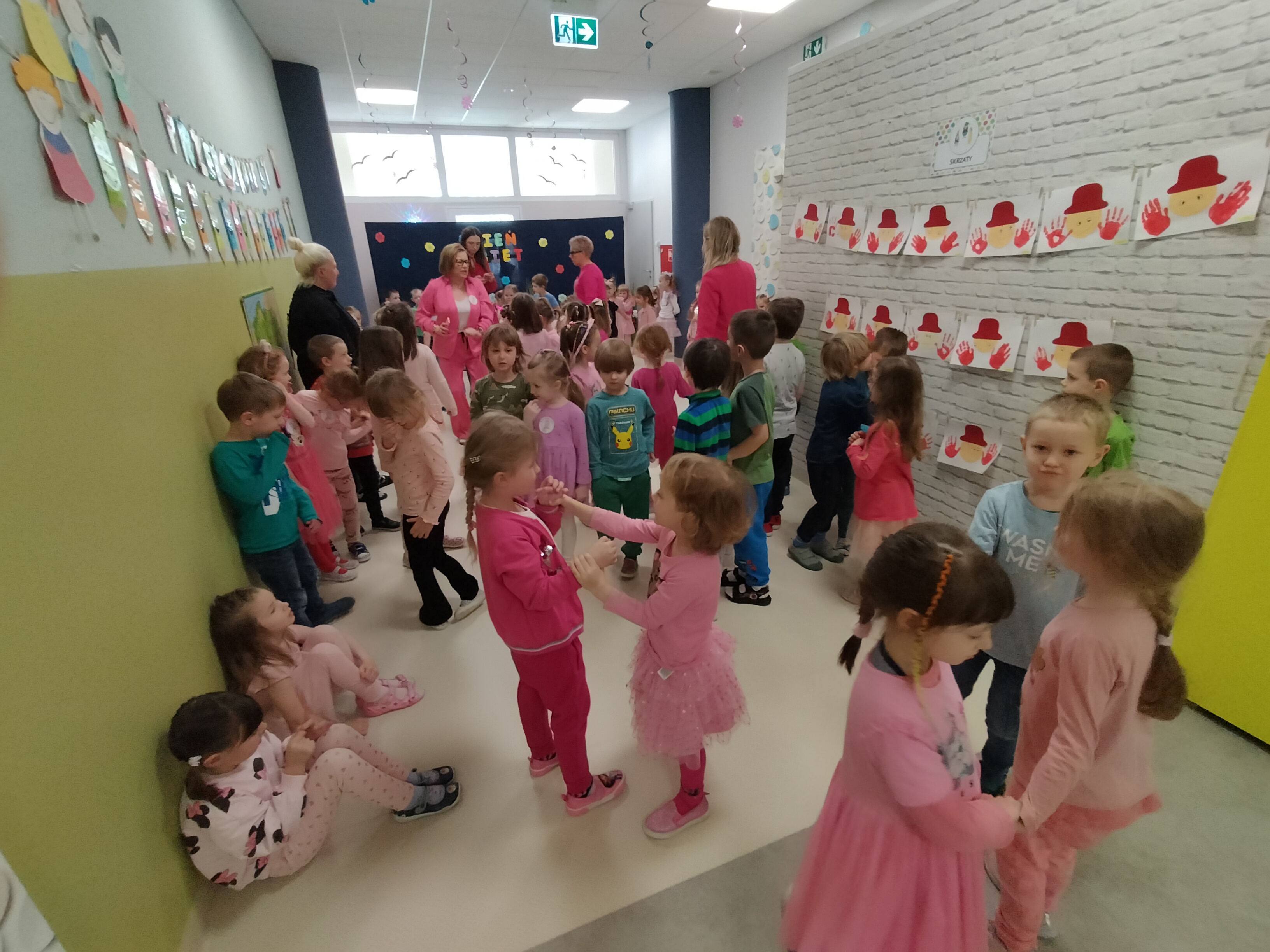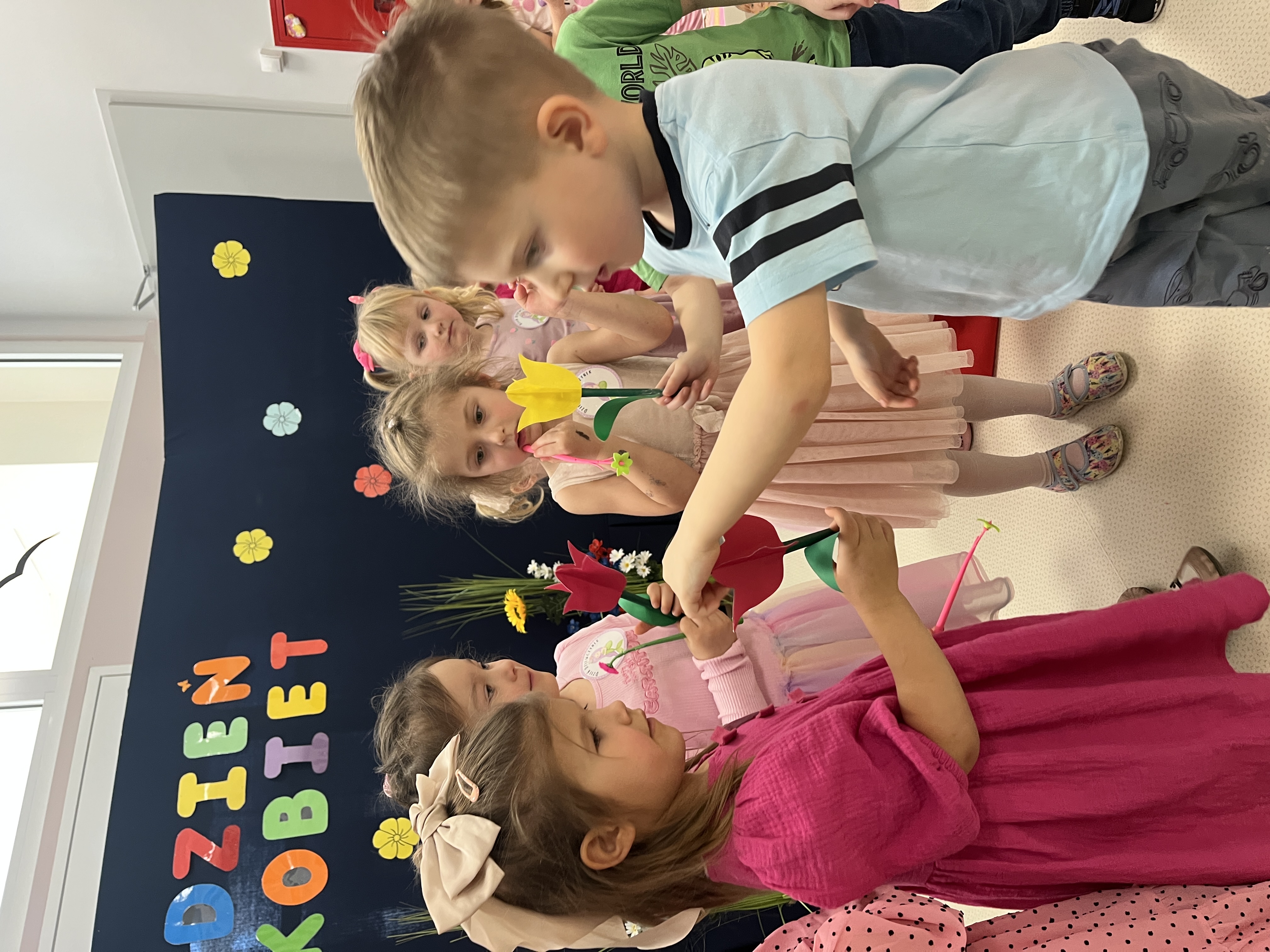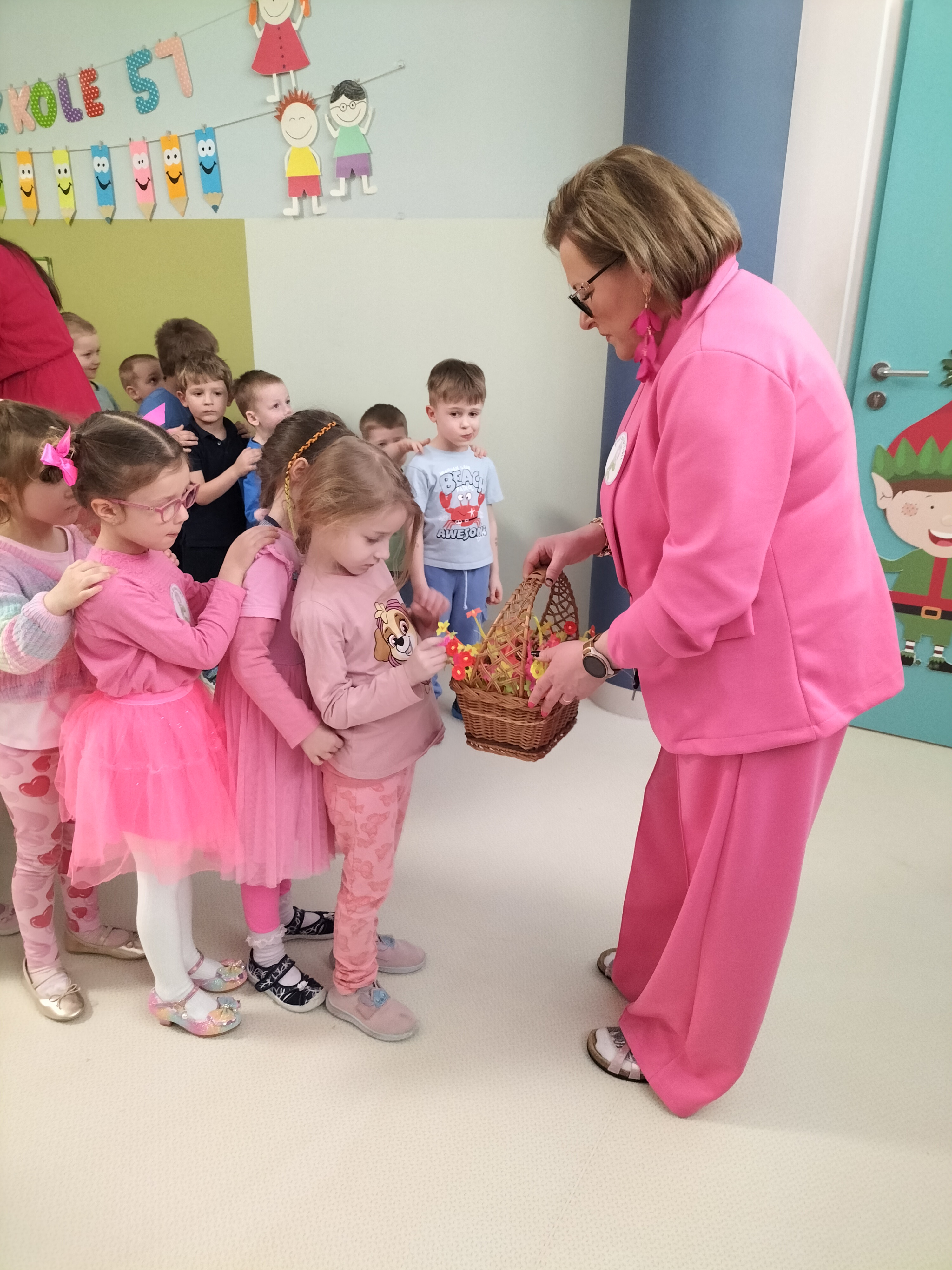 Piątek upłynął w bardzo miłej i radosnej atmosferze. Dziewczynki ubrane na różowo, a chłopcy w odcieniach zieleni i niebieskiego wspólnie świętowali Dzień Kobiet.