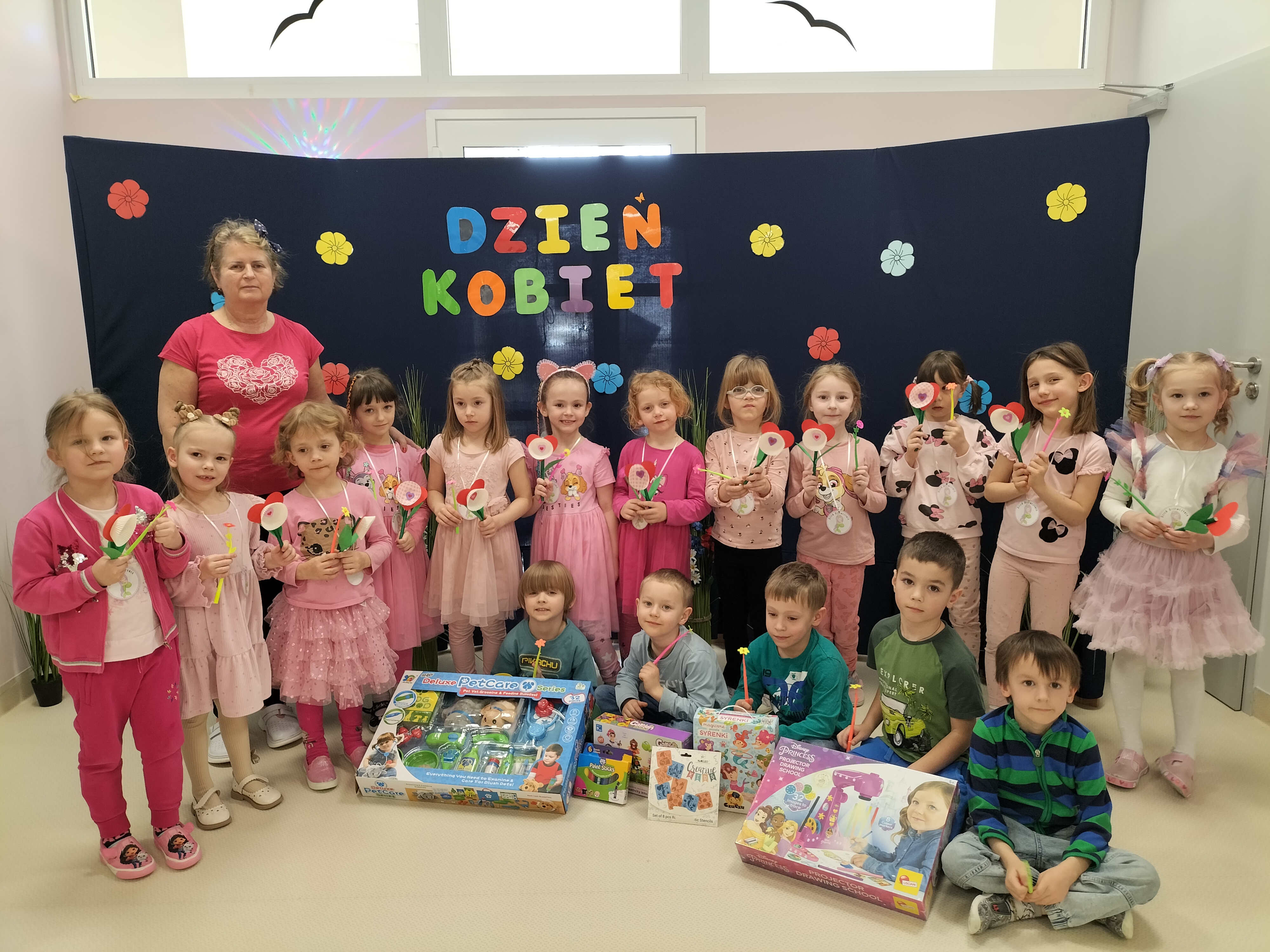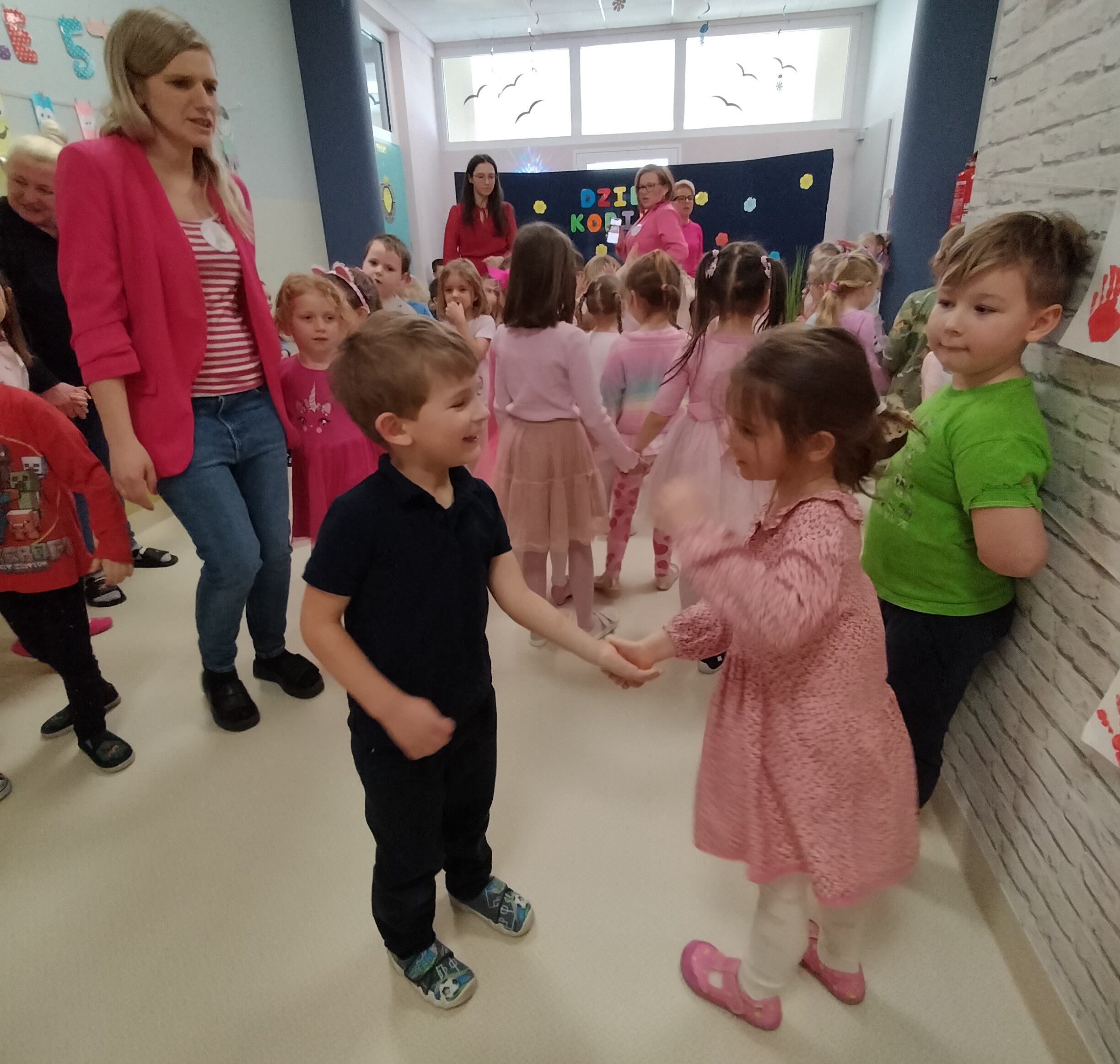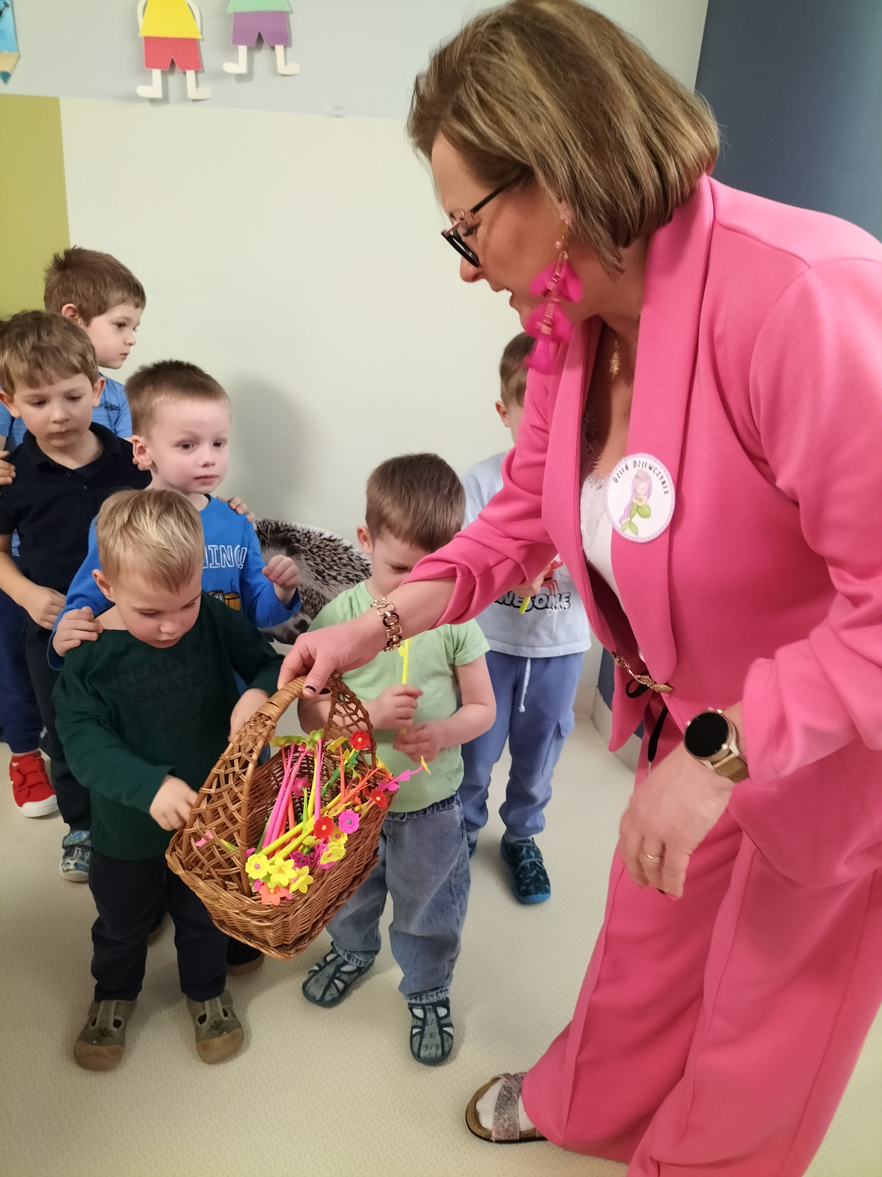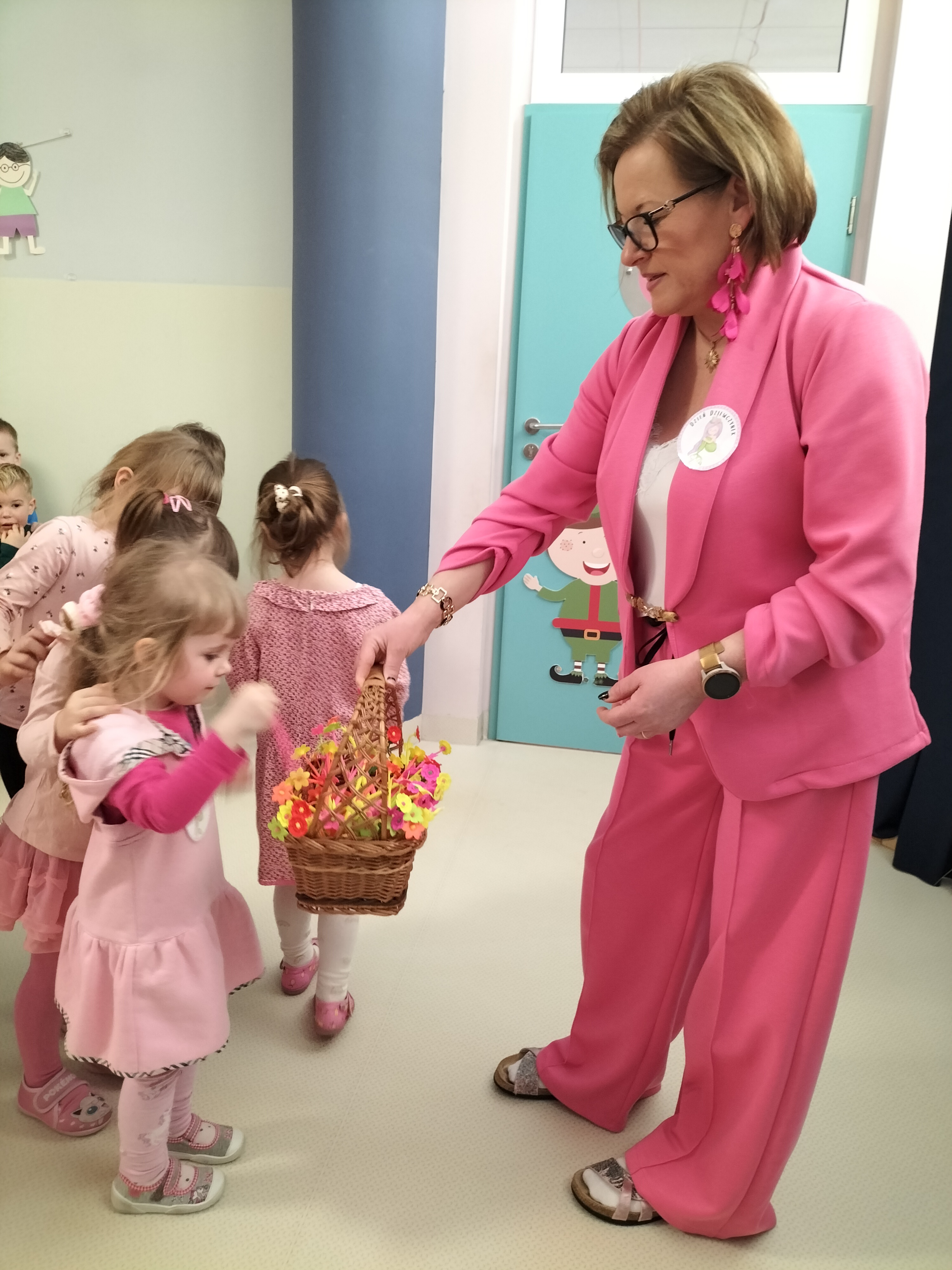 Piątek upłynął w bardzo miłej i radosnej atmosferze. Dziewczynki ubrane na różowo, a chłopcy w odcieniach zieleni i niebieskiego wspólnie świętowali Dzień Kobiet.