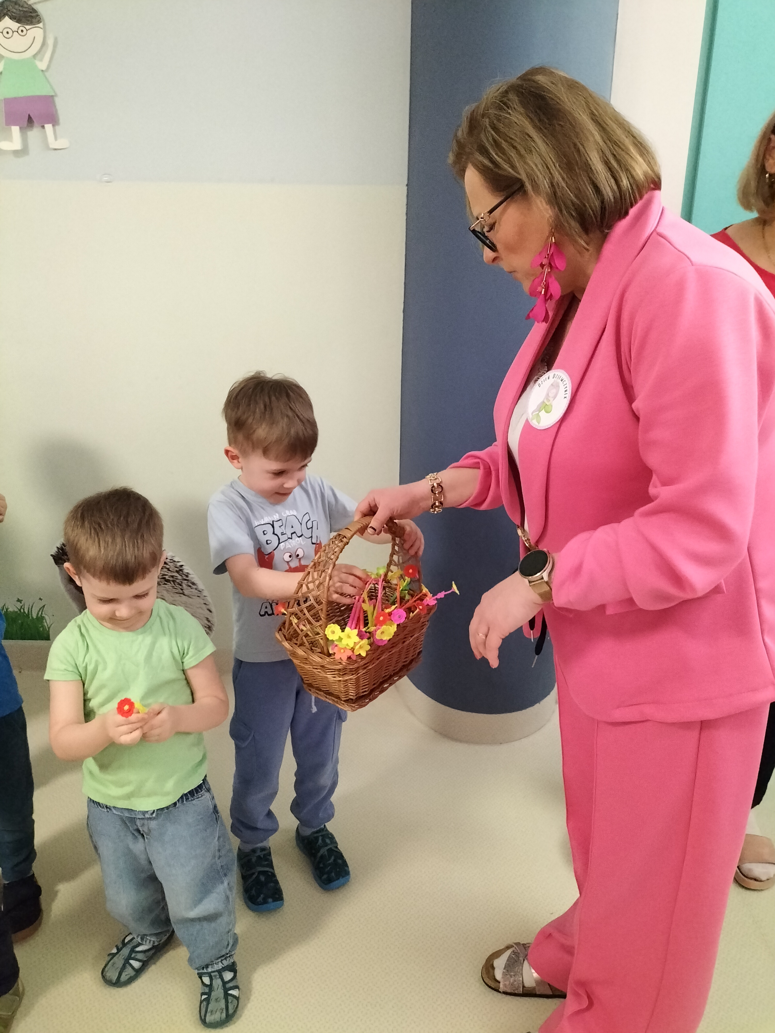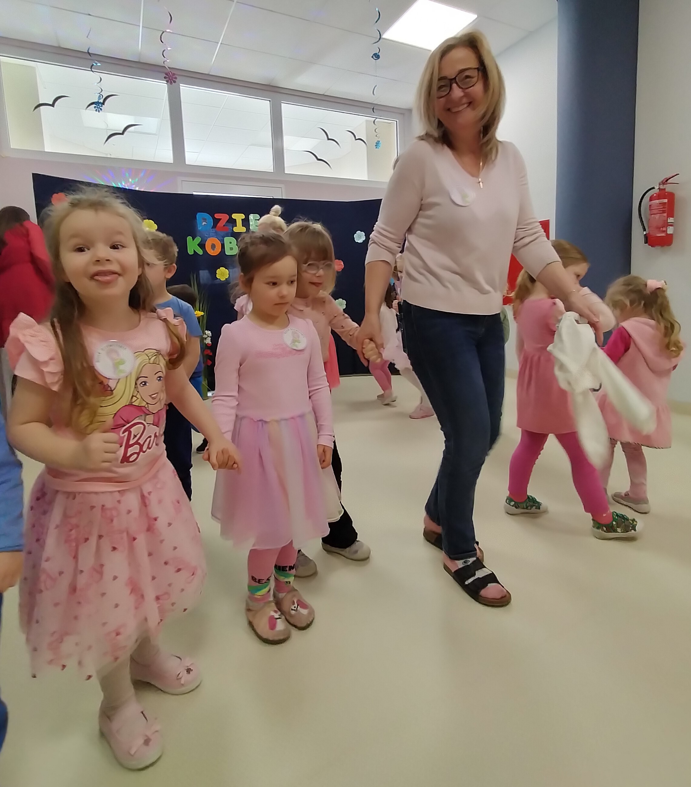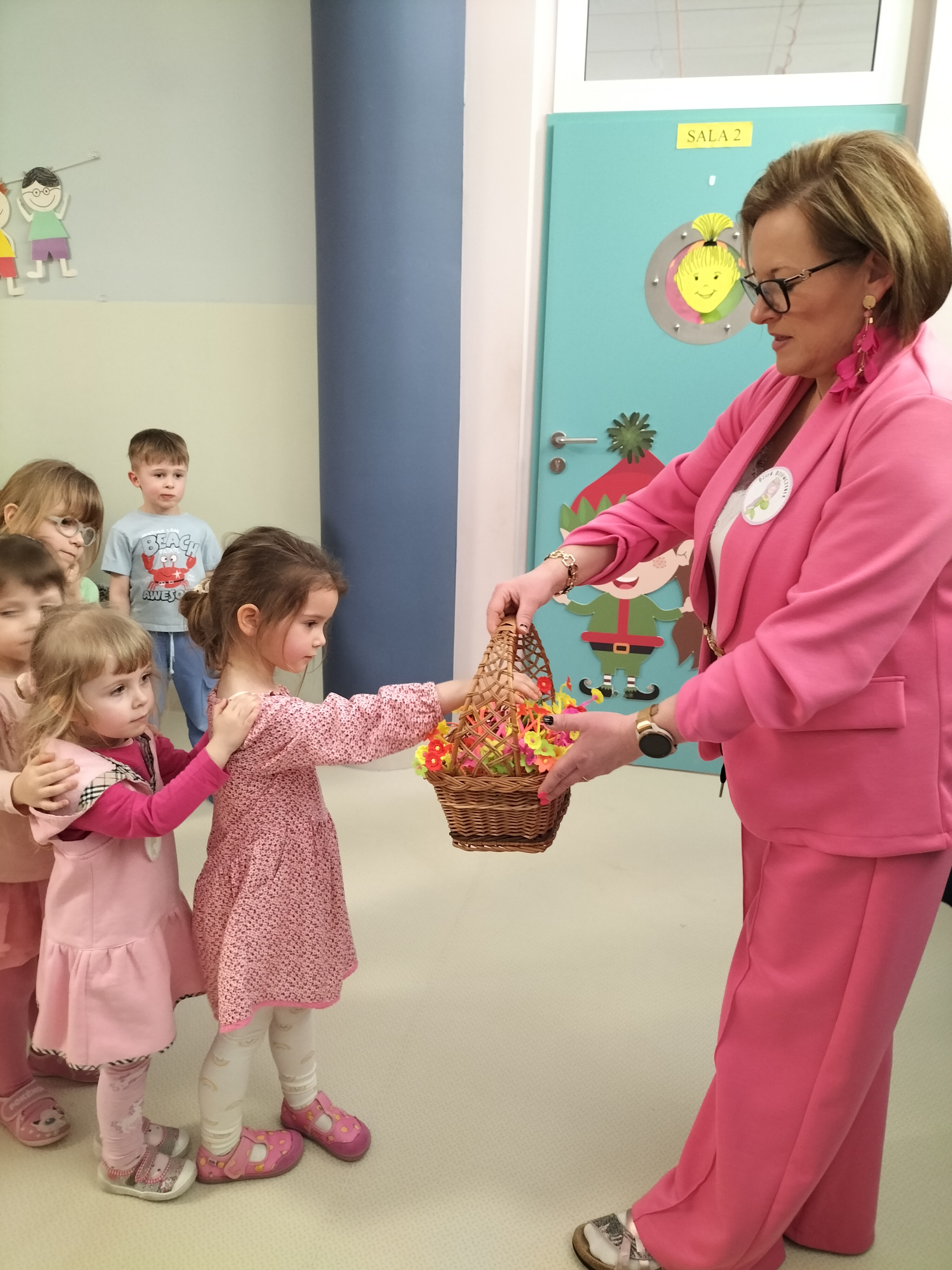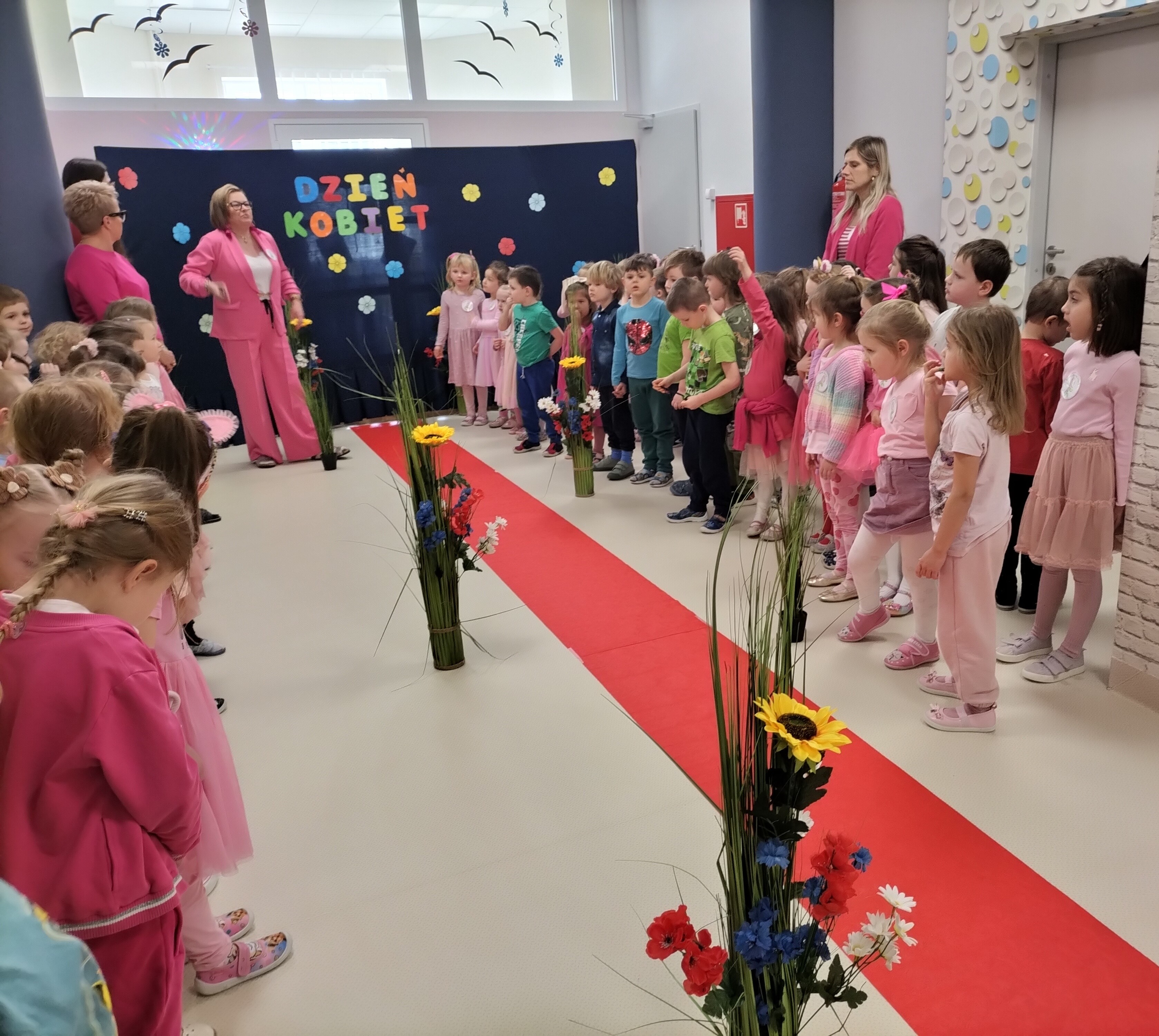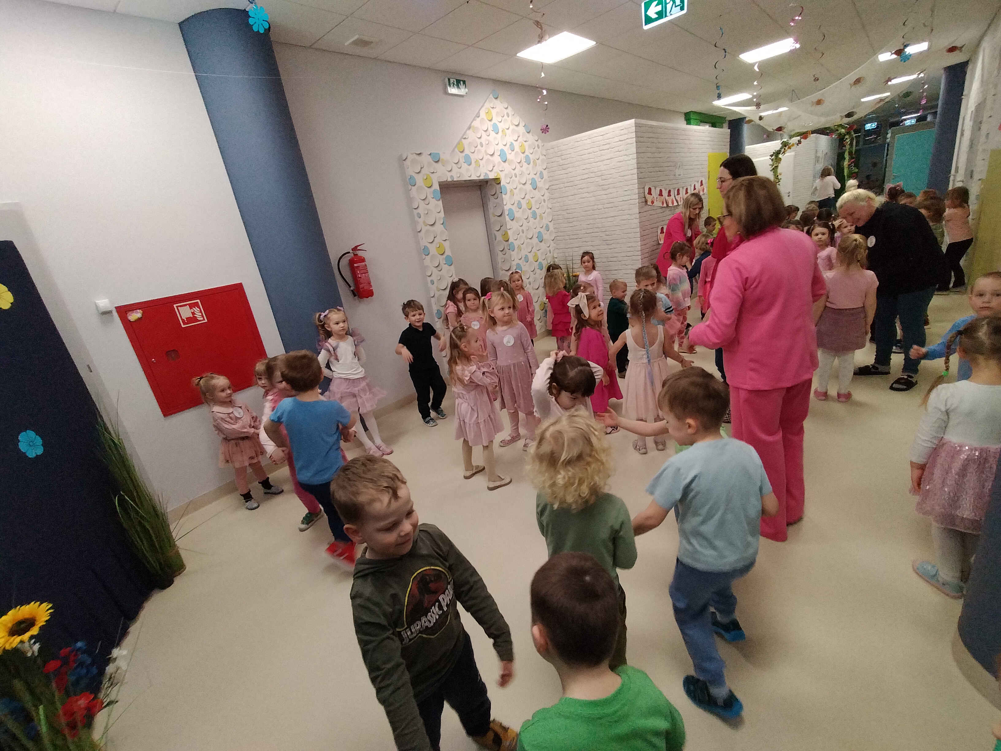 Piątek upłynął w bardzo miłej i radosnej atmosferze. Dziewczynki ubrane na różowo, a chłopcy w odcieniach zieleni i niebieskiego wspólnie świętowali Dzień Kobiet.