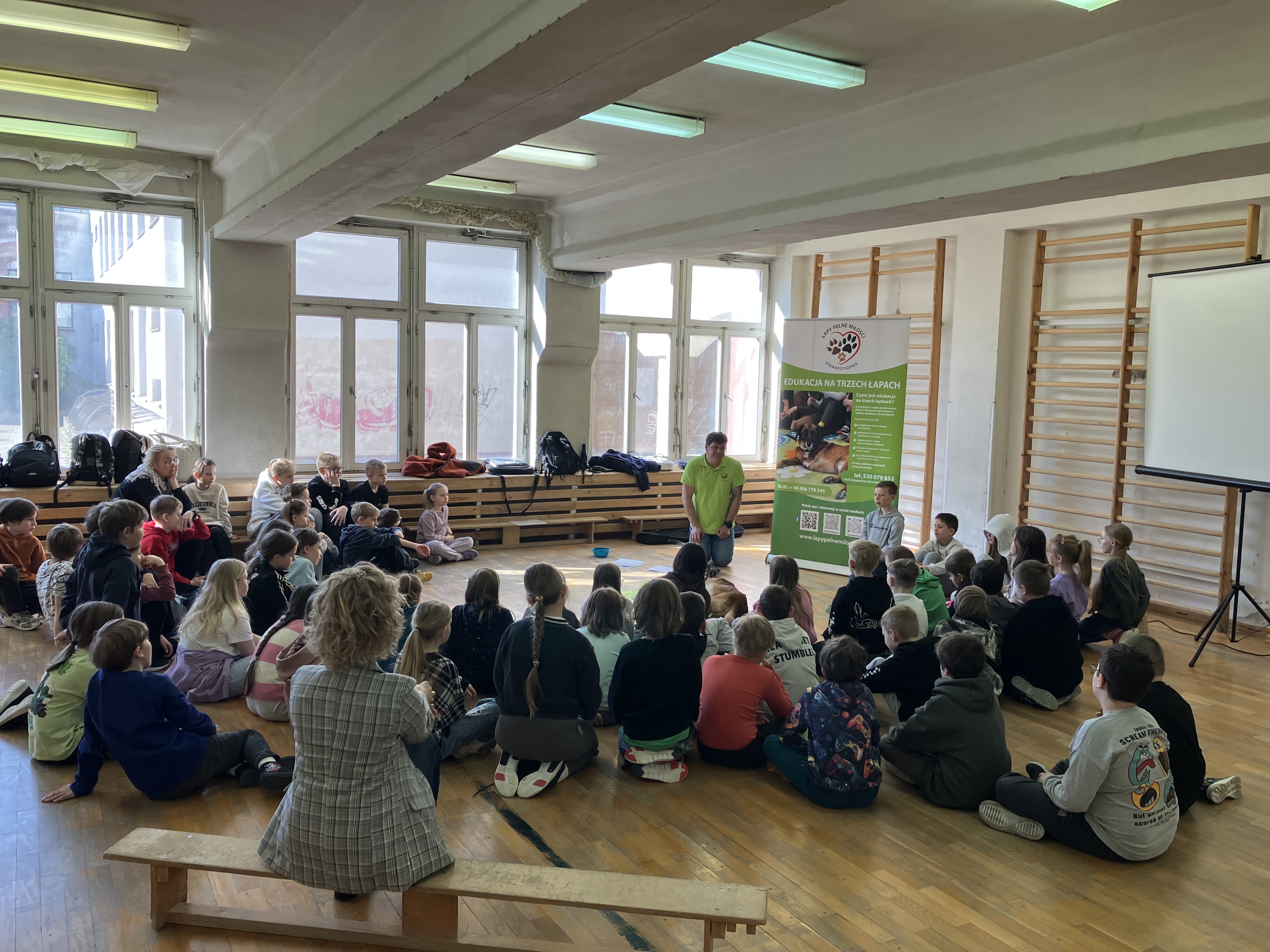Dzisiaj uczniowie klas trzecich wzięli udział w wyjątkowych zajęciach z psem Wektorem. Pan Artur opowiedział dzieciom, jak ważna jest odpowiedzialność za zwierzę oraz jak właściwie przygotować się do jego adopcji. Uczniowie dowiedzieli się, jak mądrze karmić i dbać o zdrowie pupila, a także jak odczytywać mowę ciała zwierząt.