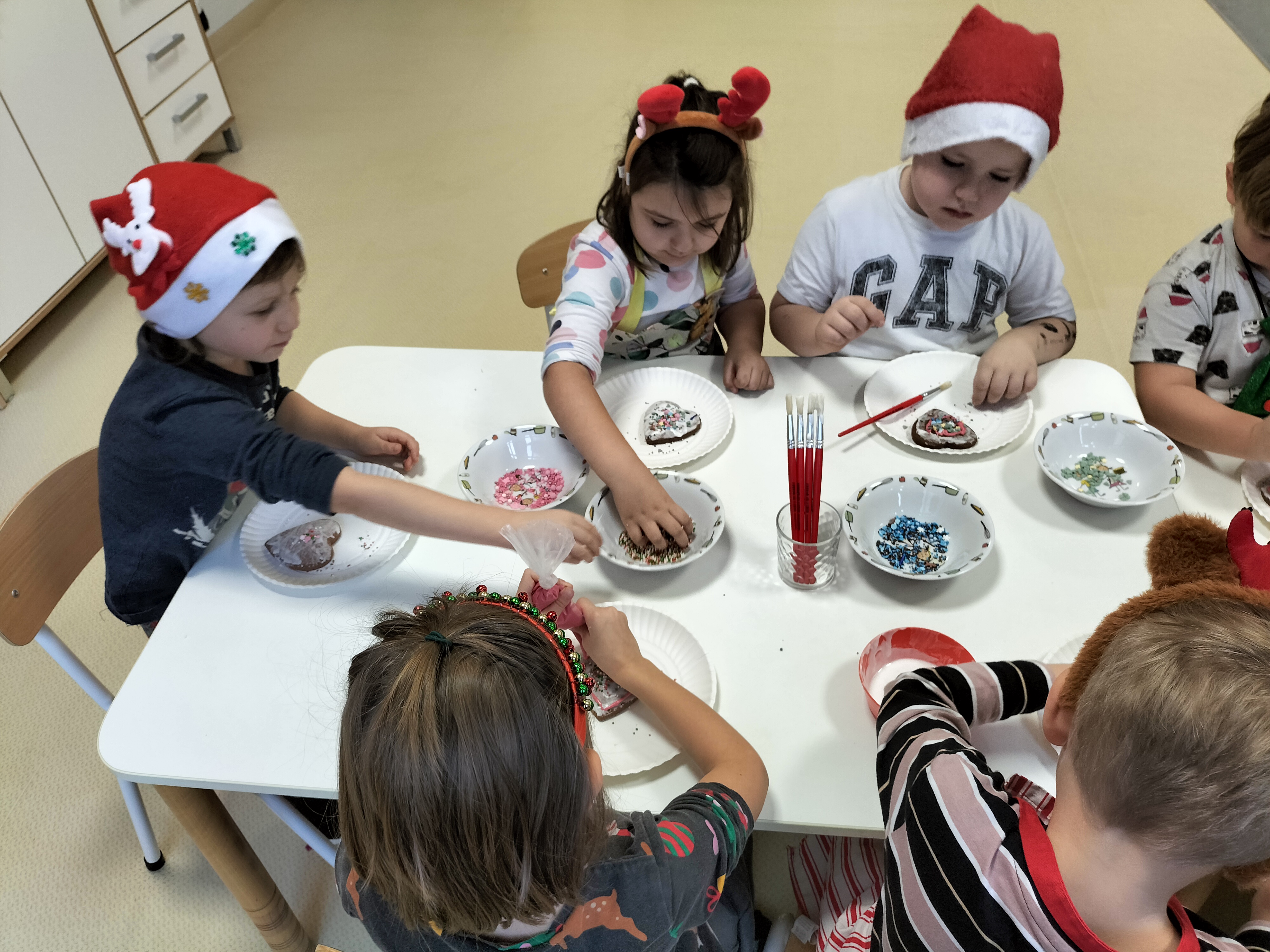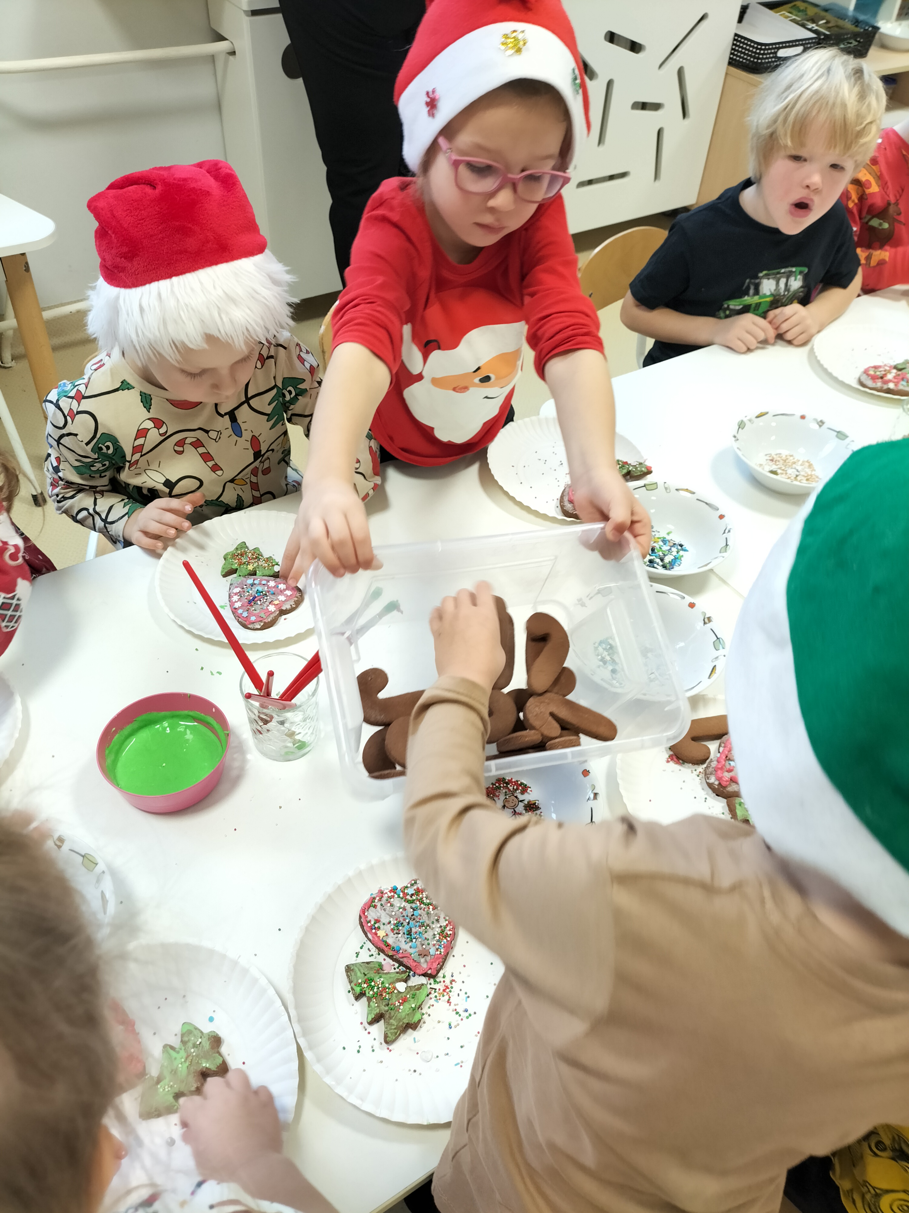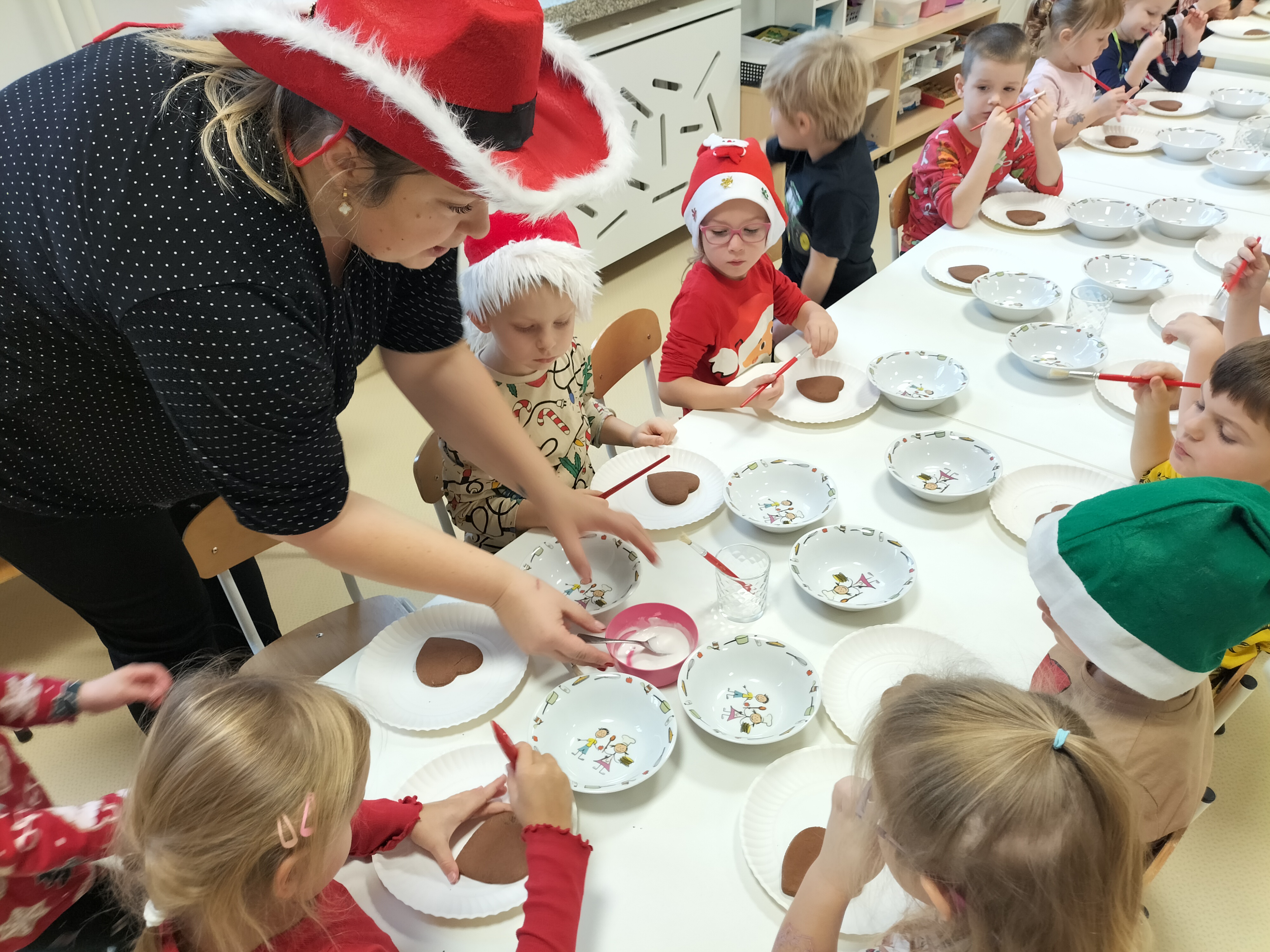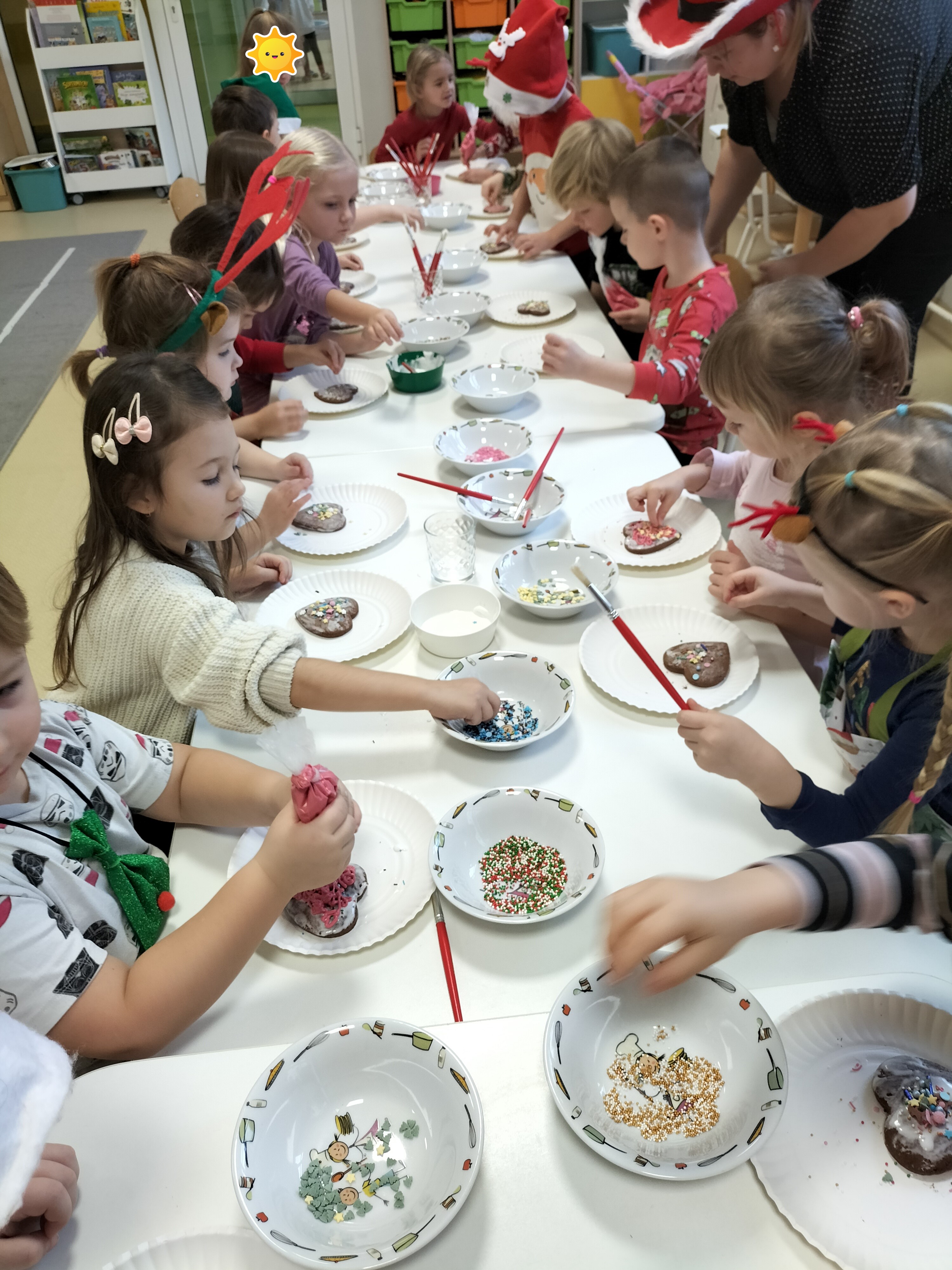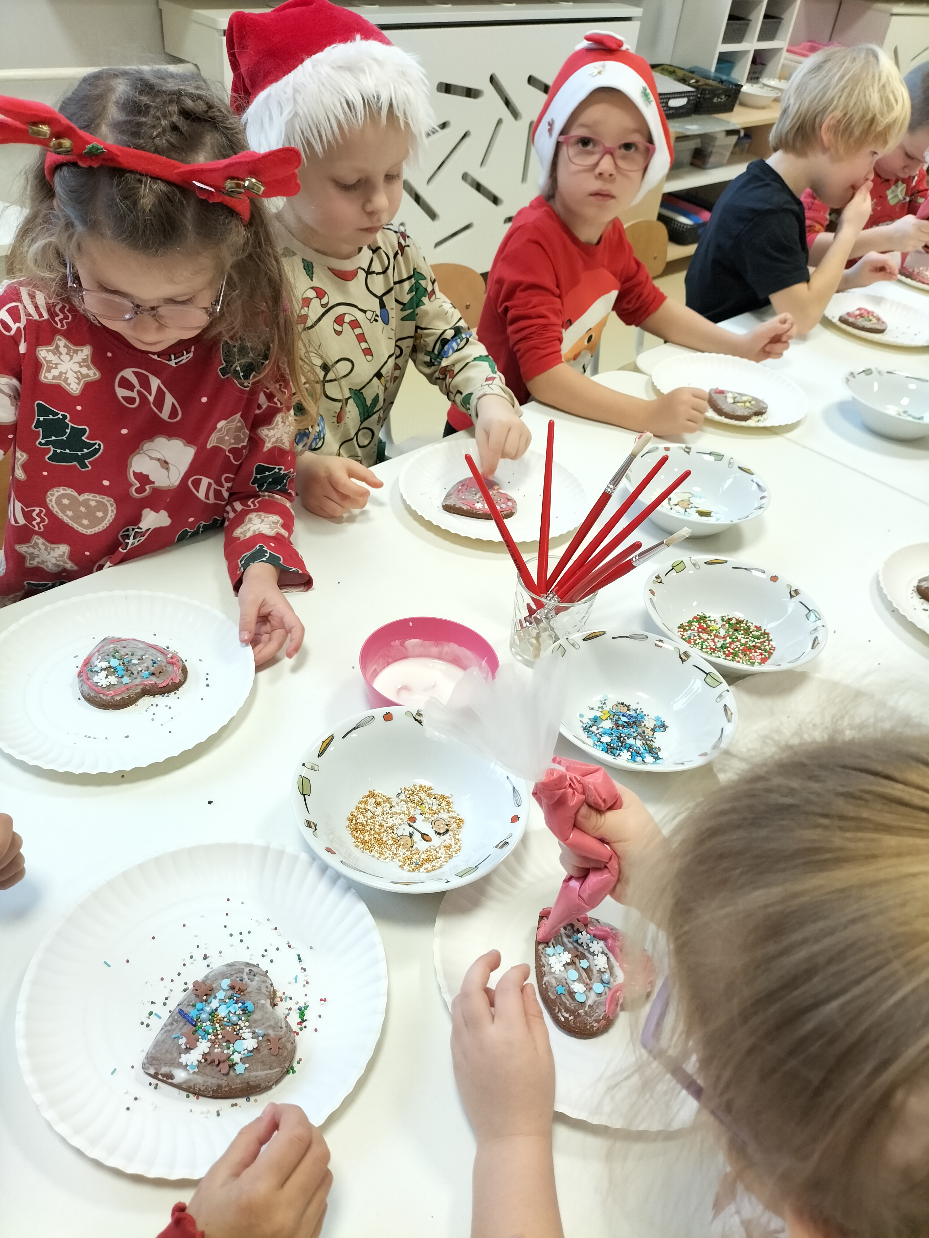 2 grudnia, w grupie Elfów gościliśmy Mamę Kuby. Pani Natalia, która na co dzień pracuje jako cukiernik, opowiedziała dzieciom o swojej słodkiej pasji. Poznaliśmy cały proces wypiekania pierników oraz produkty, które są niezbędne do wypieku tych wyjątkowych ciasteczek. Potem każdy, pod czujnym okiem Pani Natalii, ozdabiał swoje pierniki – było dużo zabawy, kolorowego lukru i świątecznego klimatu. Mali „cukiernicy” z zaangażowaniem tworzyli swoje słodkie dzieła, które stały się wyjątkowym świątecznym upominkiem dla rodziców.
