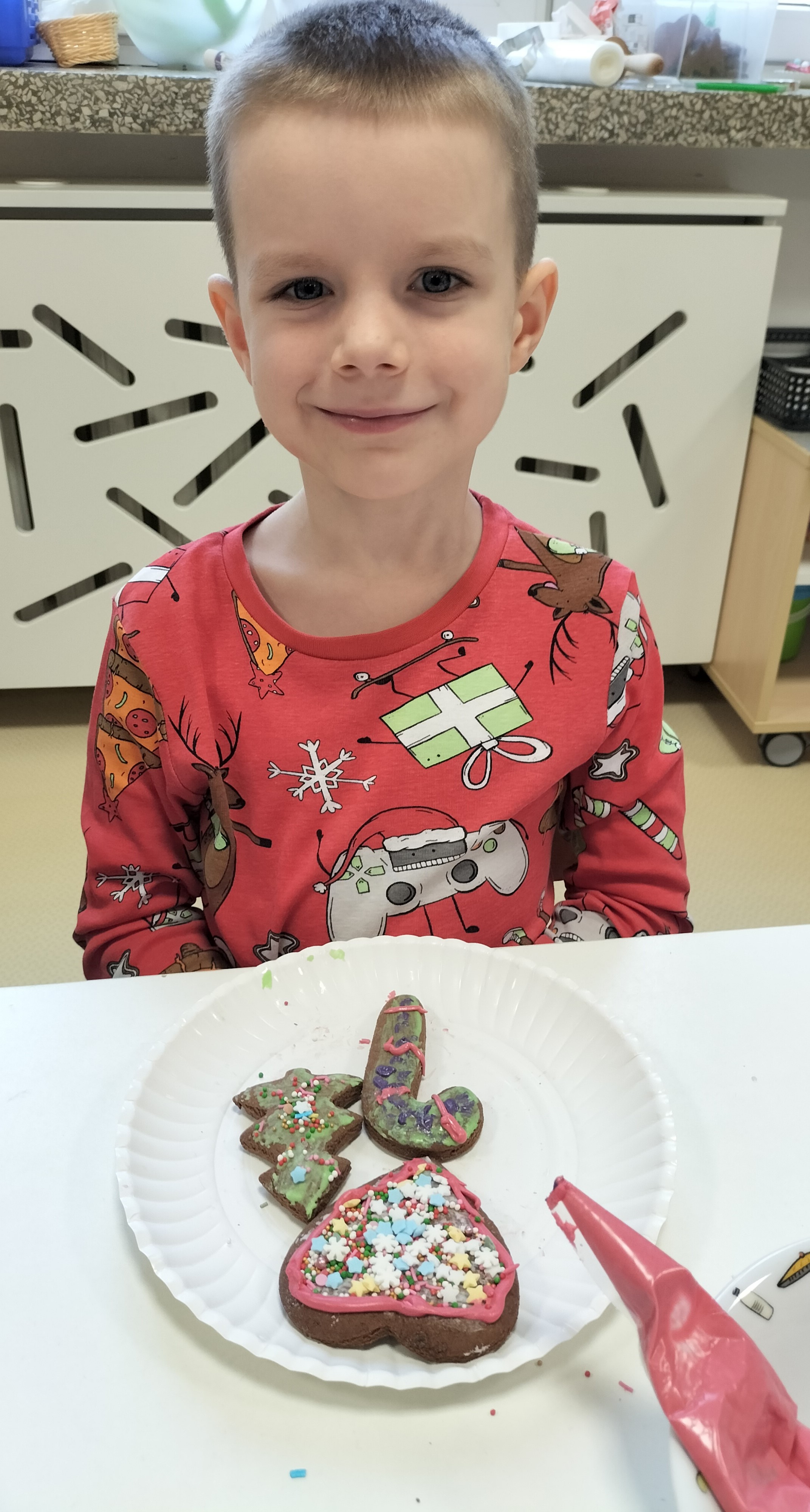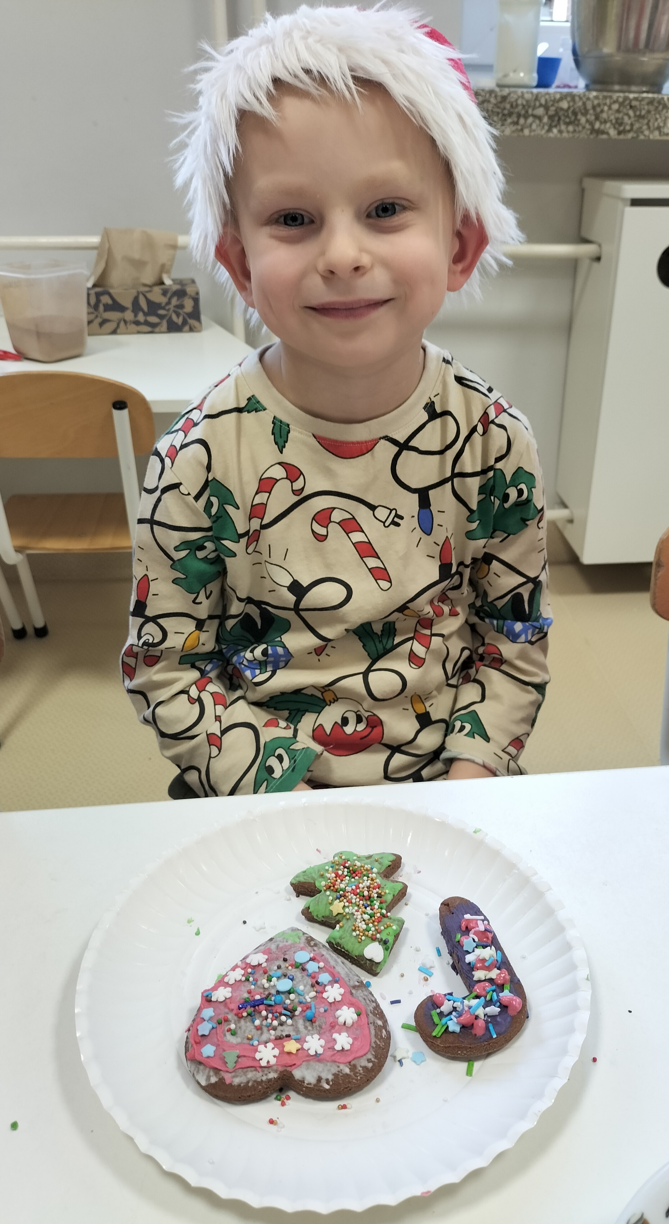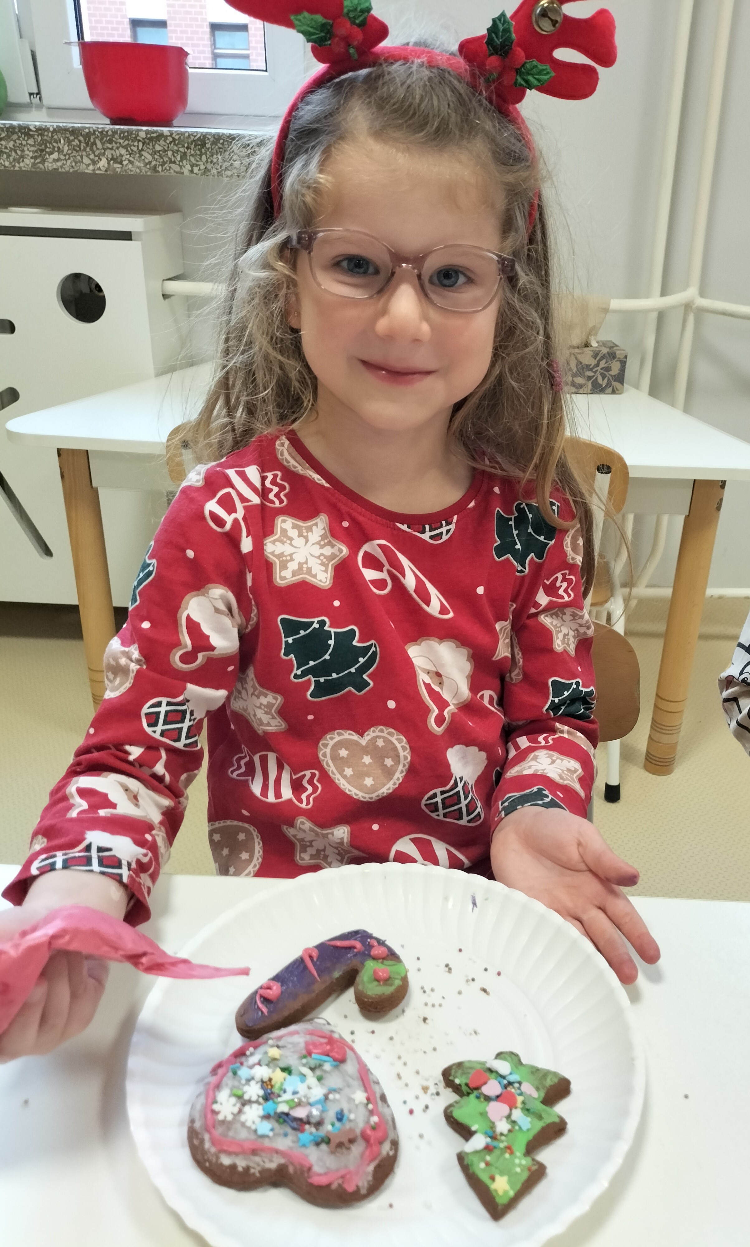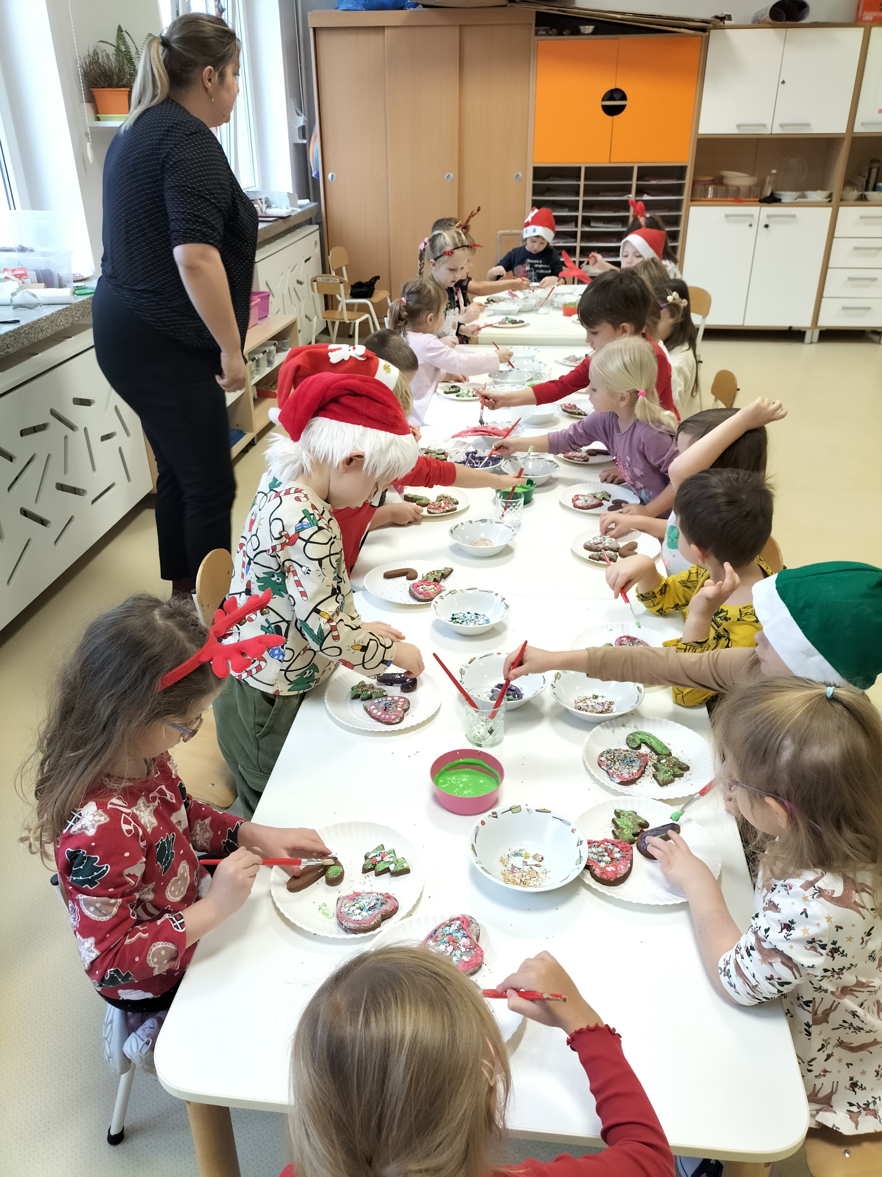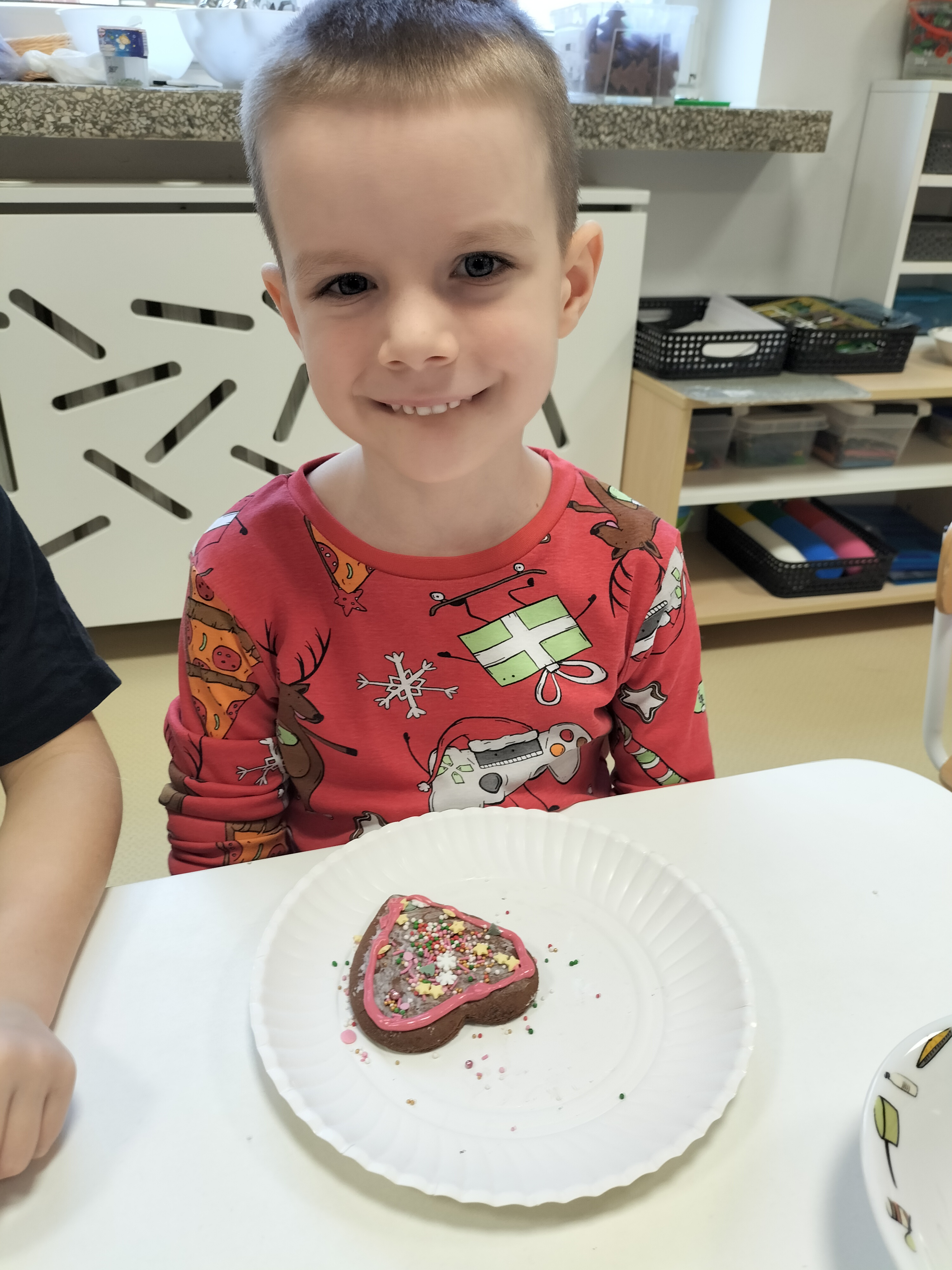 2 grudnia, w grupie Elfów gościliśmy Mamę Kuby. Pani Natalia, która na co dzień pracuje jako cukiernik, opowiedziała dzieciom o swojej słodkiej pasji. Poznaliśmy cały proces wypiekania pierników oraz produkty, które są niezbędne do wypieku tych wyjątkowych ciasteczek. Potem każdy, pod czujnym okiem Pani Natalii, ozdabiał swoje pierniki – było dużo zabawy, kolorowego lukru i świątecznego klimatu. Mali „cukiernicy” z zaangażowaniem tworzyli swoje słodkie dzieła, które stały się wyjątkowym świątecznym upominkiem dla rodziców.