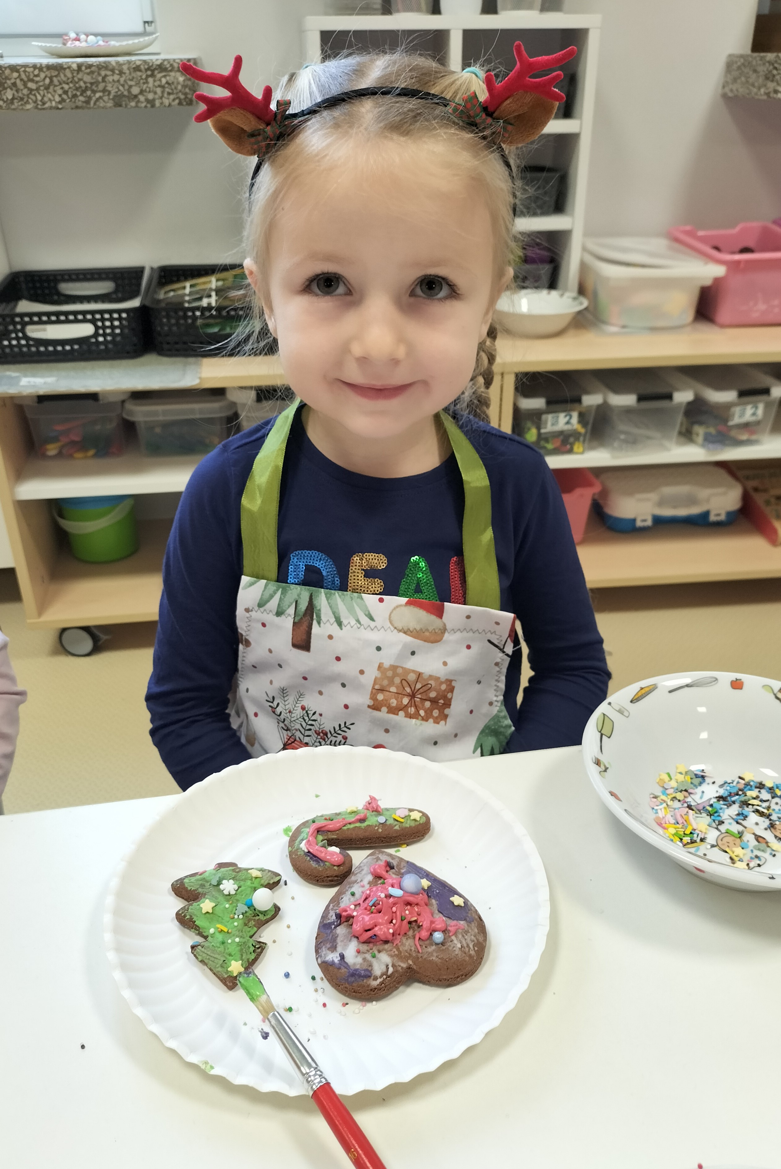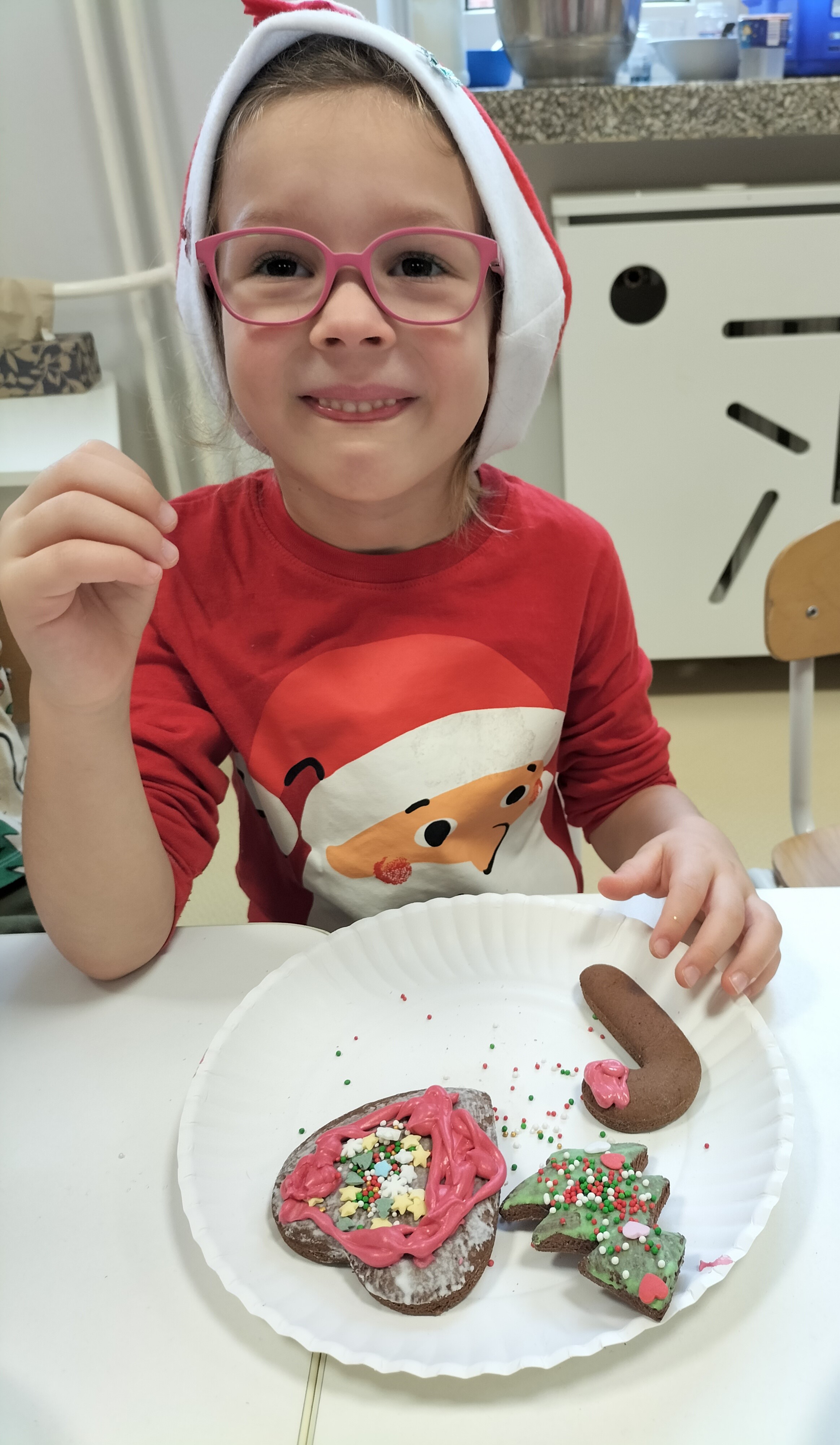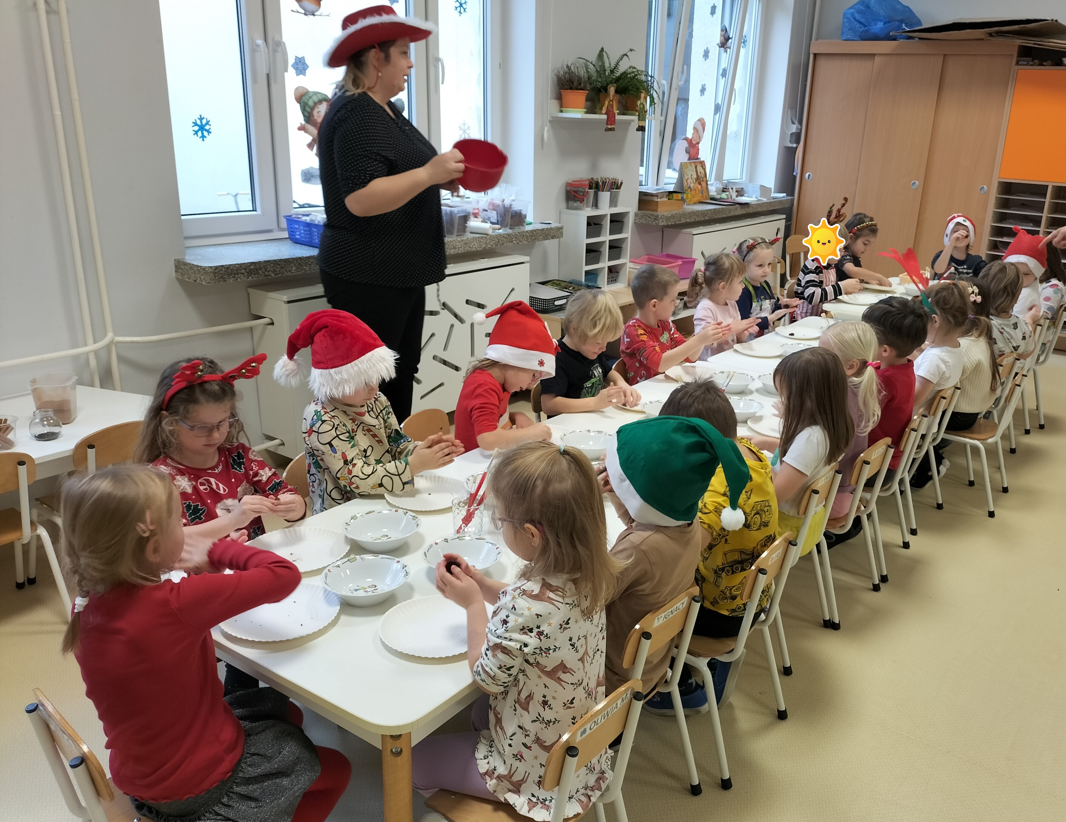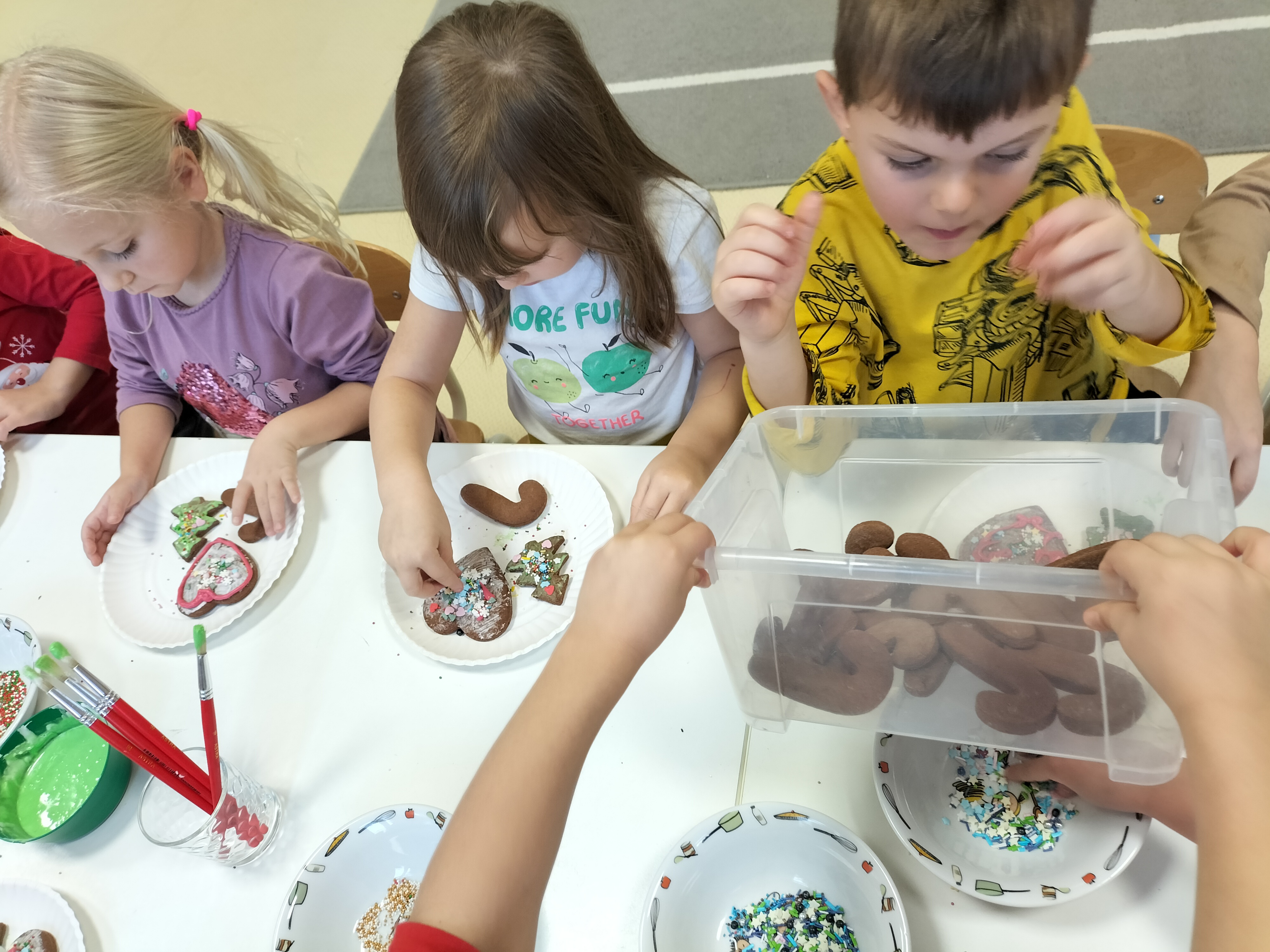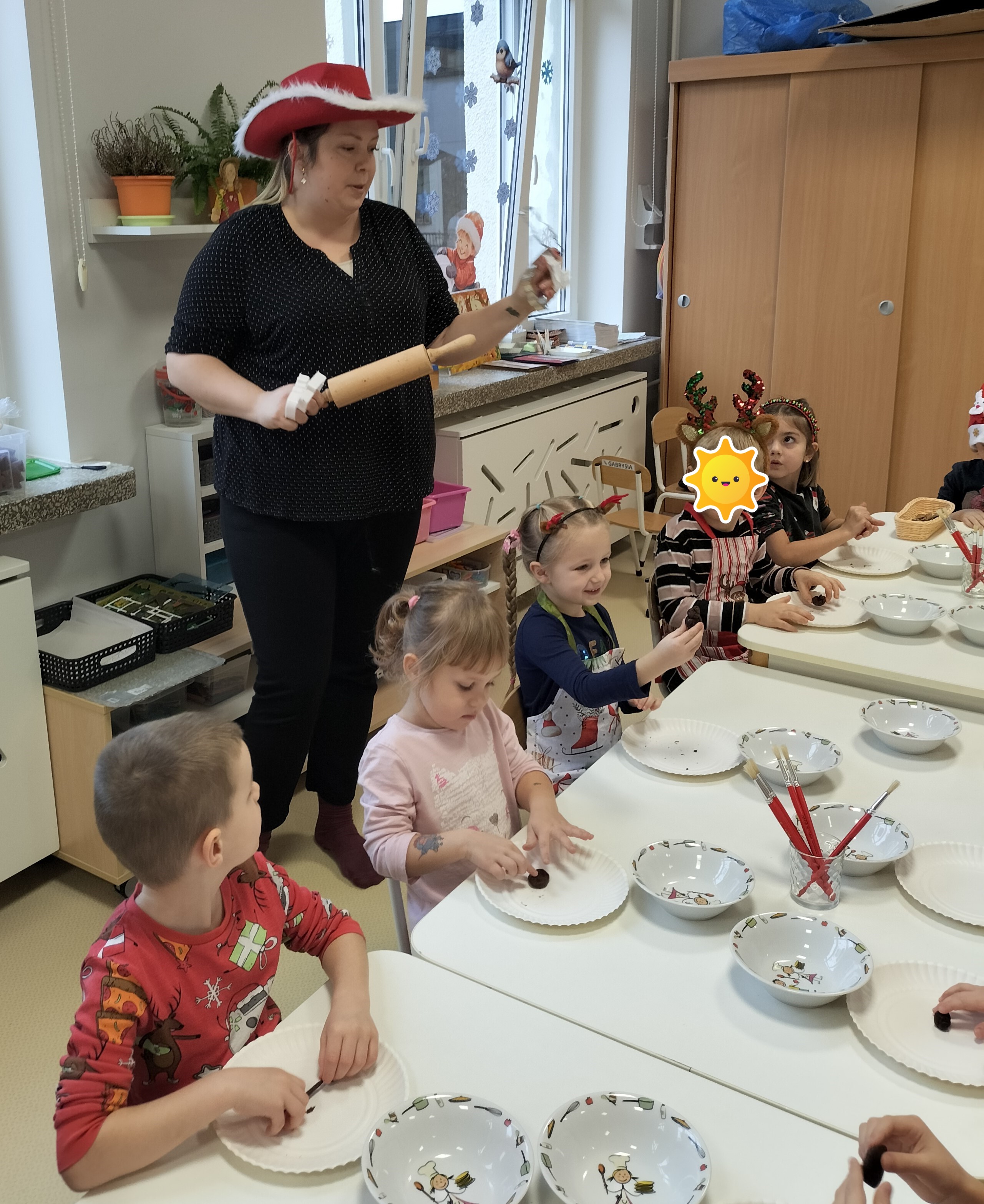 2 grudnia, w grupie Elfów gościliśmy Mamę Kuby. Pani Natalia, która na co dzień pracuje jako cukiernik, opowiedziała dzieciom o swojej słodkiej pasji. Poznaliśmy cały proces wypiekania pierników oraz produkty, które są niezbędne do wypieku tych wyjątkowych ciasteczek. Potem każdy, pod czujnym okiem Pani Natalii, ozdabiał swoje pierniki – było dużo zabawy, kolorowego lukru i świątecznego klimatu. Mali „cukiernicy” z zaangażowaniem tworzyli swoje słodkie dzieła, które stały się wyjątkowym świątecznym upominkiem dla rodziców.