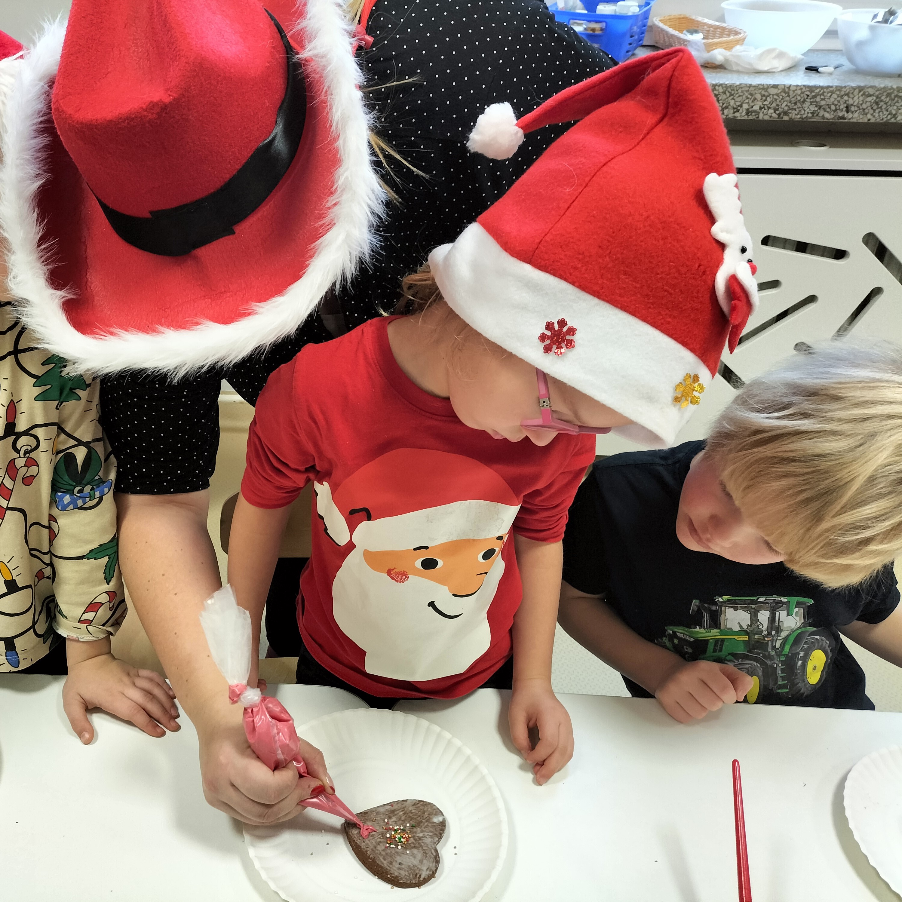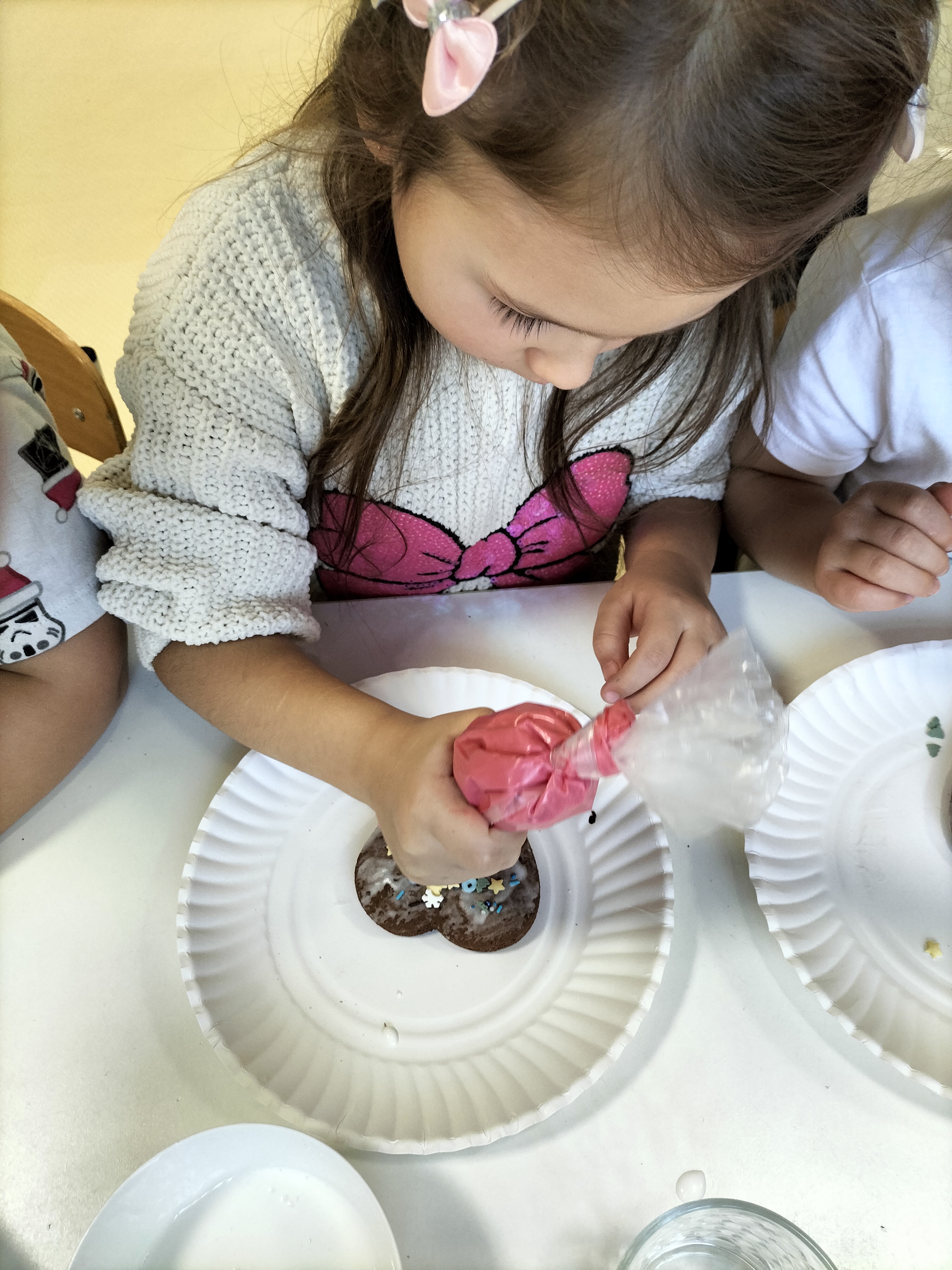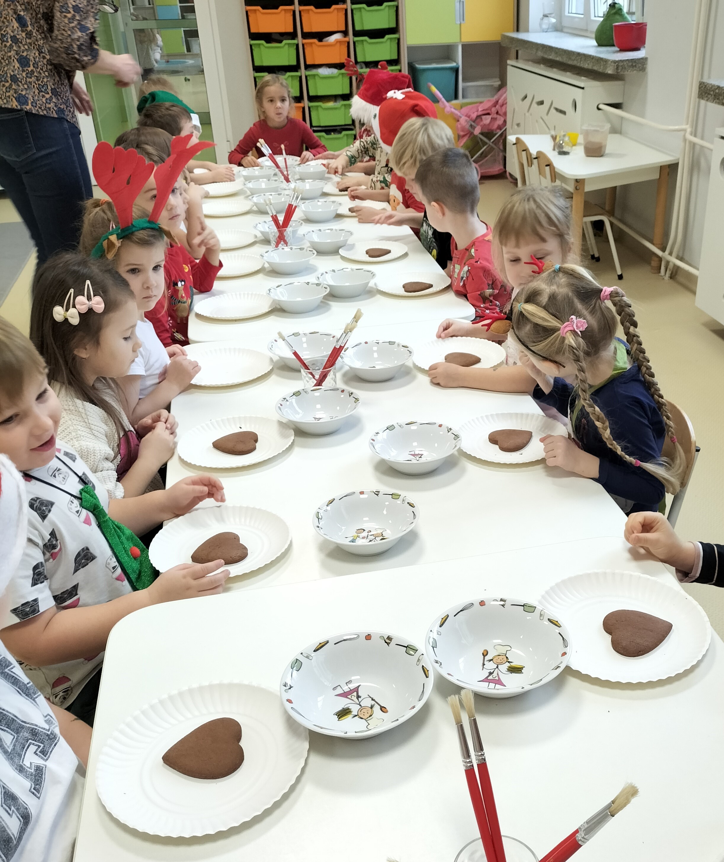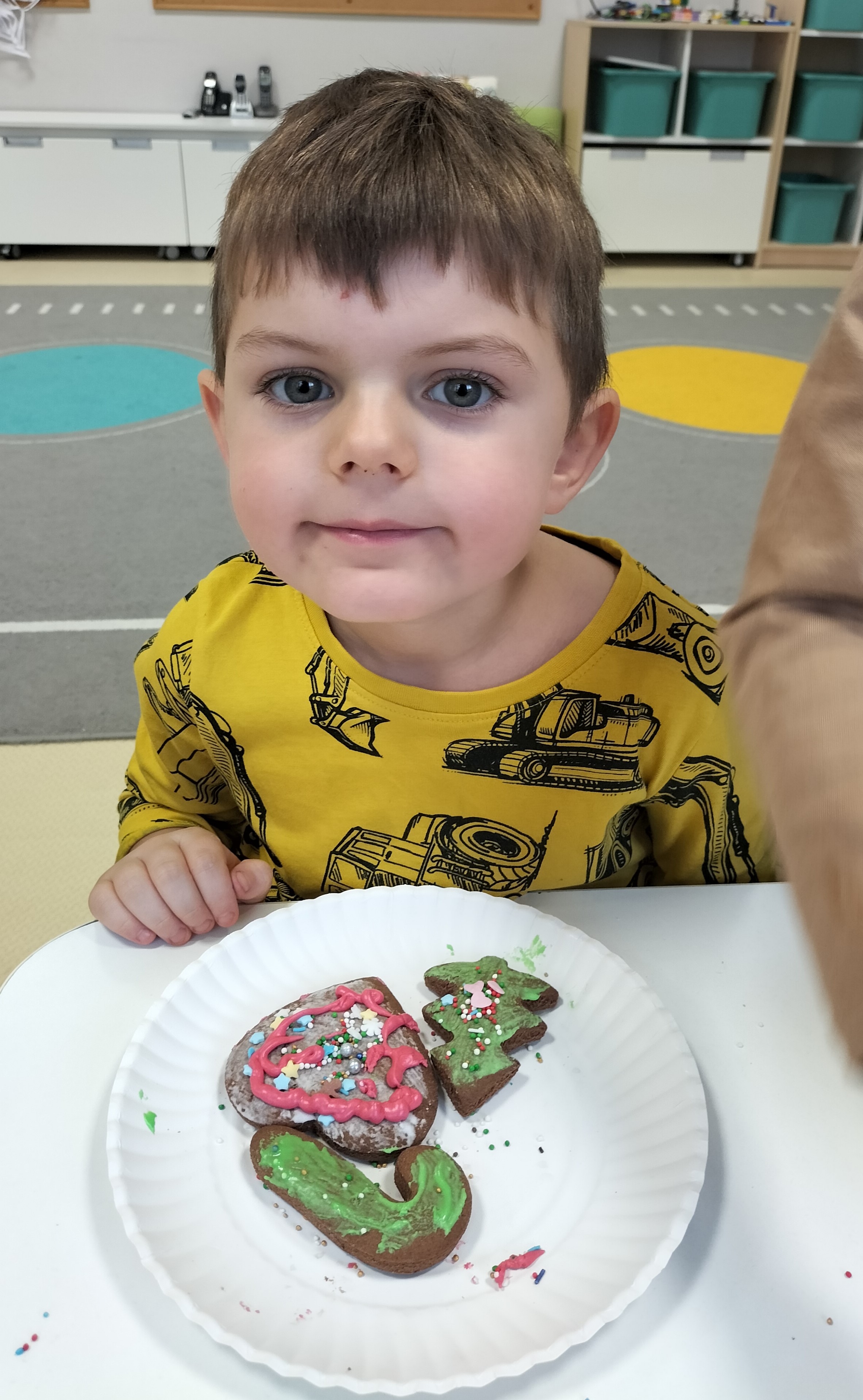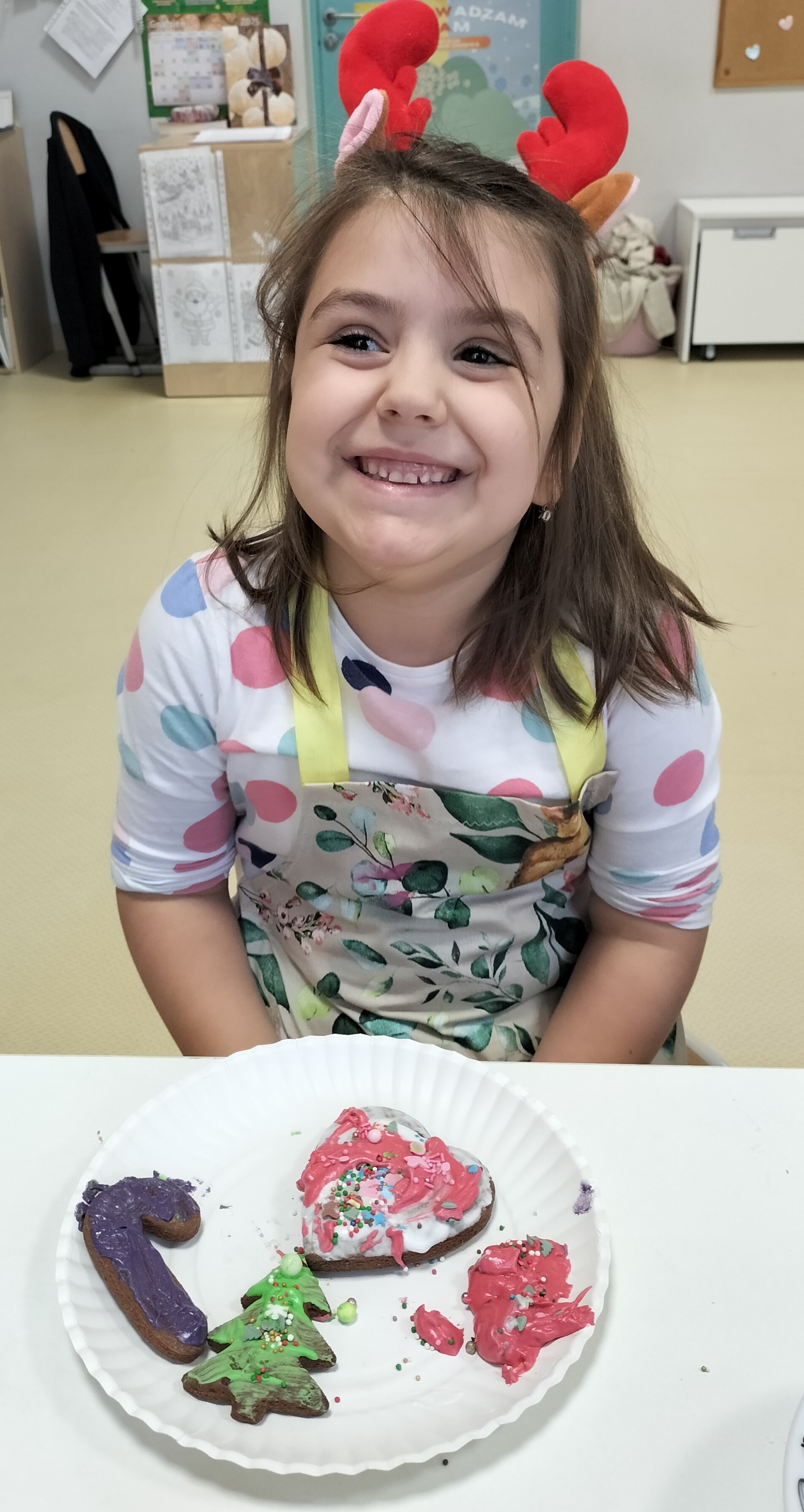 2 grudnia, w grupie Elfów gościliśmy Mamę Kuby. Pani Natalia, która na co dzień pracuje jako cukiernik, opowiedziała dzieciom o swojej słodkiej pasji. Poznaliśmy cały proces wypiekania pierników oraz produkty, które są niezbędne do wypieku tych wyjątkowych ciasteczek. Potem każdy, pod czujnym okiem Pani Natalii, ozdabiał swoje pierniki – było dużo zabawy, kolorowego lukru i świątecznego klimatu. Mali „cukiernicy” z zaangażowaniem tworzyli swoje słodkie dzieła, które stały się wyjątkowym świątecznym upominkiem dla rodziców.