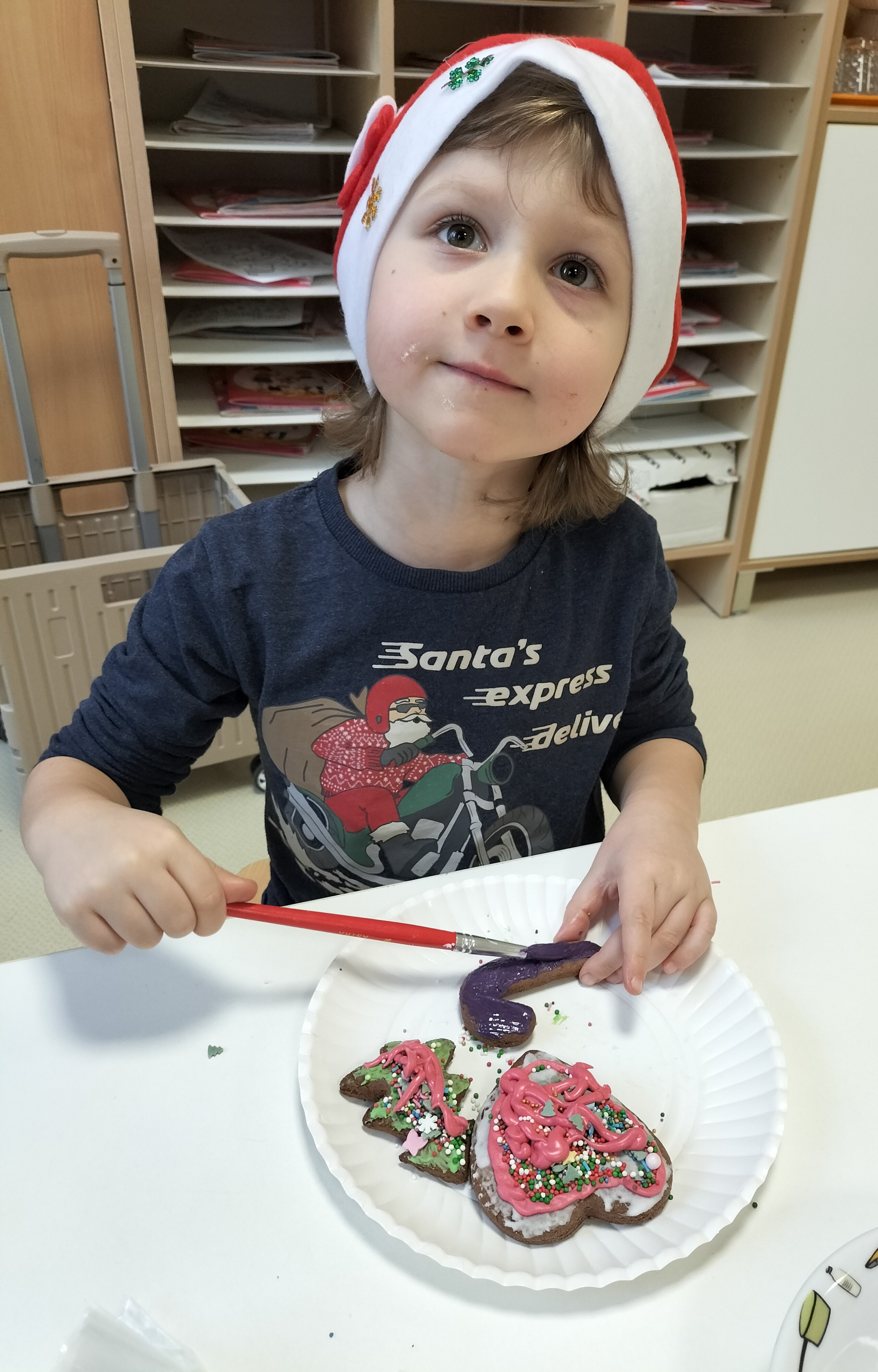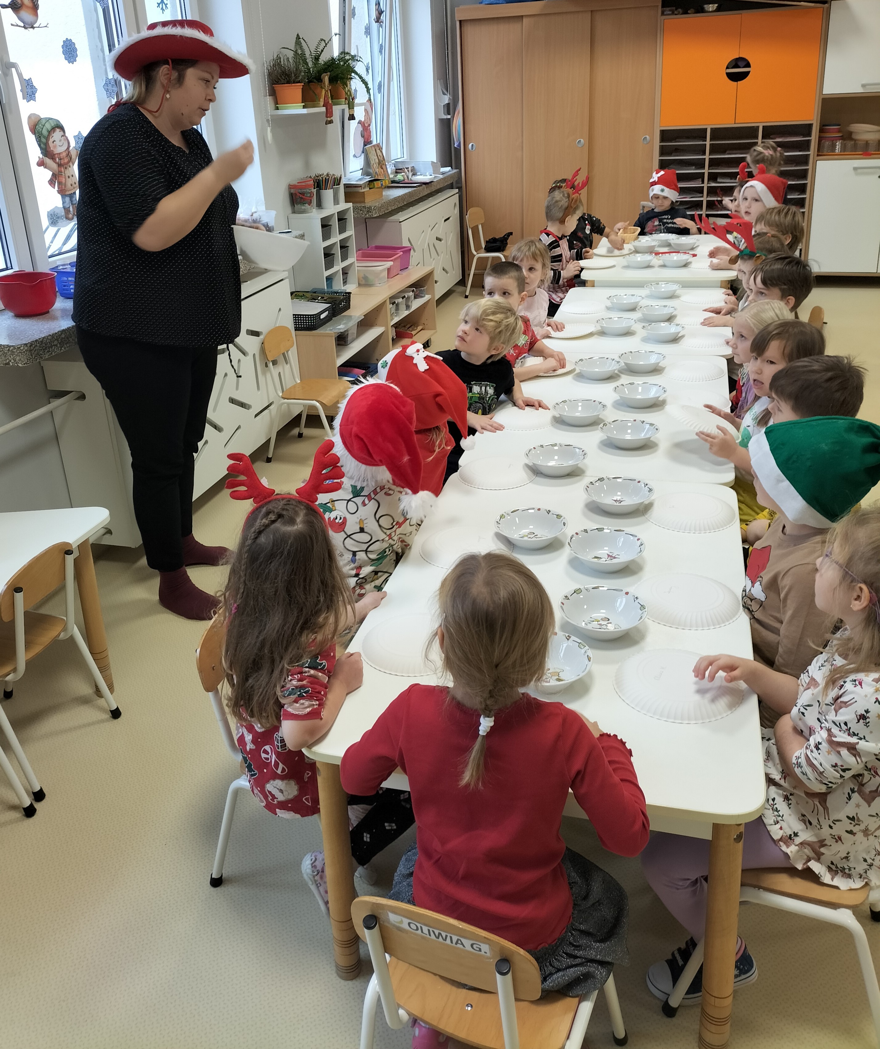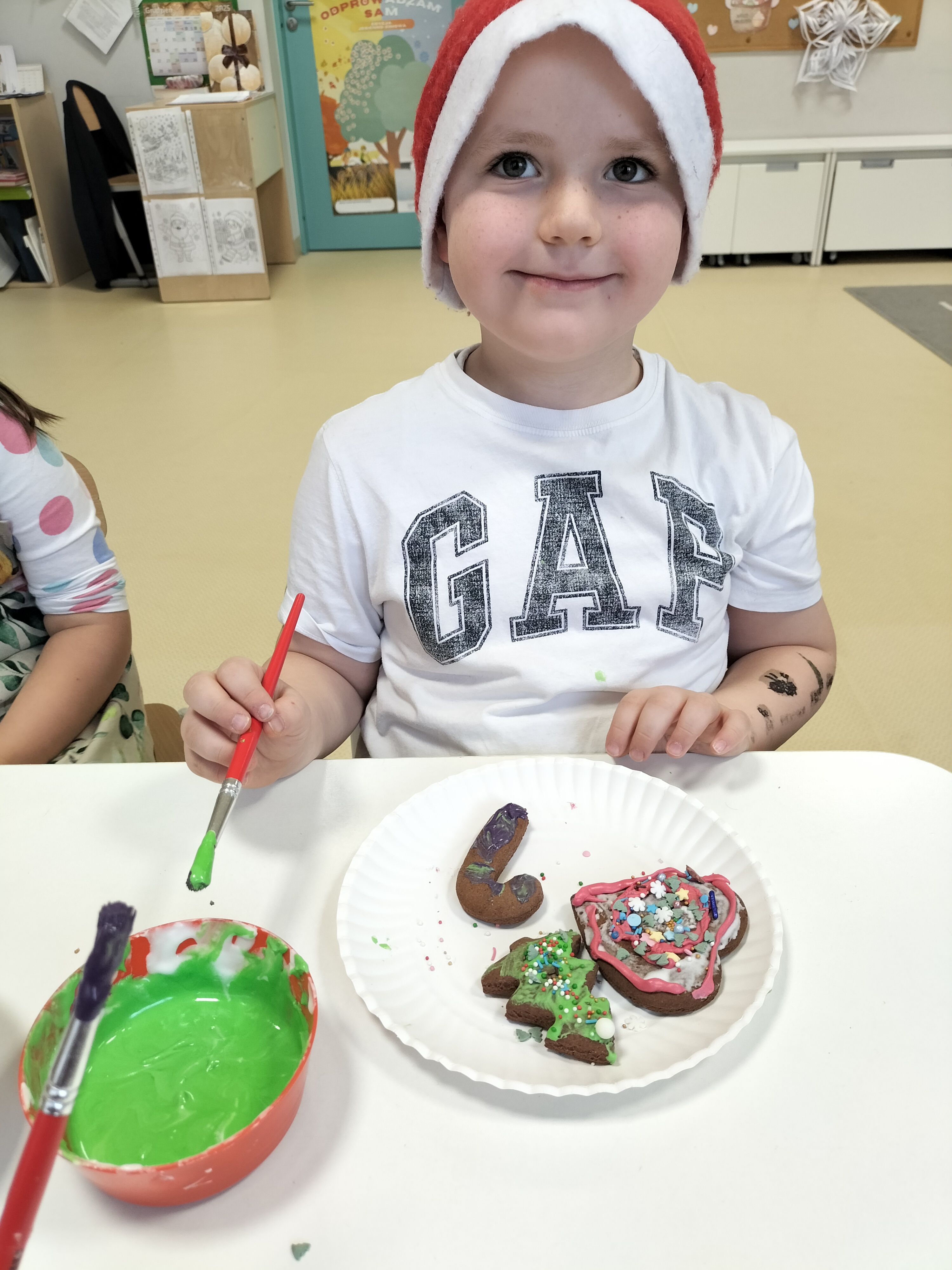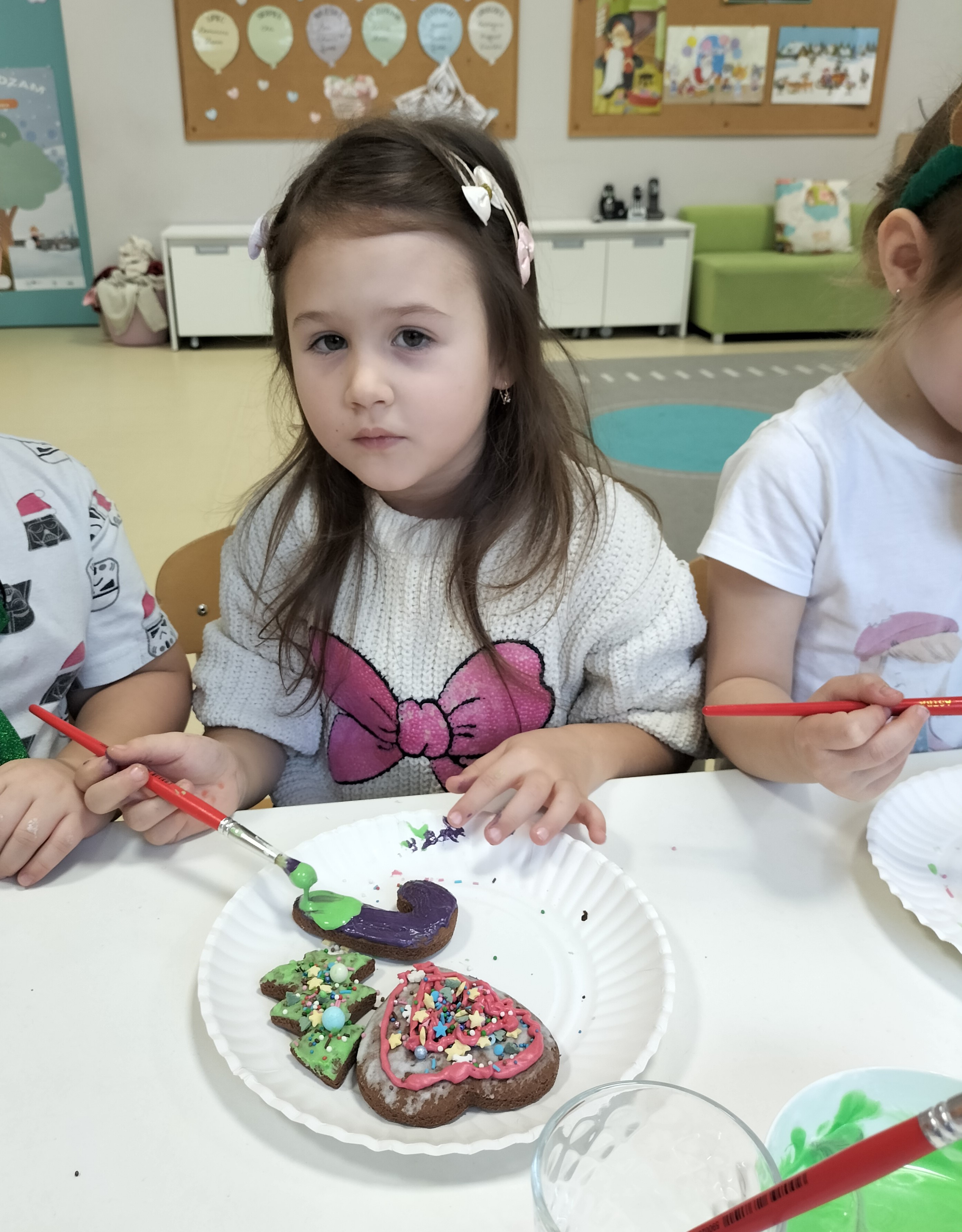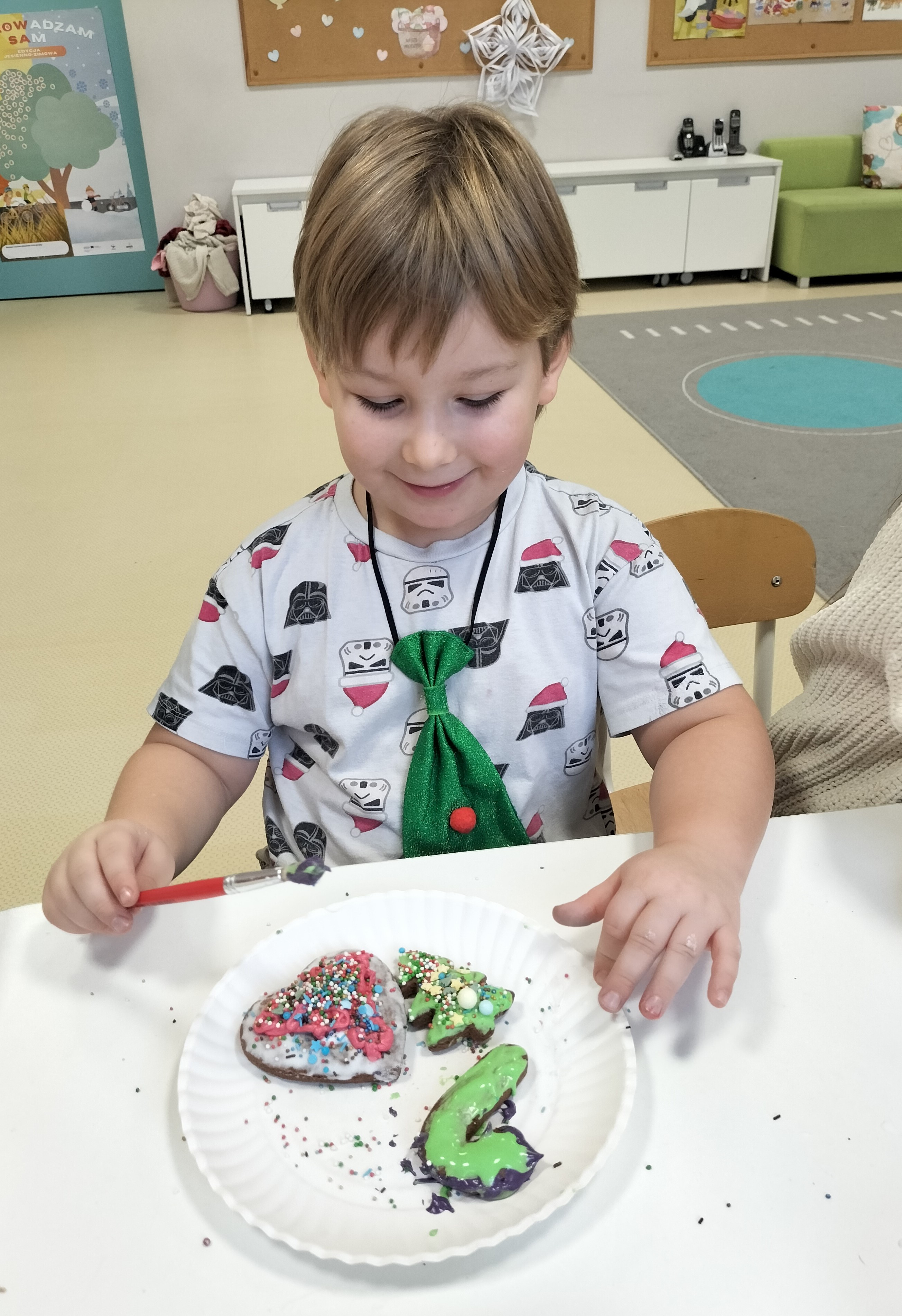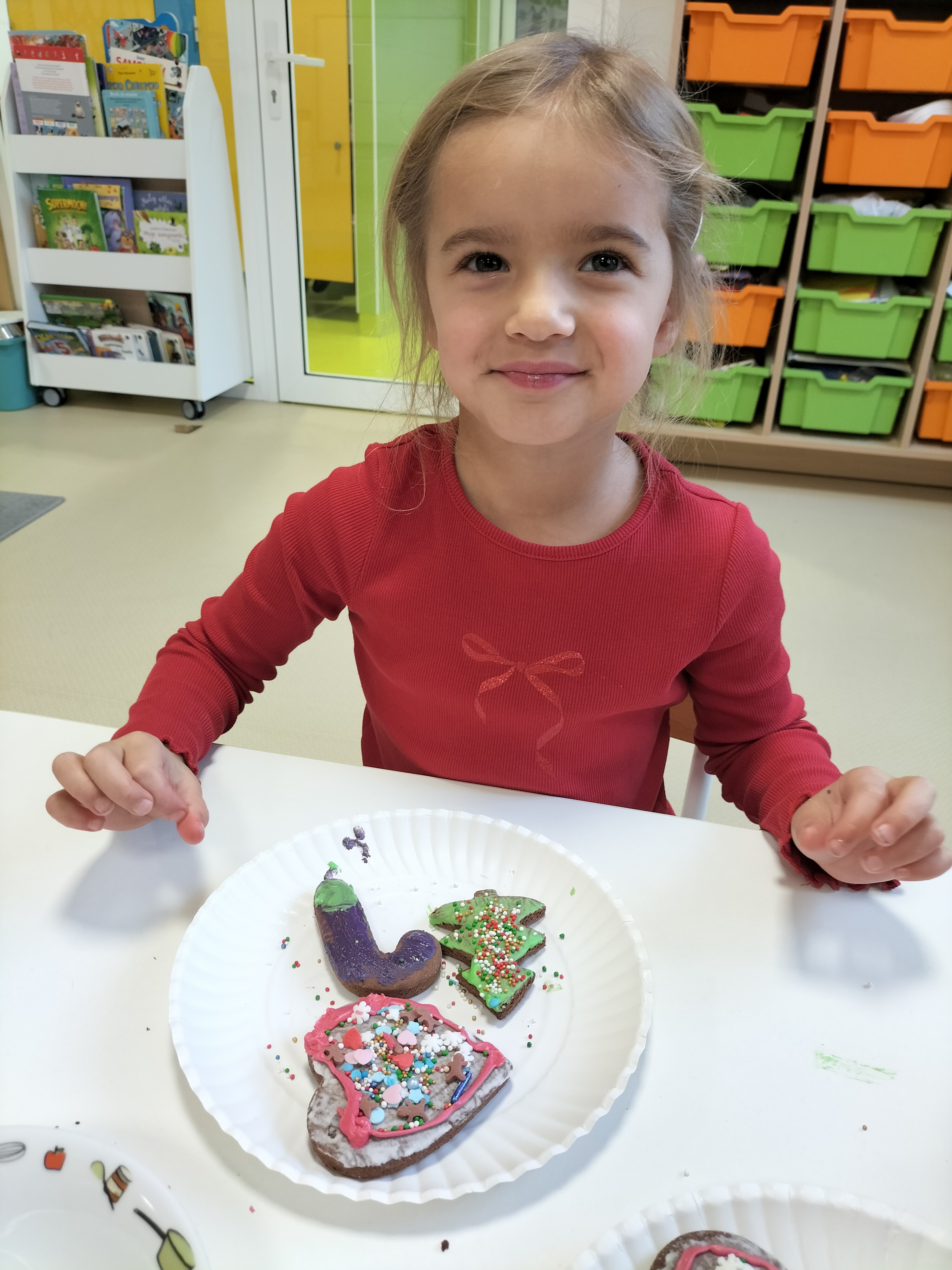 2 grudnia, w grupie Elfów gościliśmy Mamę Kuby. Pani Natalia, która na co dzień pracuje jako cukiernik, opowiedziała dzieciom o swojej słodkiej pasji. Poznaliśmy cały proces wypiekania pierników oraz produkty, które są niezbędne do wypieku tych wyjątkowych ciasteczek. Potem każdy, pod czujnym okiem Pani Natalii, ozdabiał swoje pierniki – było dużo zabawy, kolorowego lukru i świątecznego klimatu. Mali „cukiernicy” z zaangażowaniem tworzyli swoje słodkie dzieła, które stały się wyjątkowym świątecznym upominkiem dla rodziców.