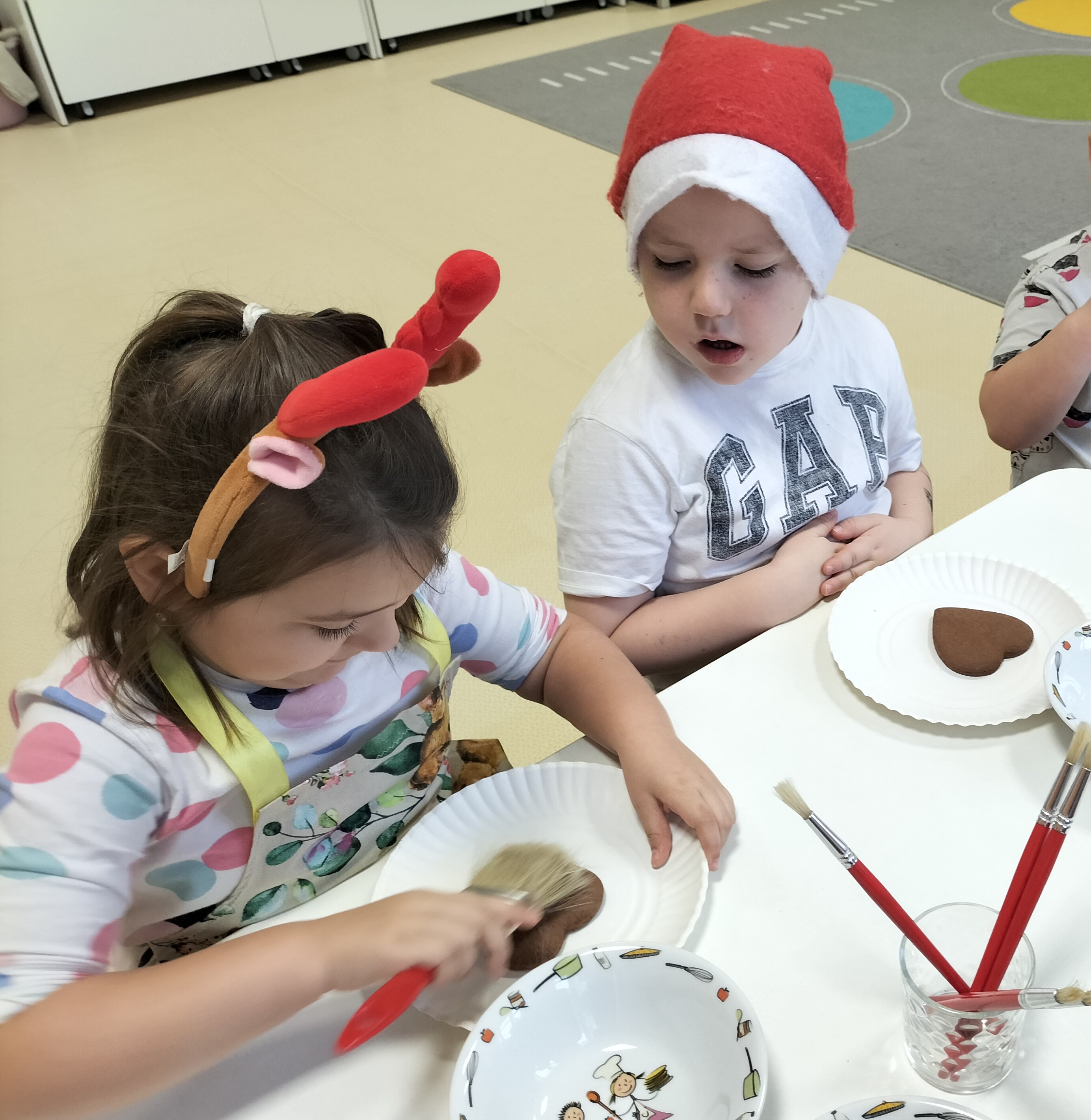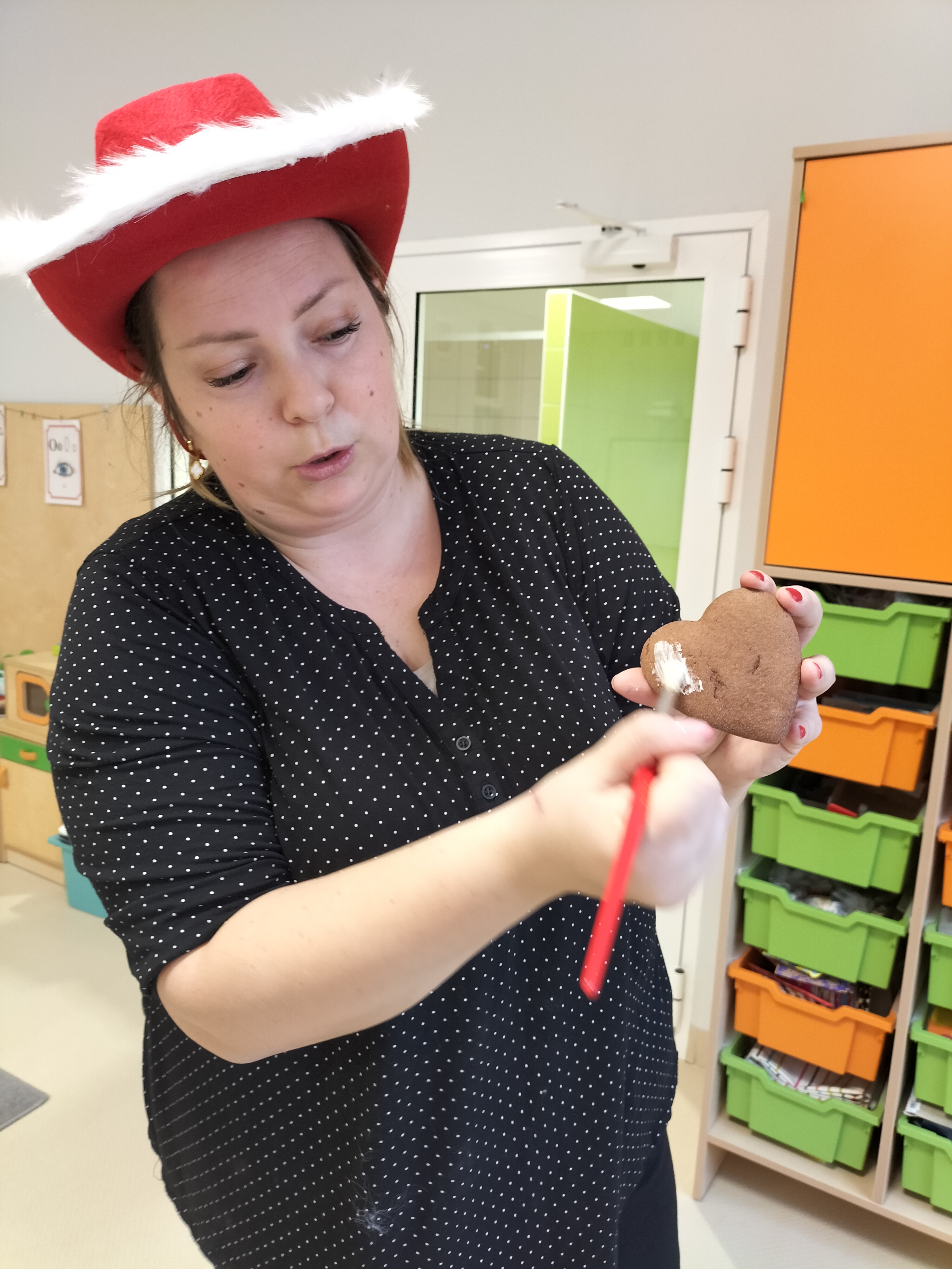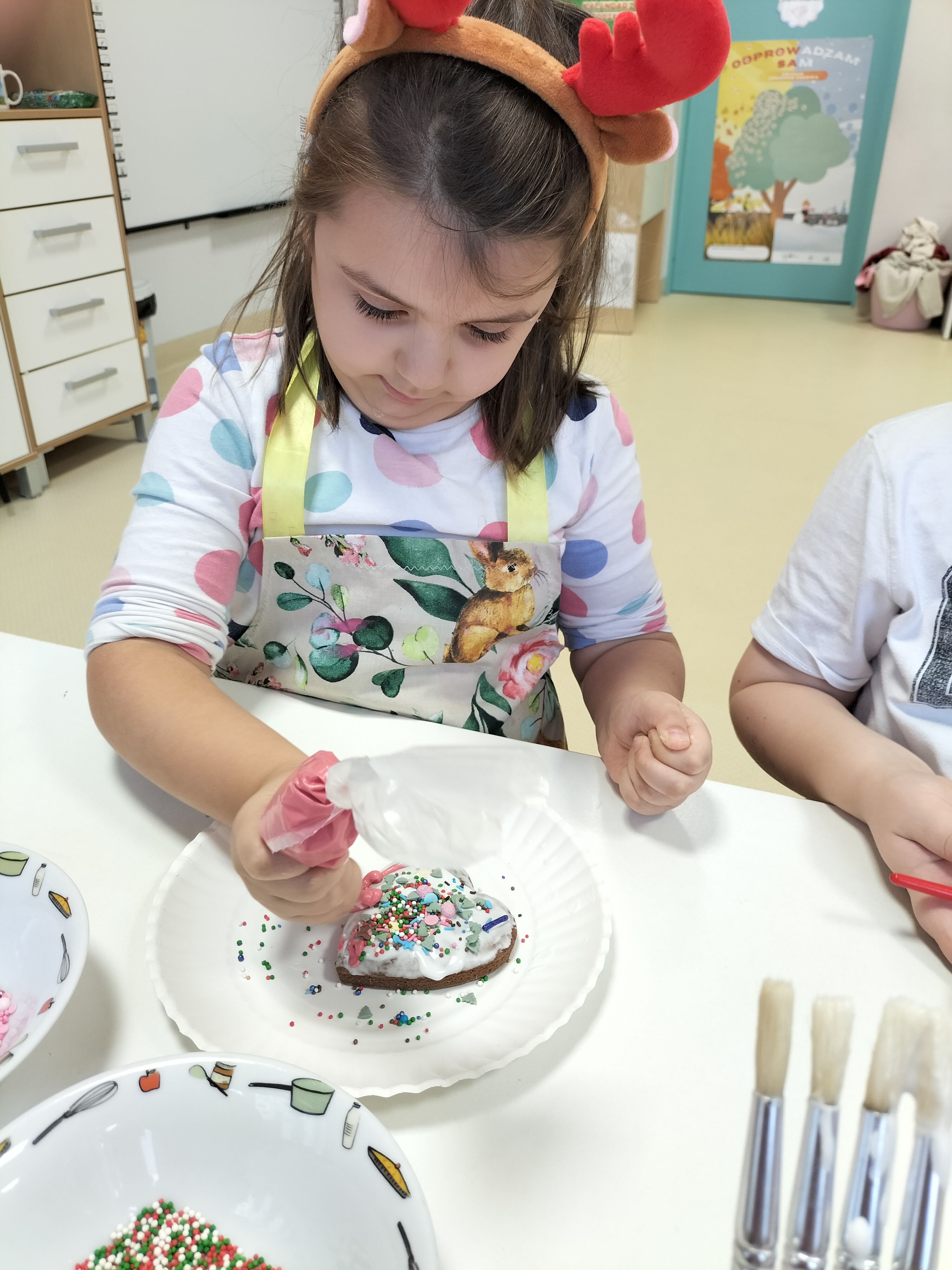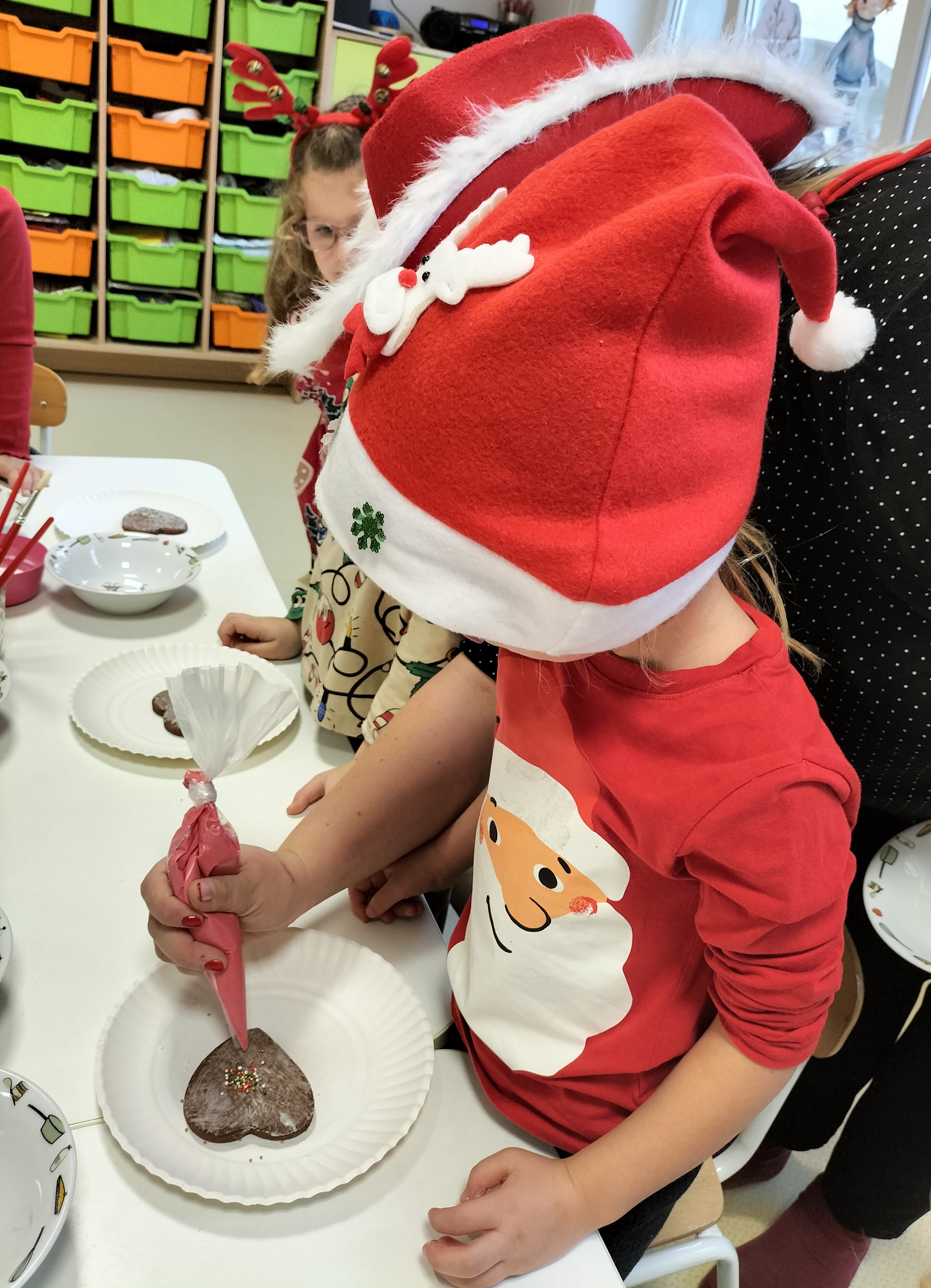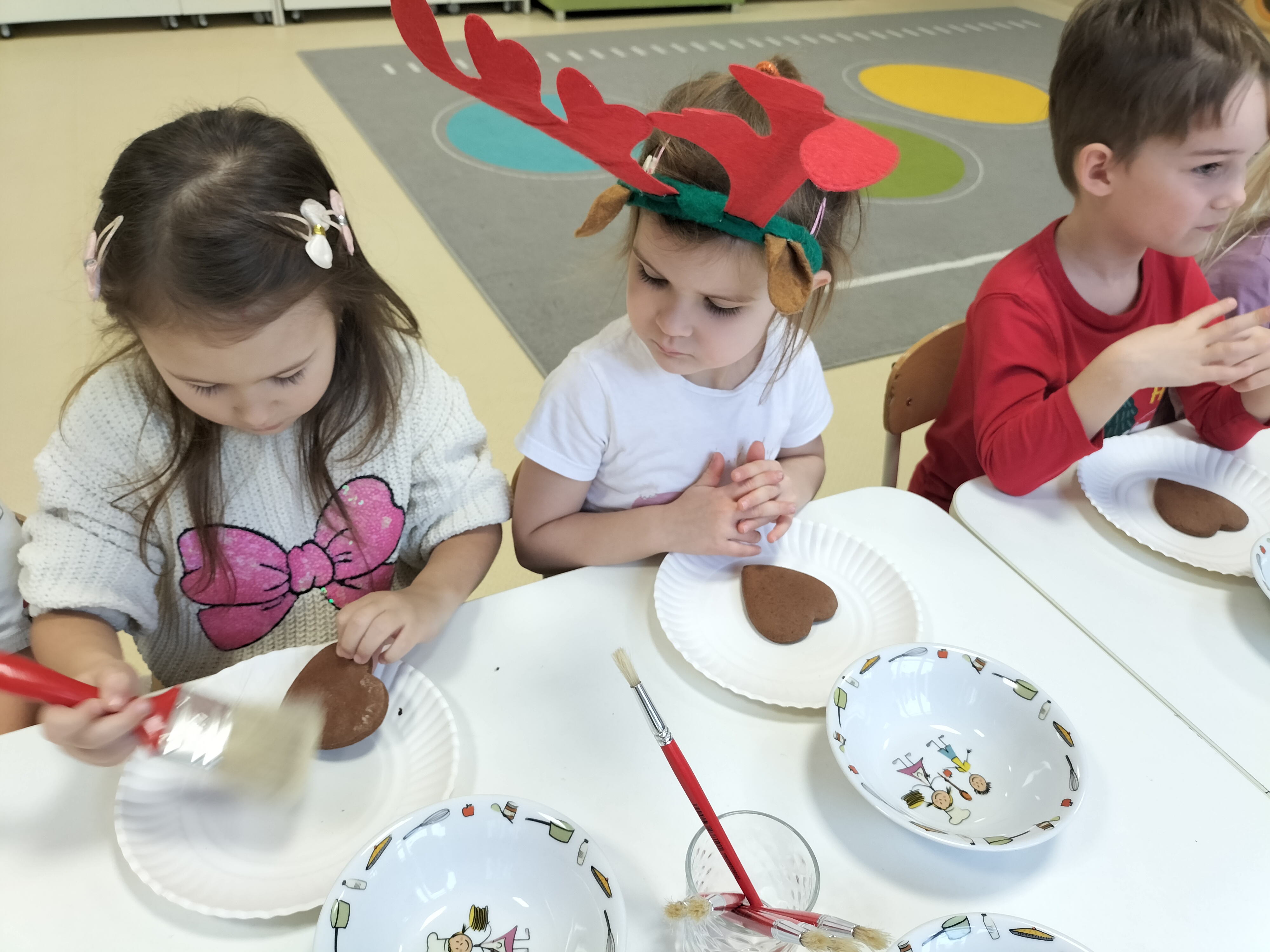 2 grudnia, w grupie Elfów gościliśmy Mamę Kuby. Pani Natalia, która na co dzień pracuje jako cukiernik, opowiedziała dzieciom o swojej słodkiej pasji. Poznaliśmy cały proces wypiekania pierników oraz produkty, które są niezbędne do wypieku tych wyjątkowych ciasteczek. Potem każdy, pod czujnym okiem Pani Natalii, ozdabiał swoje pierniki – było dużo zabawy, kolorowego lukru i świątecznego klimatu. Mali „cukiernicy” z zaangażowaniem tworzyli swoje słodkie dzieła, które stały się wyjątkowym świątecznym upominkiem dla rodziców.