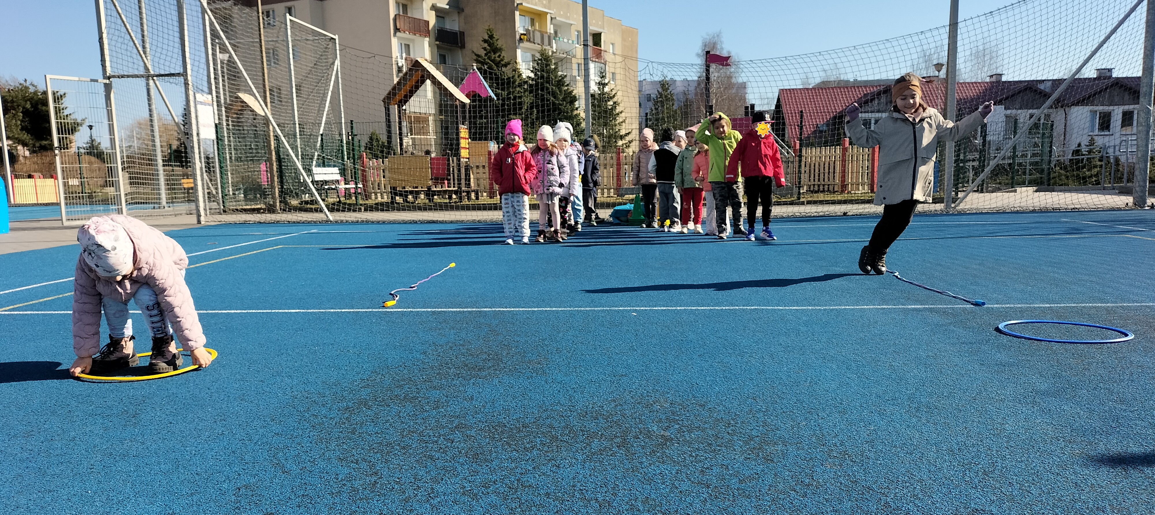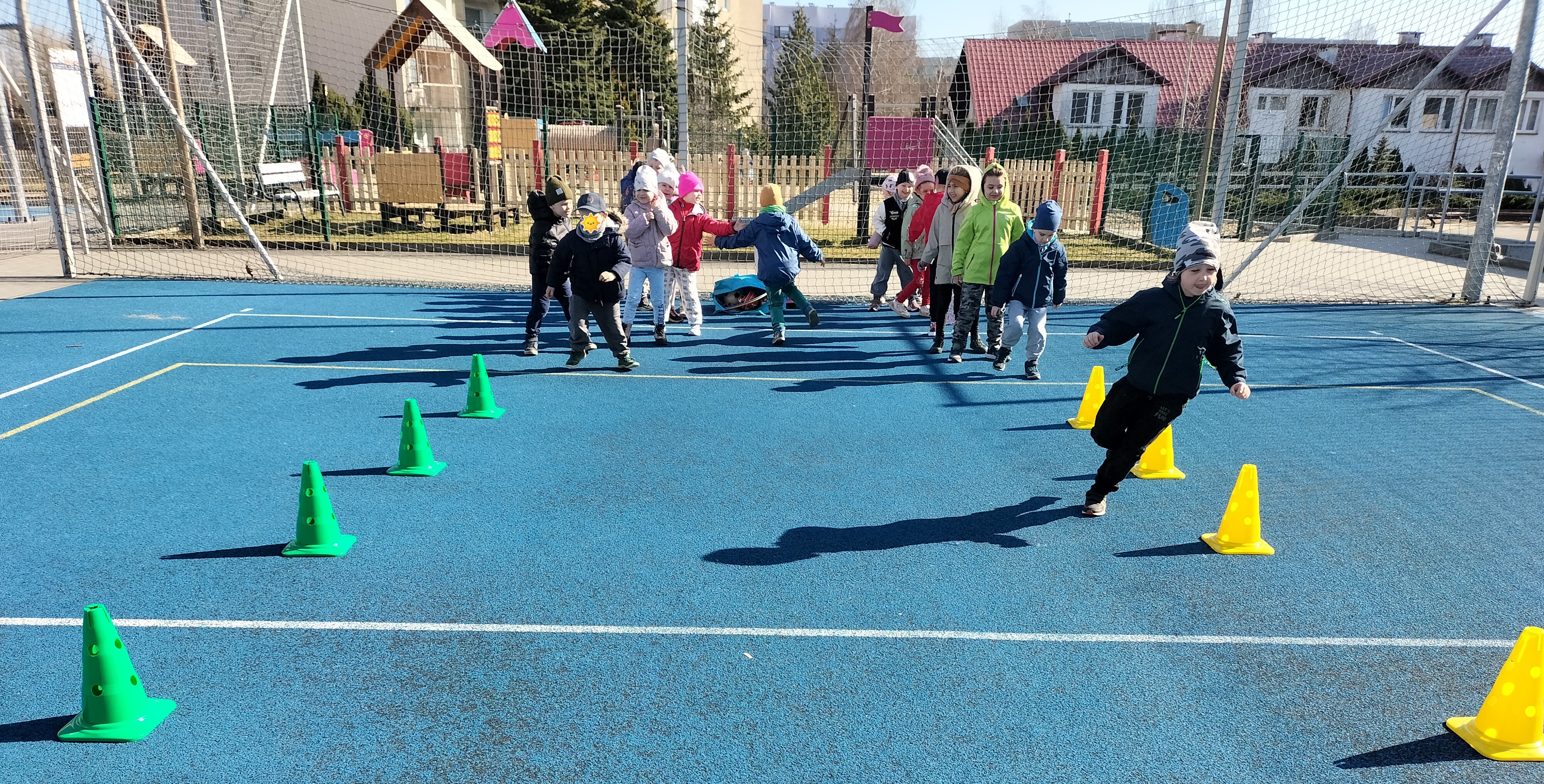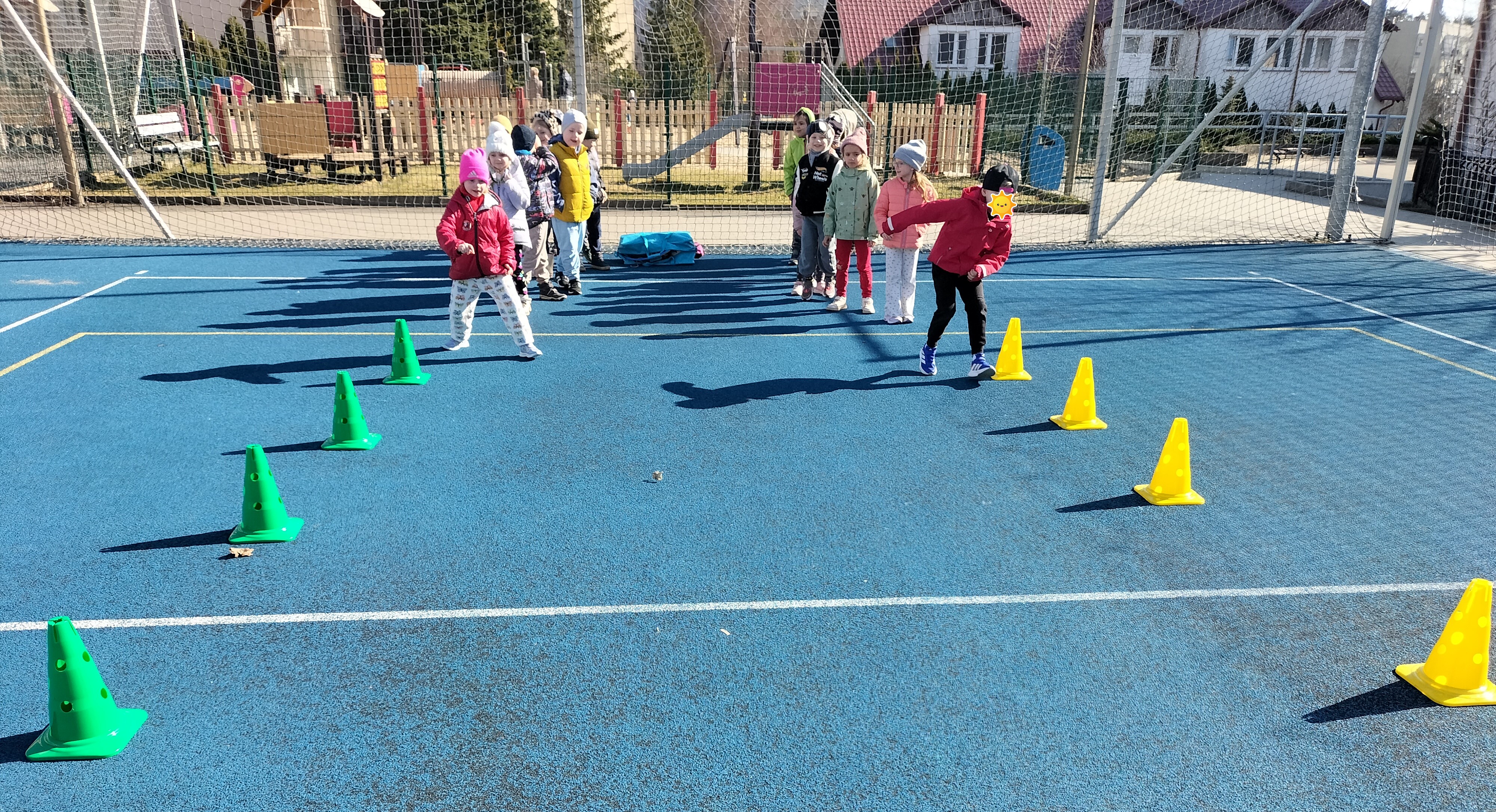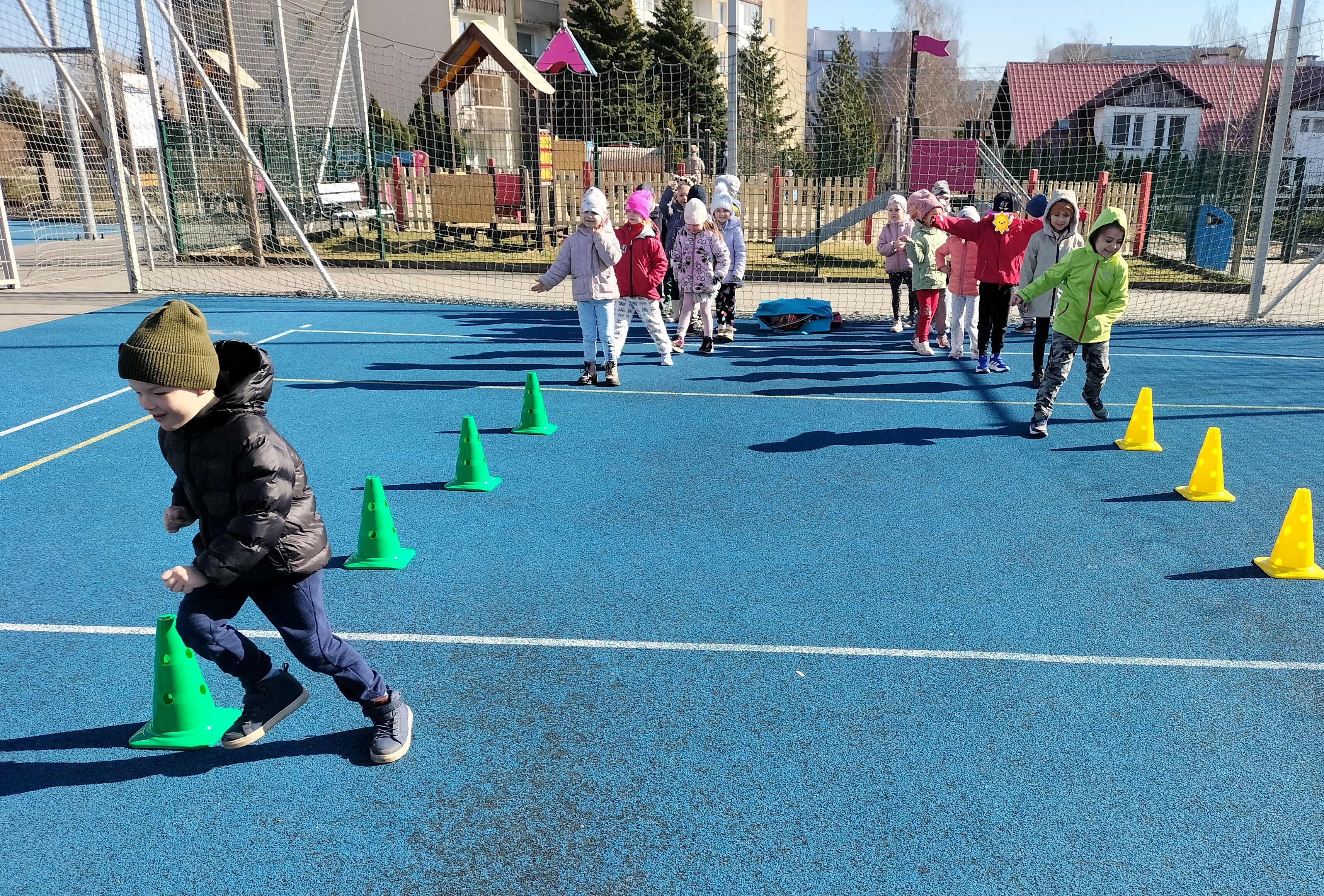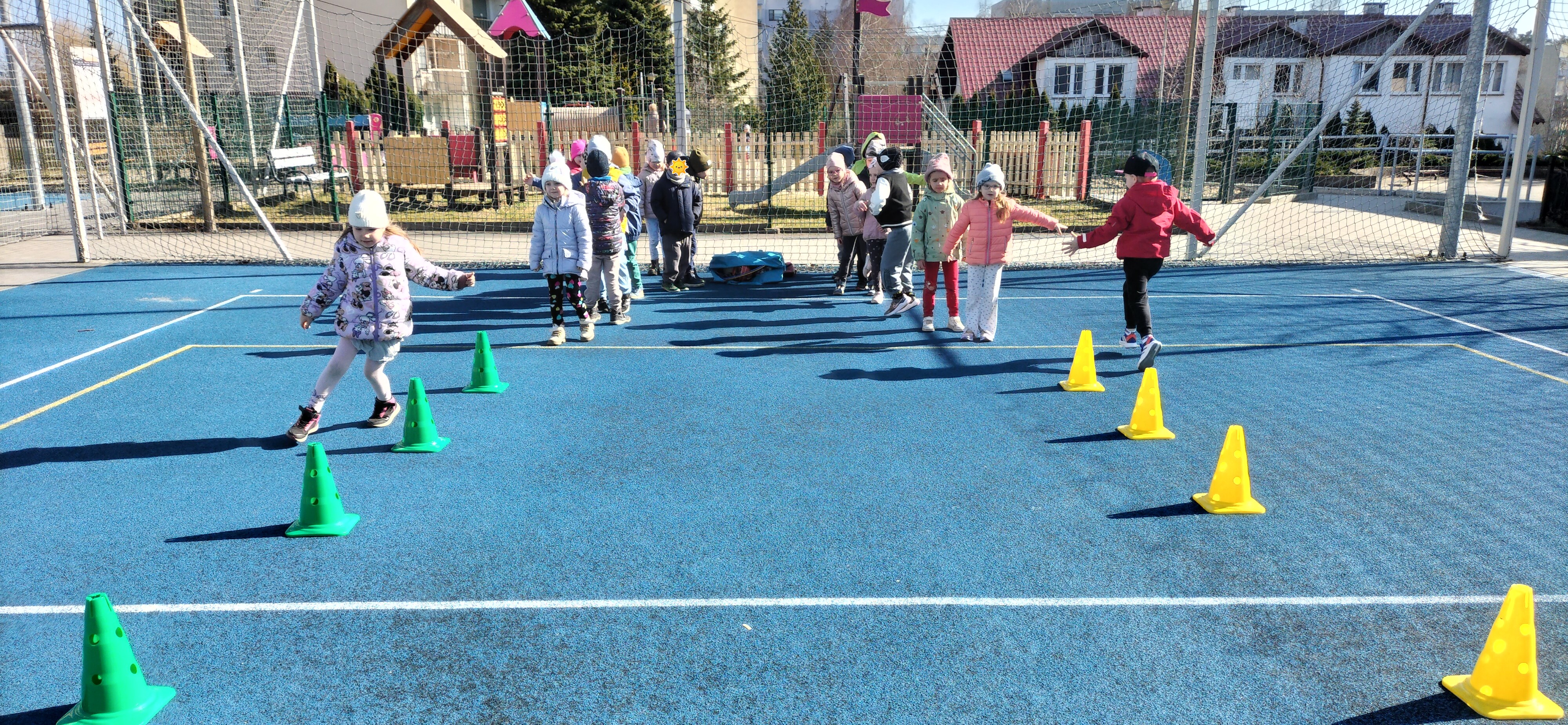 Piątkowe zajęcia ruchowe w ramach projektu POSE w grupie Elfy odbyły się na boisku szkolnym. Dzieci brały udział w zawodach drużynowych, podczas których m.in. pokonywały slalom między pachołkami, skakały przez skakankę oraz przewlekały się przez obręcz. Zajęcia były okazją do rozwijania sprawności fizycznej, koordynacji ruchowej oraz umiejętności współpracy w zespole. Towarzyszyło im dużo radości, zaangażowania i sportowej rywalizacji