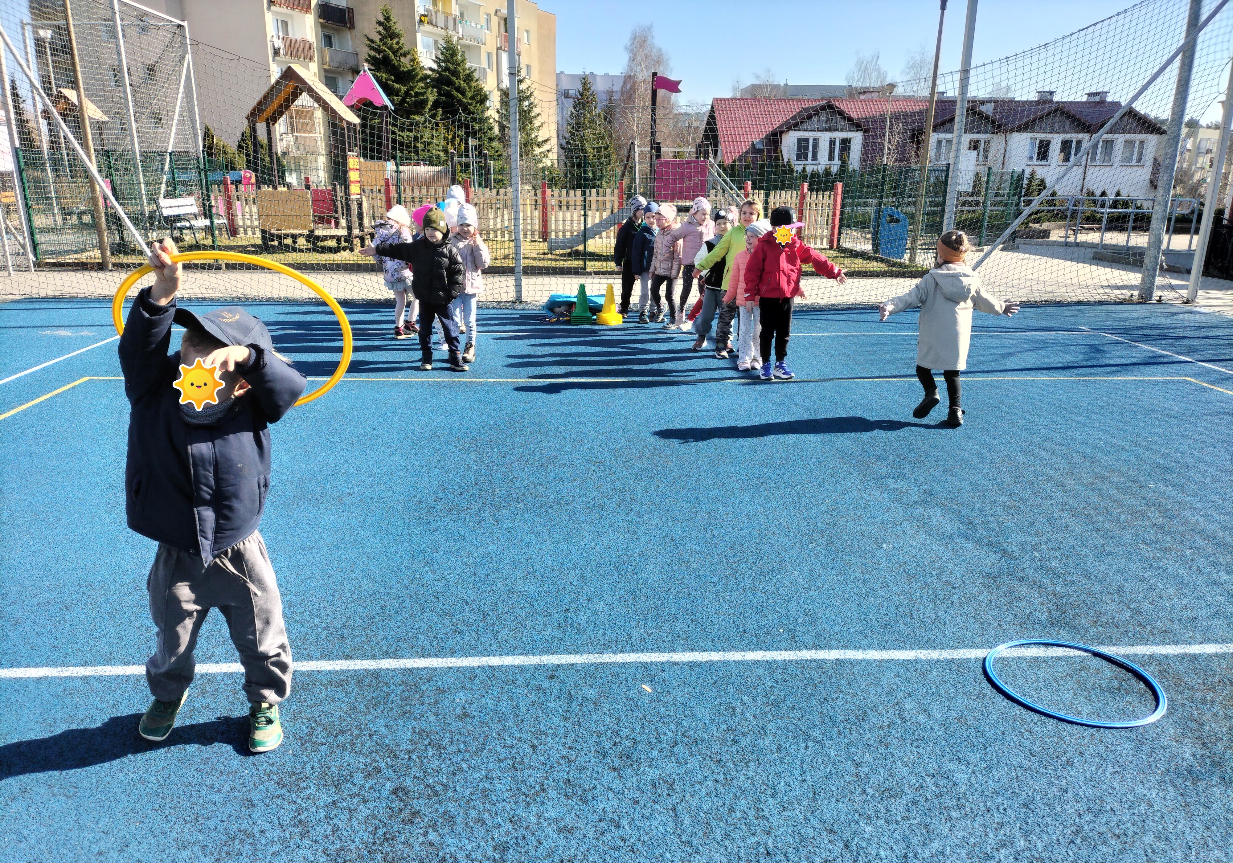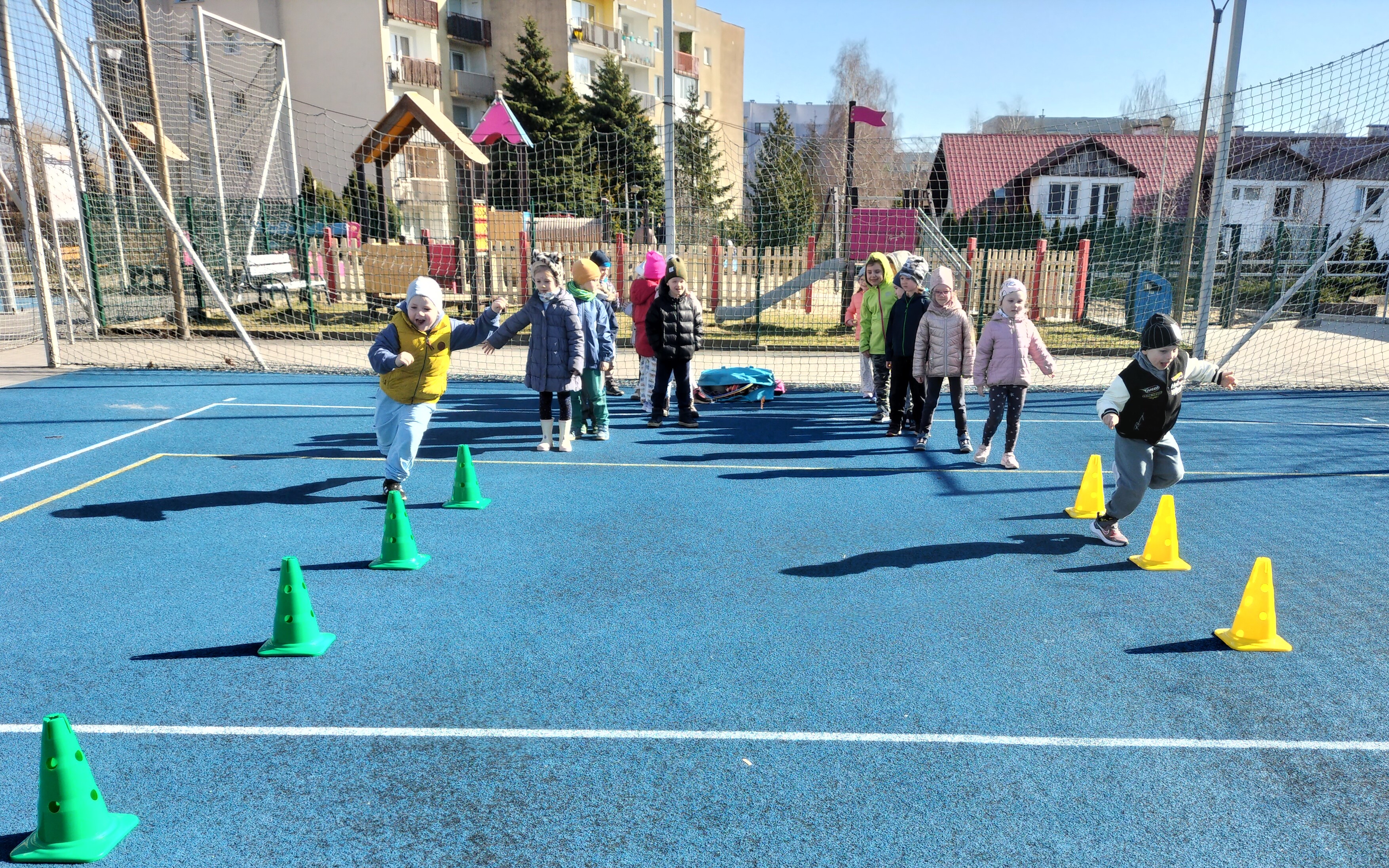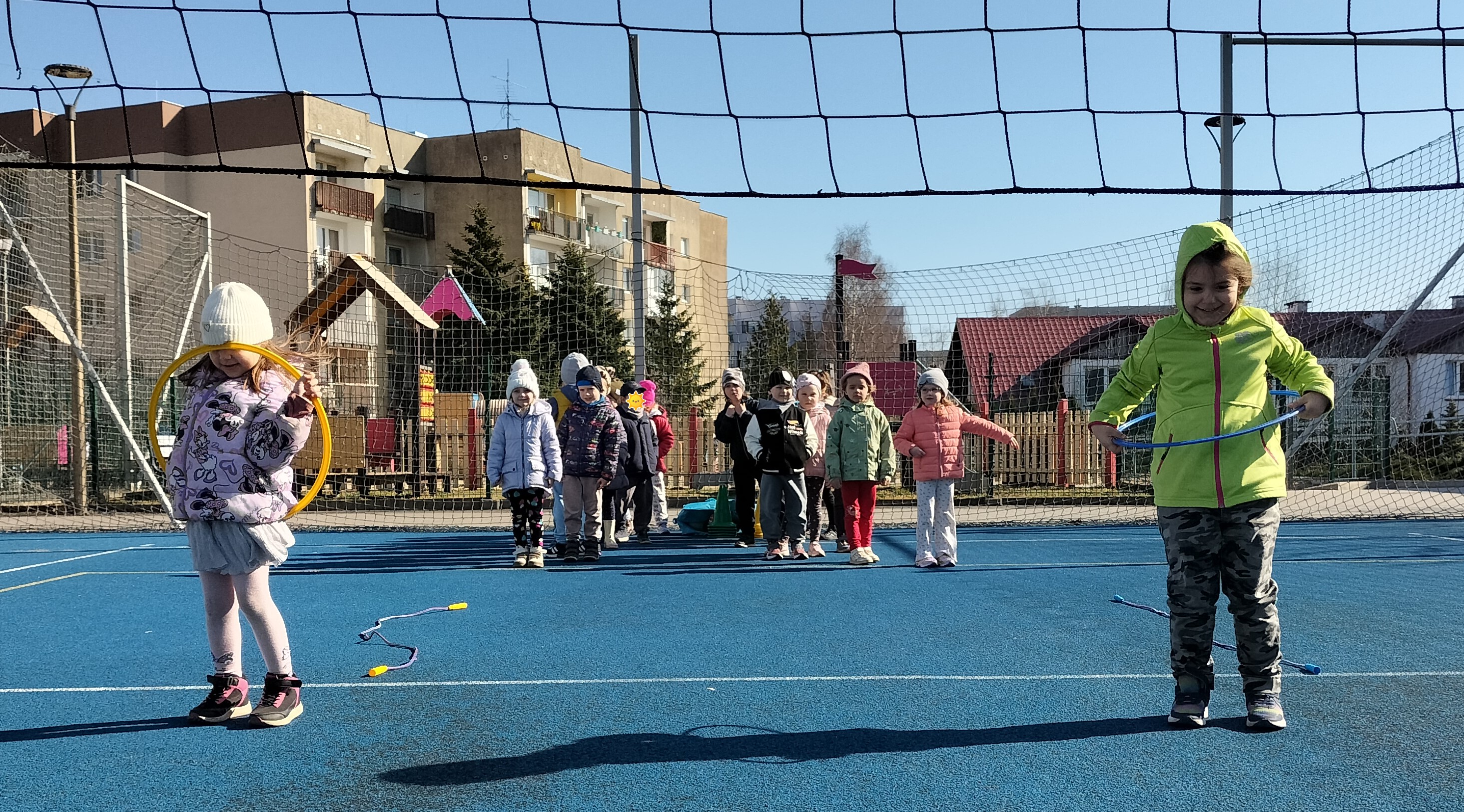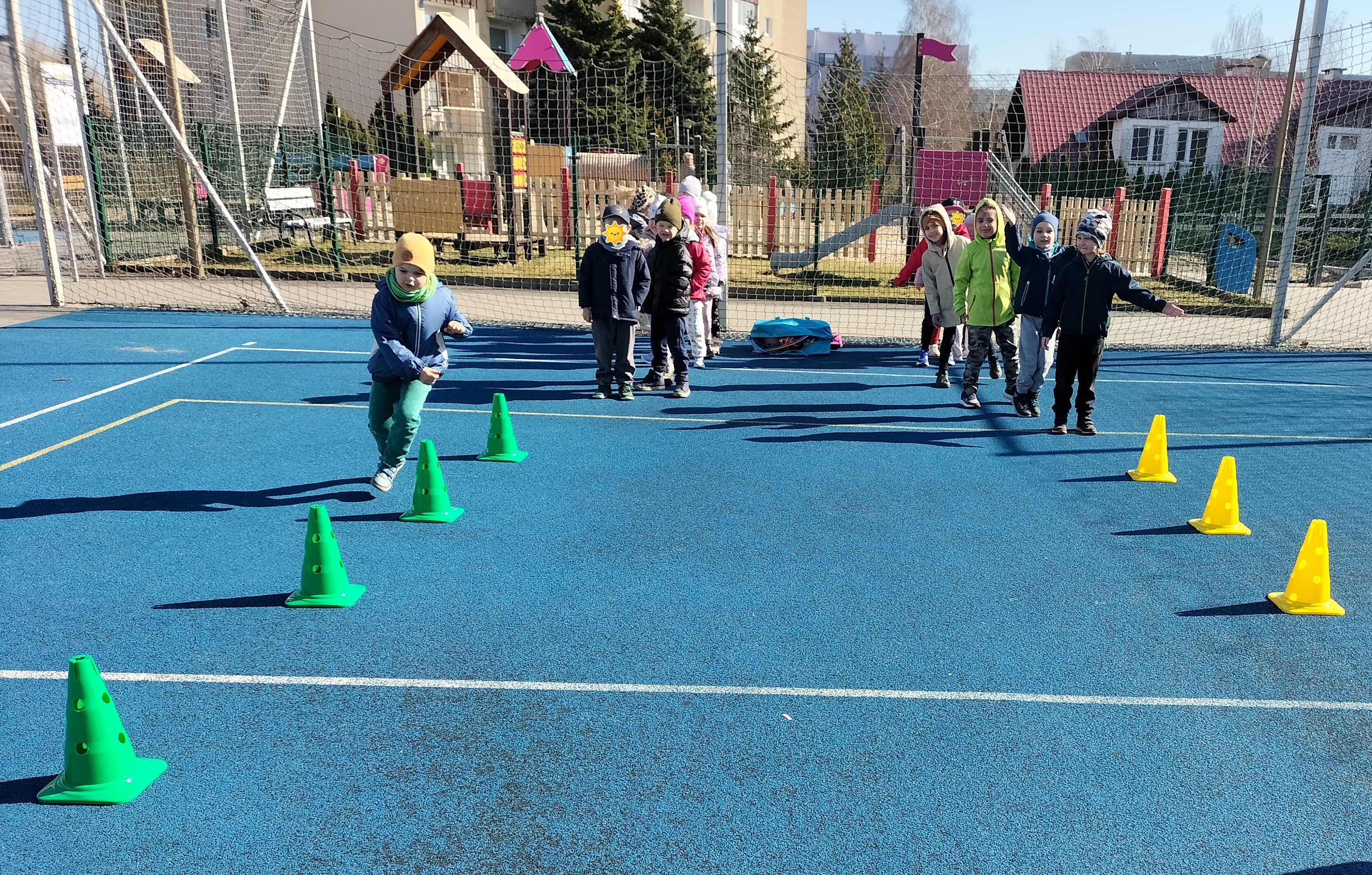 Piątkowe zajęcia ruchowe w ramach projektu POSE w grupie Elfy odbyły się na boisku szkolnym. Dzieci brały udział w zawodach drużynowych, podczas których m.in. pokonywały slalom między pachołkami, skakały przez skakankę oraz przewlekały się przez obręcz. Zajęcia były okazją do rozwijania sprawności fizycznej, koordynacji ruchowej oraz umiejętności współpracy w zespole. Towarzyszyło im dużo radości, zaangażowania i sportowej rywalizacji