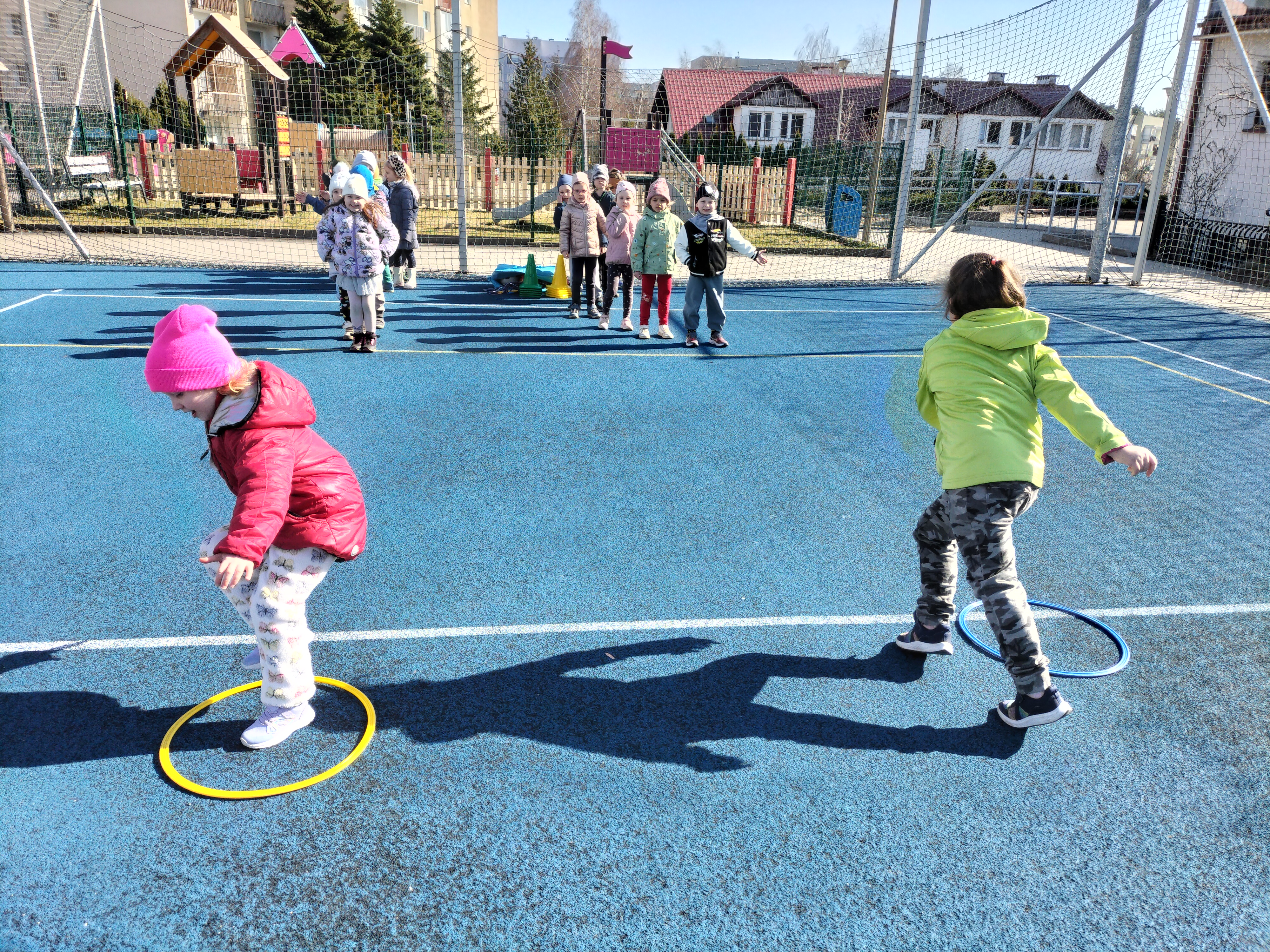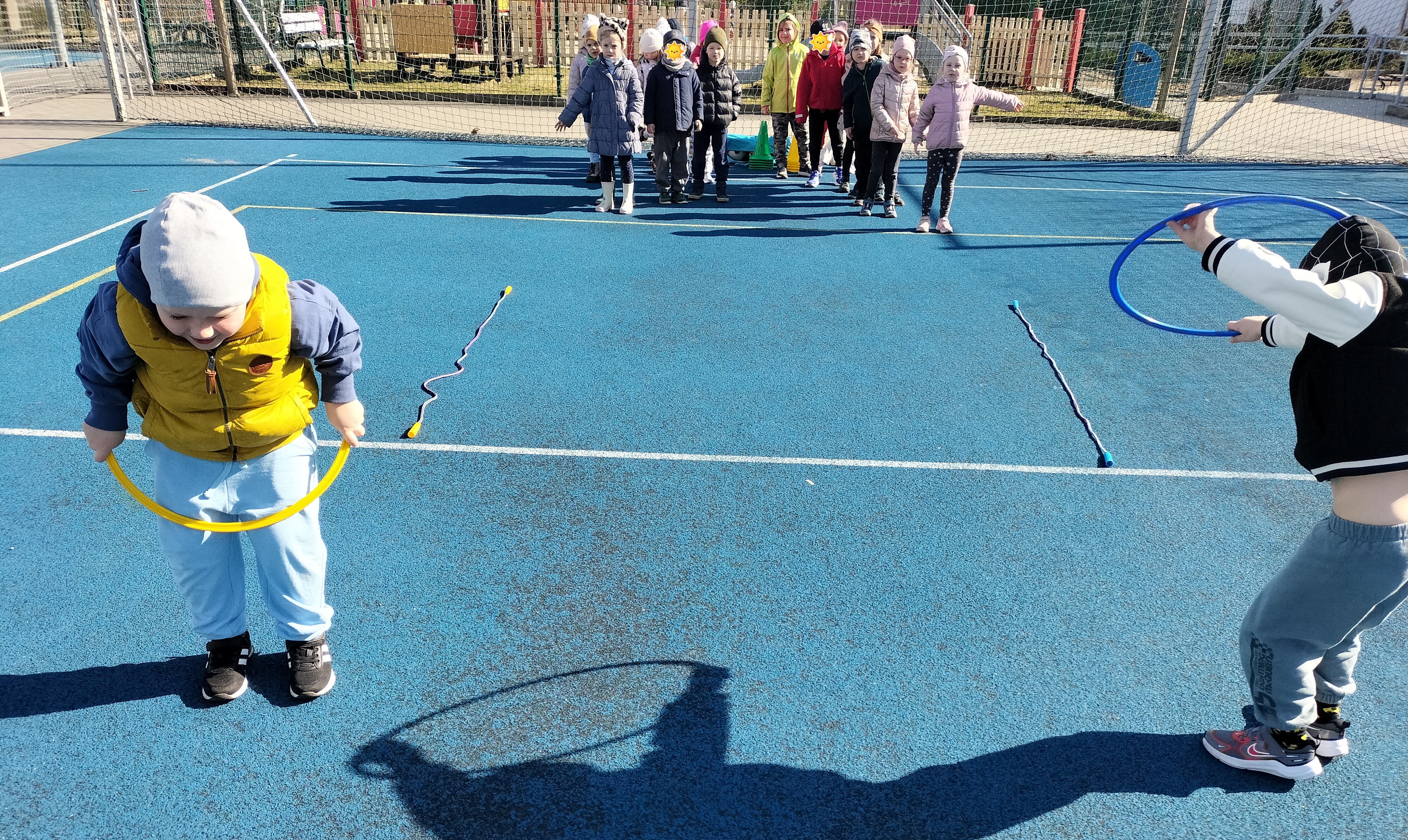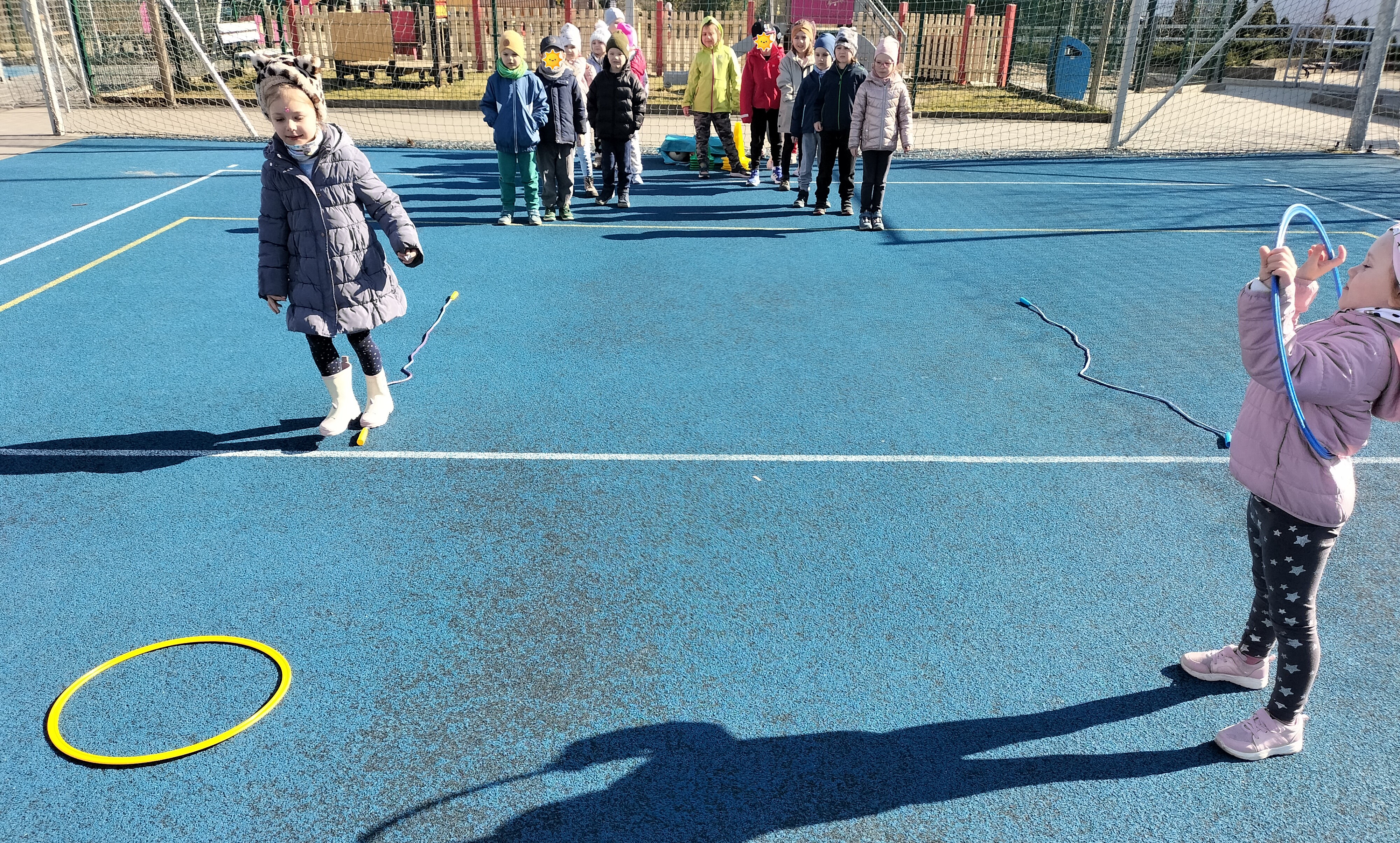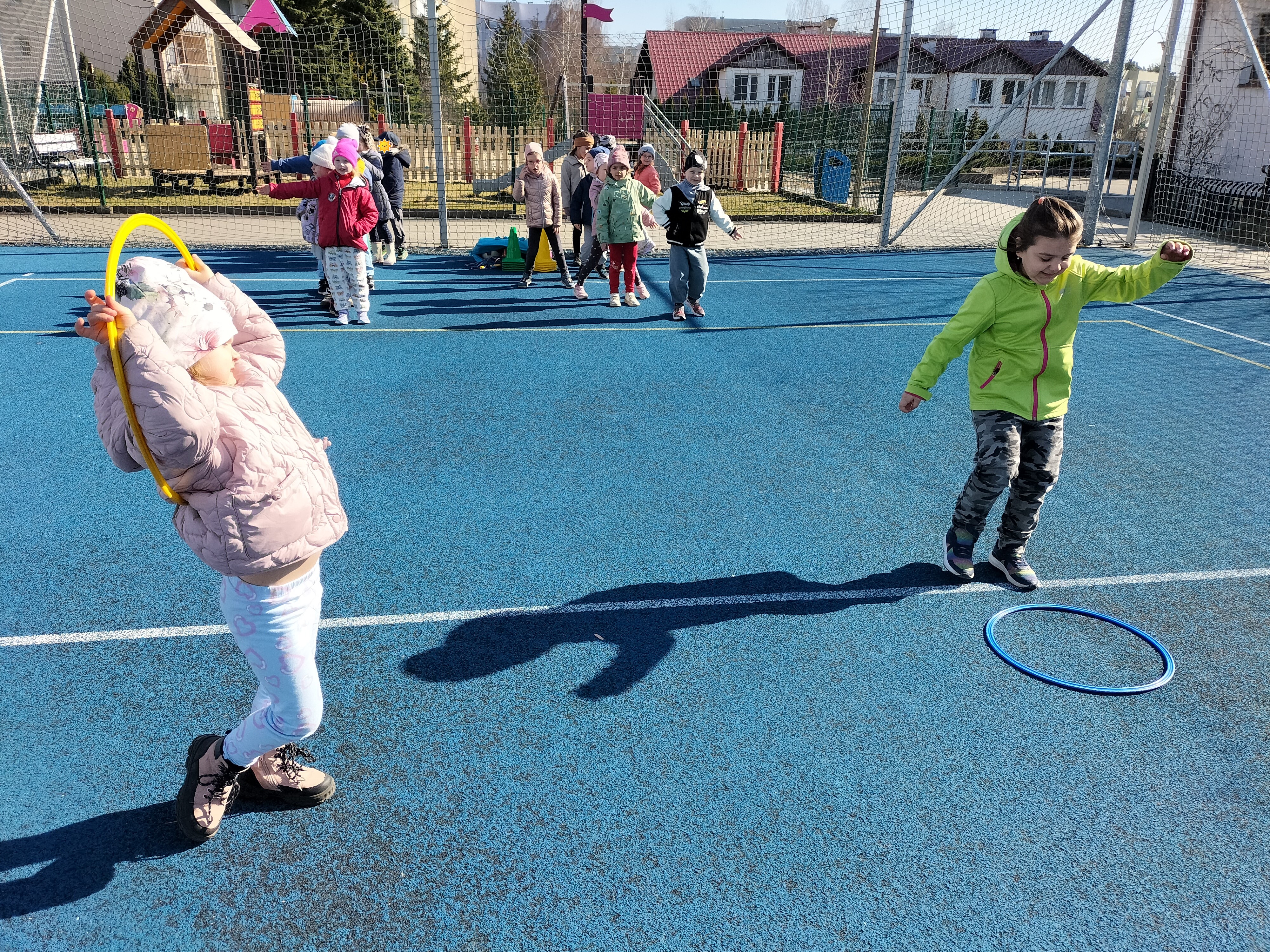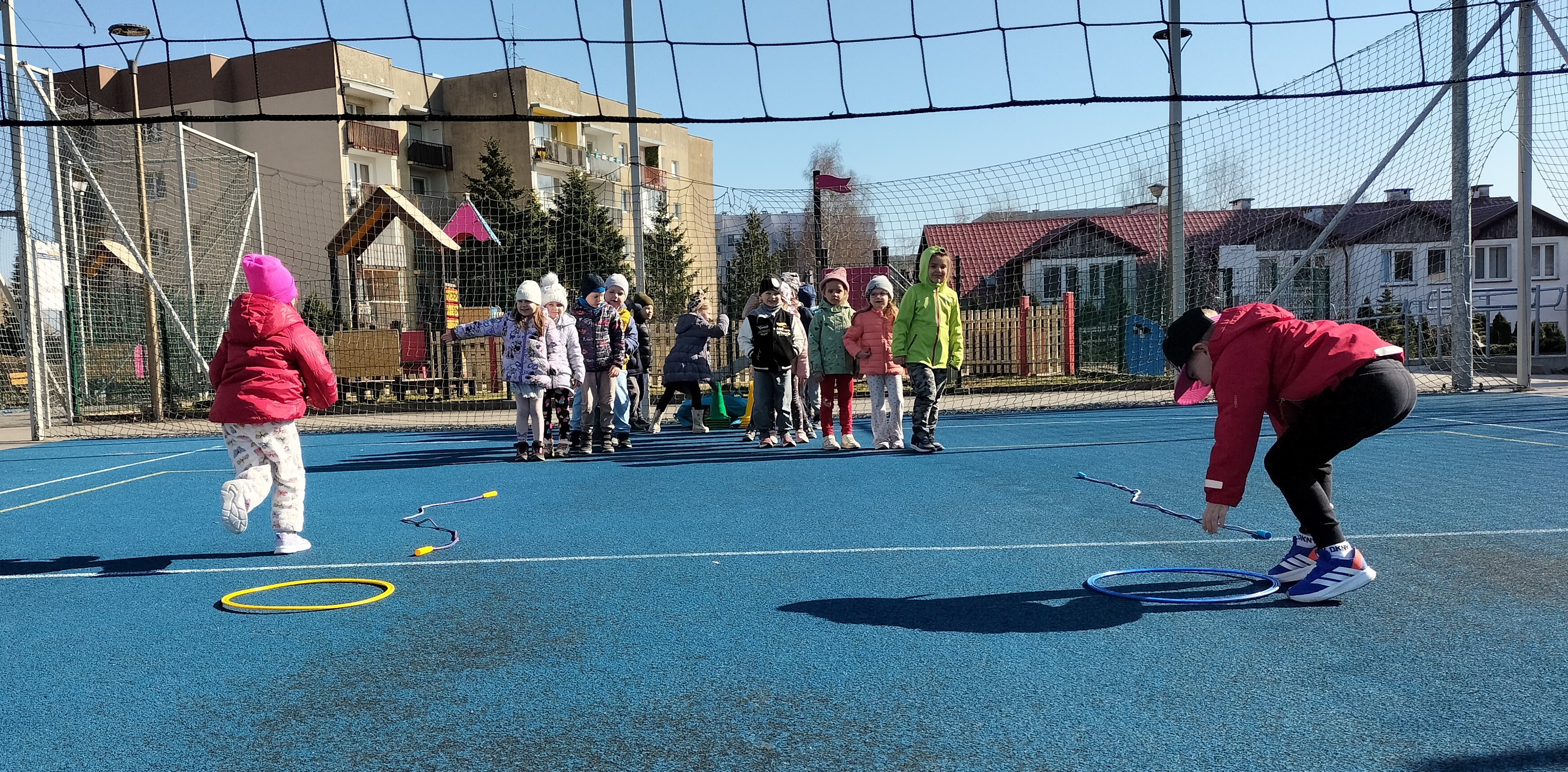 Piątkowe zajęcia ruchowe w ramach projektu POSE w grupie Elfy odbyły się na boisku szkolnym. Dzieci brały udział w zawodach drużynowych, podczas których m.in. pokonywały slalom między pachołkami, skakały przez skakankę oraz przewlekały się przez obręcz. Zajęcia były okazją do rozwijania sprawności fizycznej, koordynacji ruchowej oraz umiejętności współpracy w zespole. Towarzyszyło im dużo radości, zaangażowania i sportowej rywalizacji