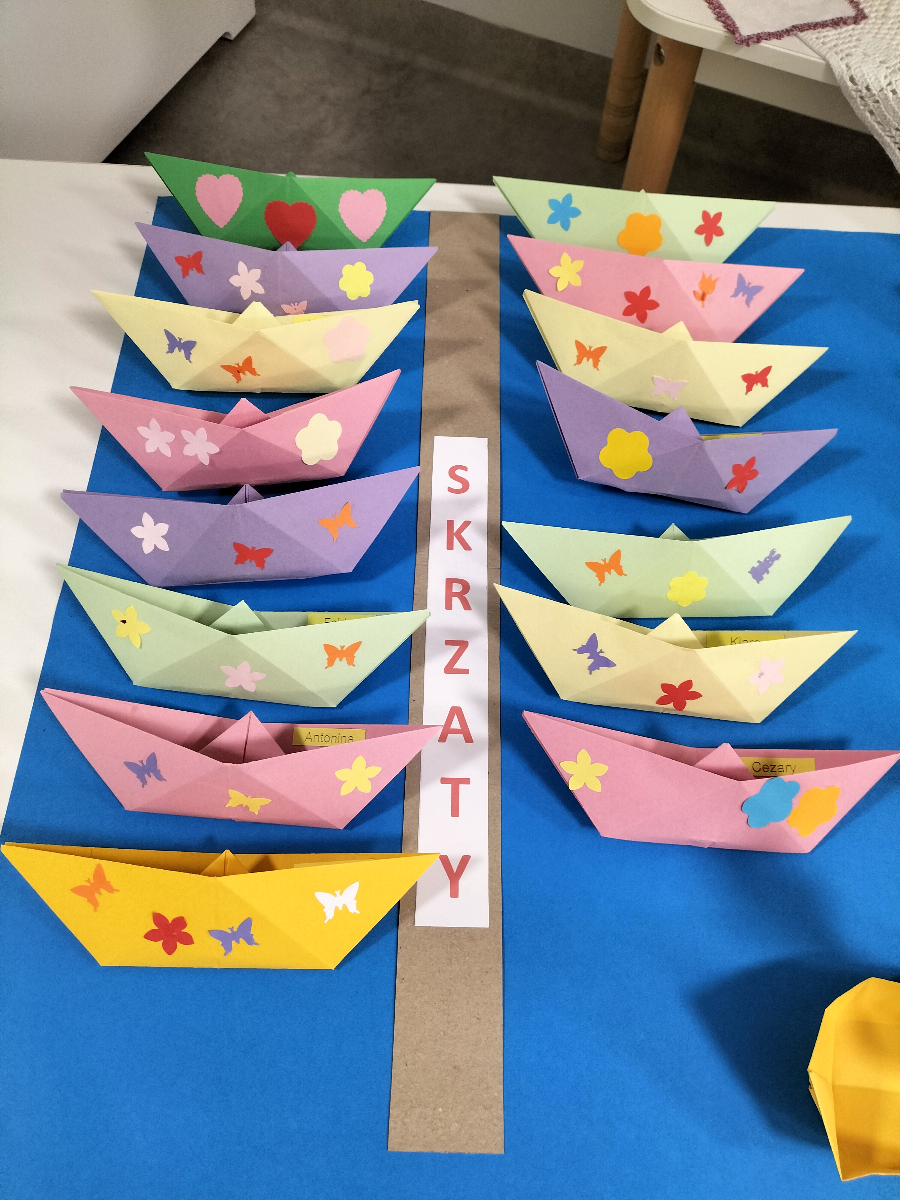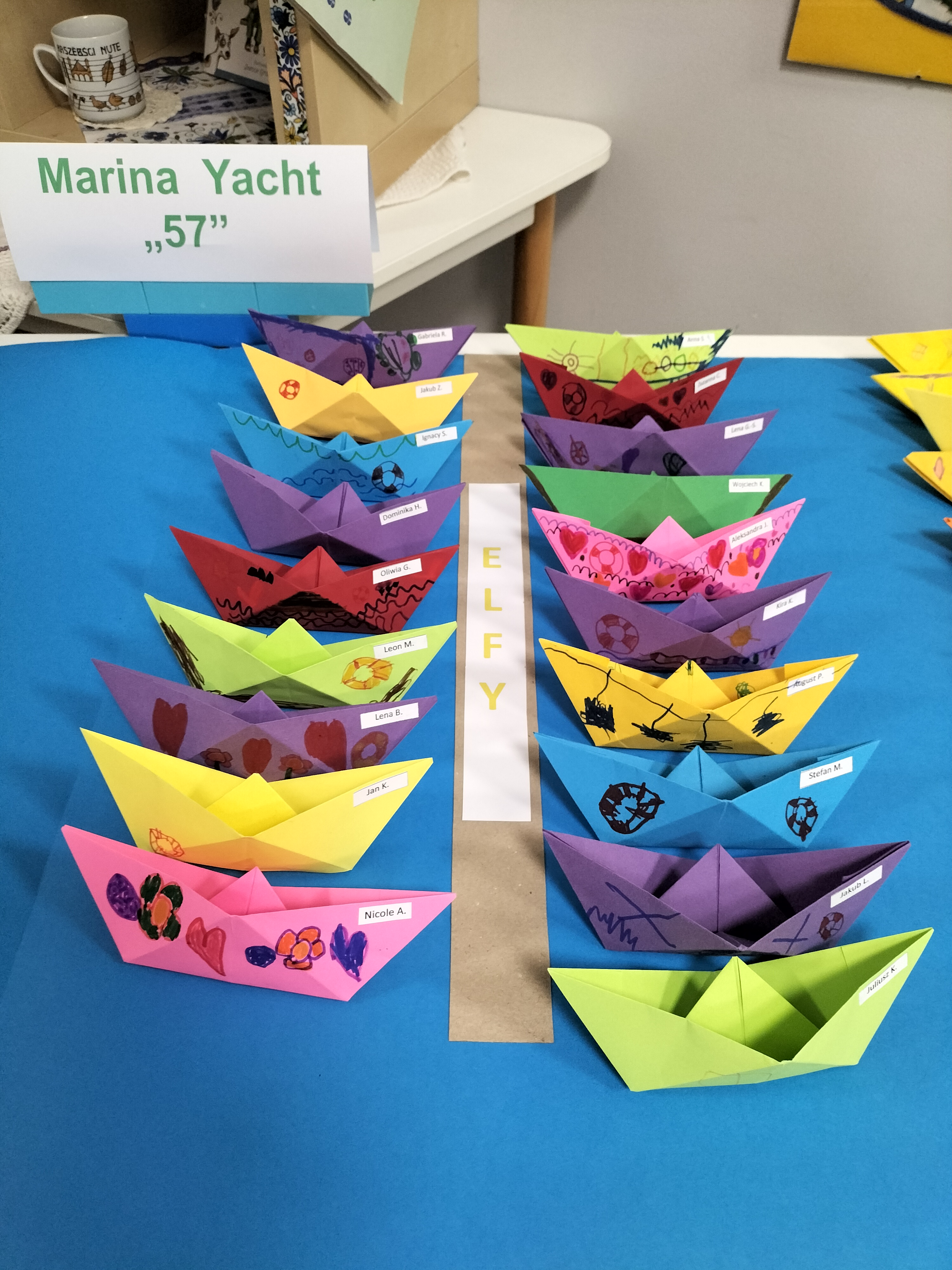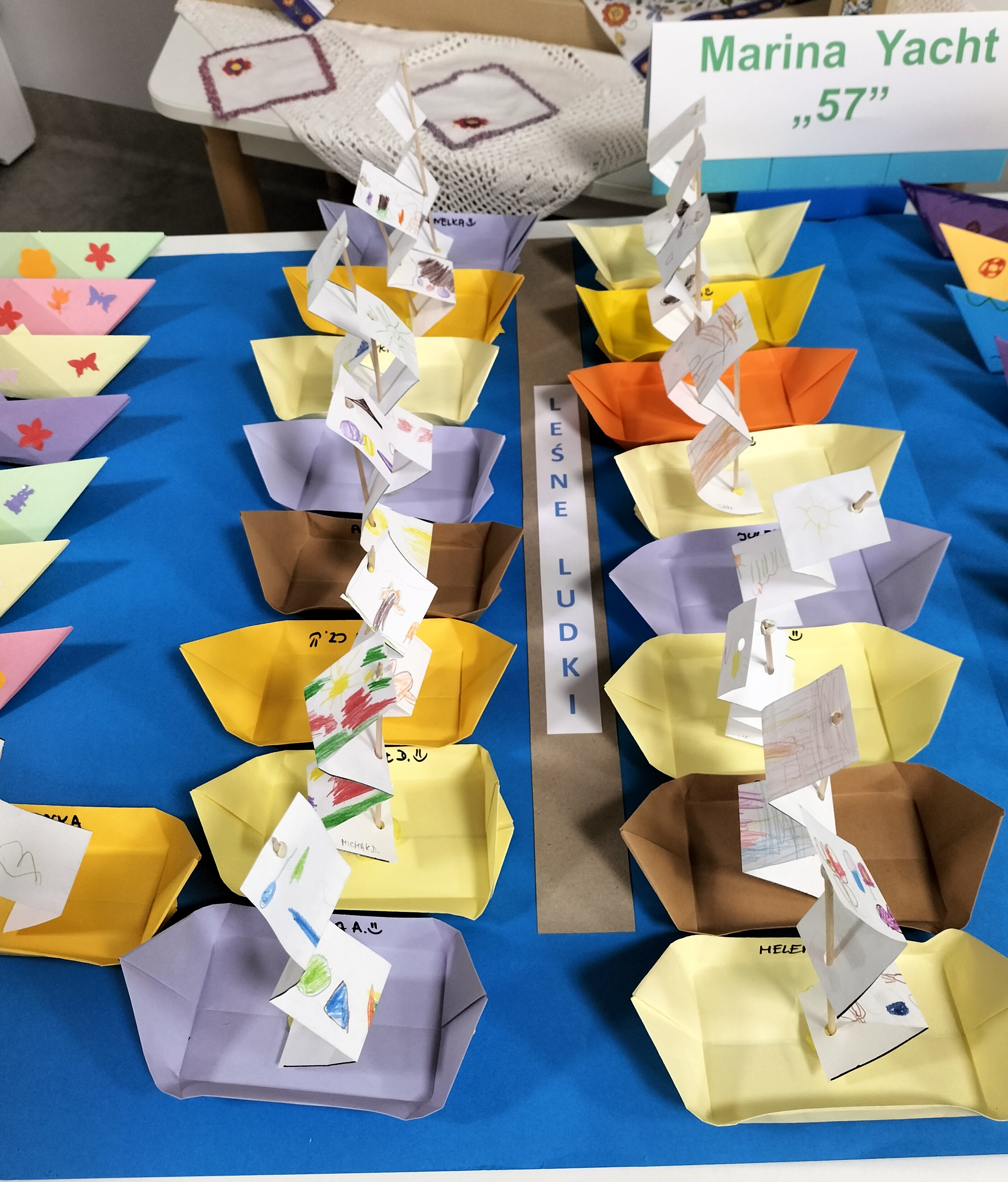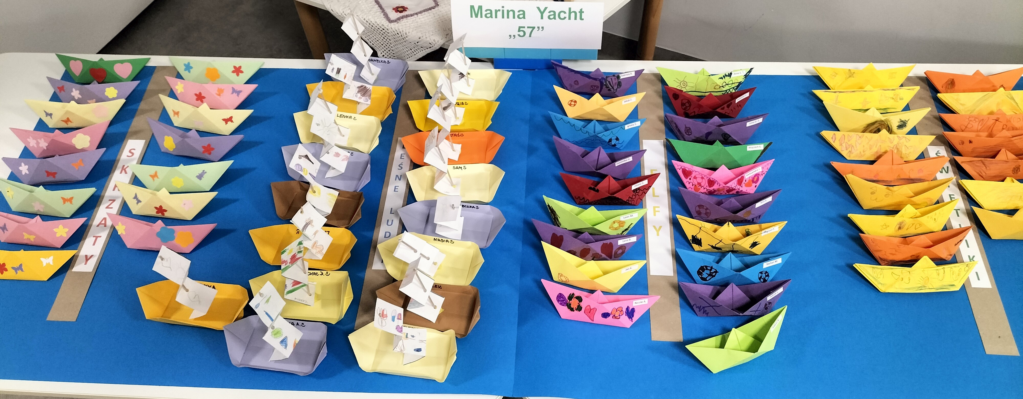 Poznaliśmy jednostki pływające, które przypływają do portu i cumują w marinie gdyńskiej. Rozmawialiśmy o ich wyglądzie, przeznaczeniu oraz pracy ludzi związanych z morzem. Każda grupa wykonała własne jednostki pływające. Starsze dzieci samodzielnie składały swoje łódki i żaglowce, natomiast młodsze z zaangażowaniem ozdabiały przygotowane wcześniej modele. Efektem naszej wspólnej pracy jest makieta Marina Yacht „57”, stanowiąca zwieńczenie wszystkich działań.