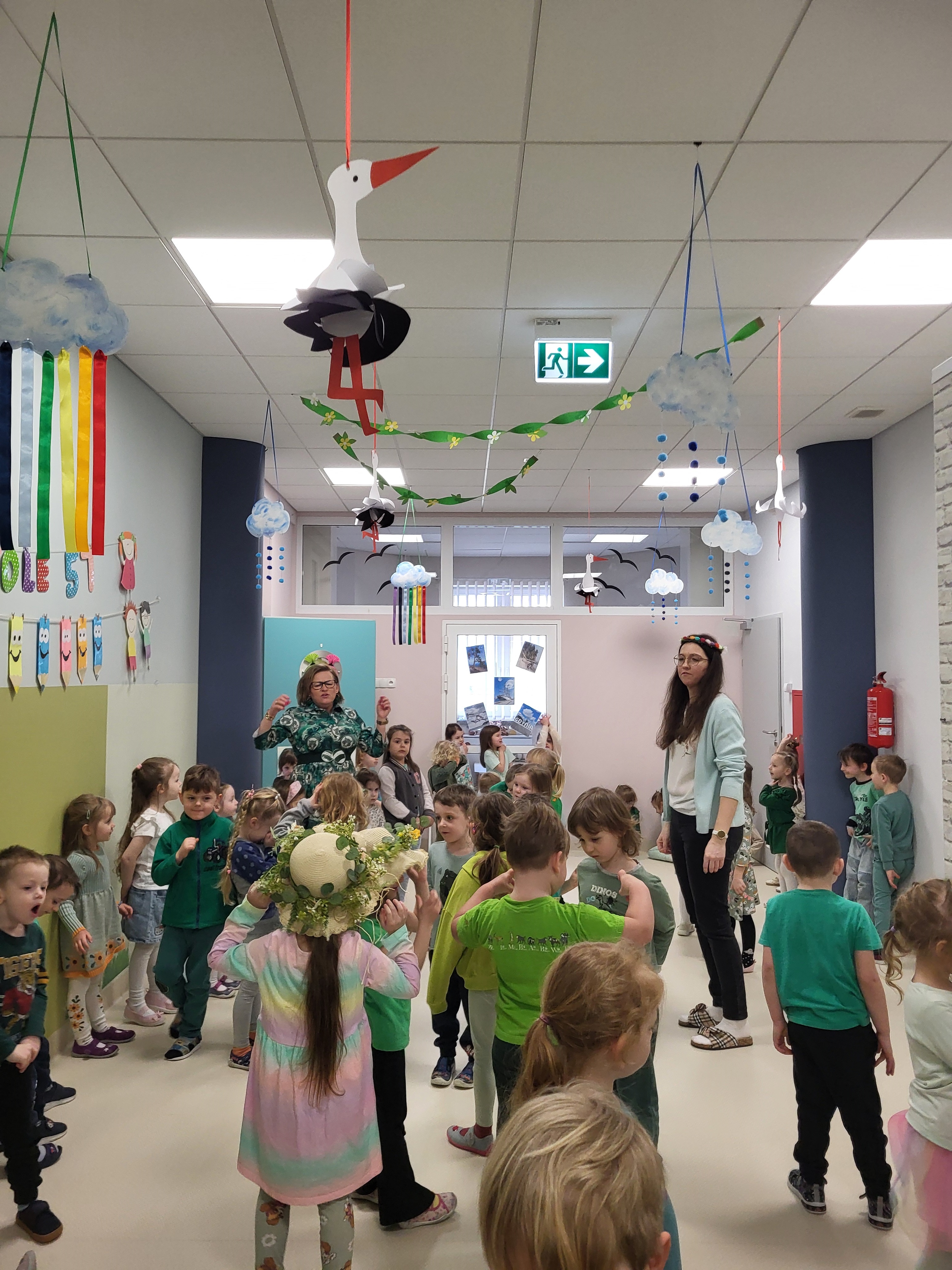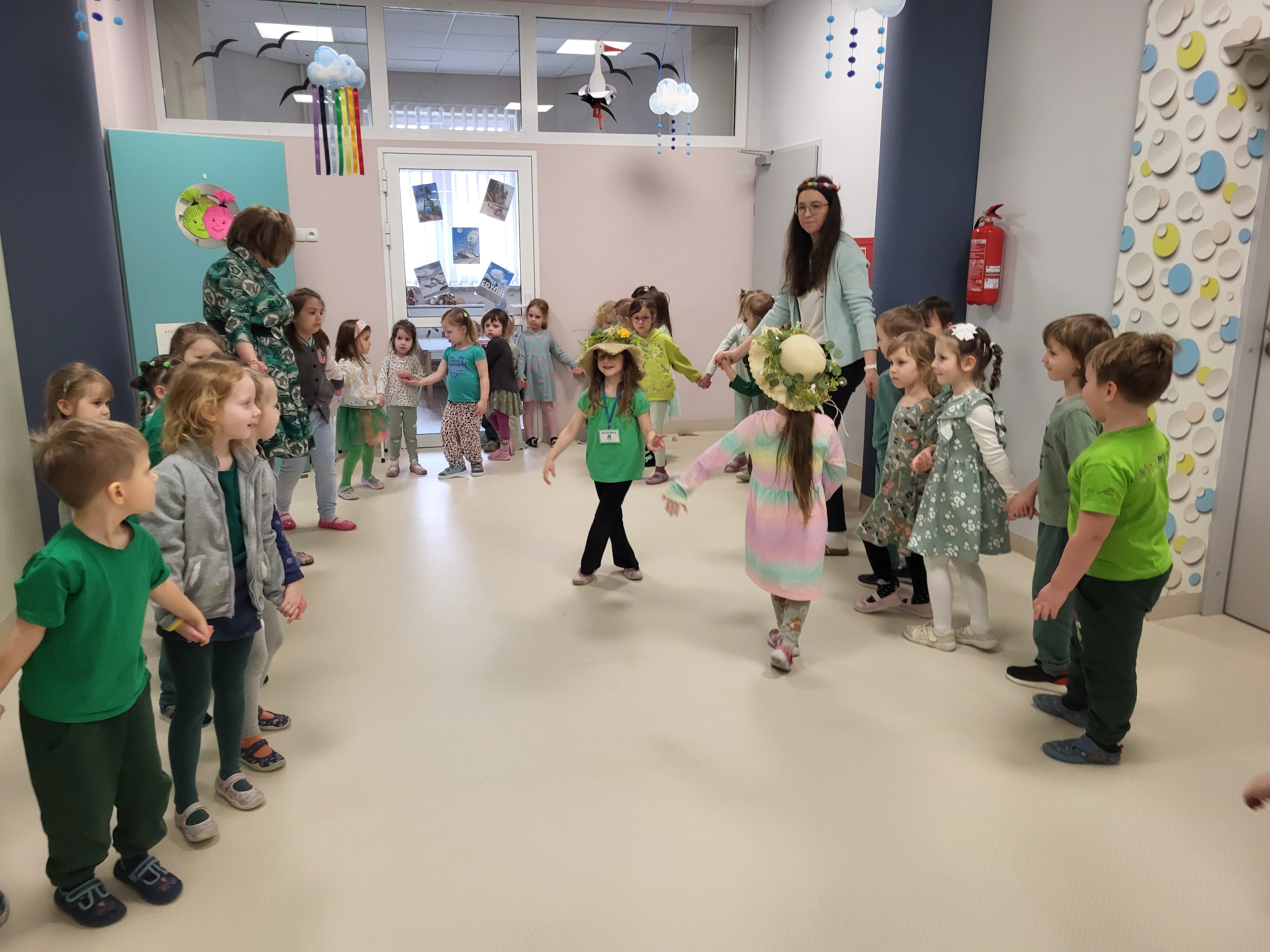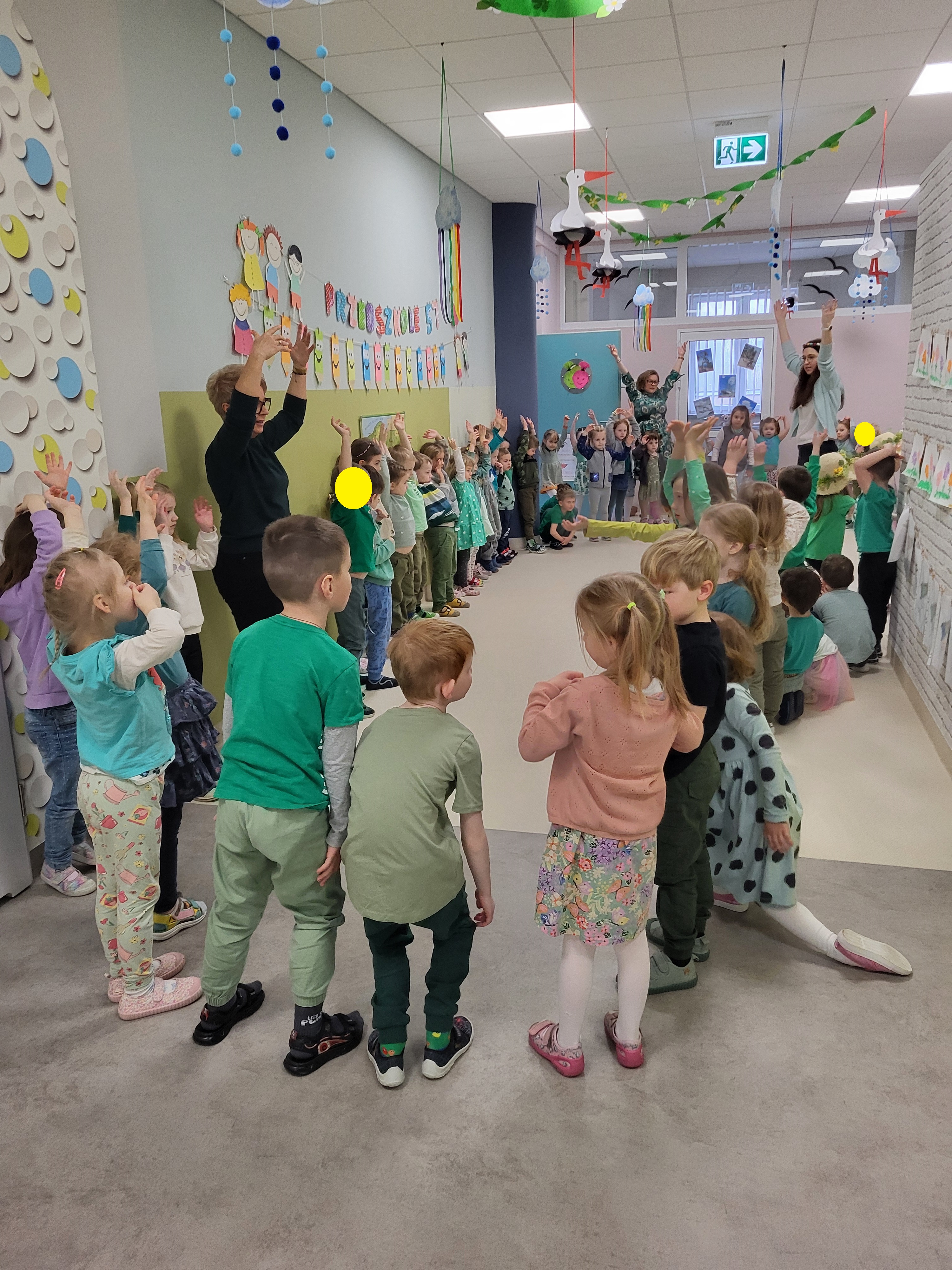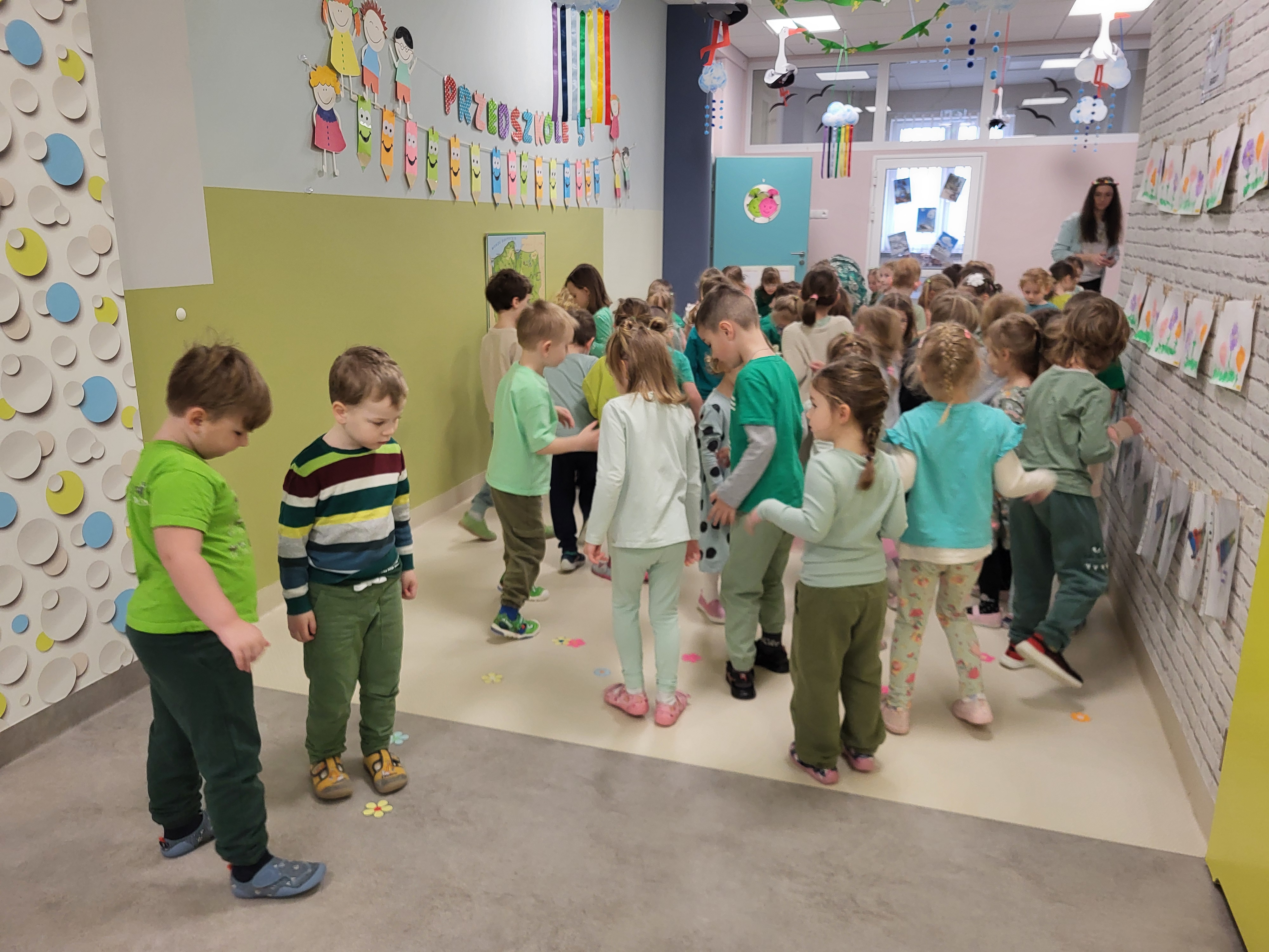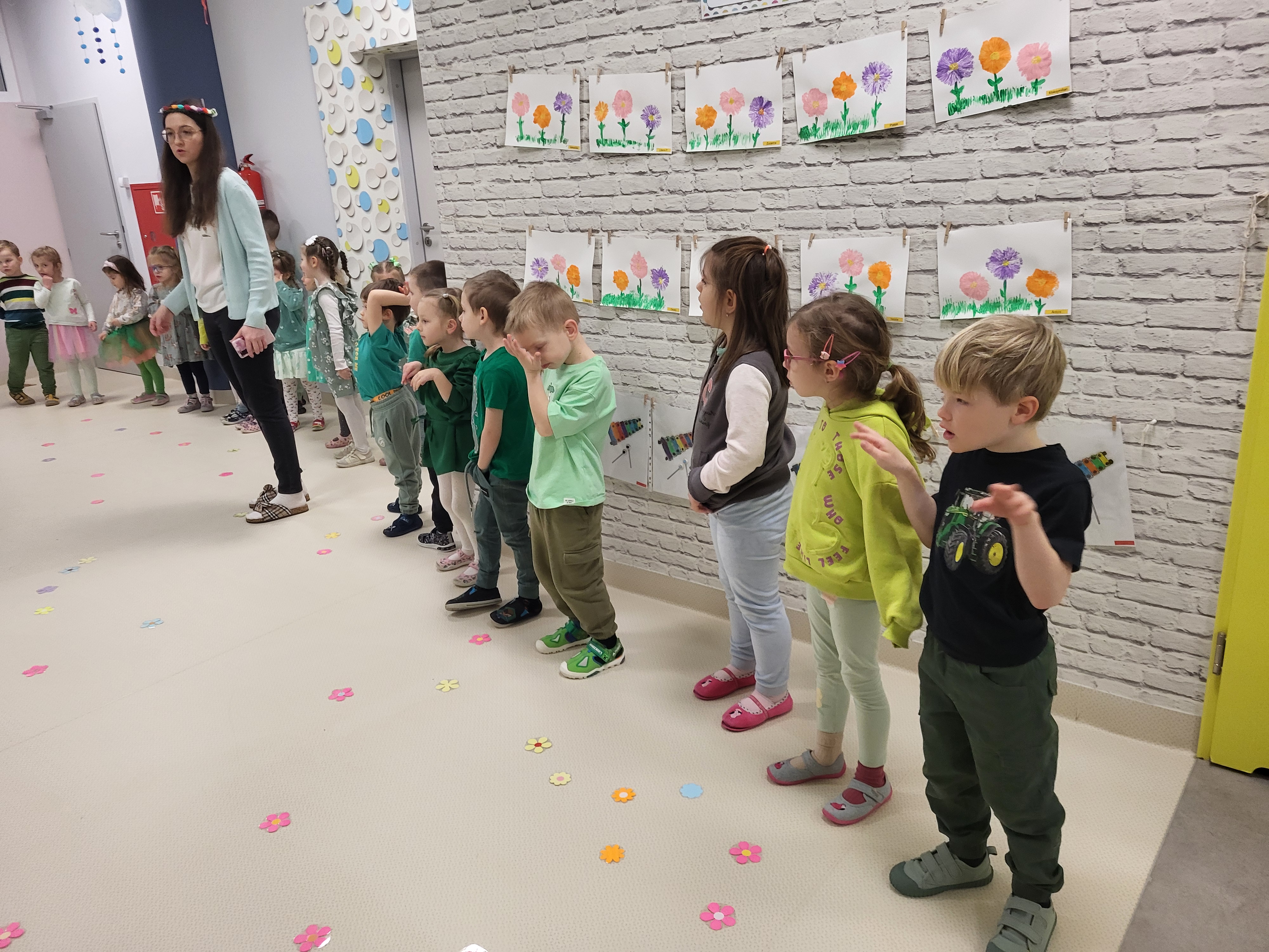 W piątek 20 marca wszystkie dzieci z naszego przedszkola świętowały Pierwszy Dzień Wiosny. Na początku, przedszkolaki dowiedziały się o starym zwyczaju topienia Marzanny. Wszystkie grupy wyszły na spacer, podczas którego mogły pożegnać zimę i powitać wiosnę. Przedszkolaki radośnie maszerowały z instrumentami oraz zaśpiewały przygotowane wcześniej piosenki o wiośnie. Dzieci szukały liści, które utworzyły napis: WIOSNA. Na korytarzu przedszkolnym odbyła się kolejna część zabaw. Wszystkie grupy starały się jak najszybciej znaleźć kolorowe kwiatki umieszczone na podłodze. Ponadto, przedszkolaki improwizowały ruchowo do muzyki klasycznej. W ten sposób wszystkie dzieci chciały wyrazić swoją radość z przyjścia nowej pory roku. Wszystkie grupy poznały tradycje i zwyczaje związane z powitaniem wiosny. Tego dnia wszyscy świetnie się bawili.