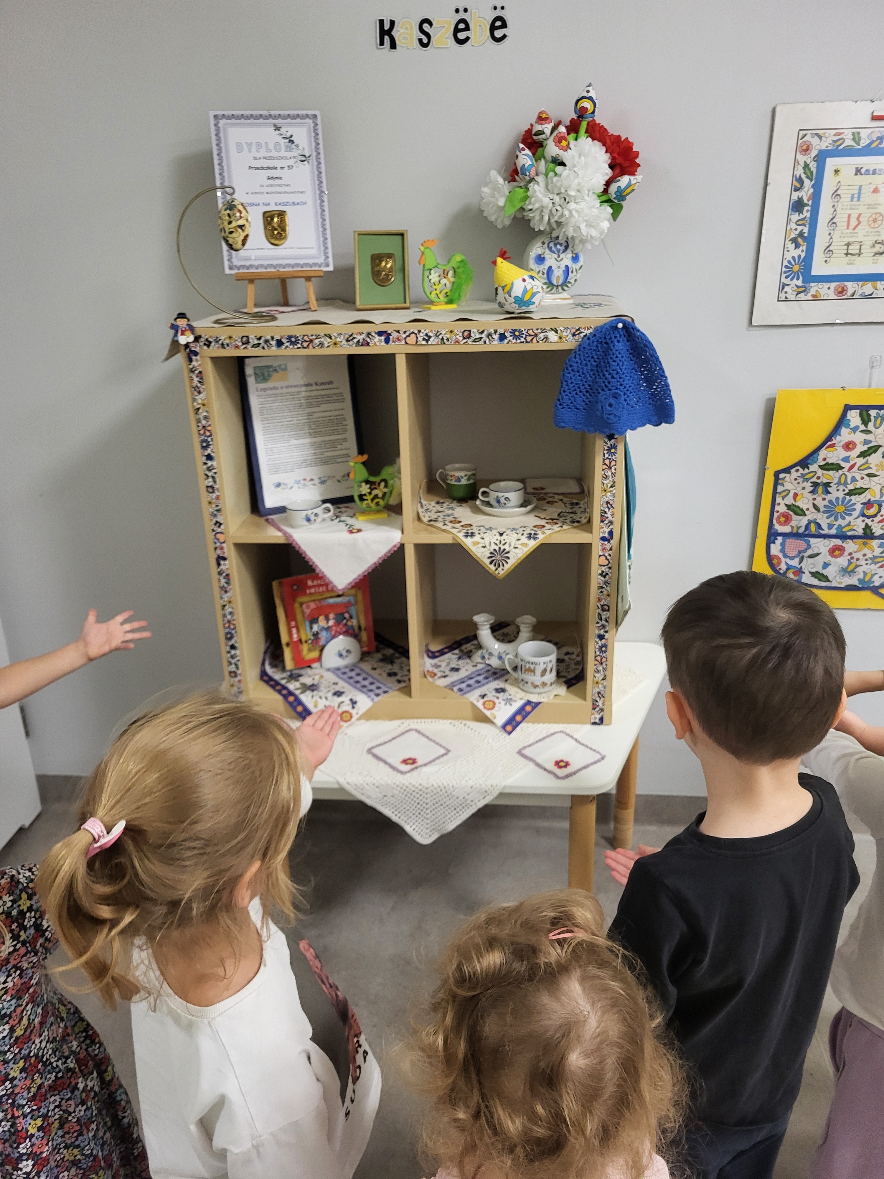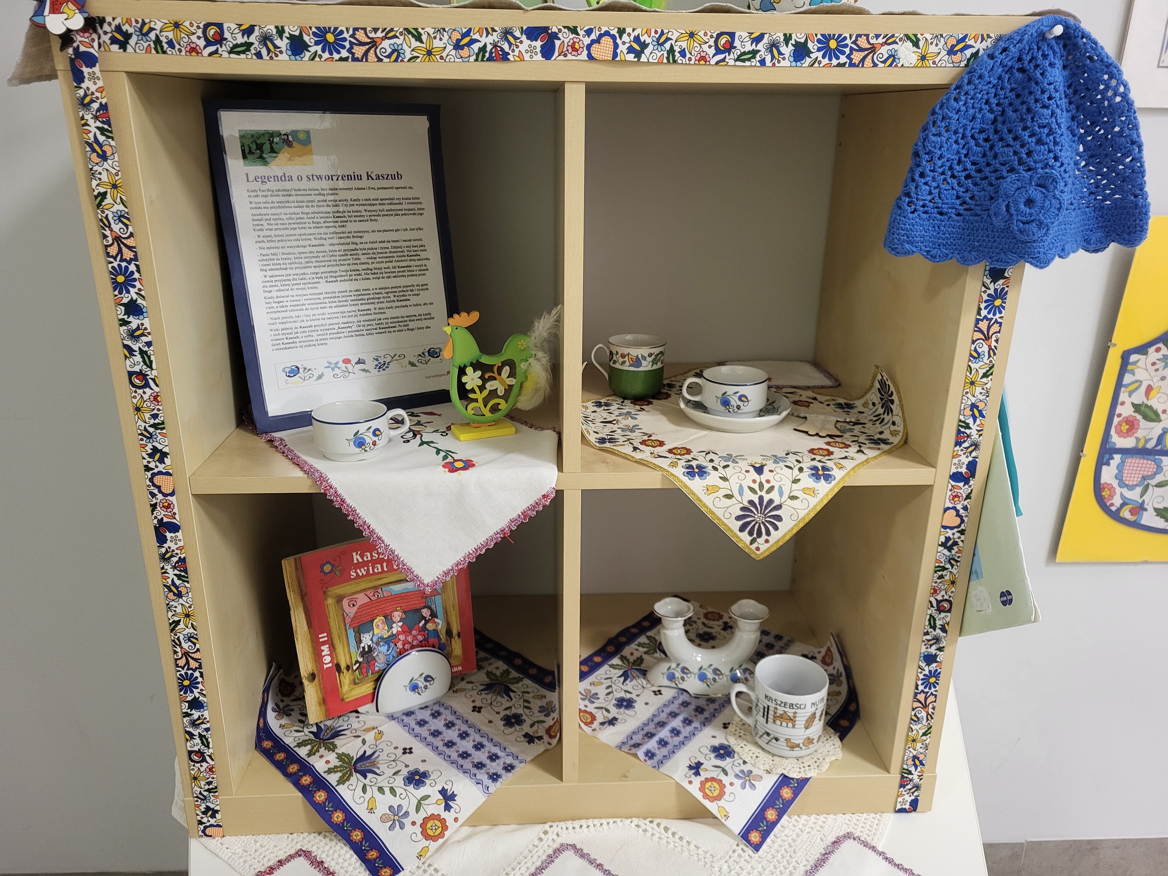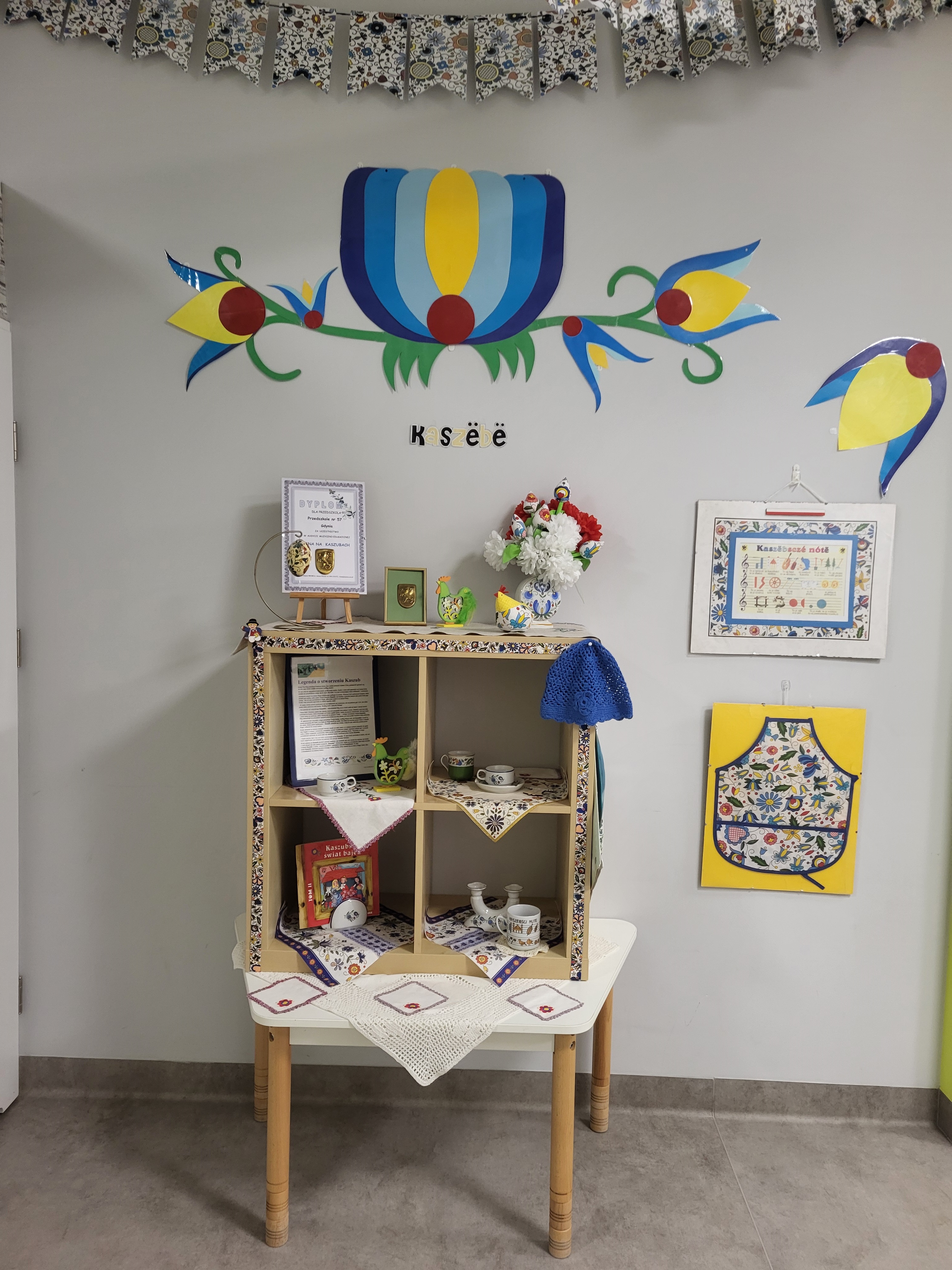 W naszym przedszkolu został przygotowany kącik kaszubski– jest to jeden z elementów realizacji projektu "Piękna Nasza Polska Cała". W kąciku wyeksponowane zostały elementy dekoracyjne wnętrza domu takie jak filiżanka czy świecznik. Znaleźć można było również kaszubskie nuty czy fartuch z regionalnym haftem. Zgromadzone eksponaty stanowią cenny materiał edukacyjny dla przedszkolaków, umożliwiający im bezpośredni kontakt z tradycją kaszubską. Całość została dopełniona kaszubską fotobudką. Wszystkie te elementy przygotowała pani Ala- wychowawczyni grupy Leśne Ludki, za co serdecznie jej dziękujemy.