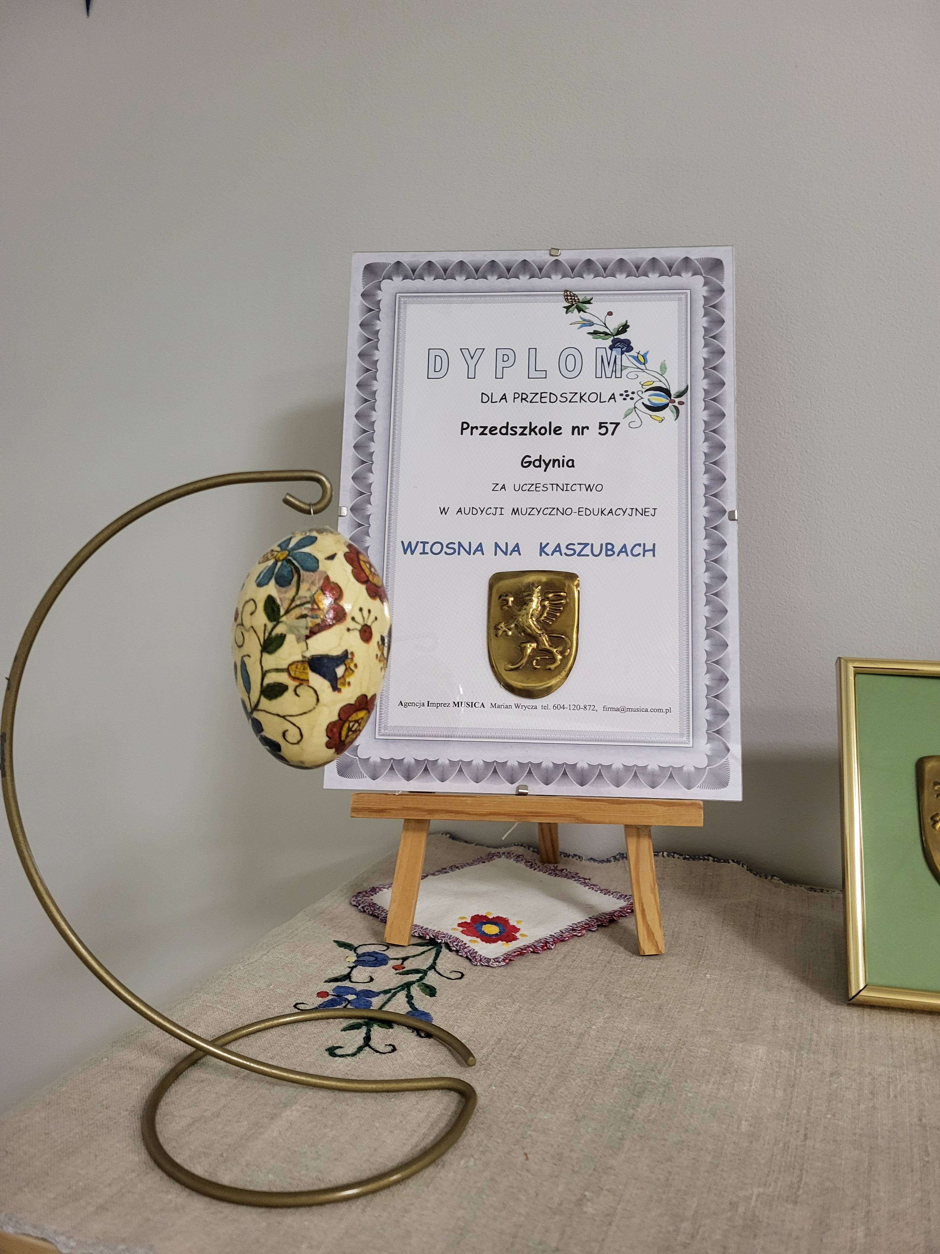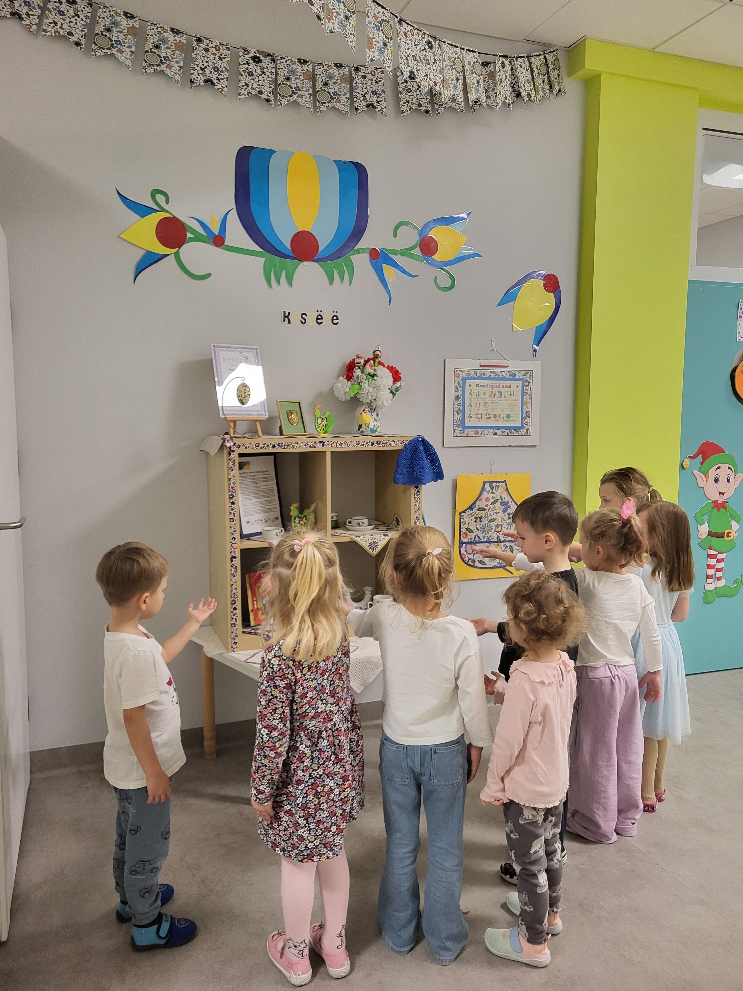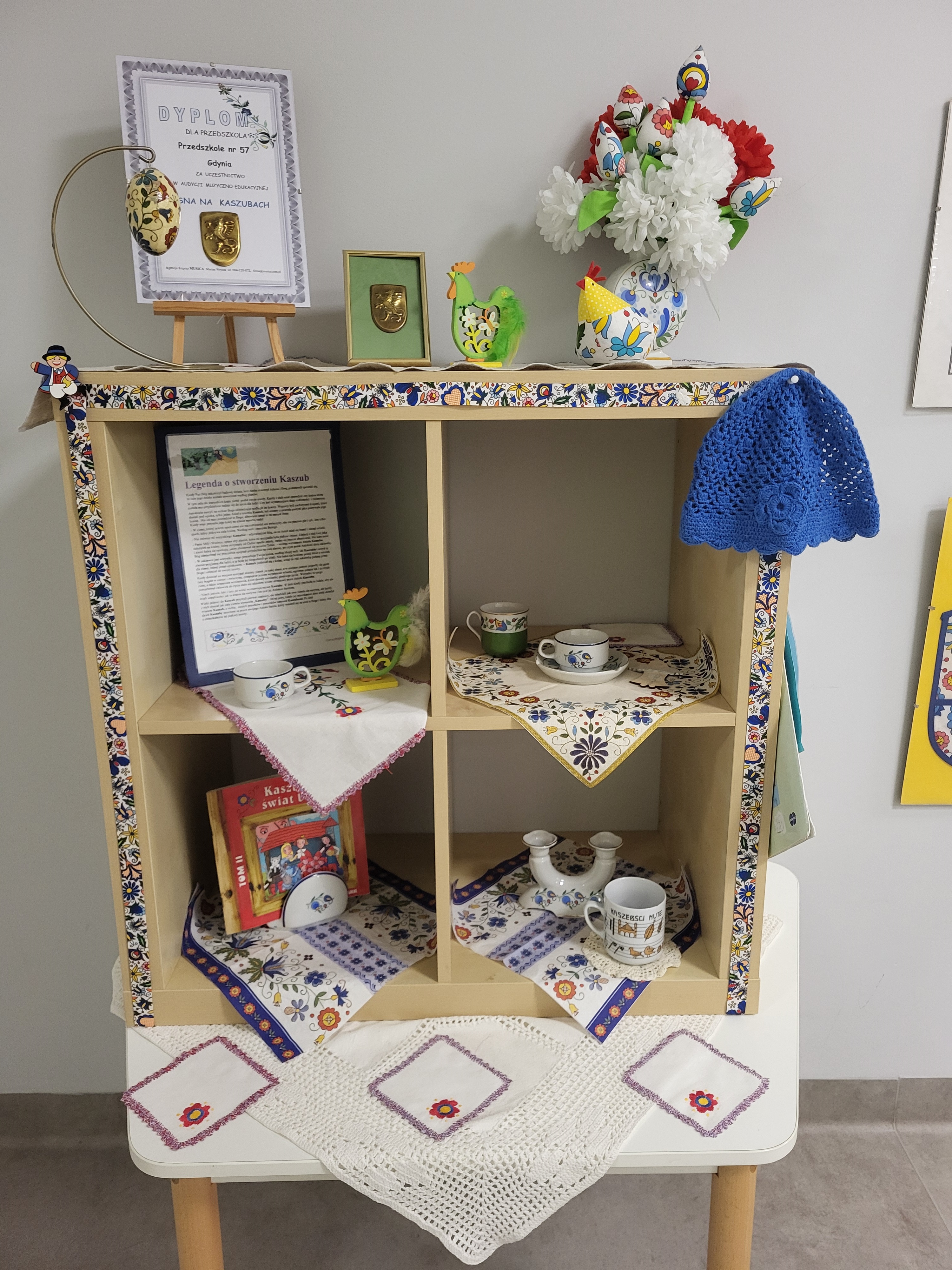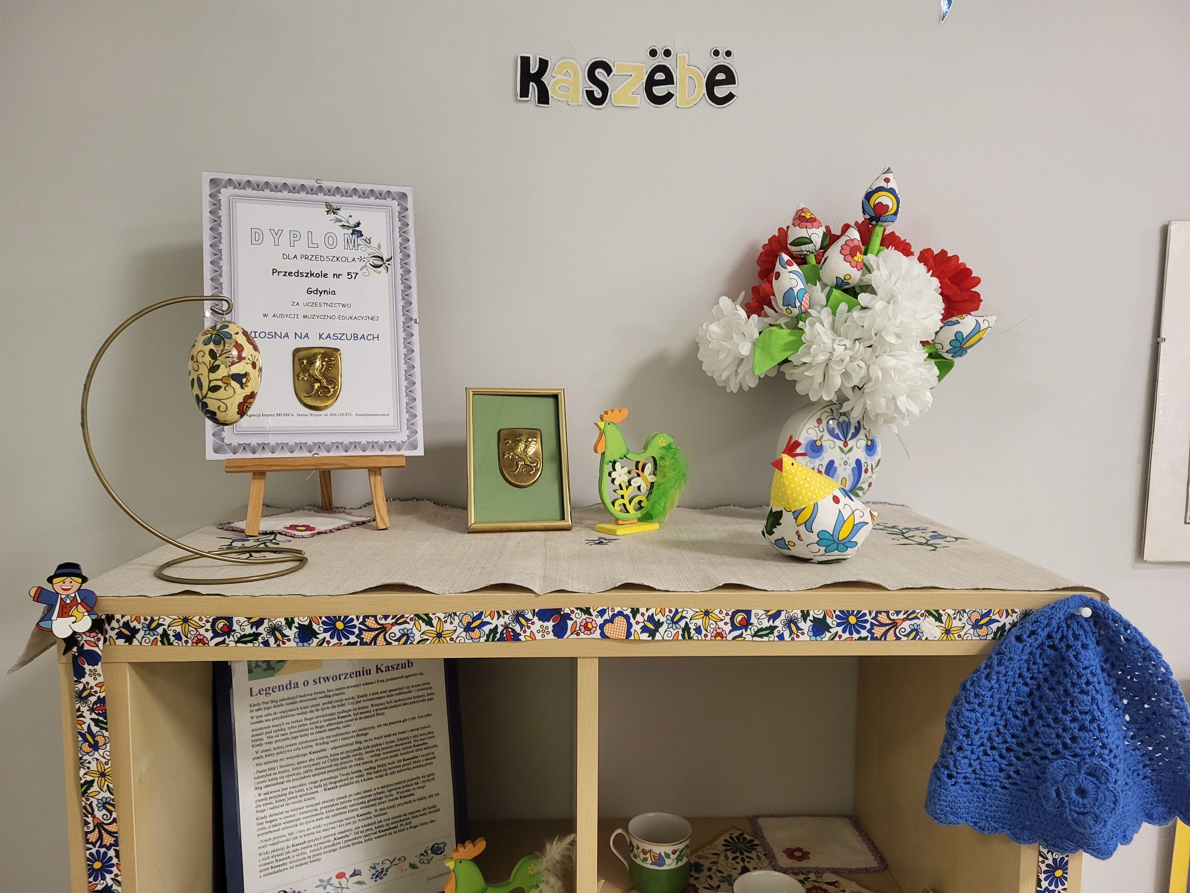 W naszym przedszkolu został przygotowany kącik kaszubski– jest to jeden z elementów realizacji projektu "Piękna Nasza Polska Cała". W kąciku wyeksponowane zostały elementy dekoracyjne wnętrza domu takie jak filiżanka czy świecznik. Znaleźć można było również kaszubskie nuty czy fartuch z regionalnym haftem. Zgromadzone eksponaty stanowią cenny materiał edukacyjny dla przedszkolaków, umożliwiający im bezpośredni kontakt z tradycją kaszubską. Całość została dopełniona kaszubską fotobudką. Wszystkie te elementy przygotowała pani Ala- wychowawczyni grupy Leśne Ludki, za co serdecznie jej dziękujemy.