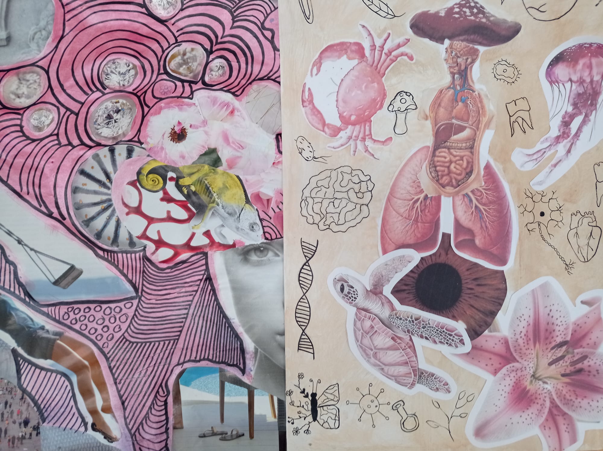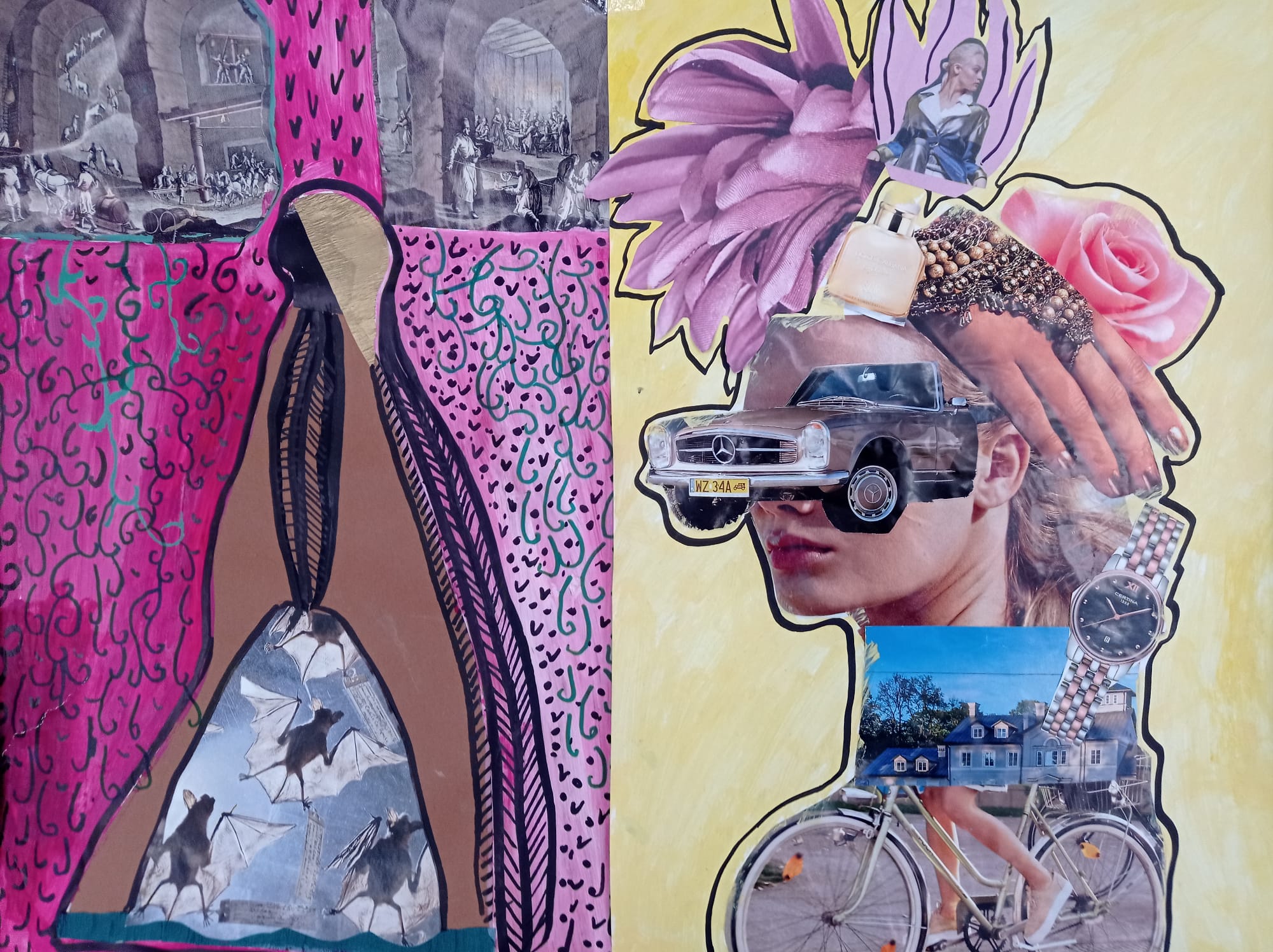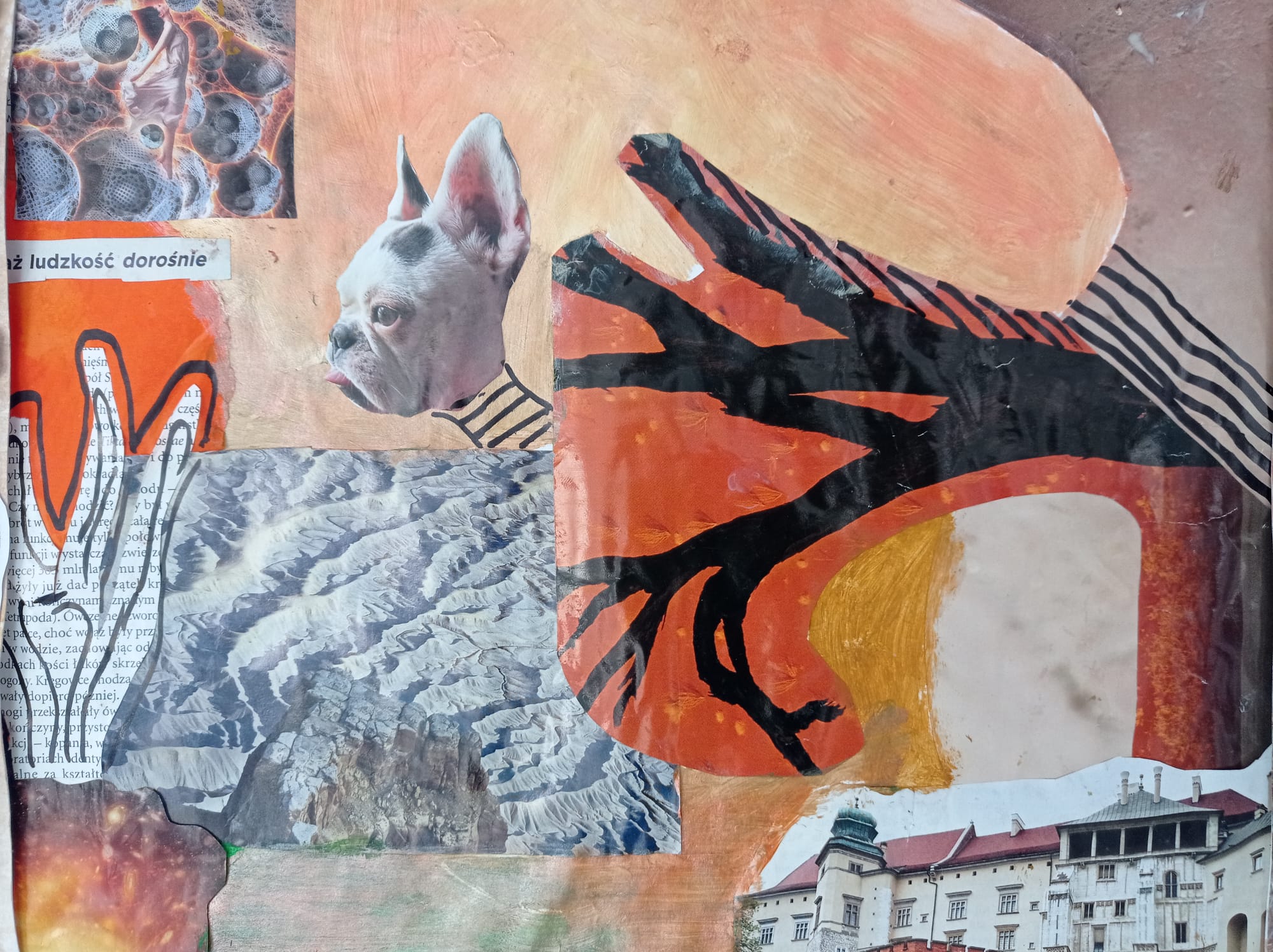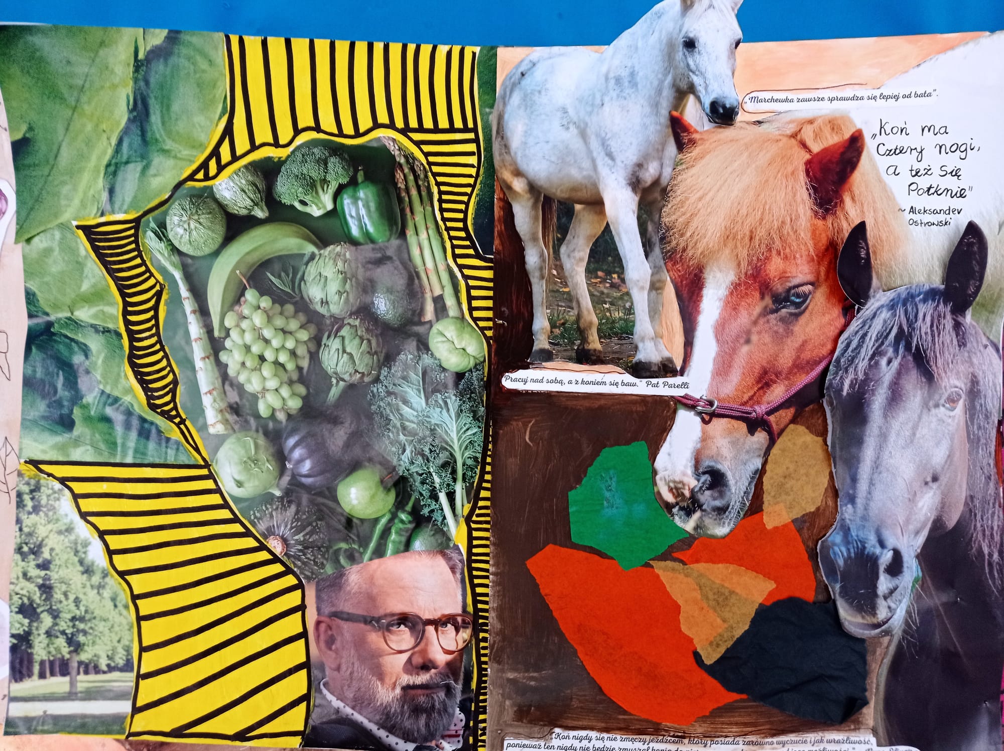 Kolaże uczniów klas VII pt. "Rozmowa światów'' to dialog między rzeczywistością a snem, tradycją a nowoczesnością, naturą a technologią. Wystawa prezentuje obok sprawności manualnych również nowe spojrzenie na znane nam przedmioty i obrazy. Fragmenty gazet, zdjęć i tekstur tworzą spójną, wielowymiarową opowieść o współczesnym świecie.
