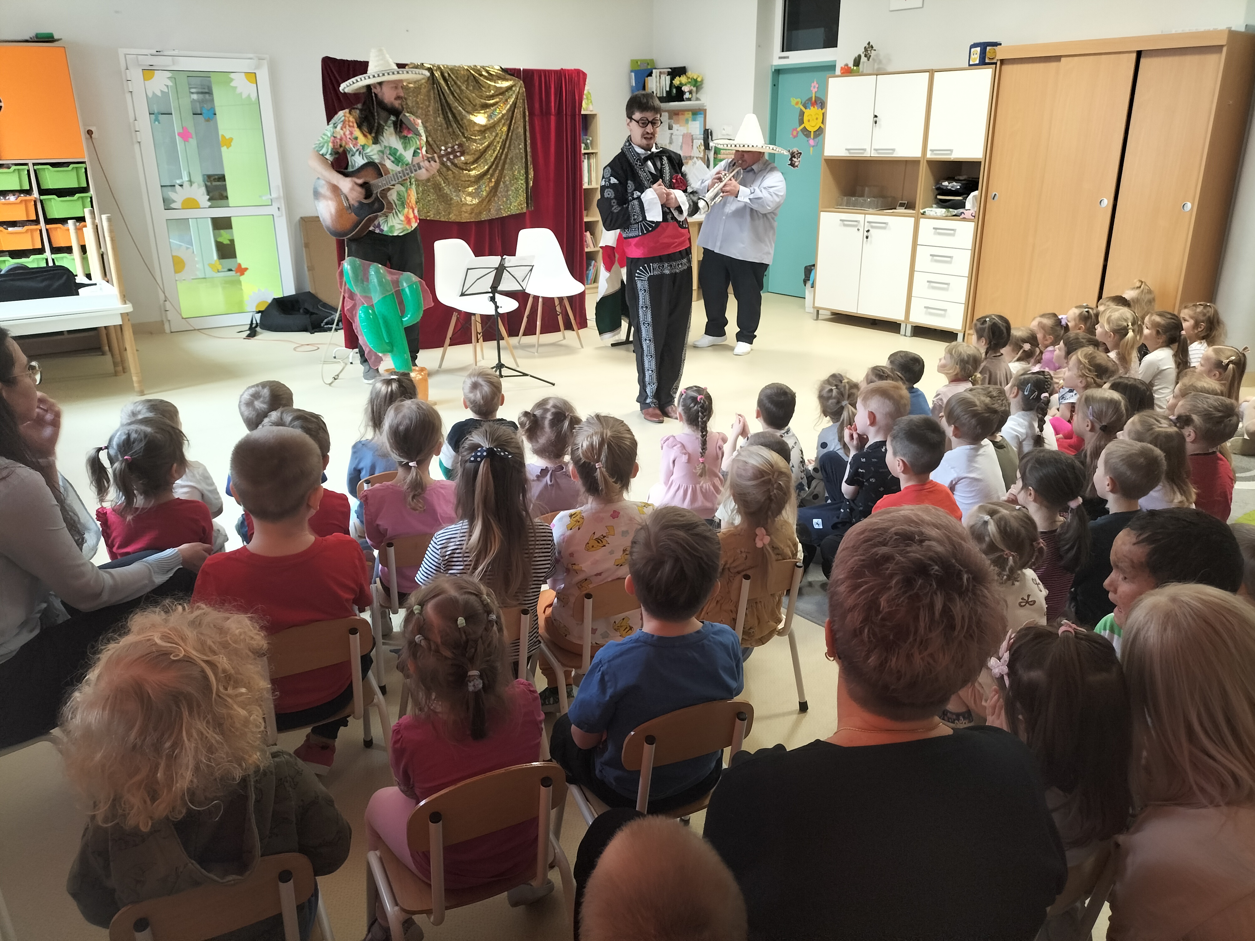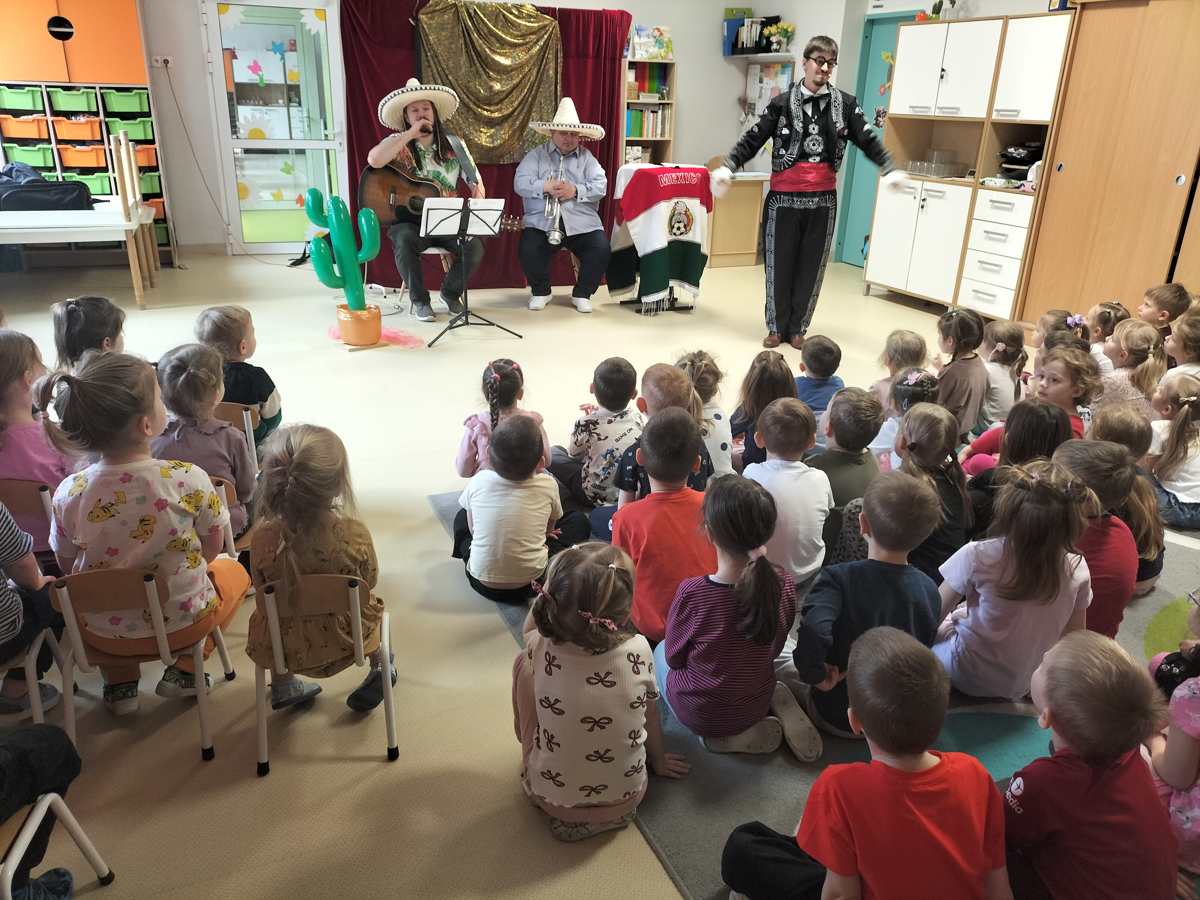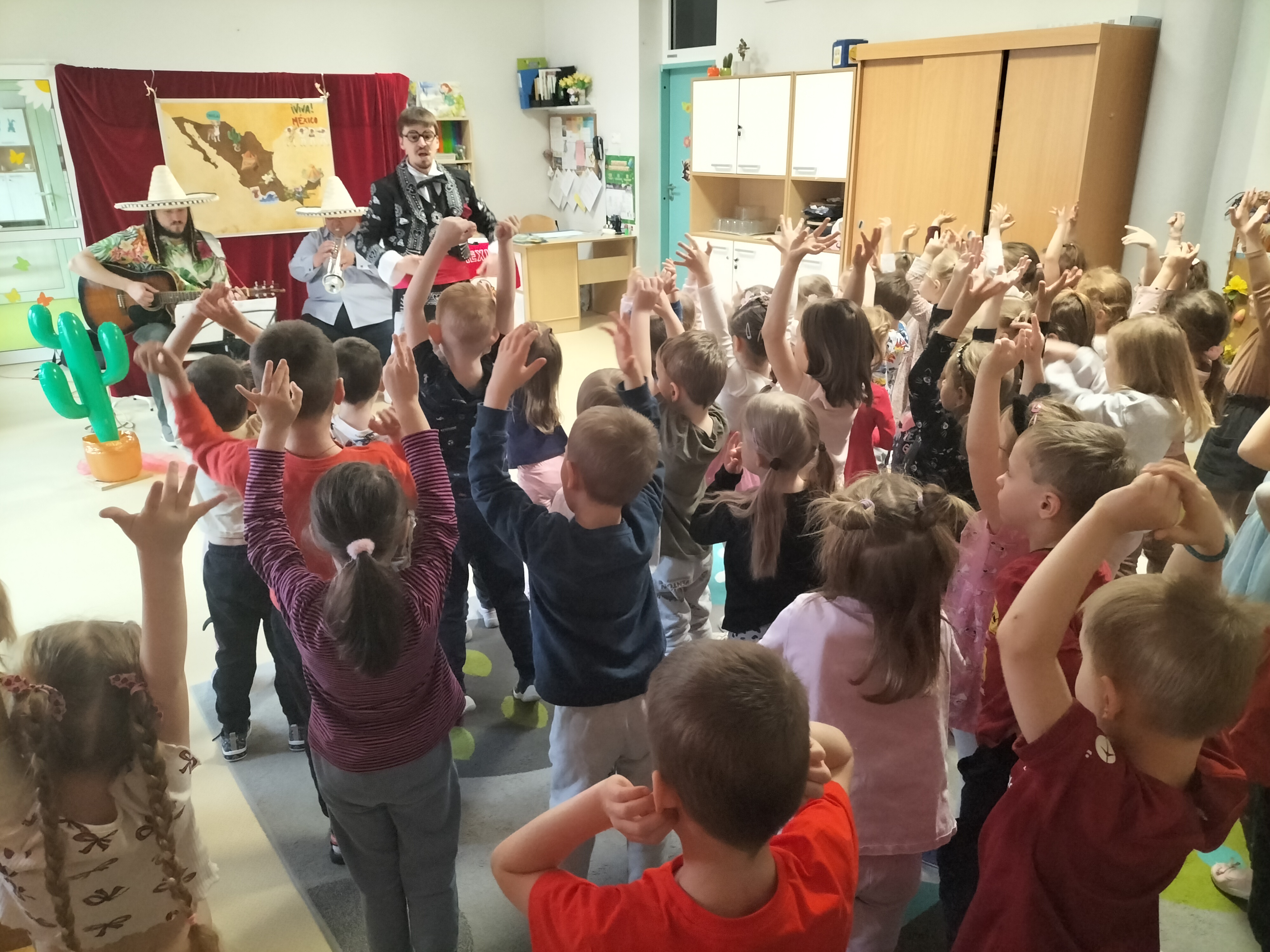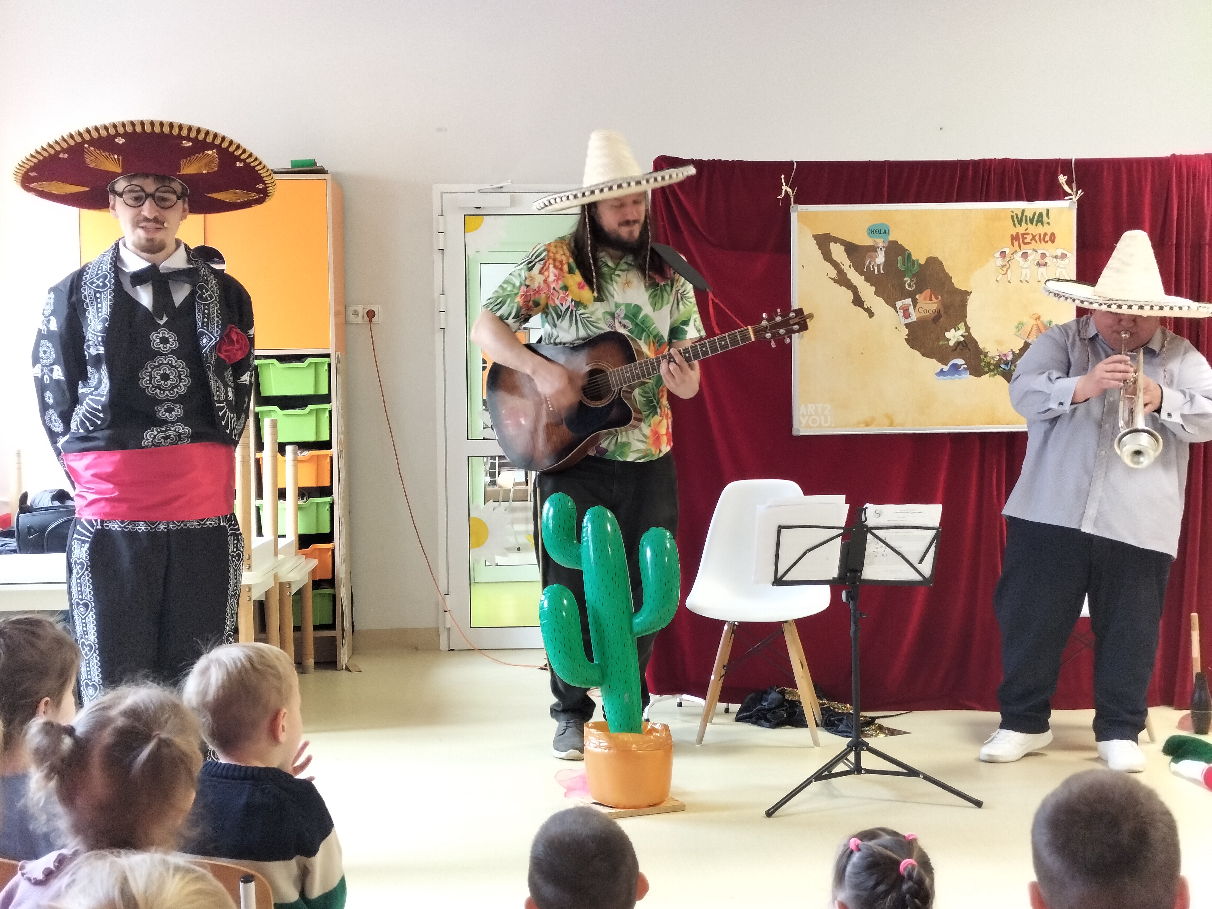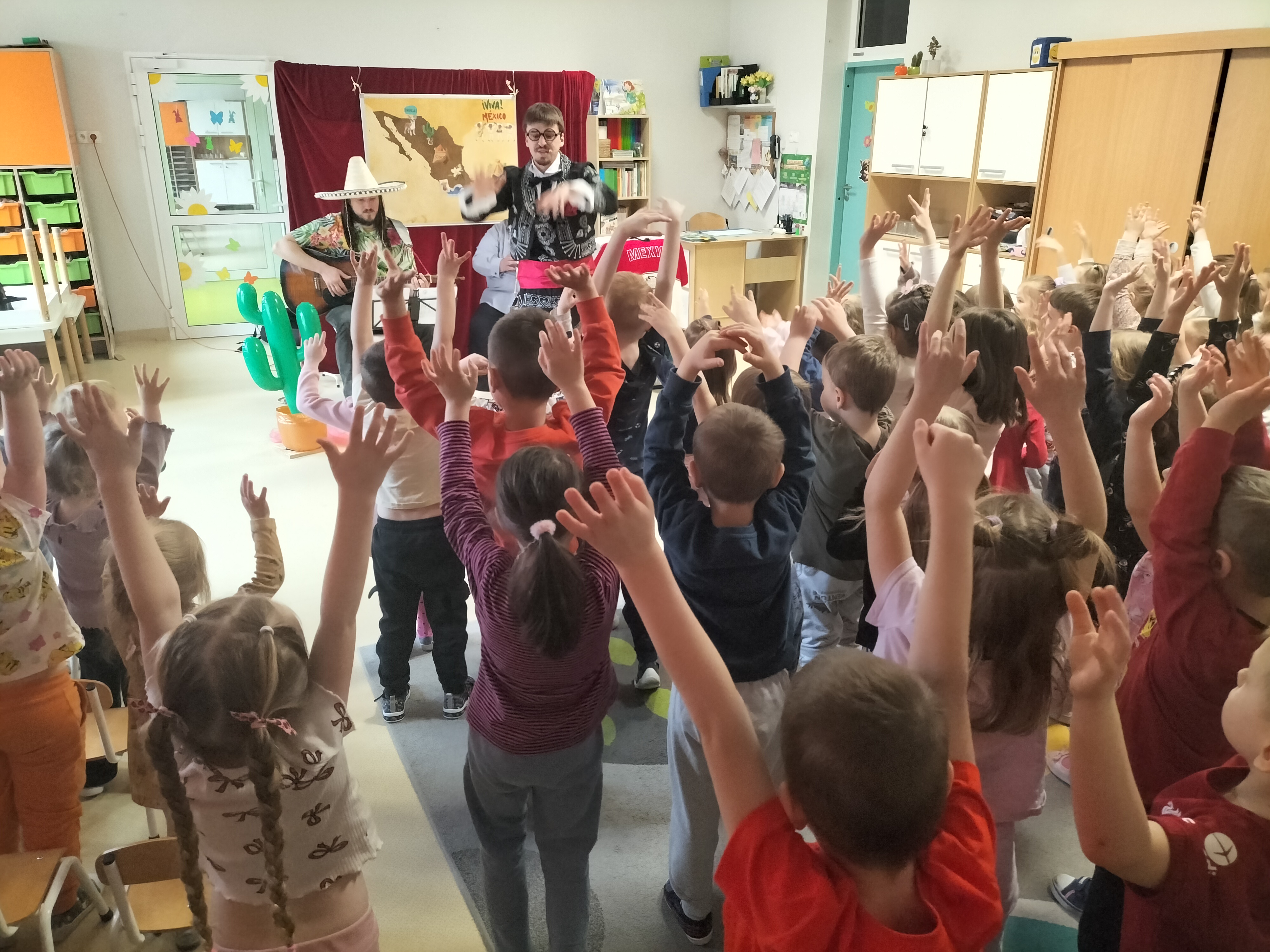Dzieci uczestniczyły dzisiaj w interaktywnym przedstawieniu "La cucaracha i zaginione sombrero" przygotowanym przez Akademię Artystyczną Art2You. Przedszkolaki aktywnie brały udział w muzycznej przygodzie osadzonej w meksykańskim klimacie – śpiewały, tańczyły i wspólnie z bohaterami szukały zaginionego sombrero. To pełne radości spotkanie było nie tylko świetną zabawą, ale także doskonałą okazją do rozwijania muzykalności i zaangażowania najmłodszych.