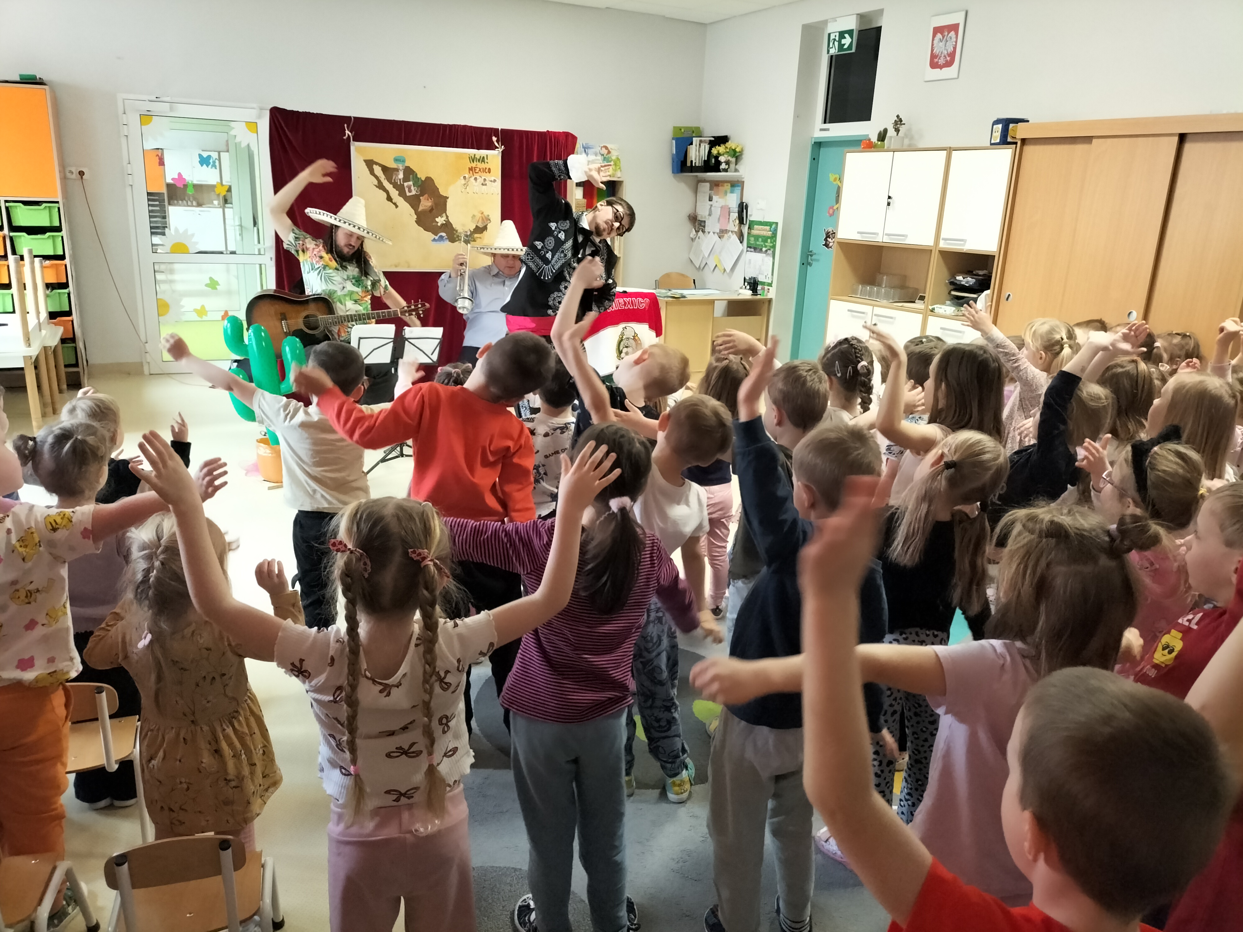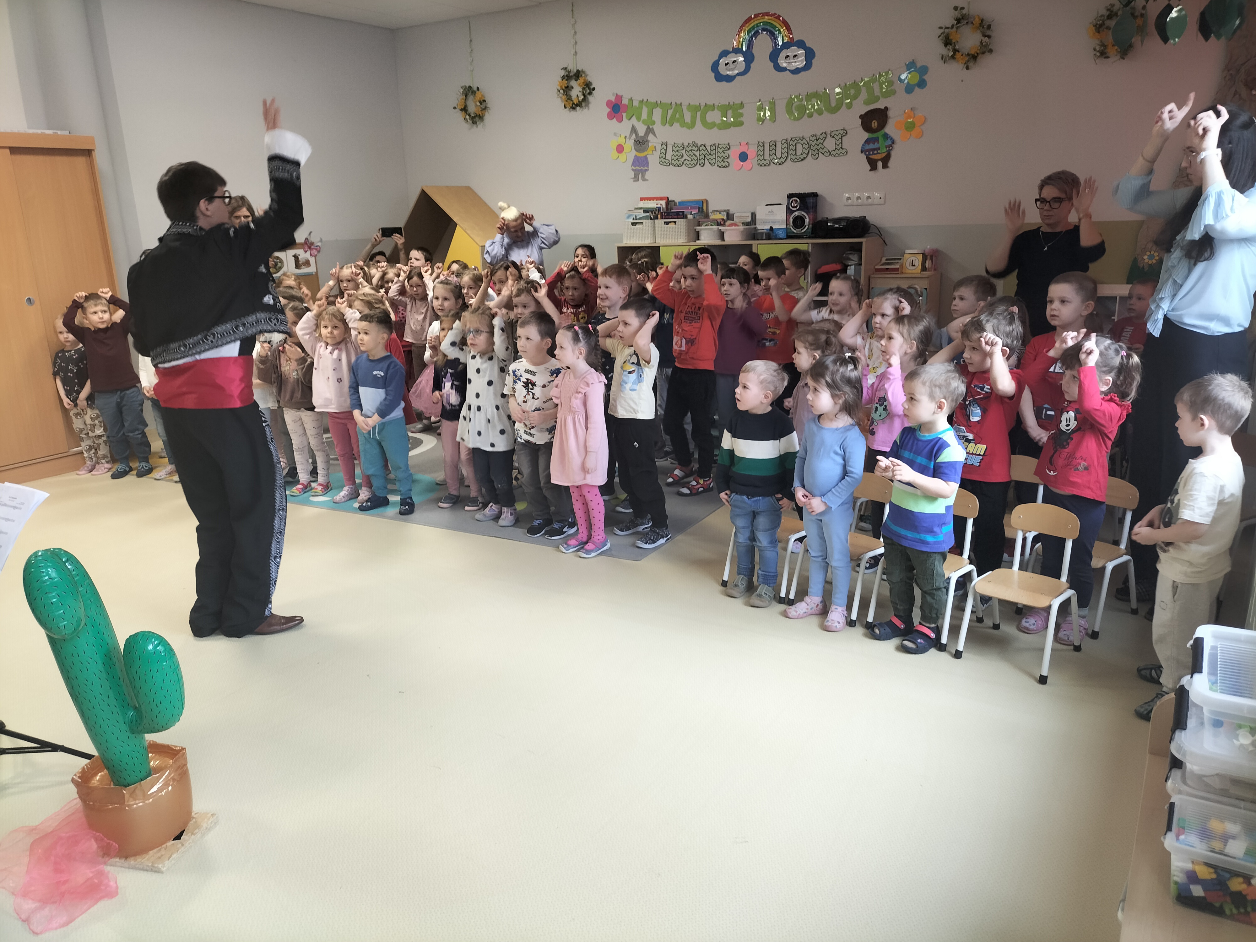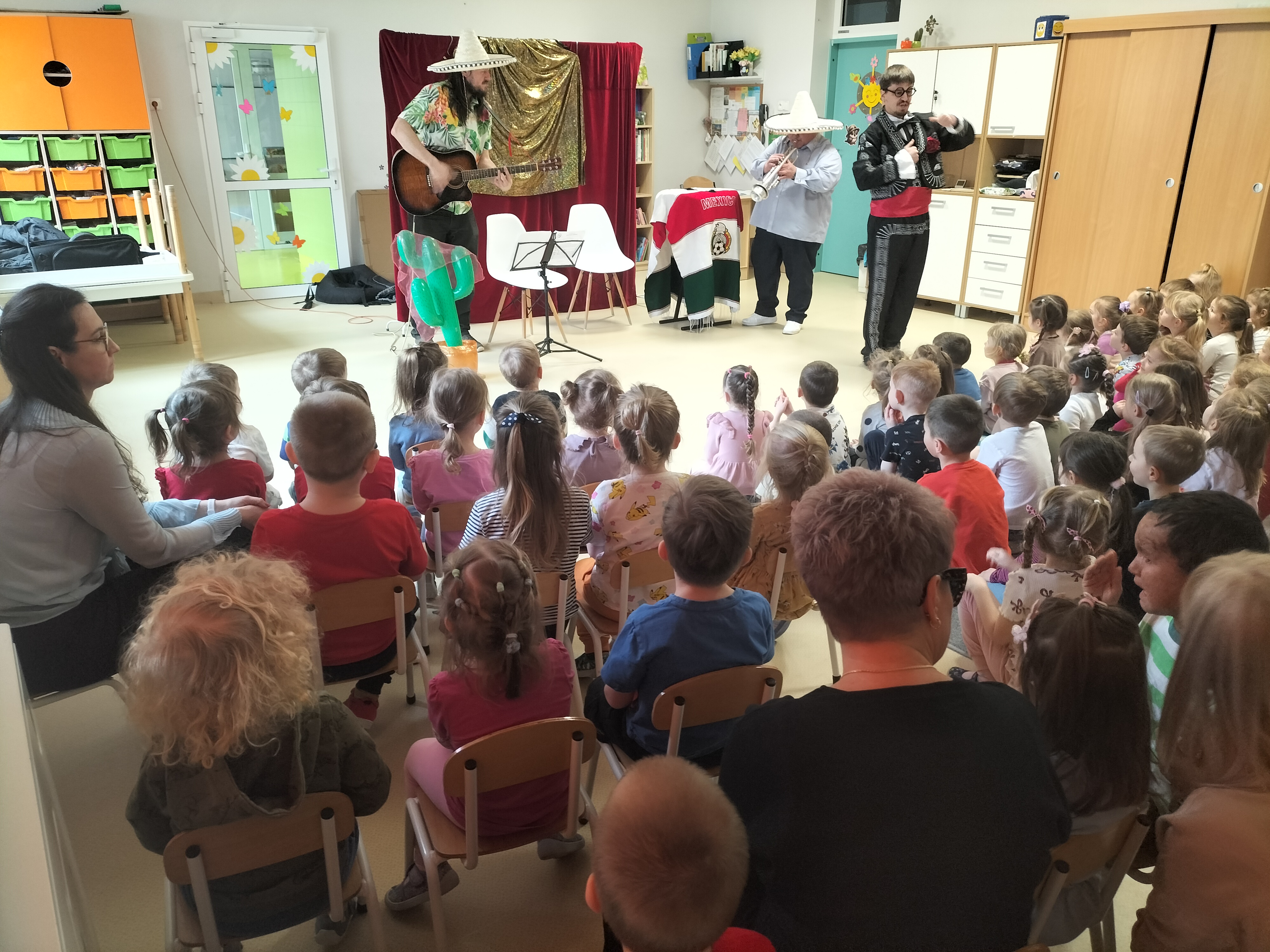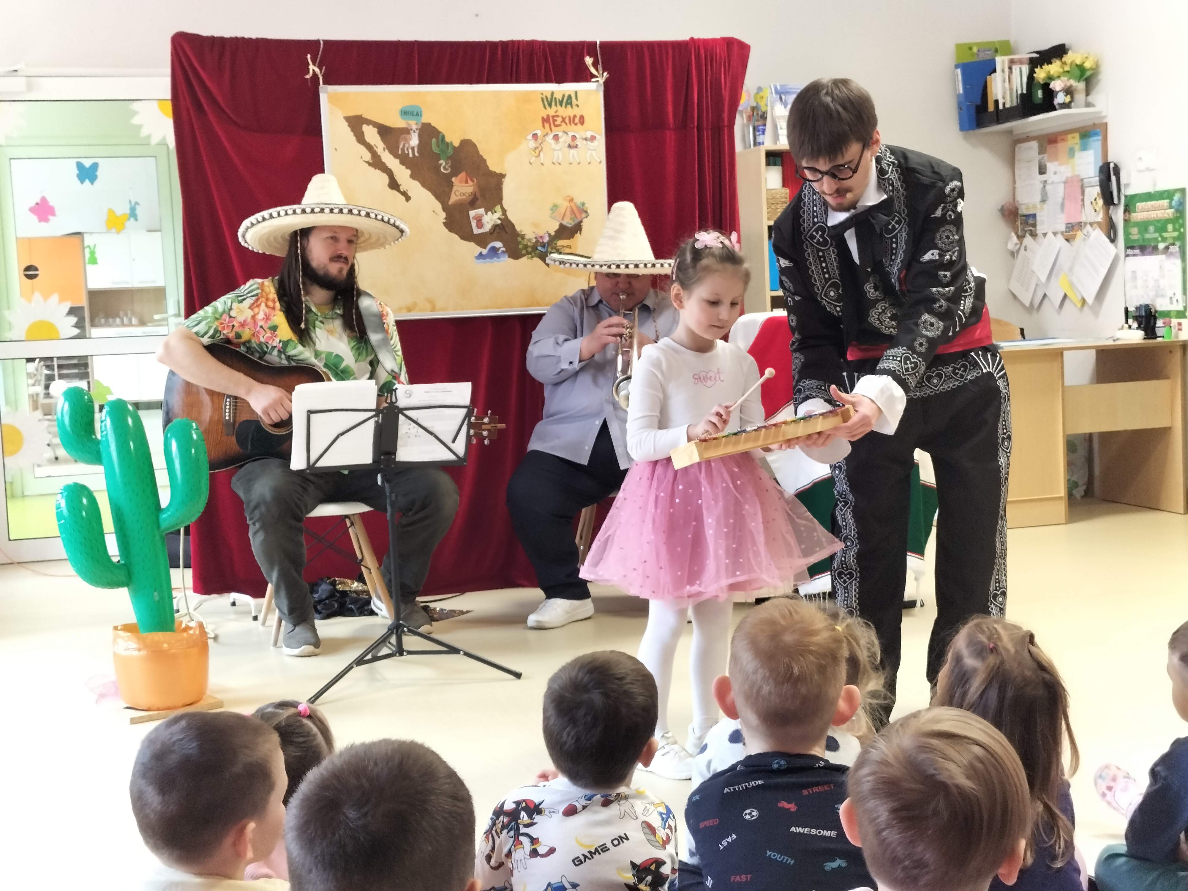 Dzieci uczestniczyły dzisiaj w interaktywnym przedstawieniu "La cucaracha i zaginione sombrero" przygotowanym przez Akademię Artystyczną Art2You. Przedszkolaki aktywnie brały udział w muzycznej przygodzie osadzonej w meksykańskim klimacie – śpiewały, tańczyły i wspólnie z bohaterami szukały zaginionego sombrero. To pełne radości spotkanie było nie tylko świetną zabawą, ale także doskonałą okazją do rozwijania muzykalności i zaangażowania najmłodszych.
