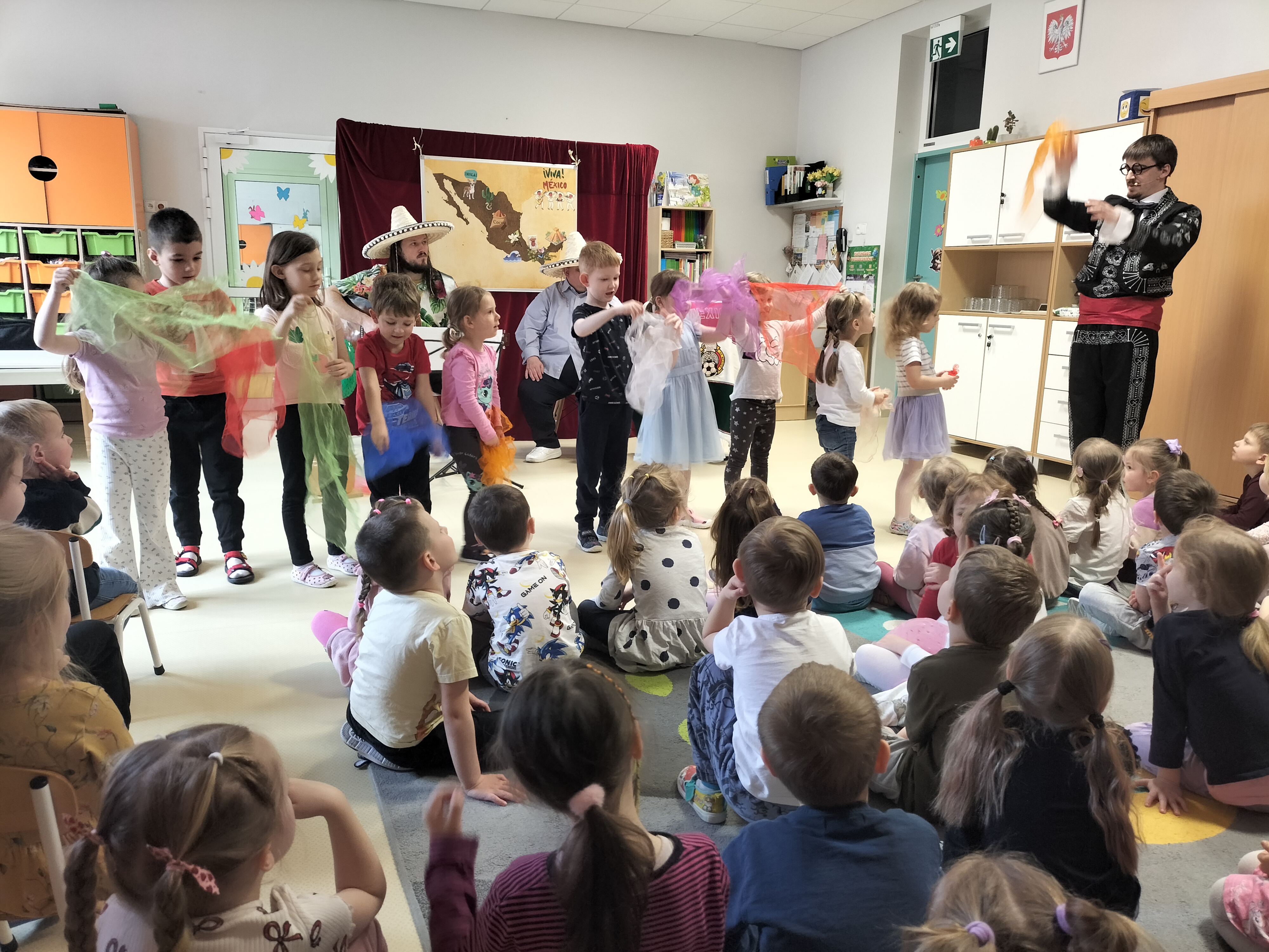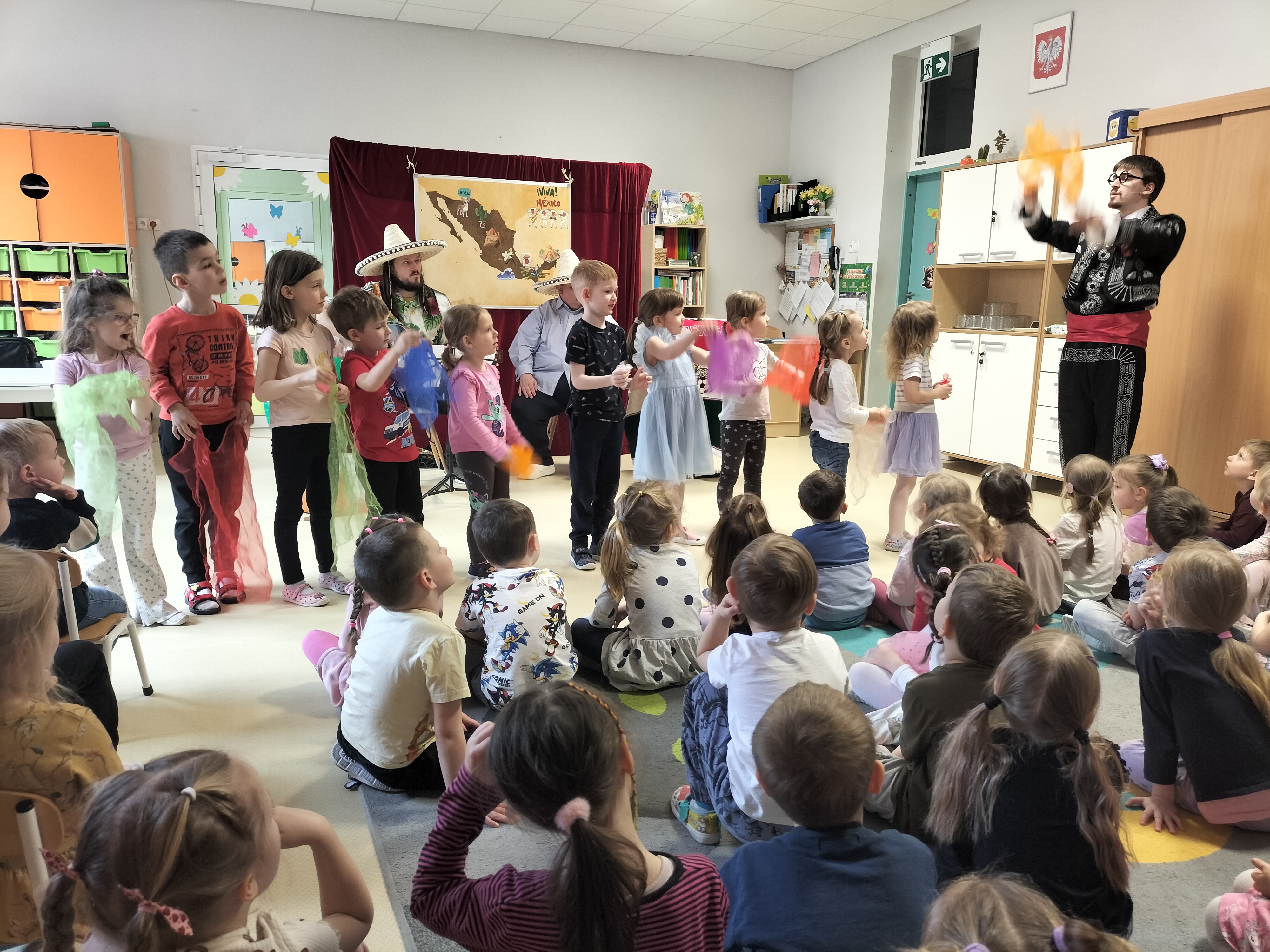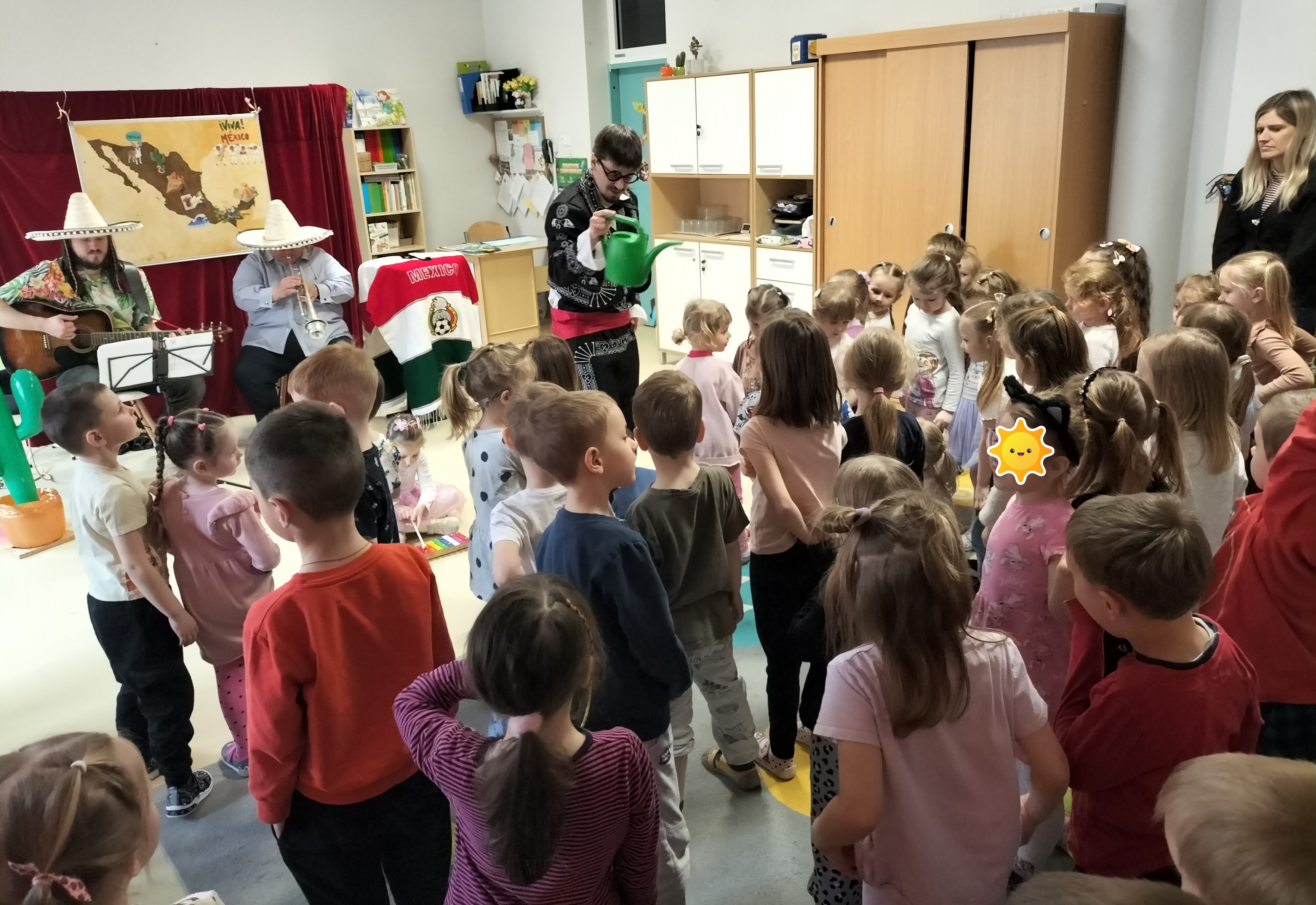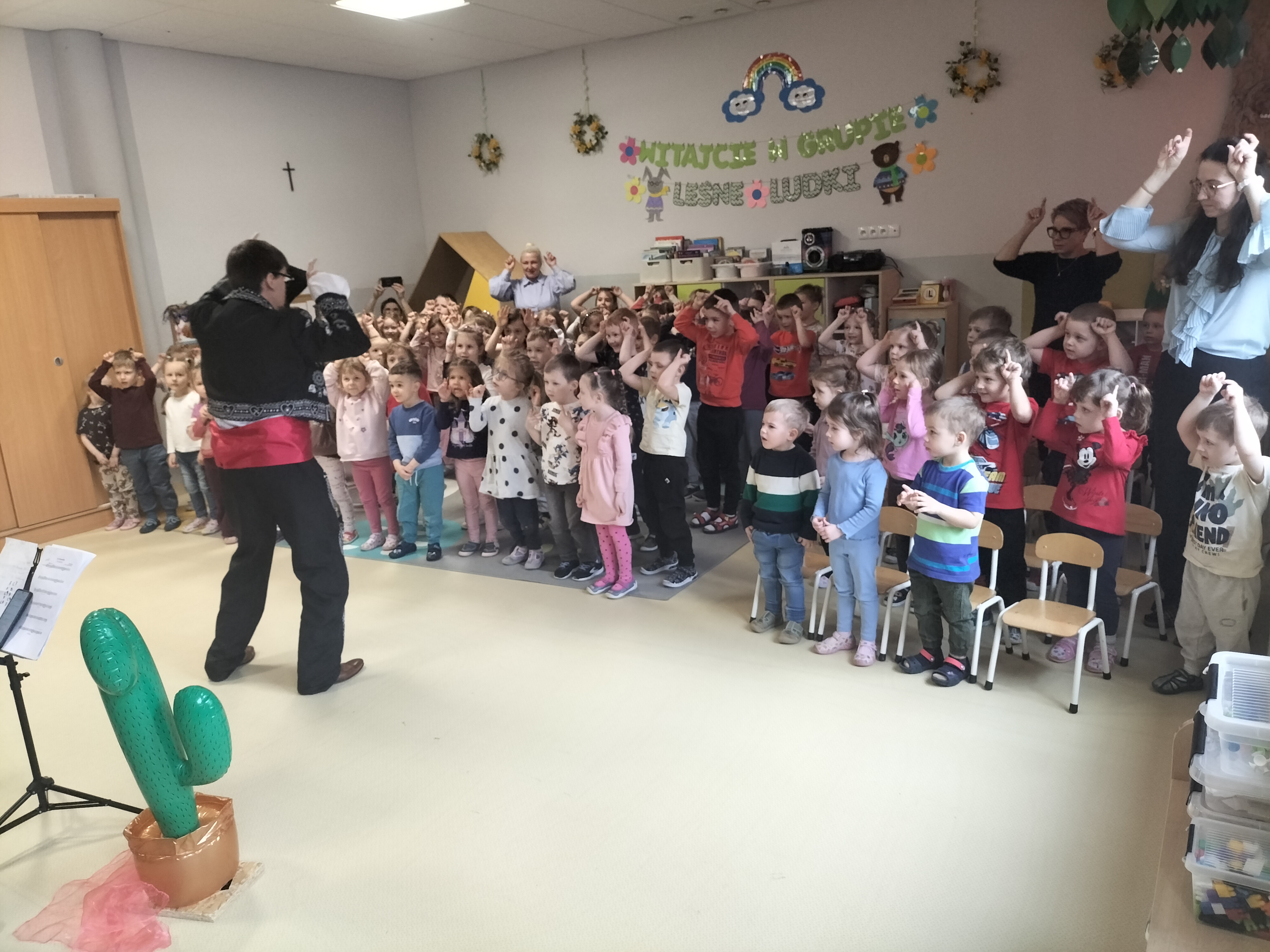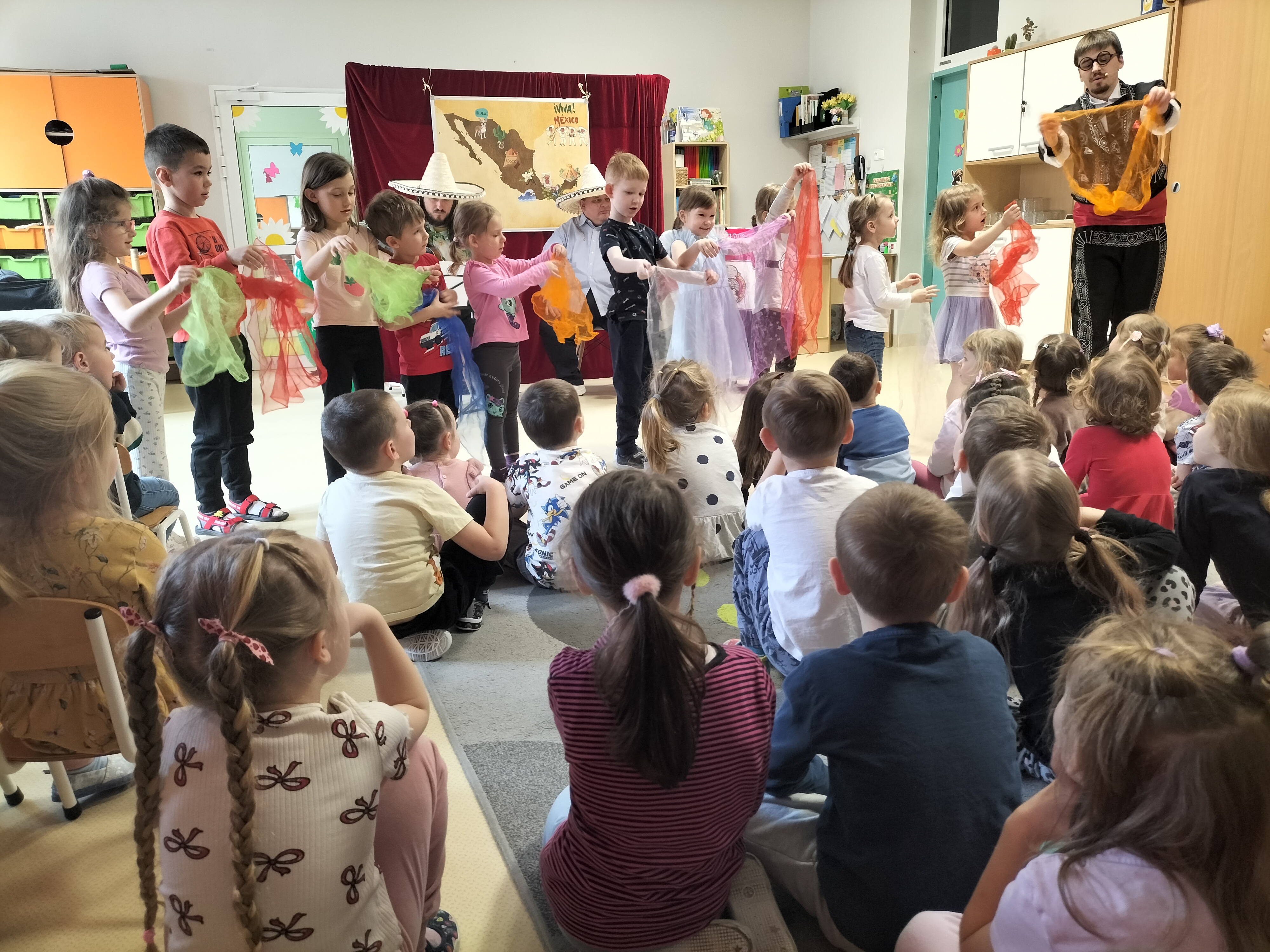 Dzieci uczestniczyły dzisiaj w interaktywnym przedstawieniu "La cucaracha i zaginione sombrero" przygotowanym przez Akademię Artystyczną Art2You. Przedszkolaki aktywnie brały udział w muzycznej przygodzie osadzonej w meksykańskim klimacie – śpiewały, tańczyły i wspólnie z bohaterami szukały zaginionego sombrero. To pełne radości spotkanie było nie tylko świetną zabawą, ale także doskonałą okazją do rozwijania muzykalności i zaangażowania najmłodszych.