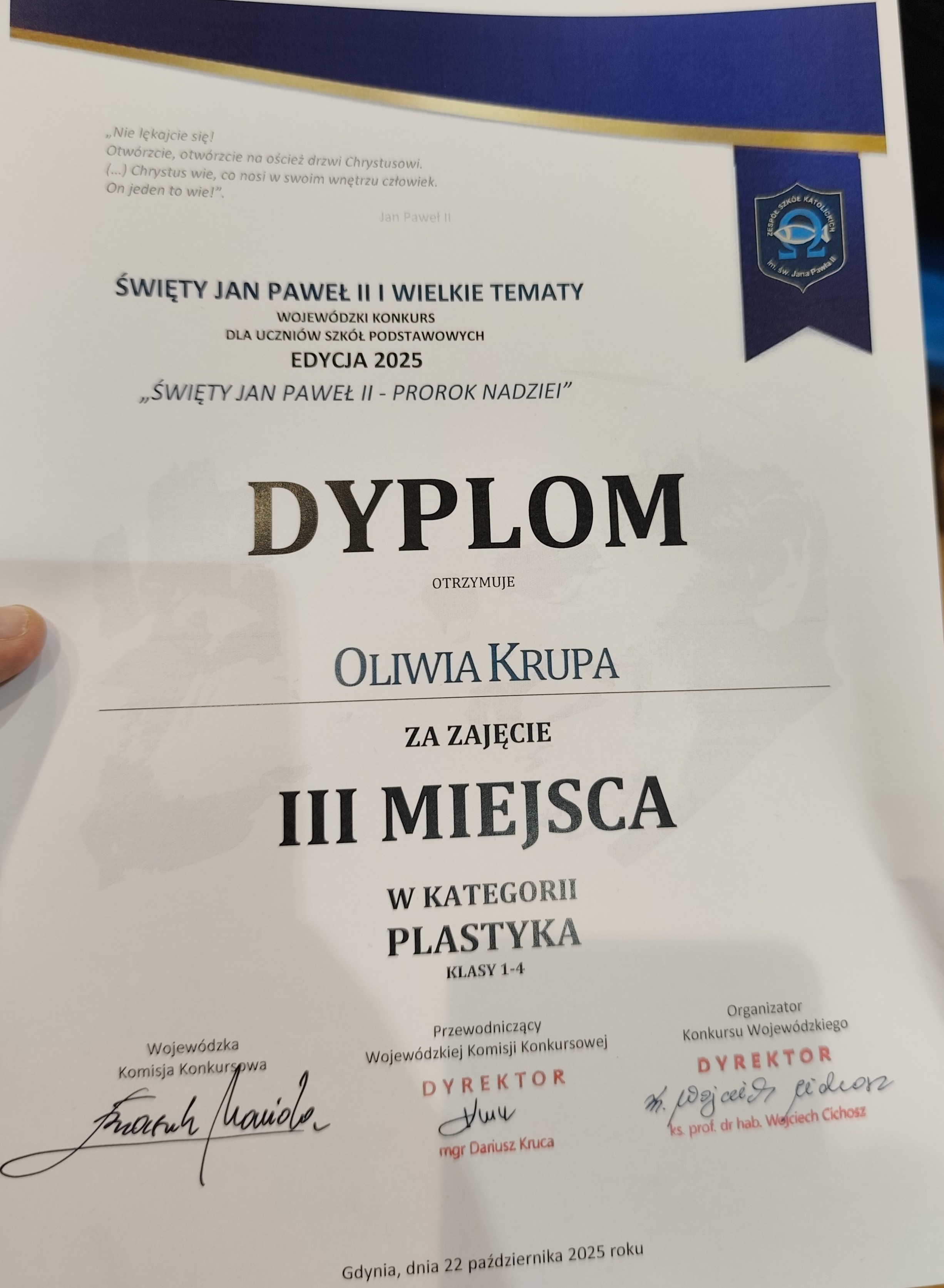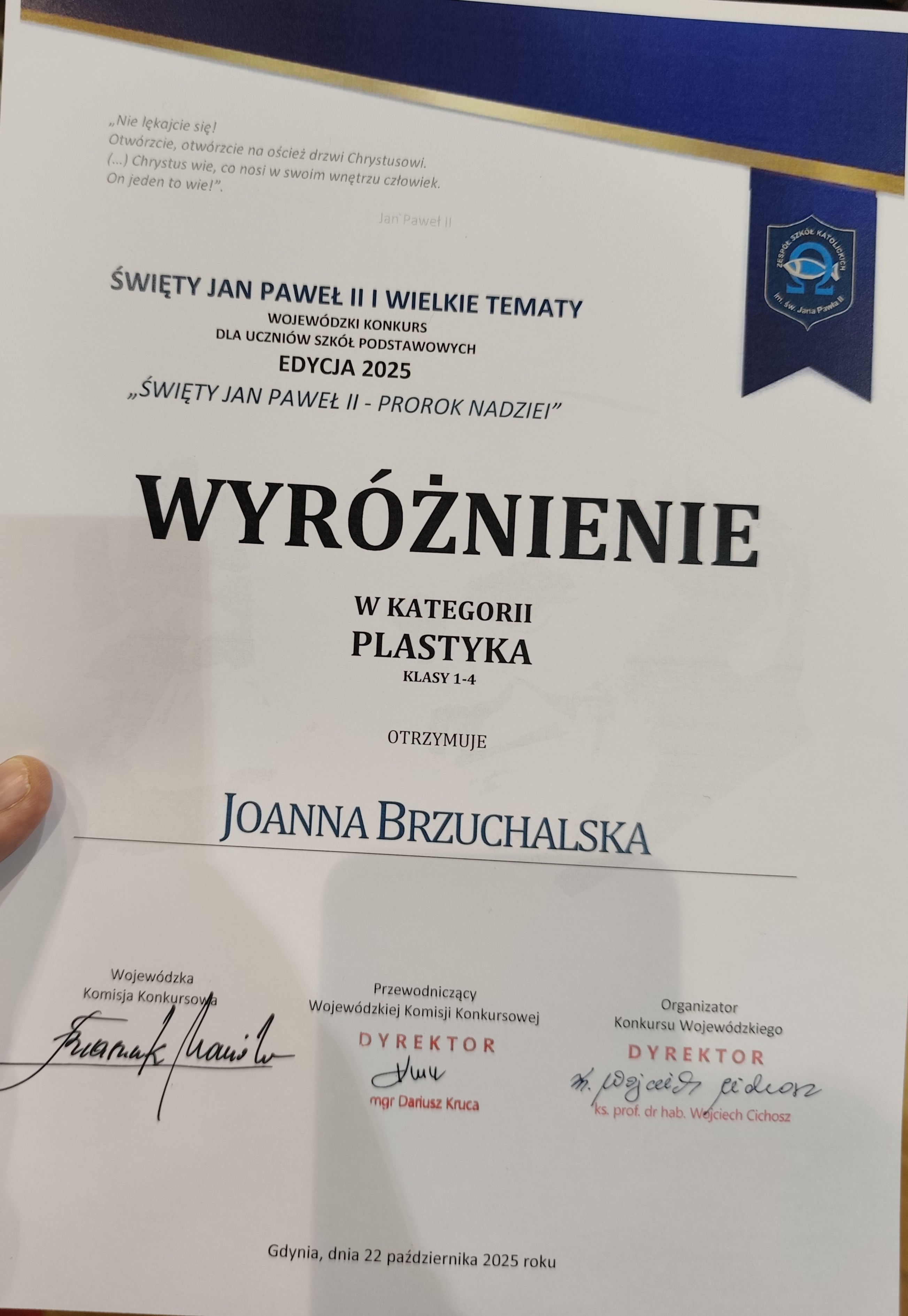 Uczniowie naszej szkoły wzięli udział w konkursie Wojewódzkim Święty Jan Paweł II i wielkie tematy Prorok nadzei organizowanym przez Zespół Szkół Katolickich im. Sw. Jana Pawła II w Gdyni Oblużu. Konkurs był wpisany w kalendarzu kuratoryjnym.