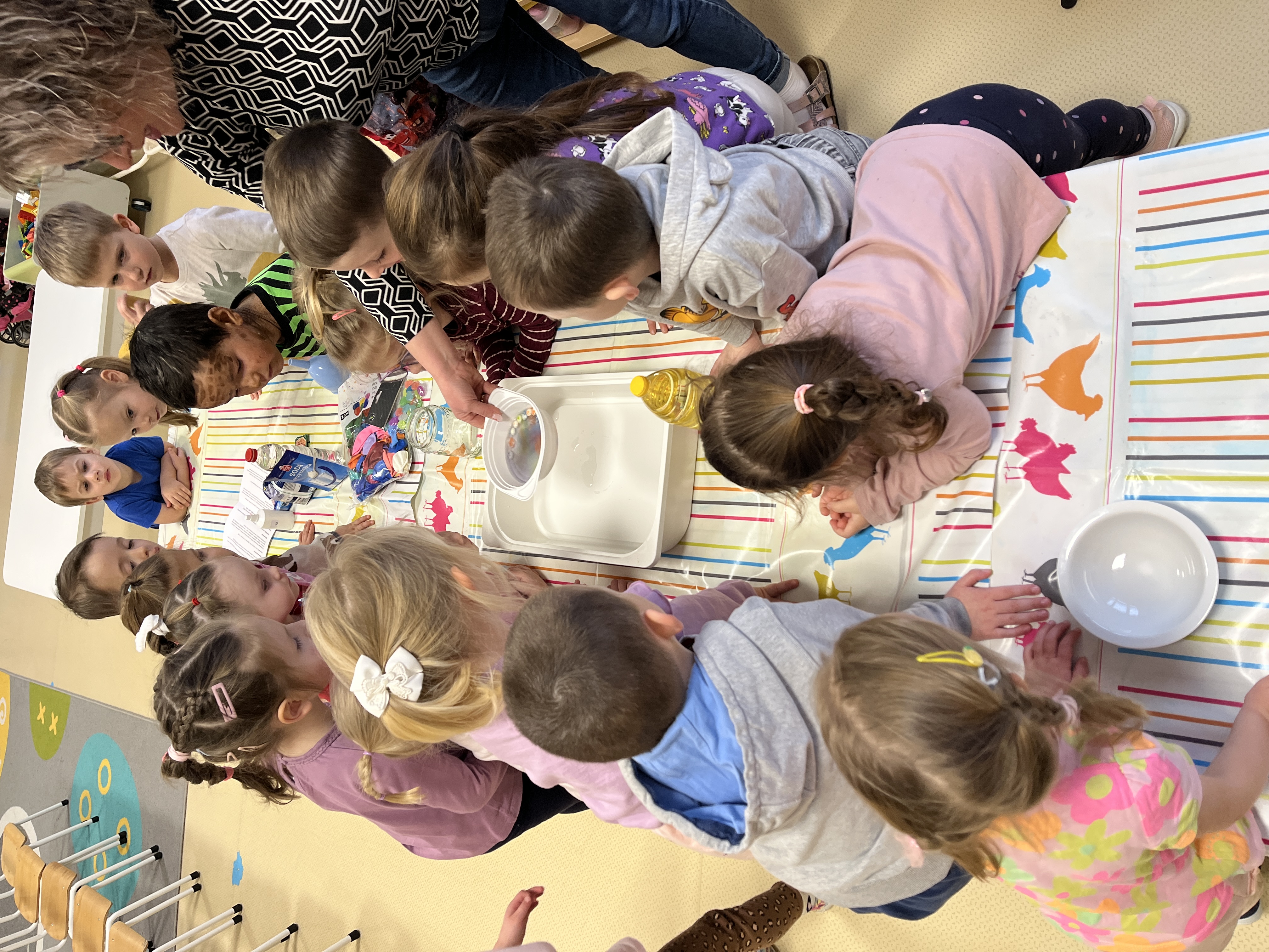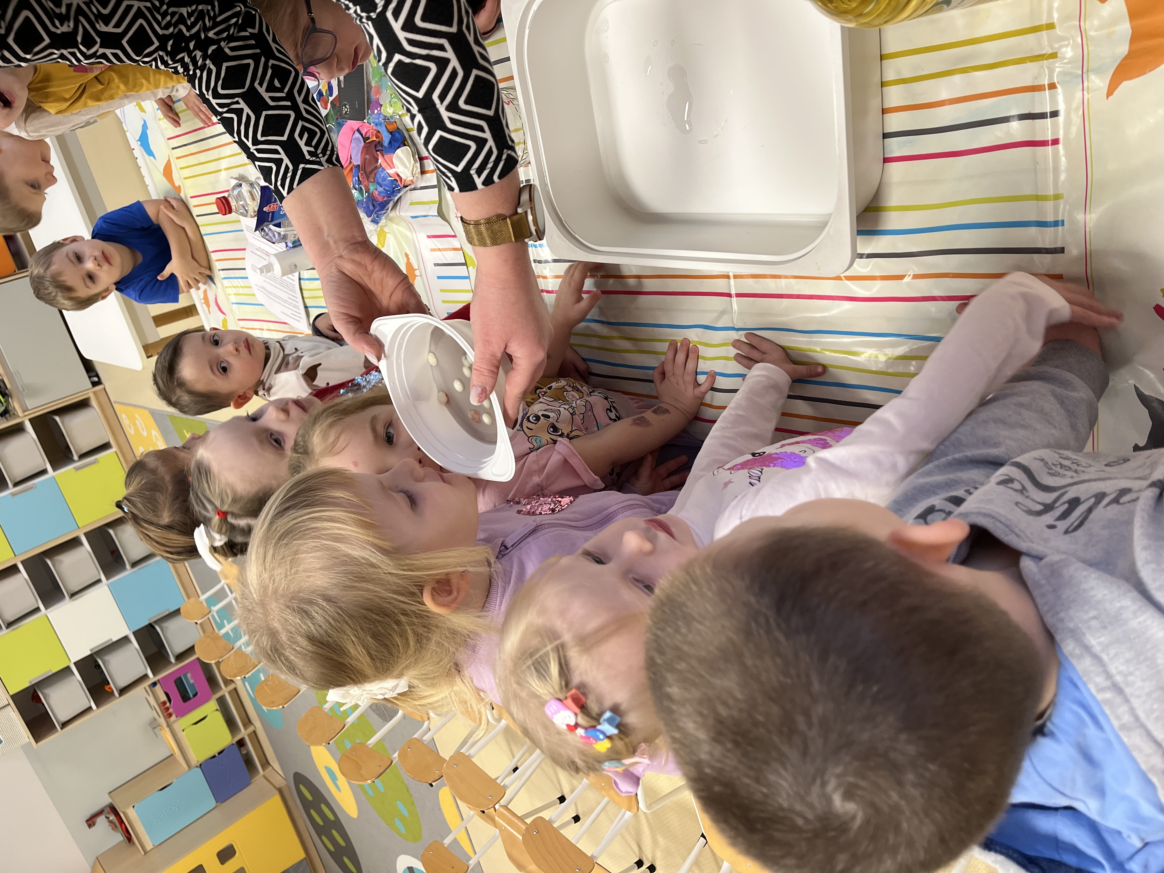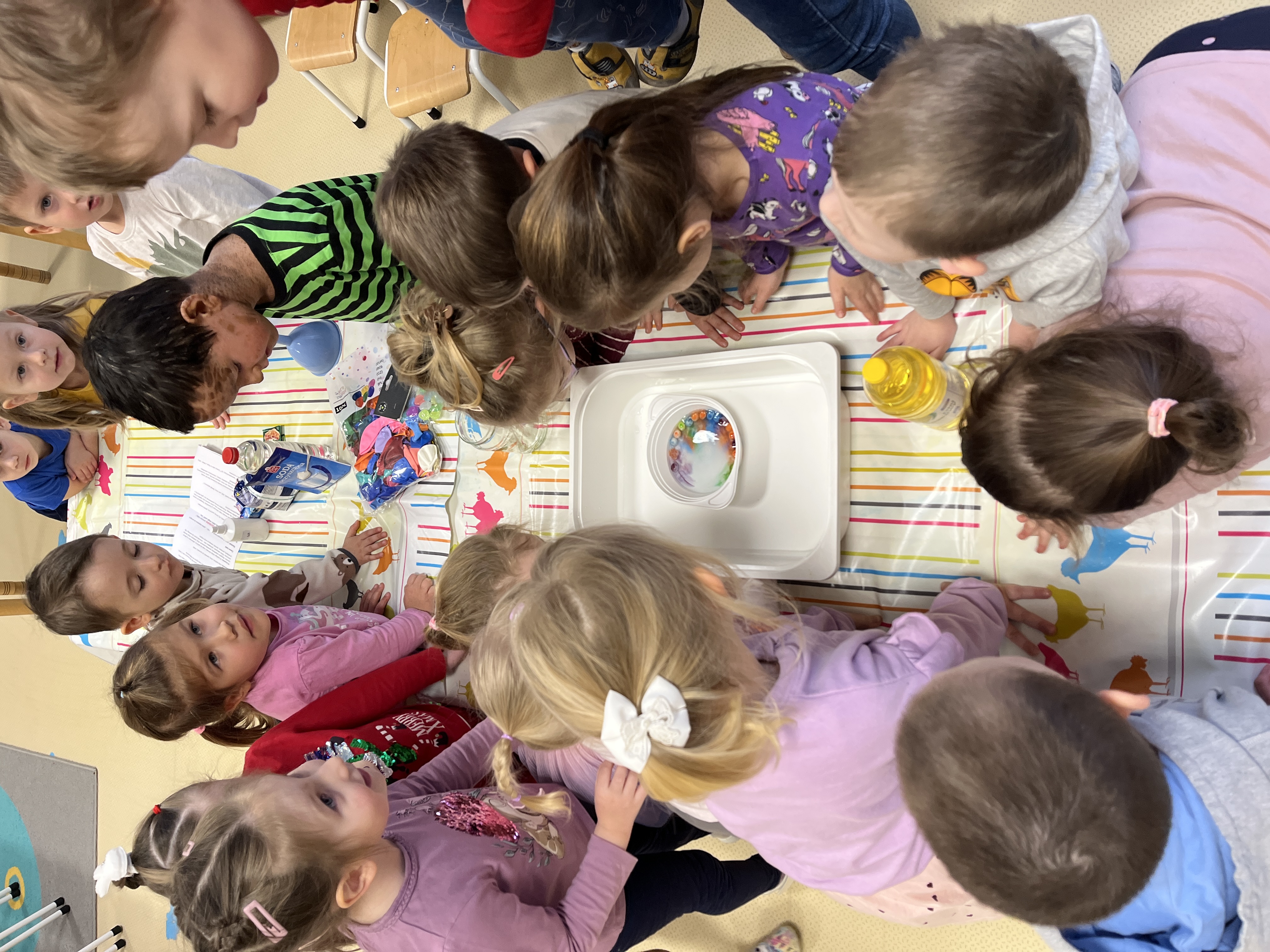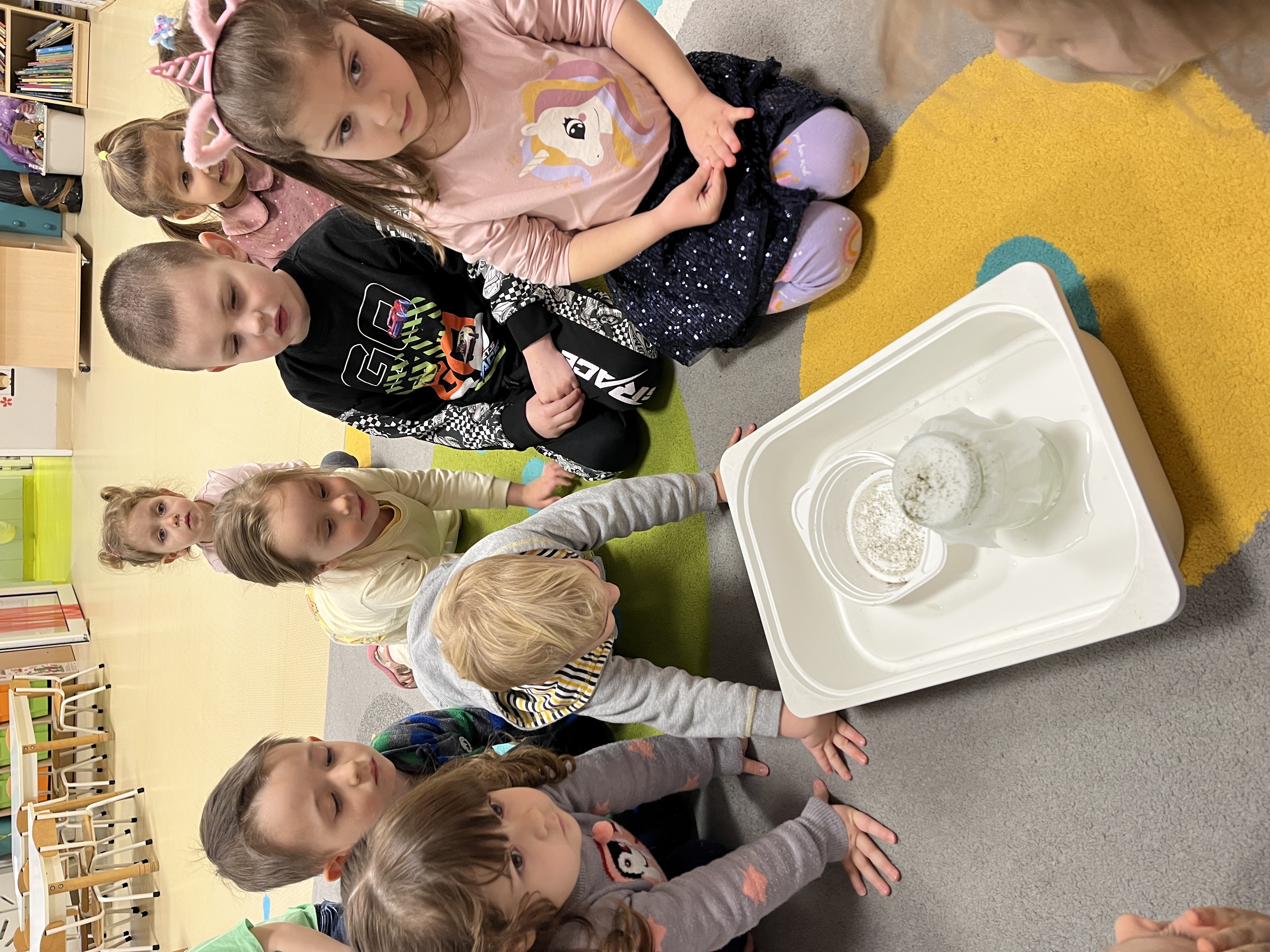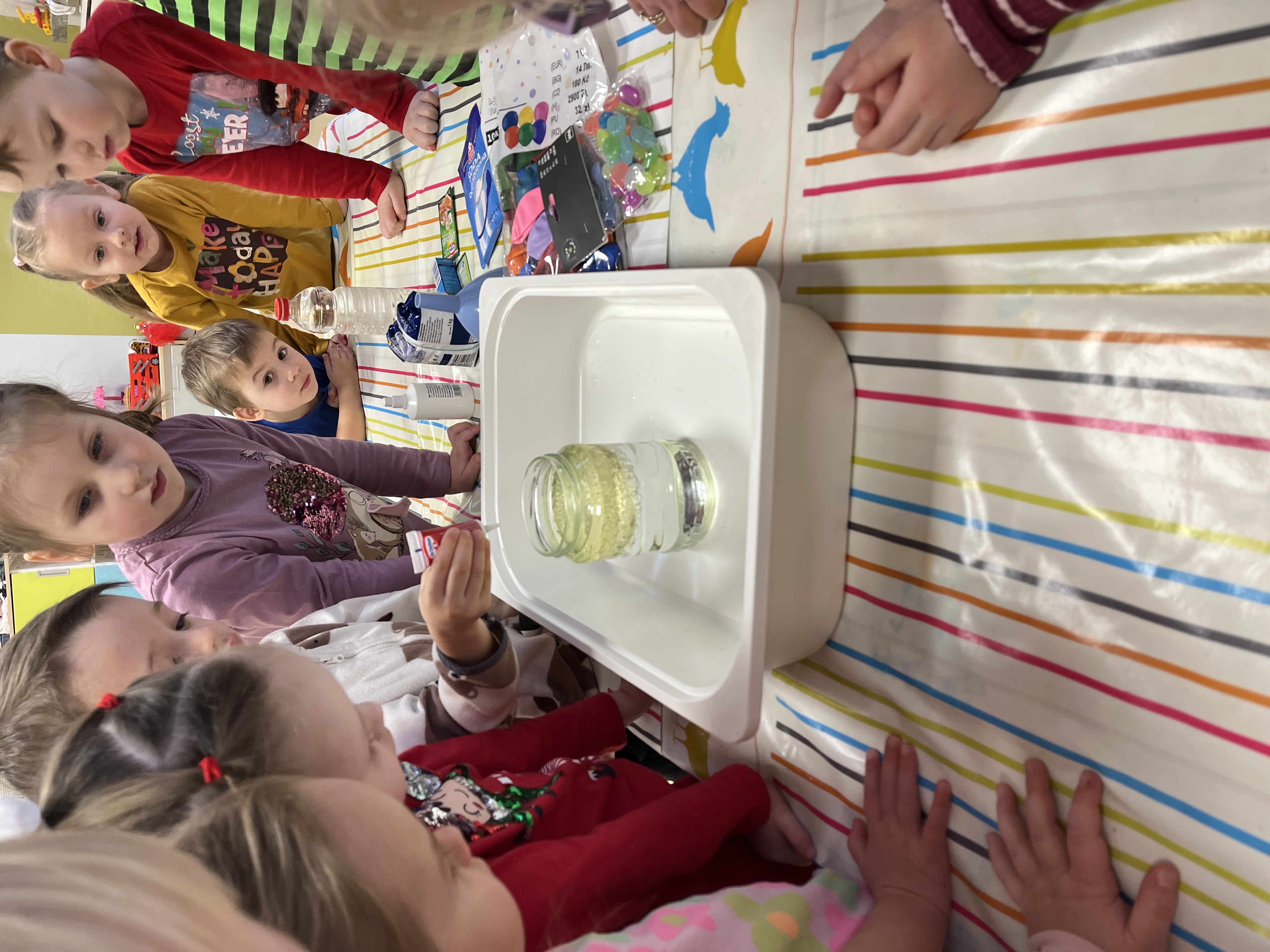 Który przedszkolak nie lubi ciekawych eksperymentów? Każdy chciałby stać się małym naukowcem i odkrywać tajemniczy świat doświadczeń. Skrzaty i Leśne Ludki wcieliły się w rolę małych odkrywców, którzy dzięki prostym eksperymentom mieli okazję odpowiedzieć sobie na pytanie „czy śnieg jest czysty?”. „Wulkan z sody”, „Tęcza z cukierków” „Mieszanie kolorów” czy „Lodowe skarby” sprawiły przedszkolakom dużo radości. Badawcze, proste doświadczenia i eksperymenty rozbudzały u dzieci ciekawość otaczającego świata przyrody. Dzieci bardzo aktywnie uczestniczyły w eksperymentach, chętnie obserwowały i zadawały pytania.
