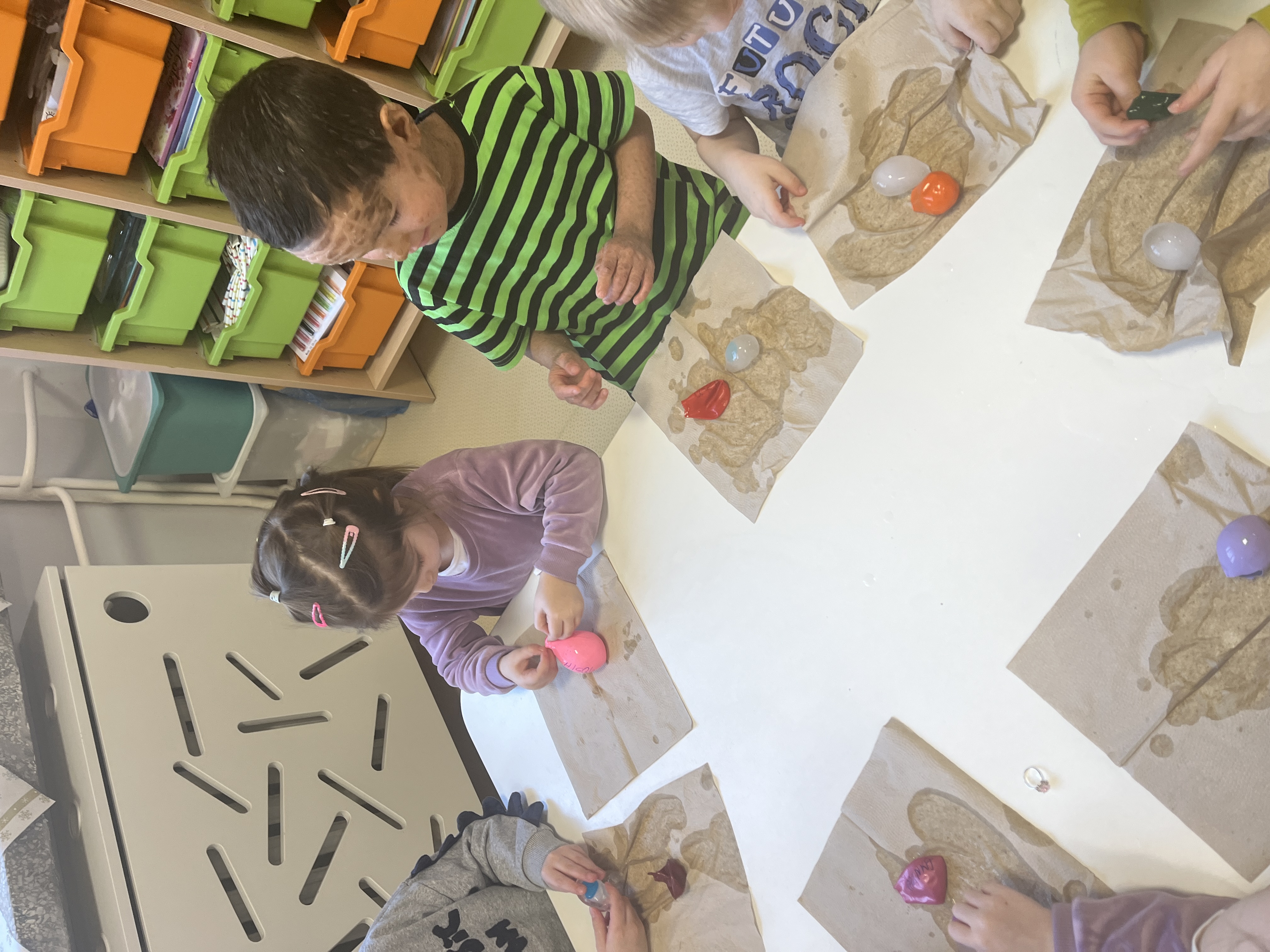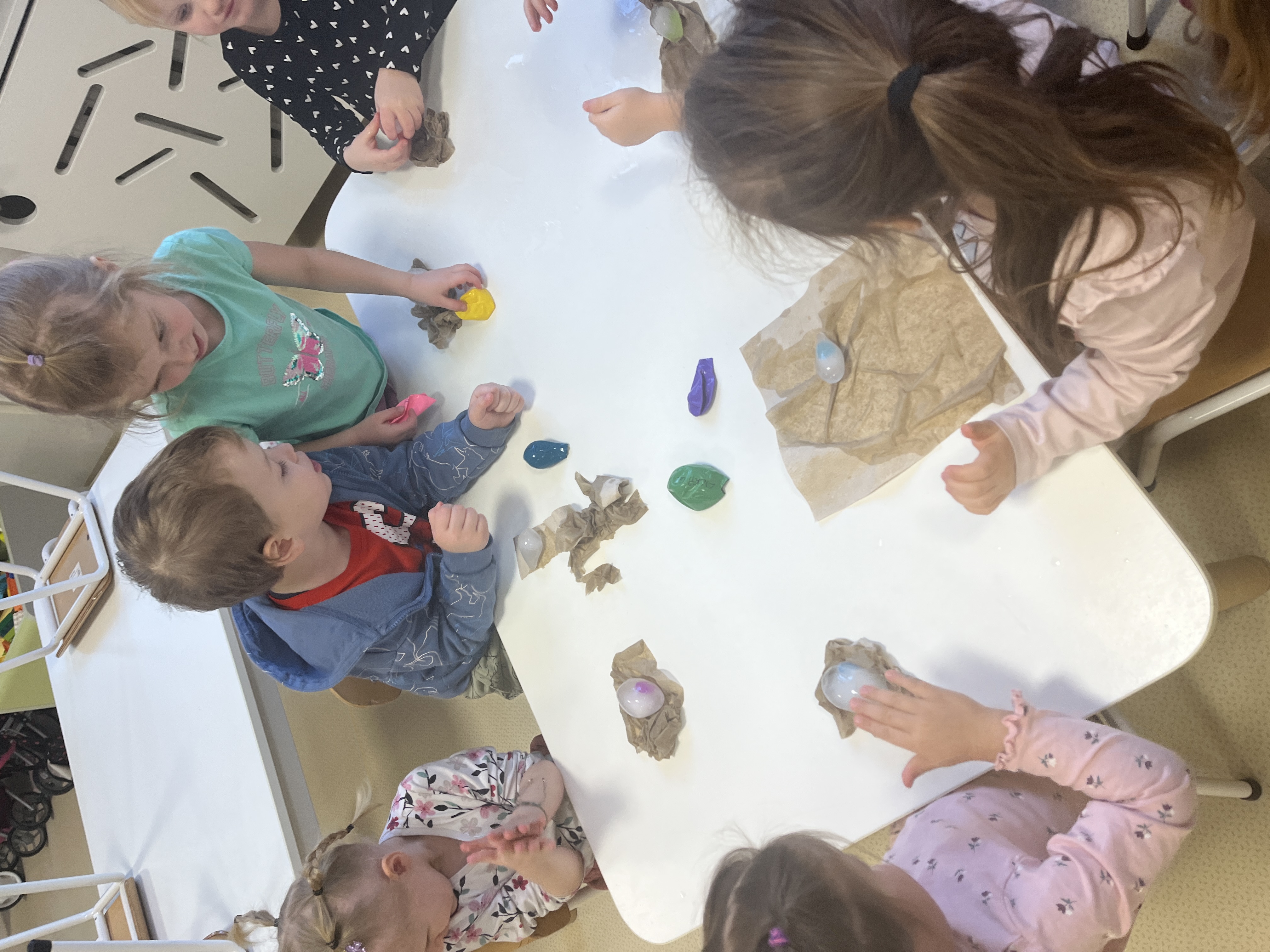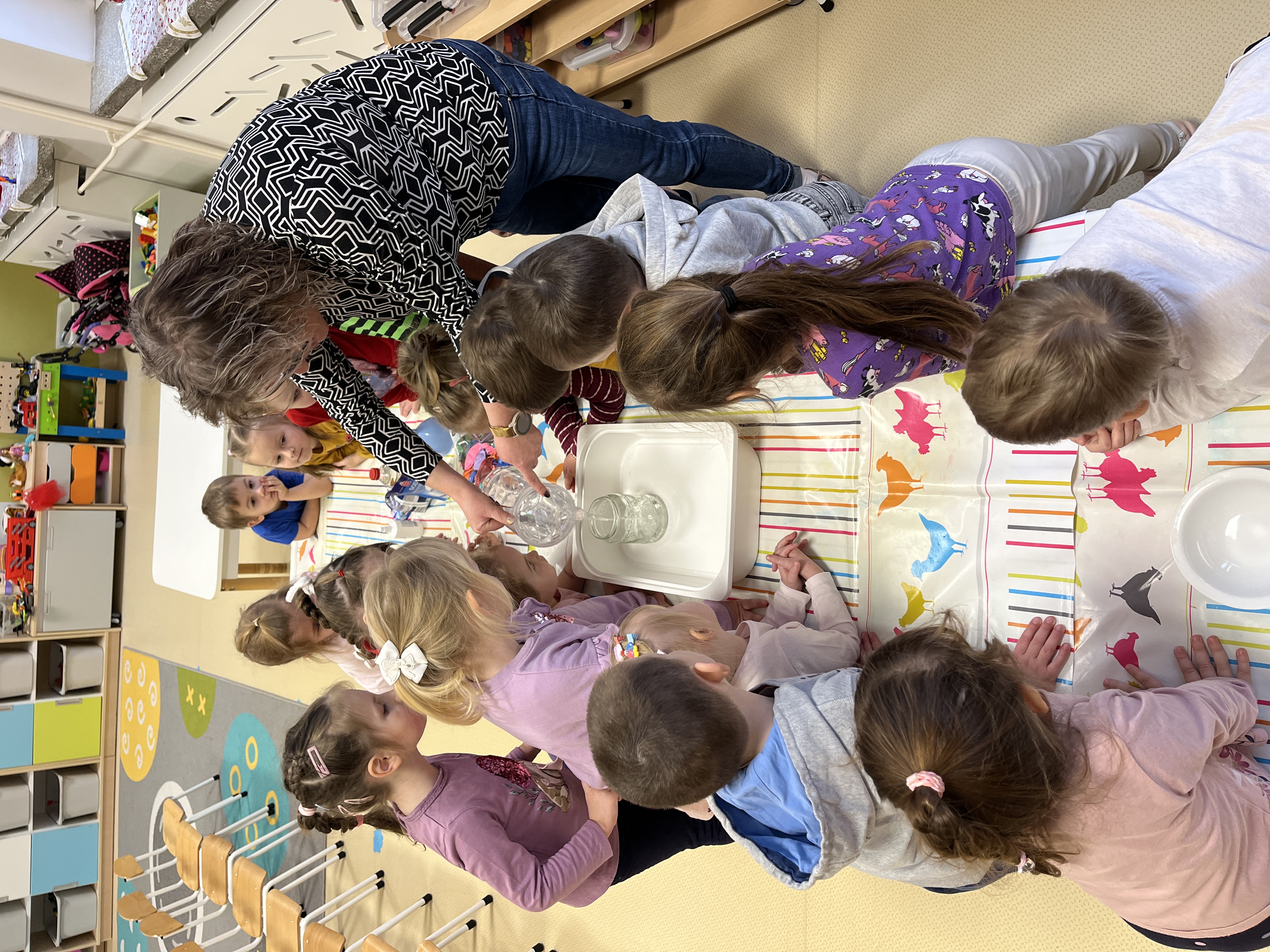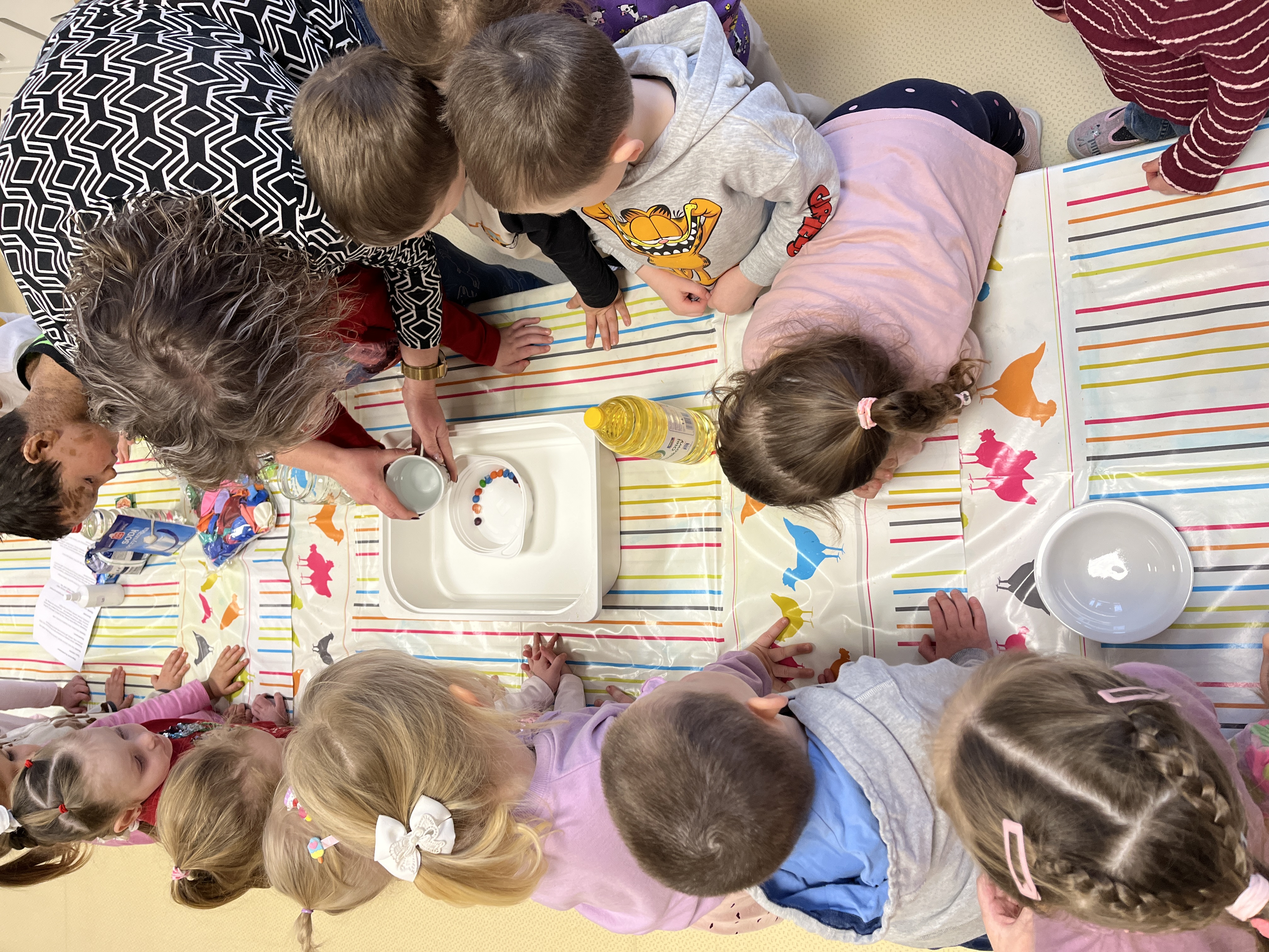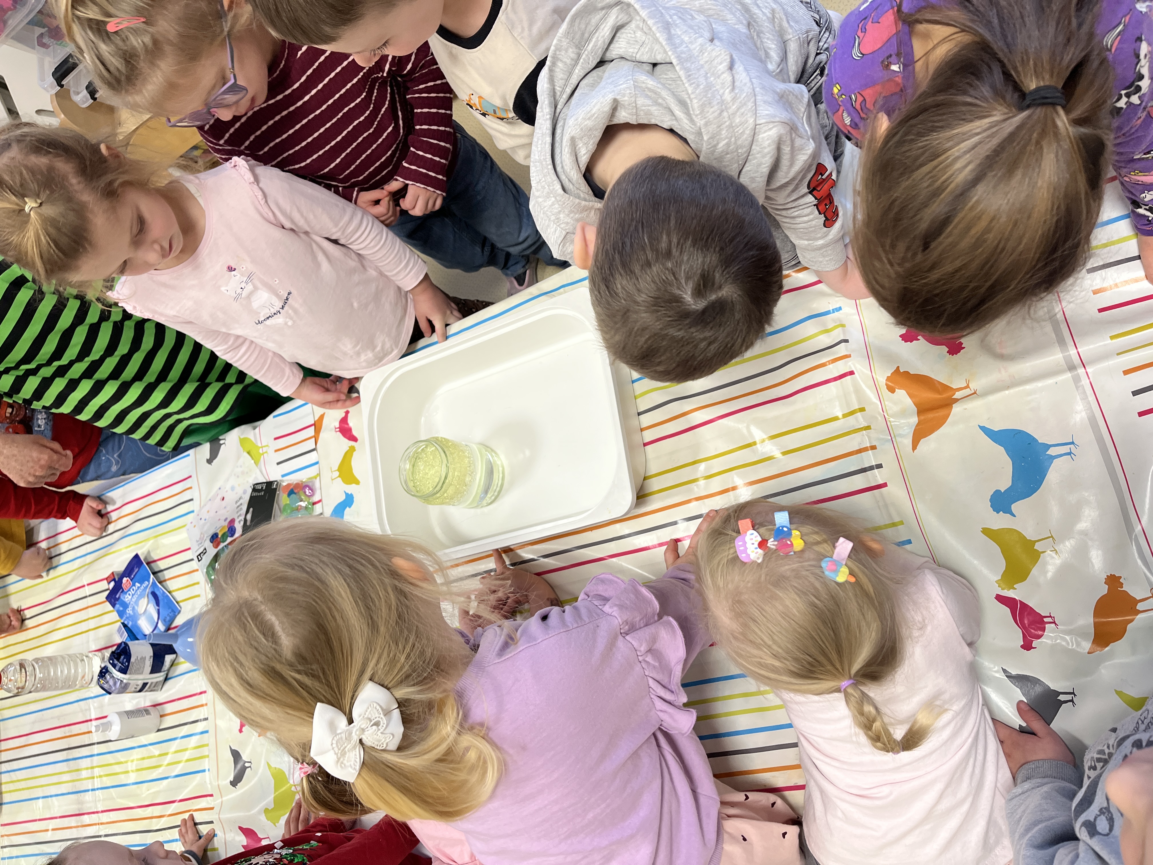 Który przedszkolak nie lubi ciekawych eksperymentów? Każdy chciałby stać się małym naukowcem i odkrywać tajemniczy świat doświadczeń. Skrzaty i Leśne Ludki wcieliły się w rolę małych odkrywców, którzy dzięki prostym eksperymentom mieli okazję odpowiedzieć sobie na pytanie „czy śnieg jest czysty?”. „Wulkan z sody”, „Tęcza z cukierków” „Mieszanie kolorów” czy „Lodowe skarby” sprawiły przedszkolakom dużo radości. Badawcze, proste doświadczenia i eksperymenty rozbudzały u dzieci ciekawość otaczającego świata przyrody. Dzieci bardzo aktywnie uczestniczyły w eksperymentach, chętnie obserwowały i zadawały pytania.