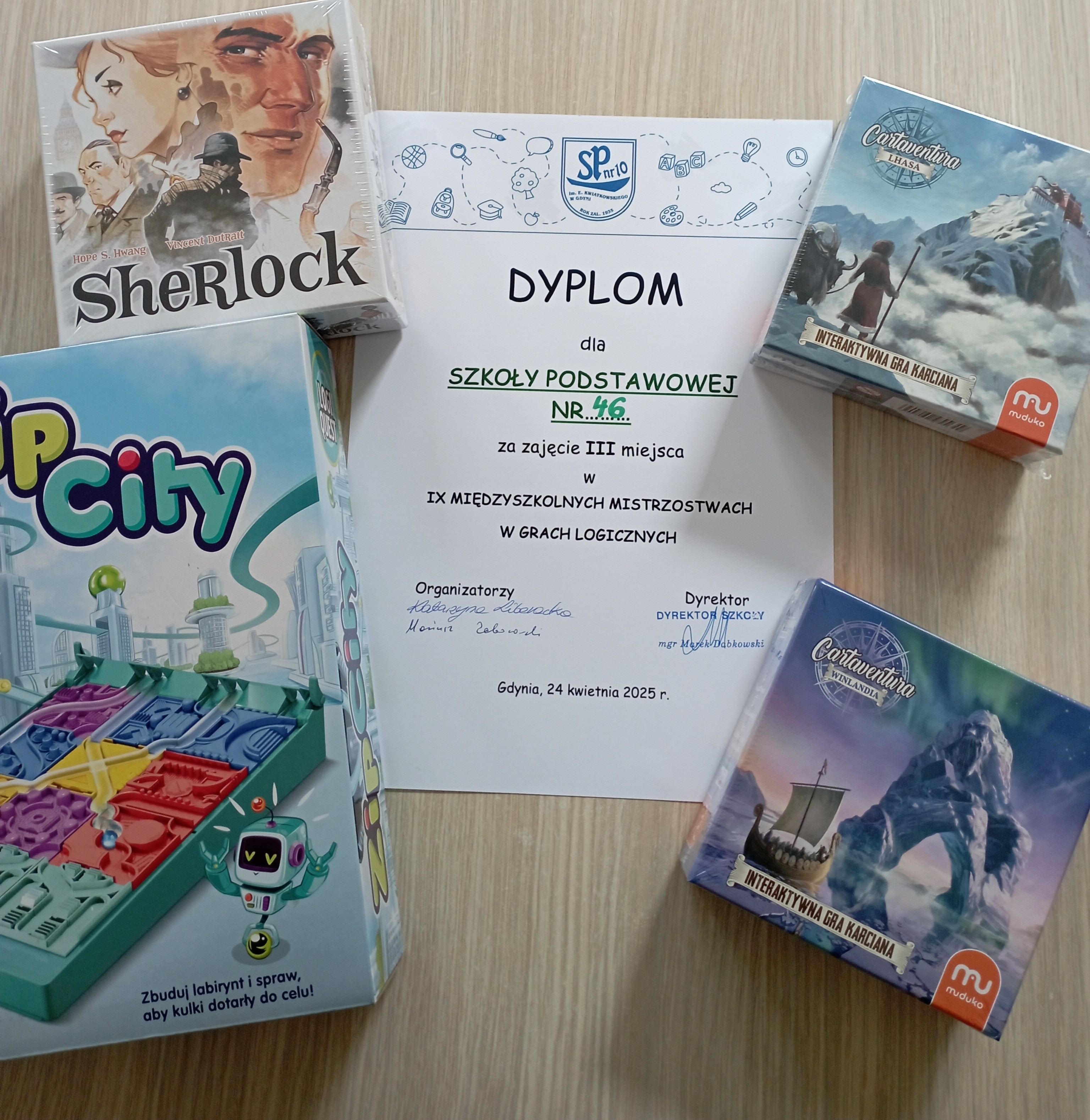 Miło nam poinformować, że reprezentacja naszej szkoły zajęła 3 miejsce w IX Mistrzostwach w Grach Logicznych. W zmaganiach uczestniczyli uczniowie klasy VIIB - Jagoda, Piotr, Staś i Janek. Dwa pierwsze etapy konkursu odbyły się w naszej szkole. Najlepsi "gracze" rywalizowali z drużynami z innych szkół w finale, który odbył się 24 kwietnia w Szkole Podstawowej nr 10. Nie zabrakło emocji, ekscytacji, ducha walki, a przede wszystkim dobrej zabawy.