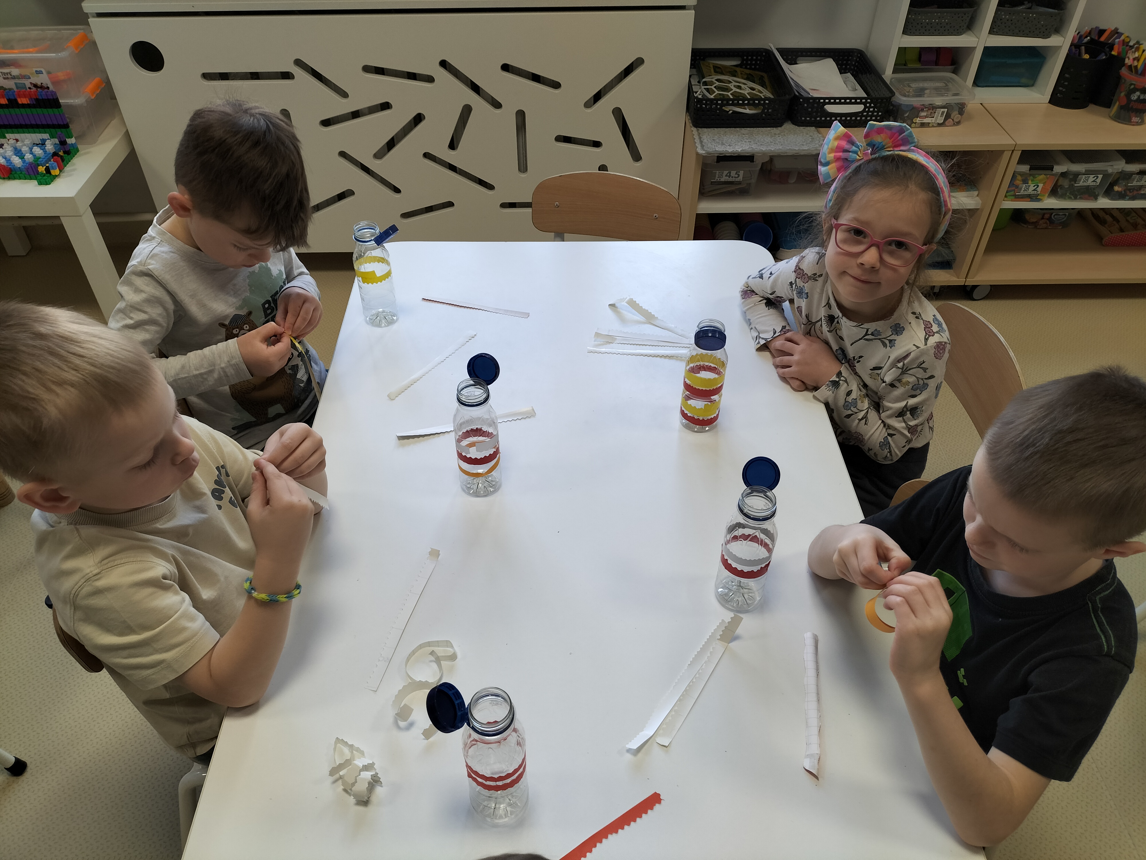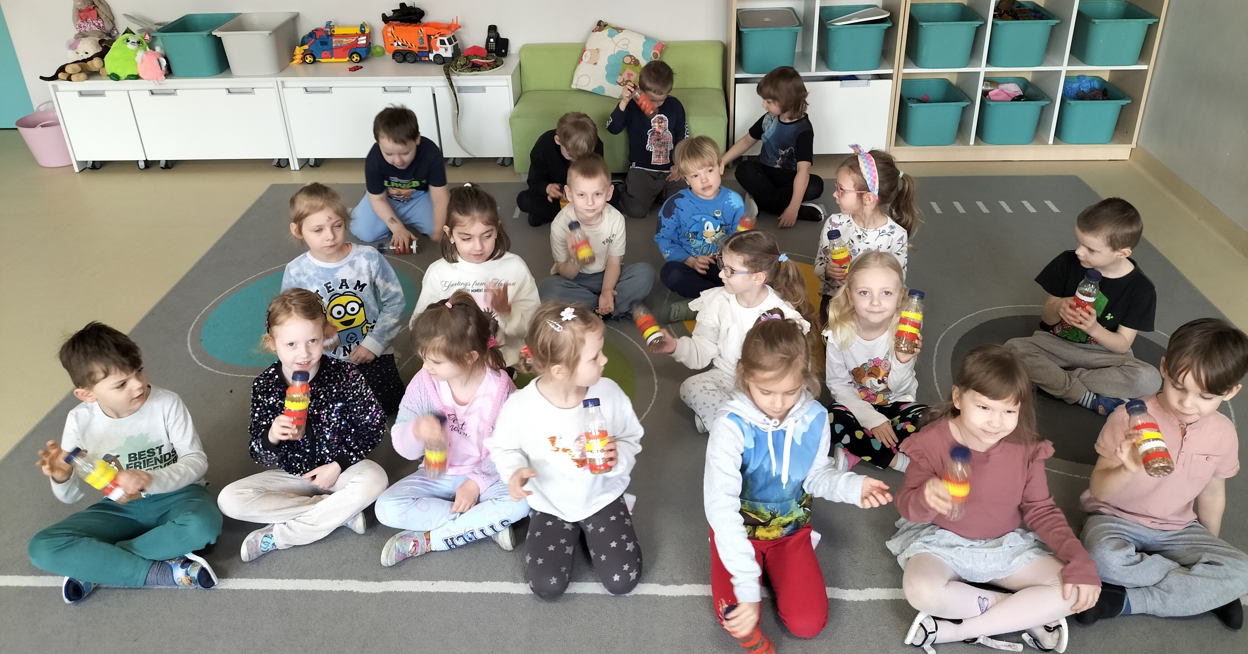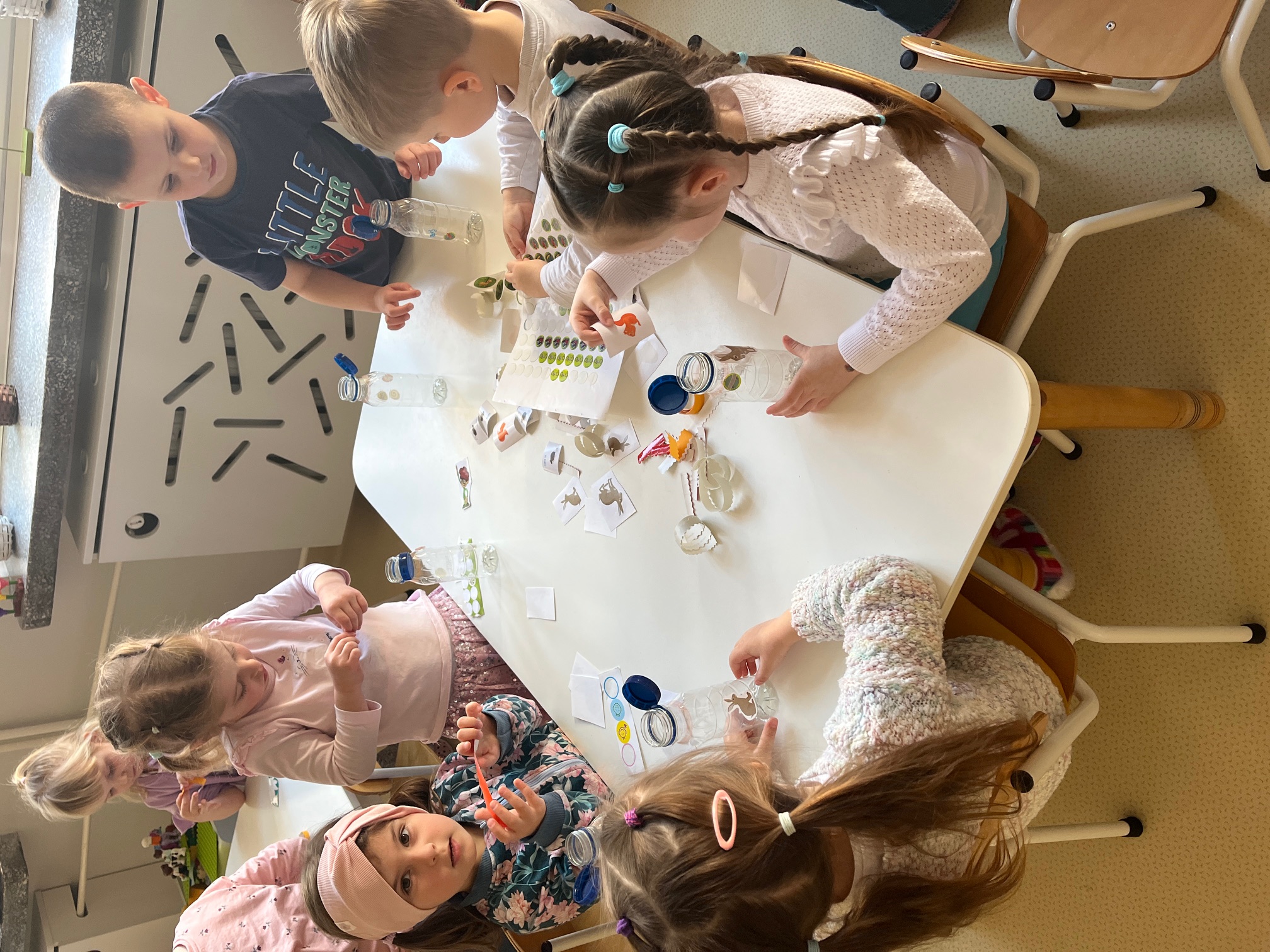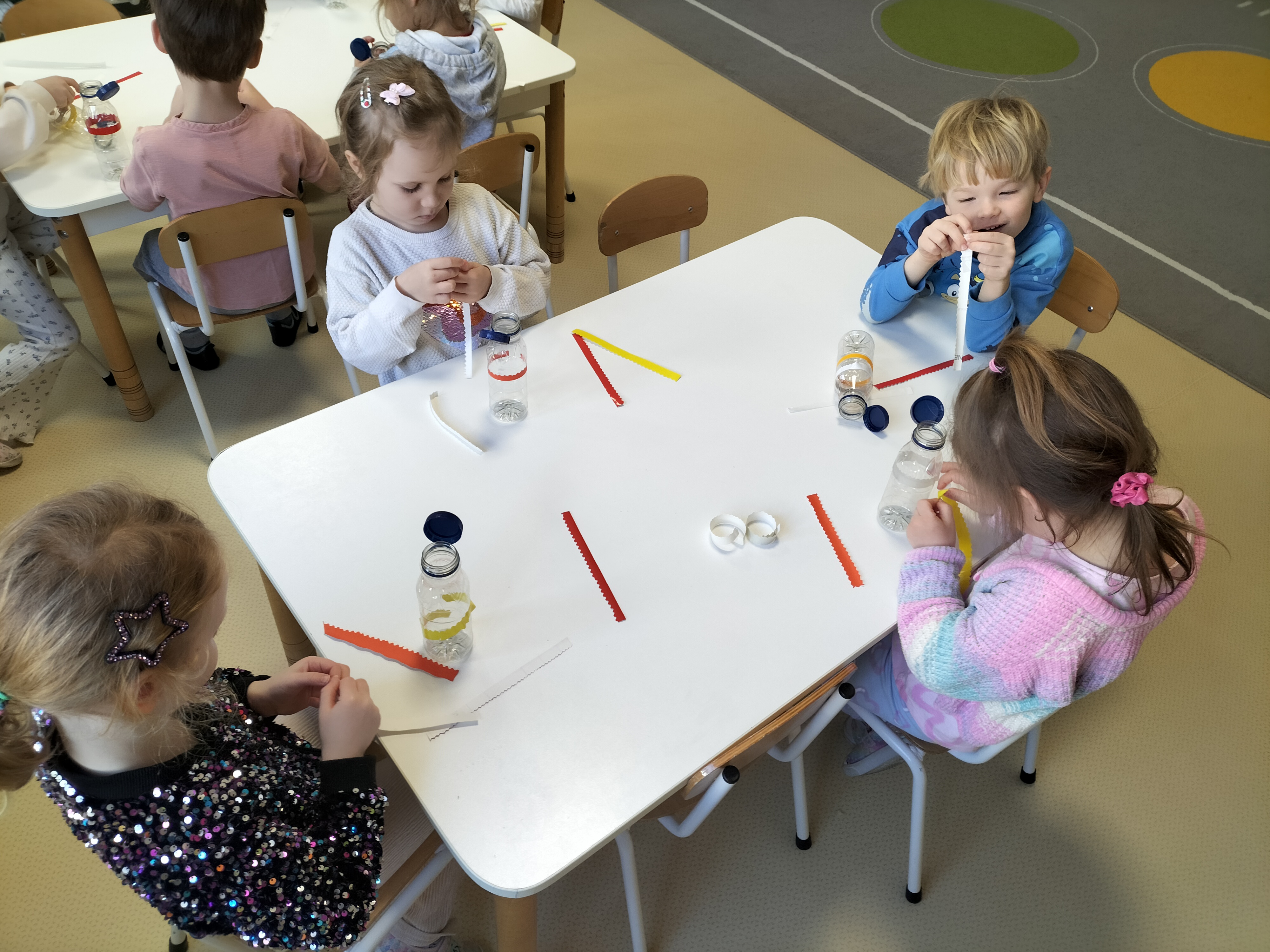 W piątek dzieci z grup Elfy oraz Leśne Ludki wykonały własne eko-instrumenty z plastikowych butelek. Powstałe marakasy zostały ozdobione naklejkami oraz kolorową folią samoprzylepną, co pozwoliło dzieciom rozwijać kreatywność i zdolności manualne.
