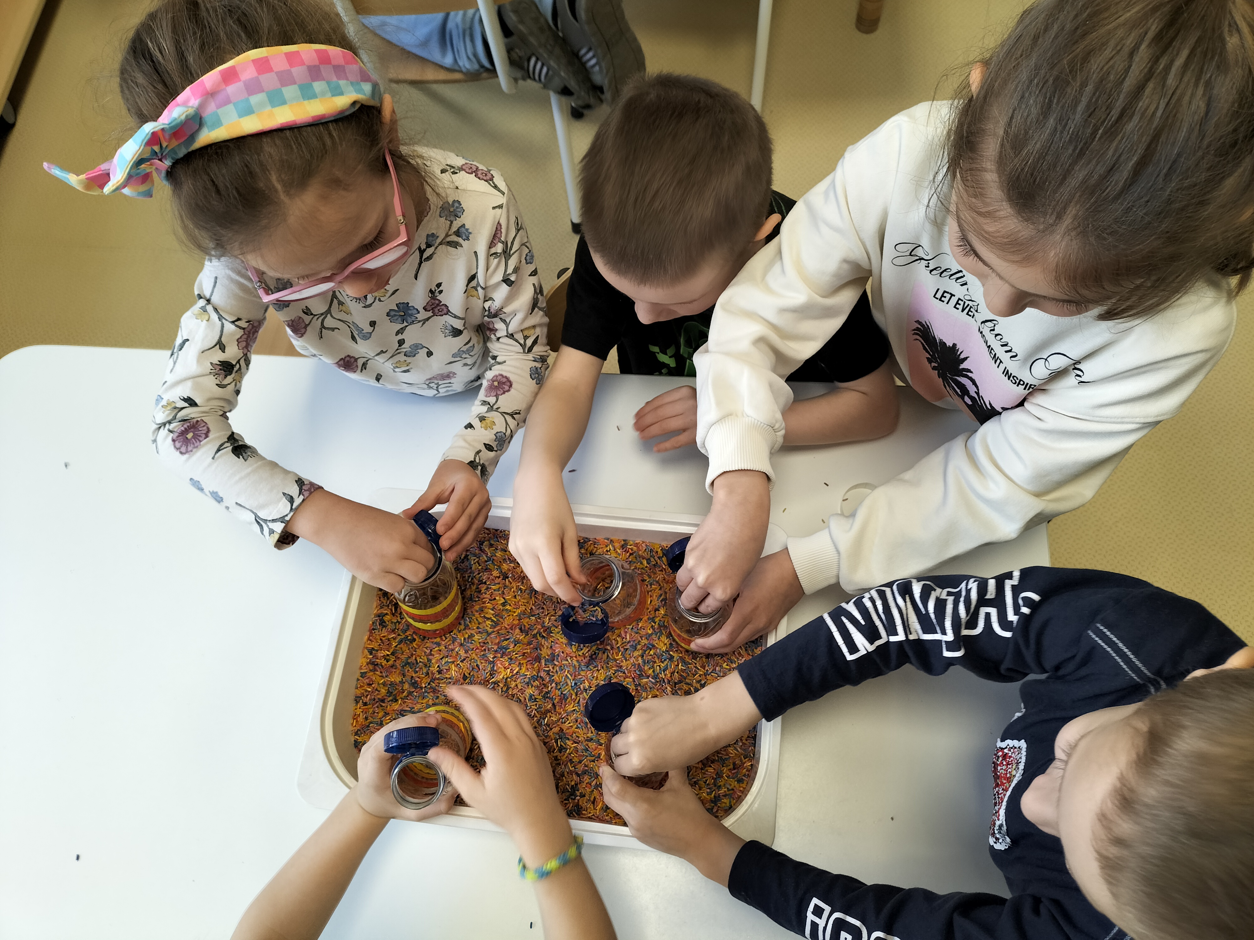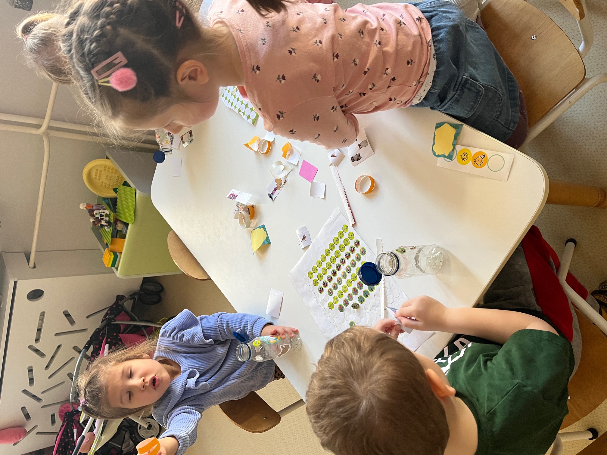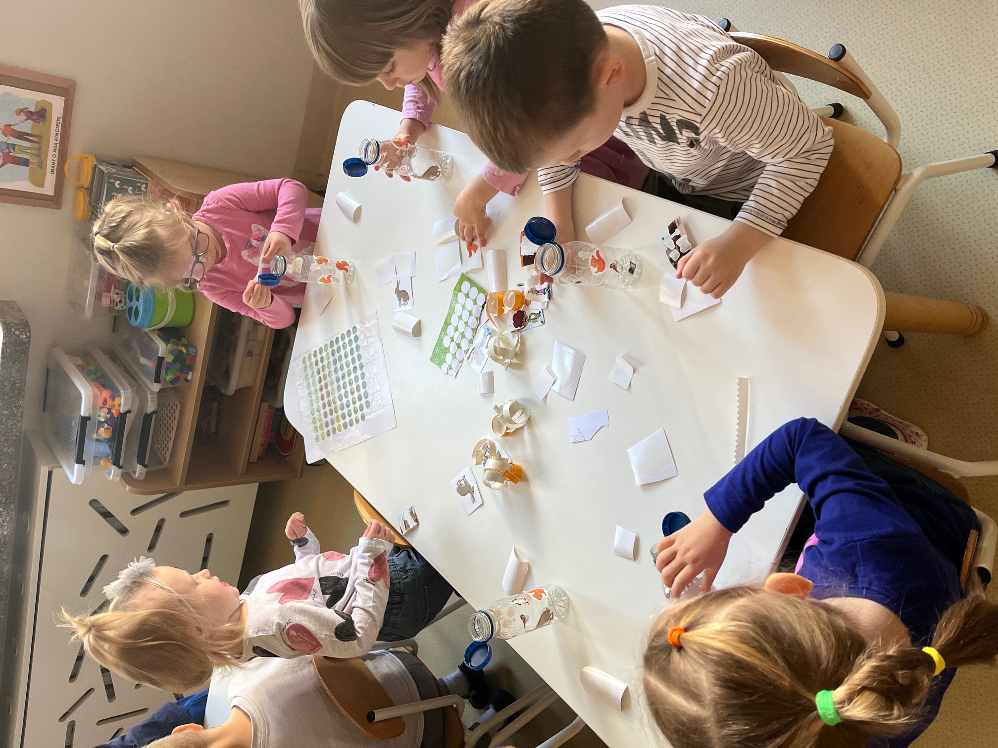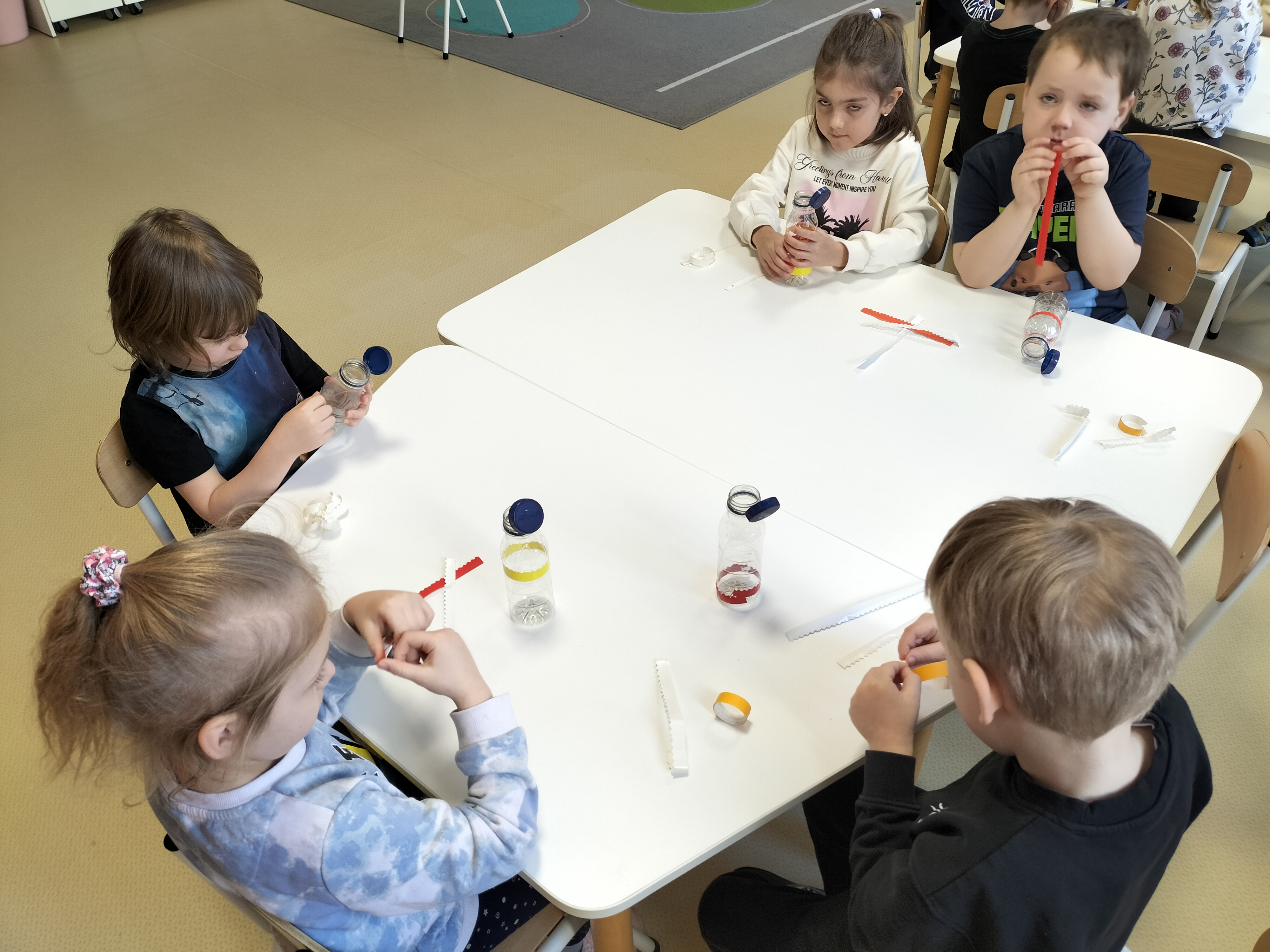 W piątek dzieci z grup Elfy oraz Leśne Ludki wykonały własne eko-instrumenty z plastikowych butelek. Powstałe marakasy zostały ozdobione naklejkami oraz kolorową folią samoprzylepną, co pozwoliło dzieciom rozwijać kreatywność i zdolności manualne.