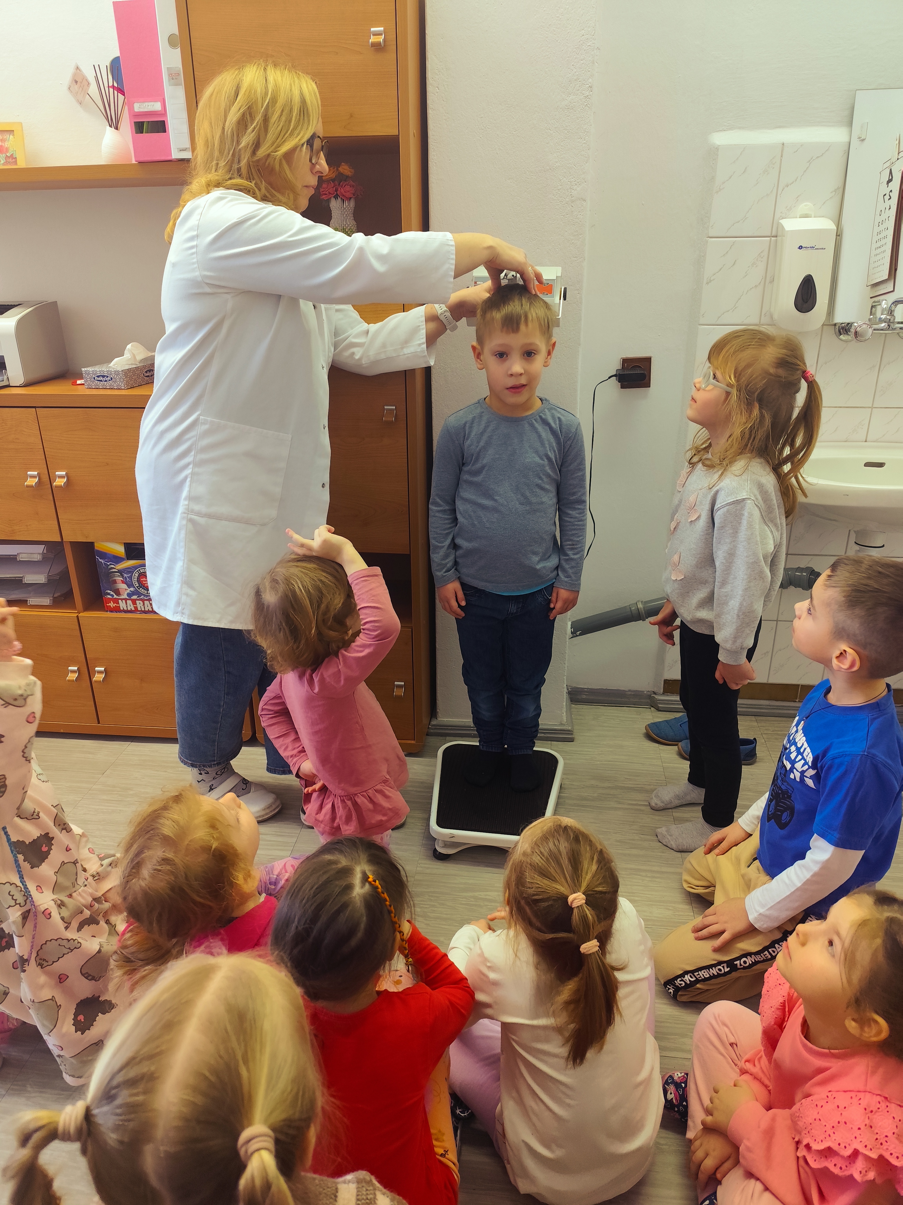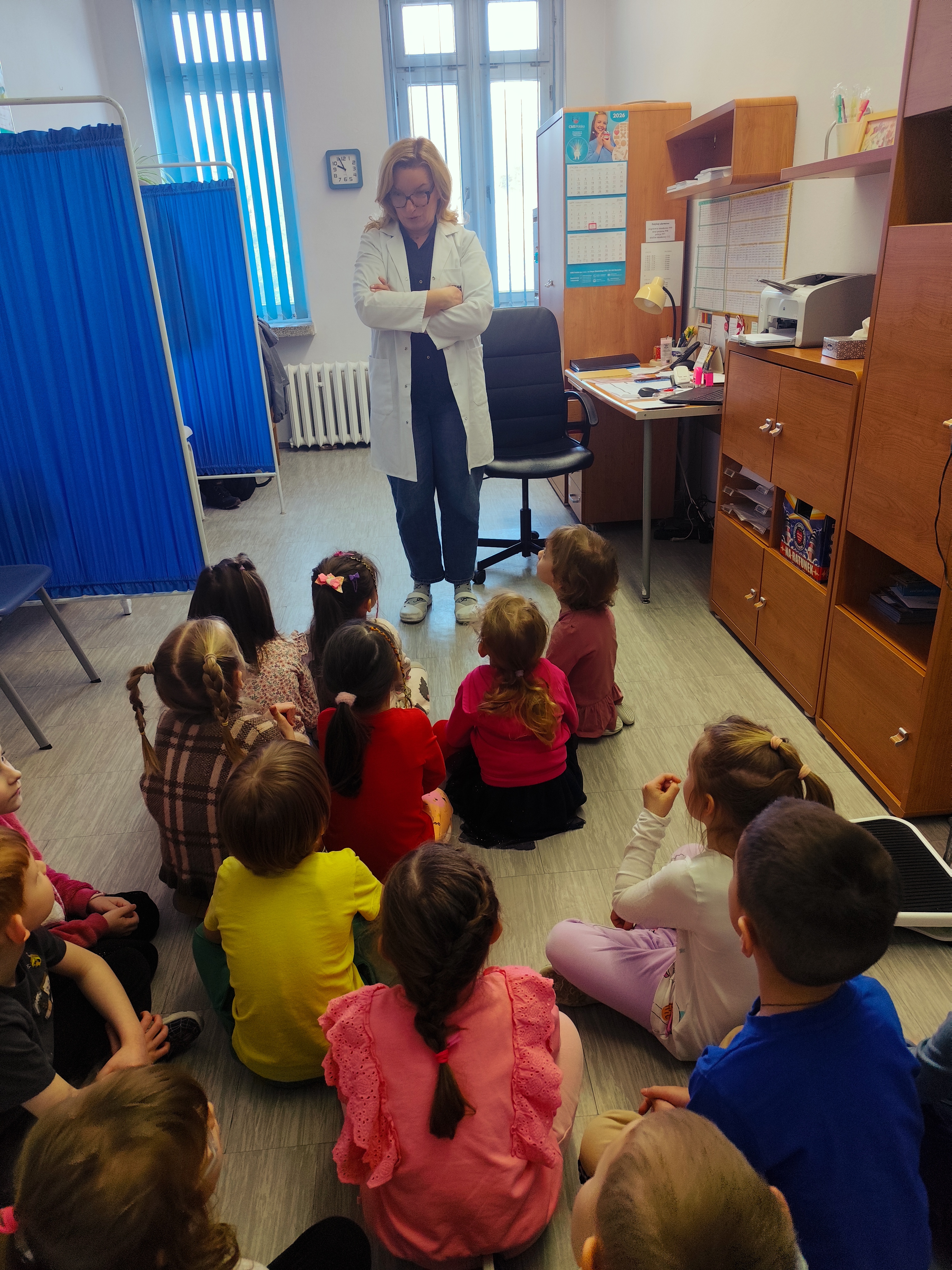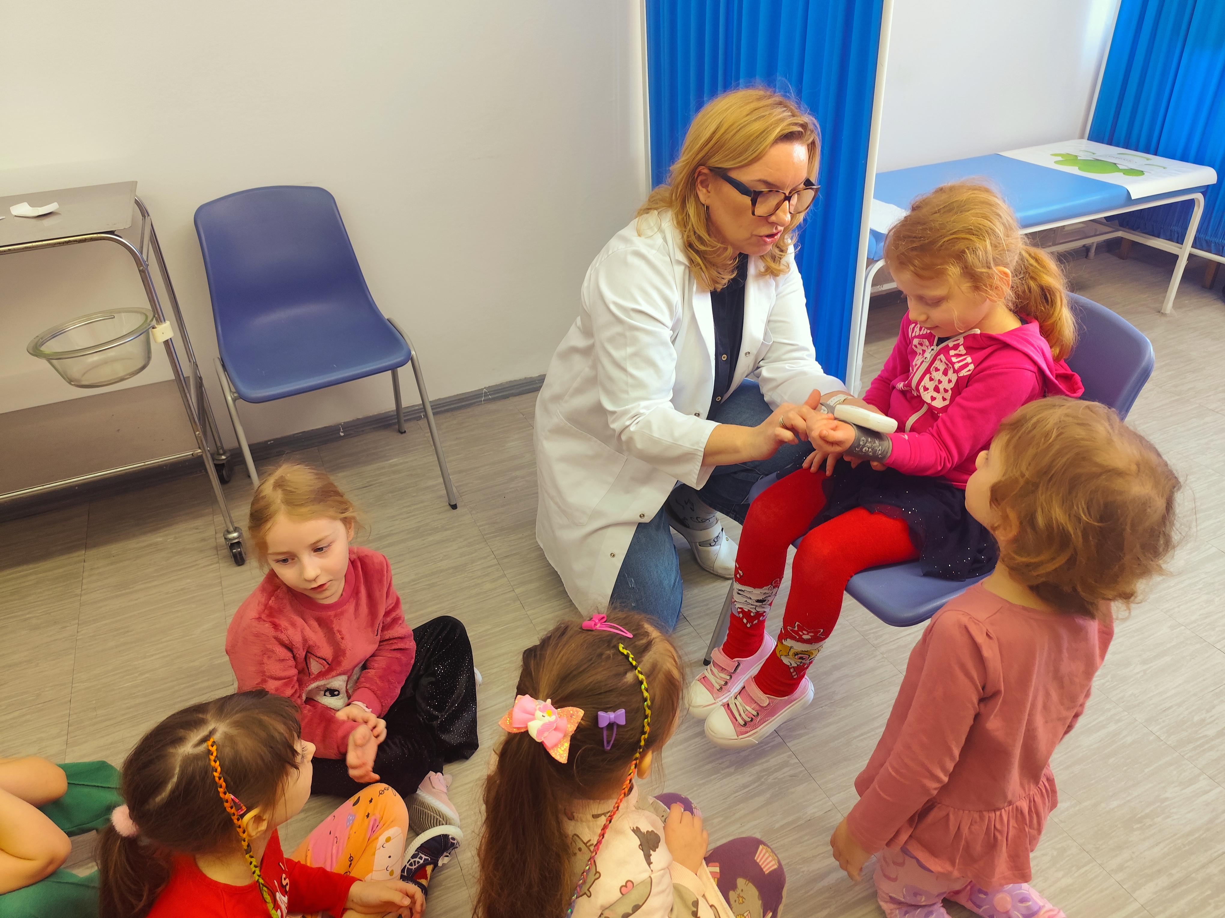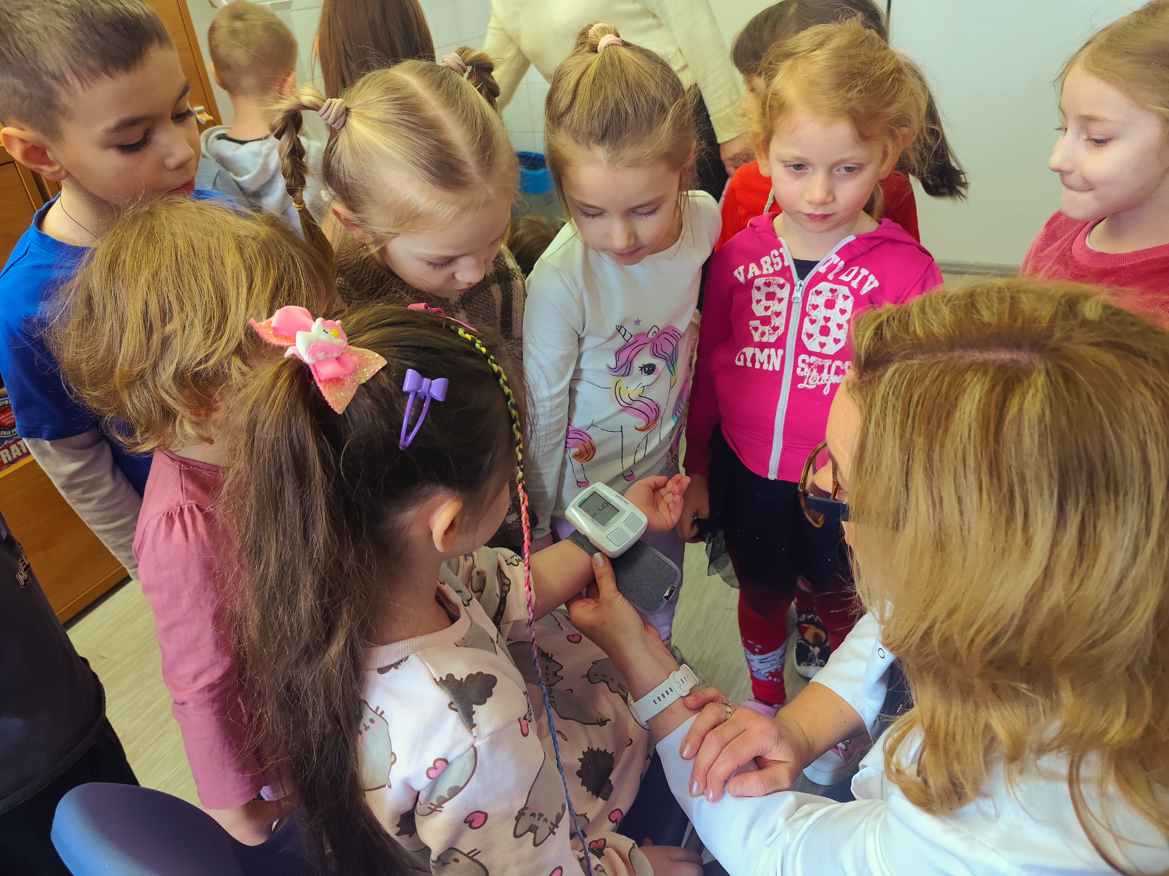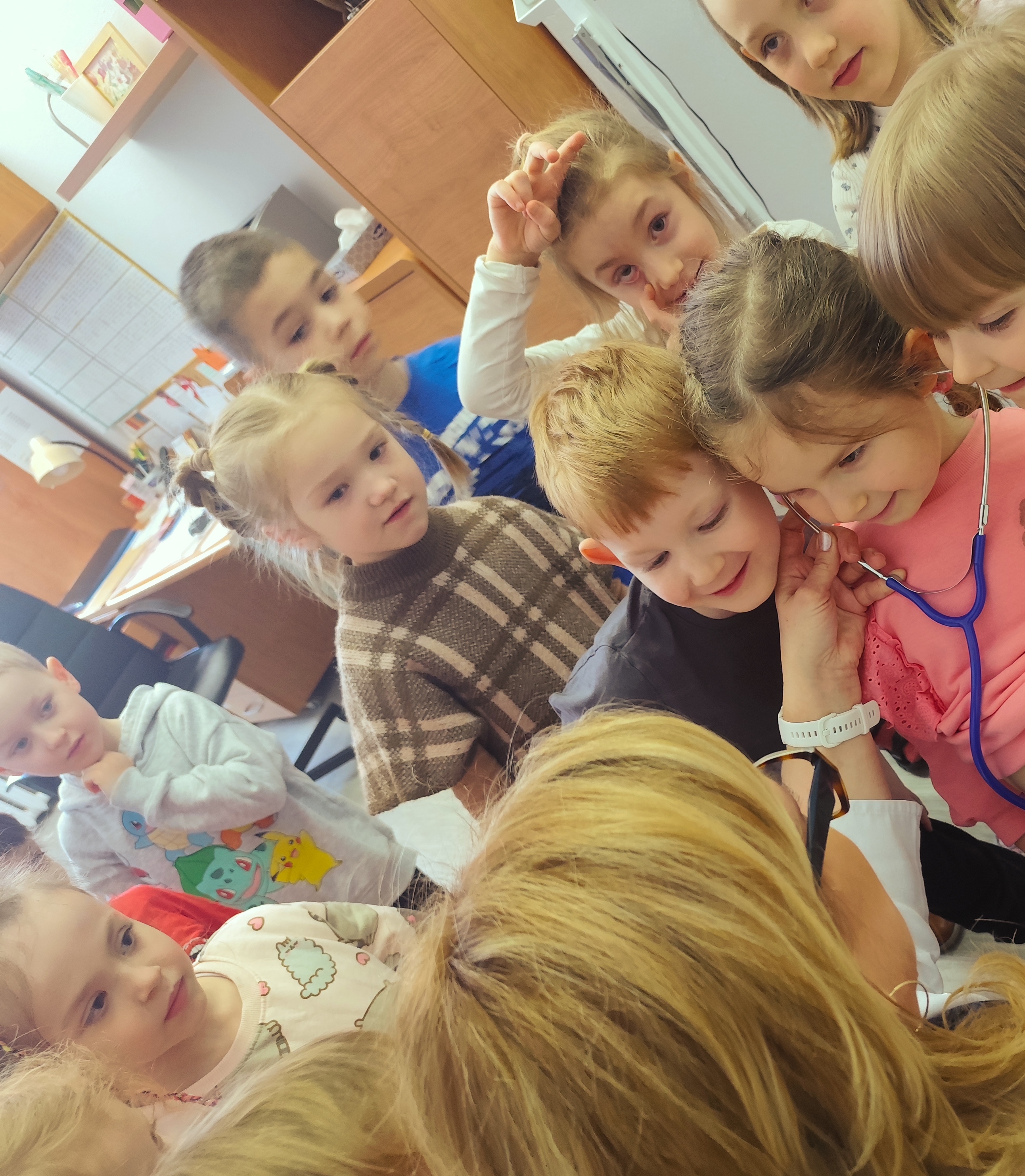 Świetliki podczas wizyty u pani pielęgniarki nie tylko dowiedziały się, na czym polega dbanie o zdrowie uczniów, ale również mogły w praktyce zobaczyć, jak wygląda jej codzienna praca. Dużo pozytywnych emocji wzbudziła możliwość posłuchania bicia własnego serca przez stetoskop, pomiar wzrostu i wagi oraz obserwowanie pomiaru ciśnienia. To wyjątkowe doświadczenie pozwoliło dzieciom choć na chwilę poczuć się jak w prawdziwym gabinecie medycznym.