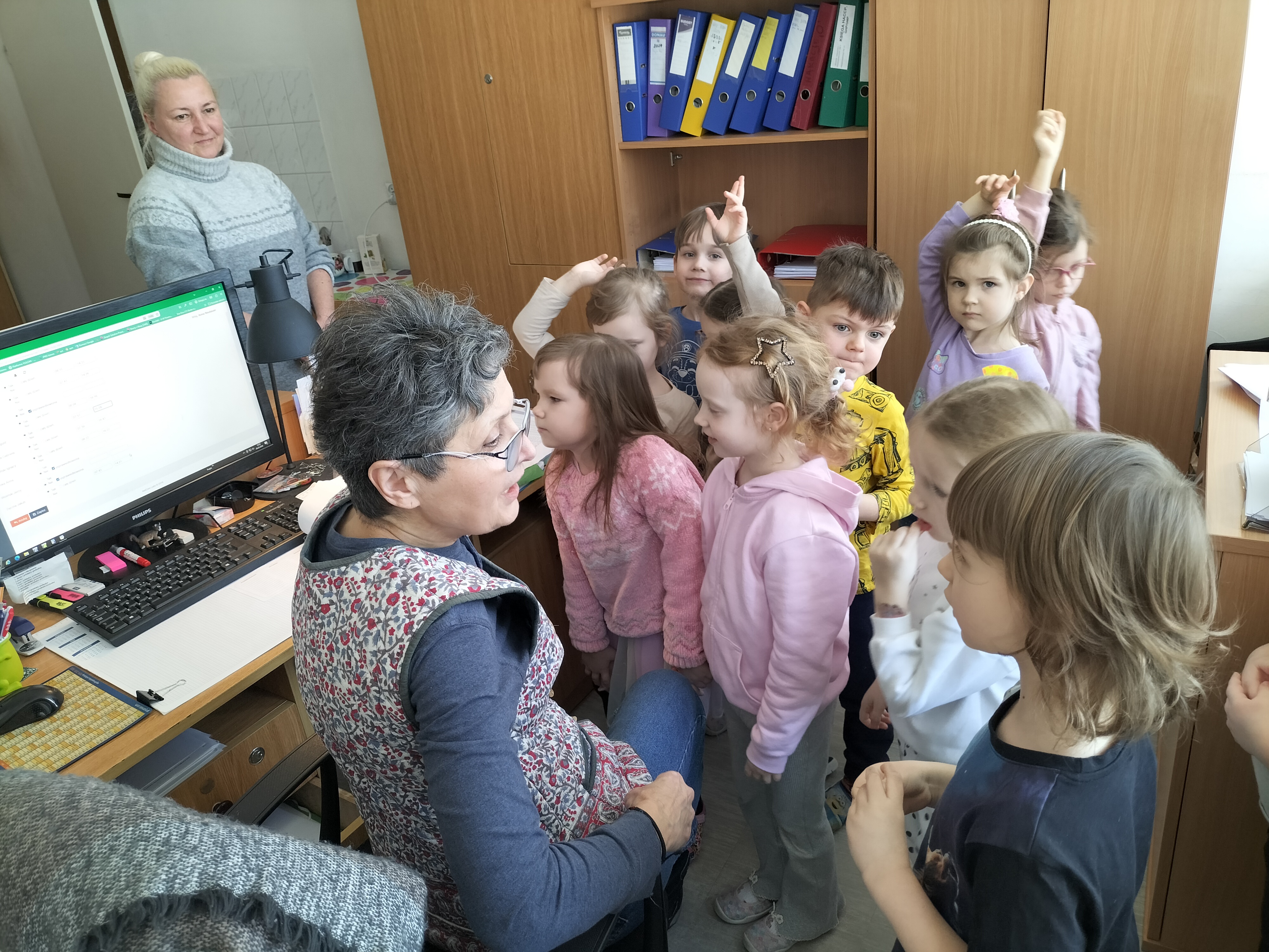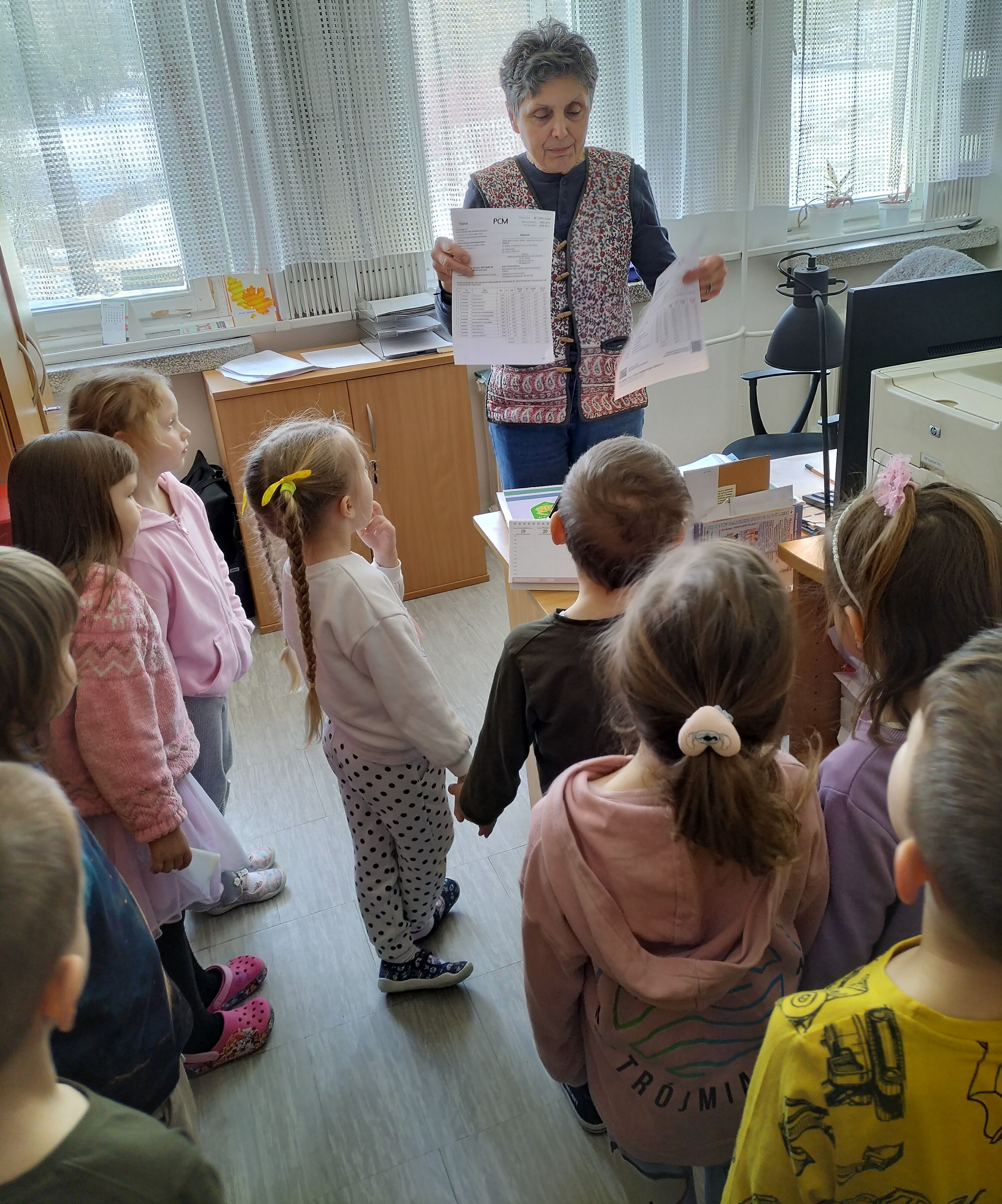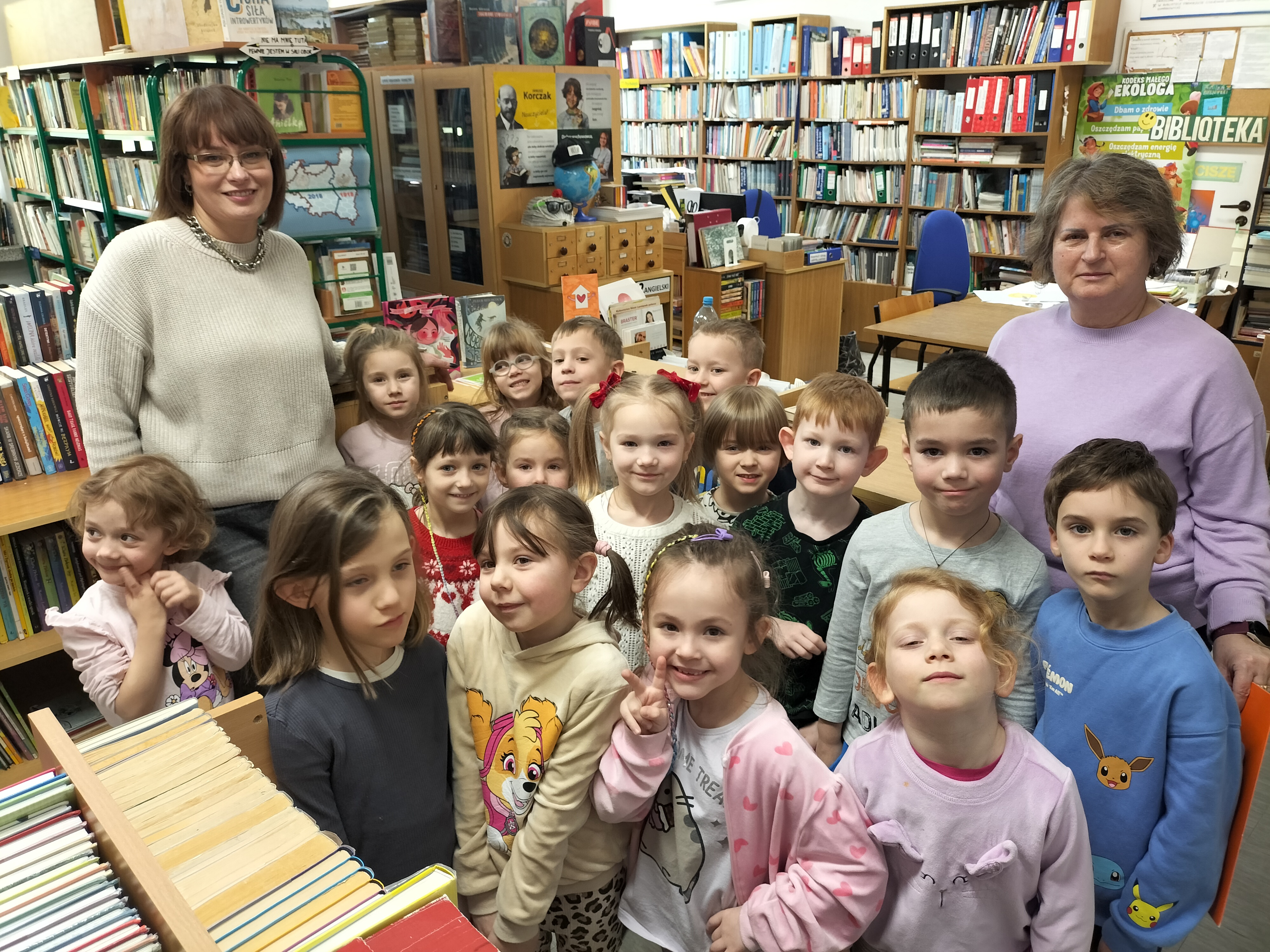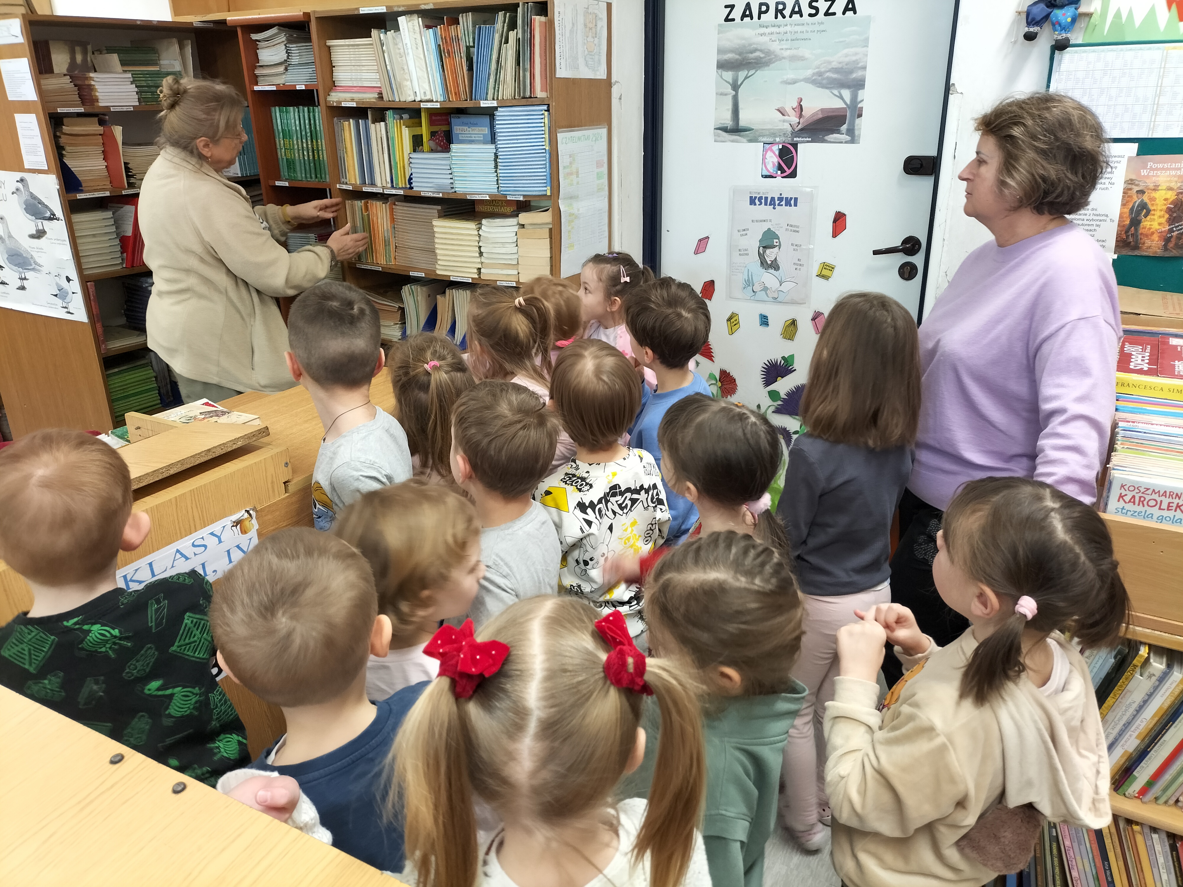 Kolejnym przystankiem była biblioteka szkolna. Przedszkolaki poznały budowę książki – dowiedziały się, czym jest okładka, grzbiet i strona tytułowa, a także przypomniały sobie, jak należy szanować książki. Dzieci poznały zasady wypożyczania książek oraz z zaciekawieniem obejrzały nowo powstającą czytelnię, która już wkrótce stanie się przytulnym miejscem spotkań z literaturą.