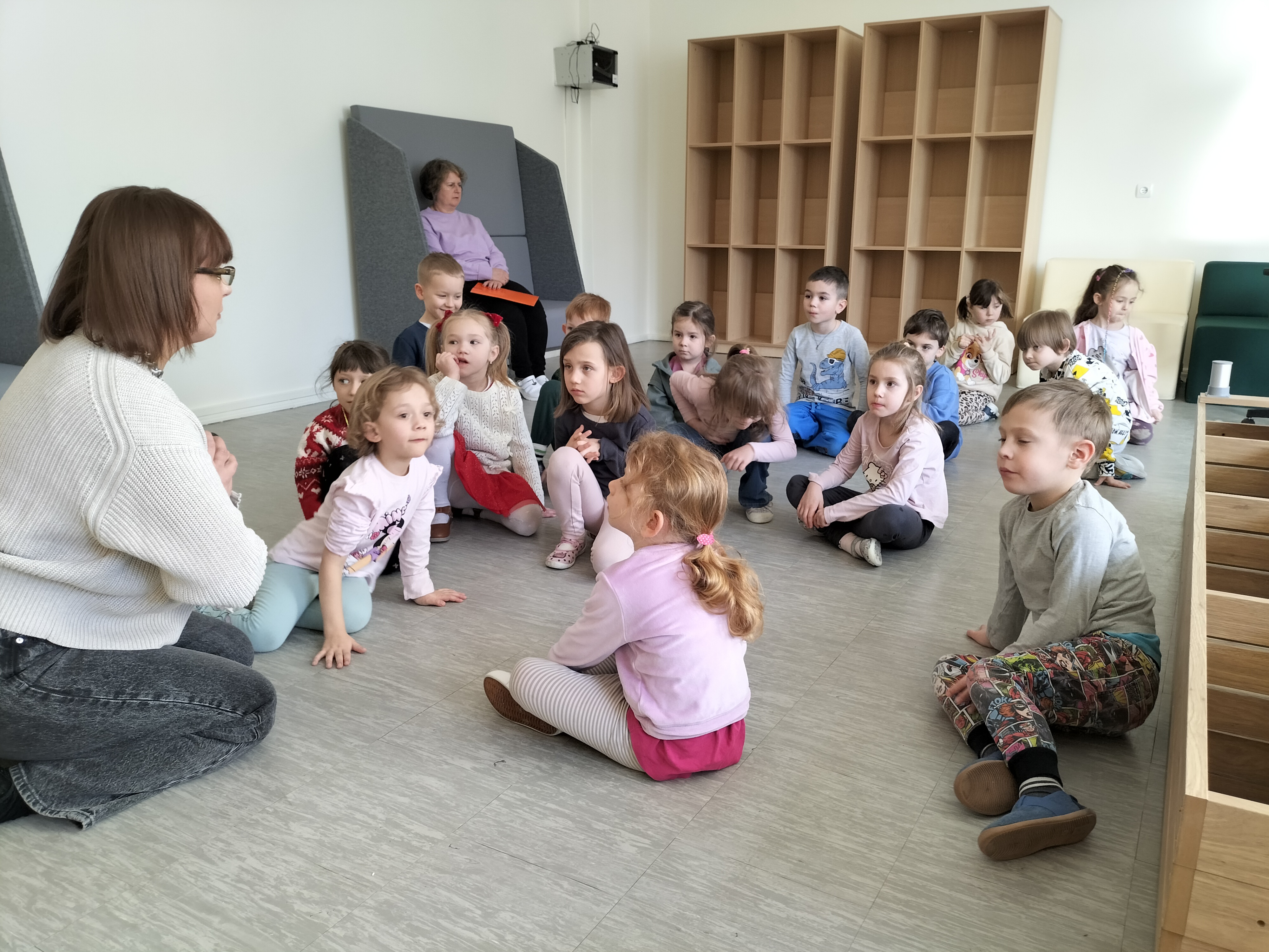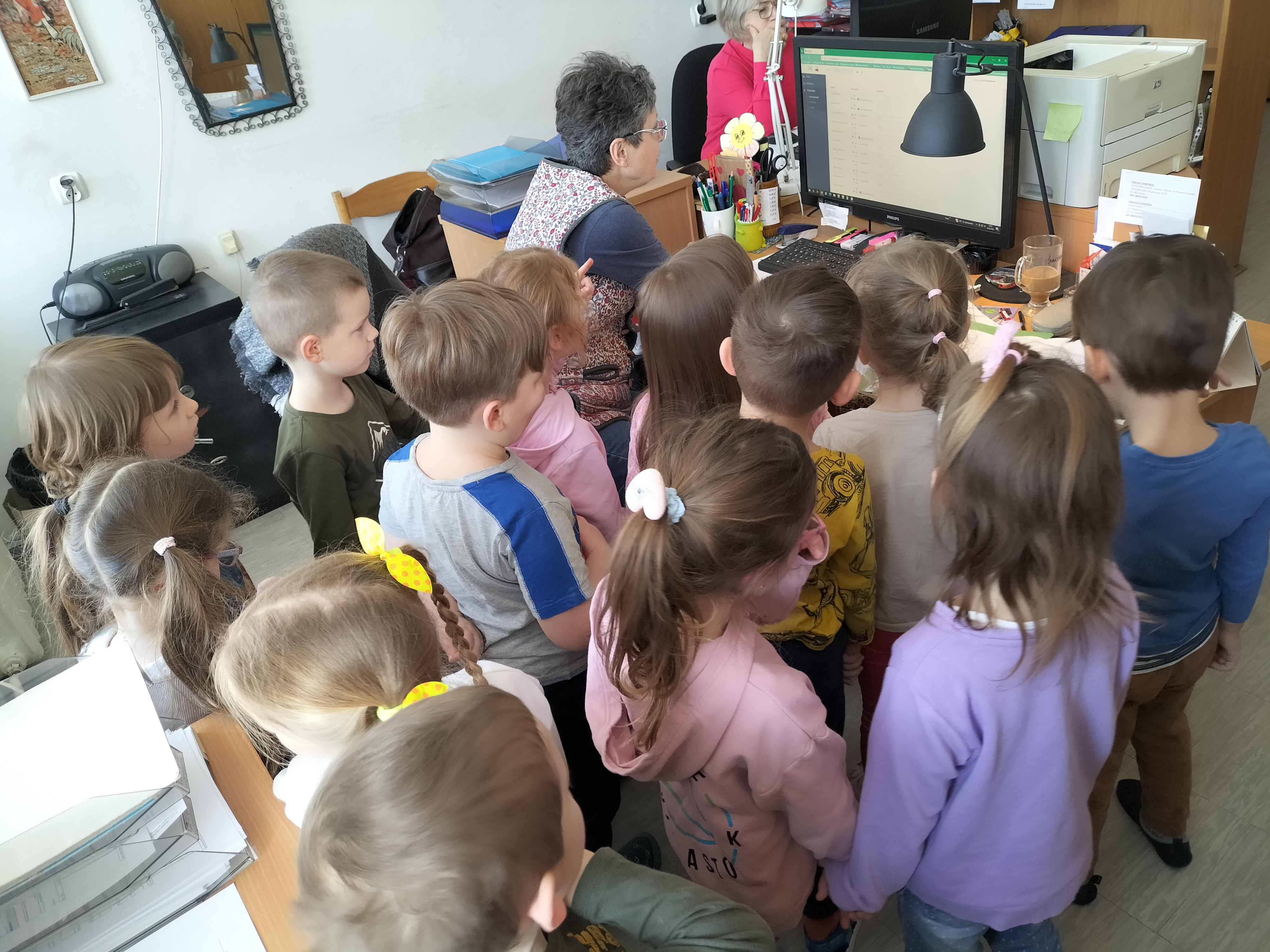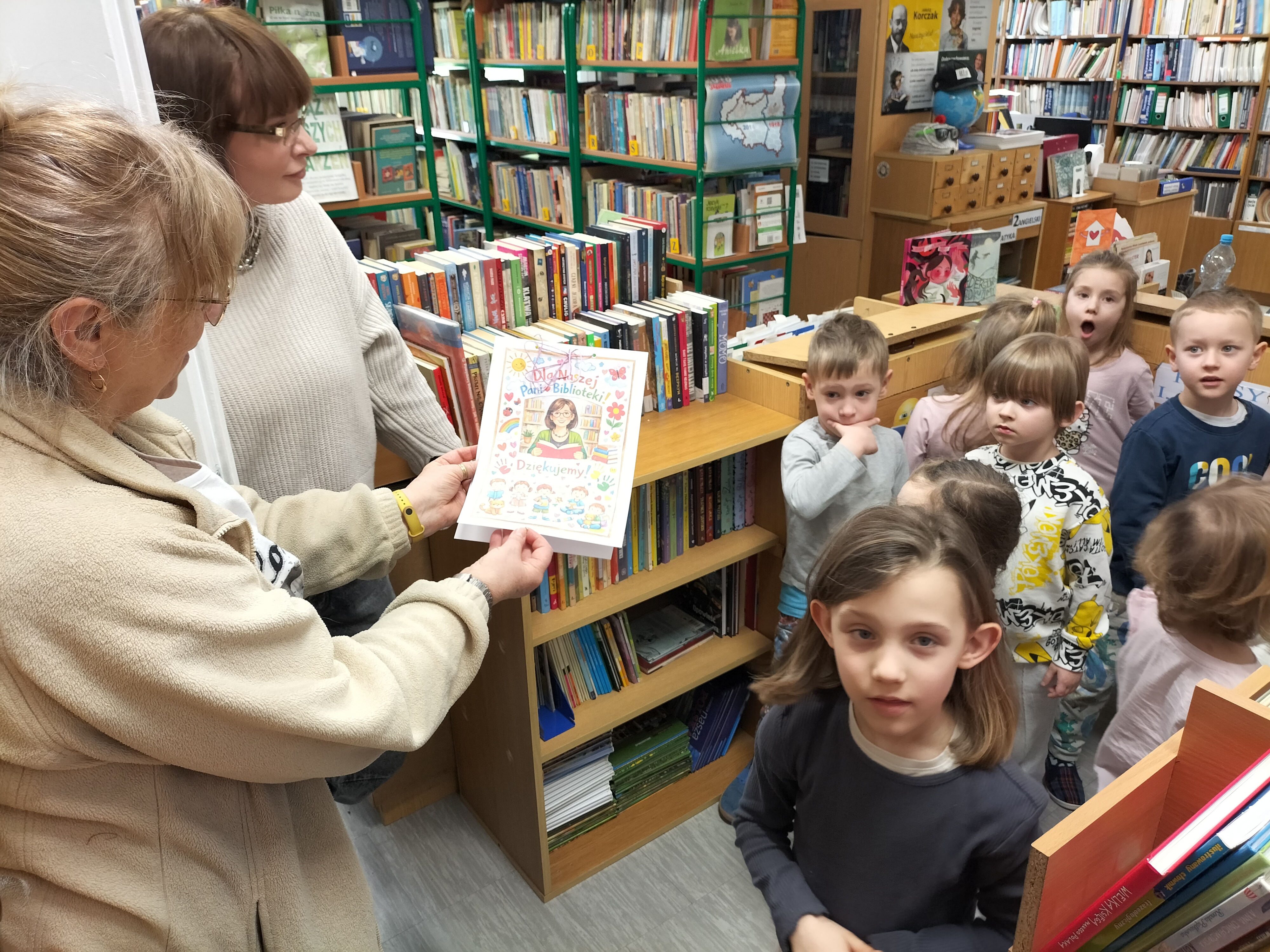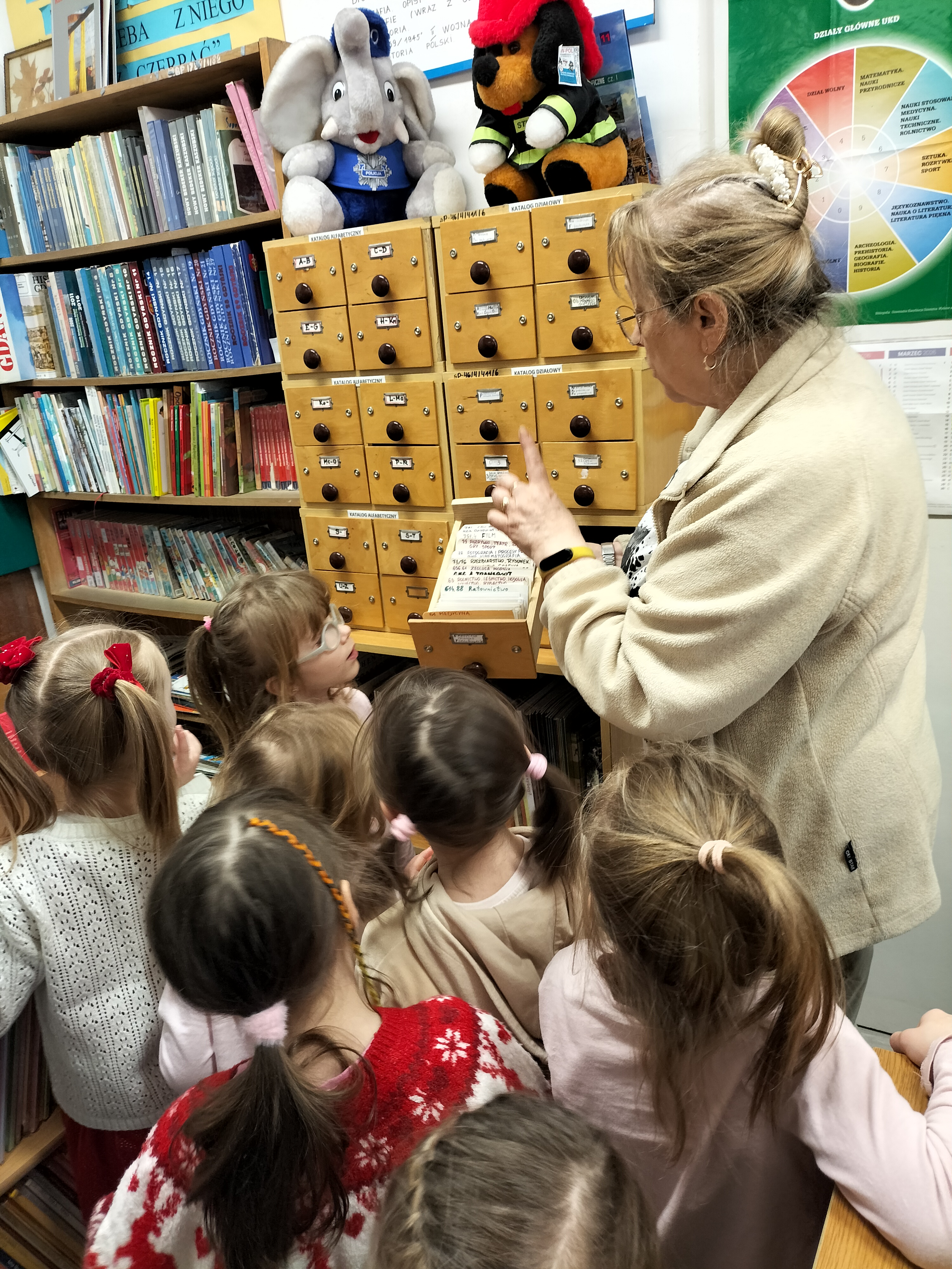 Kolejnym przystankiem była biblioteka szkolna. Przedszkolaki poznały budowę książki – dowiedziały się, czym jest okładka, grzbiet i strona tytułowa, a także przypomniały sobie, jak należy szanować książki. Dzieci poznały zasady wypożyczania książek oraz z zaciekawieniem obejrzały nowo powstającą czytelnię, która już wkrótce stanie się przytulnym miejscem spotkań z literaturą.
