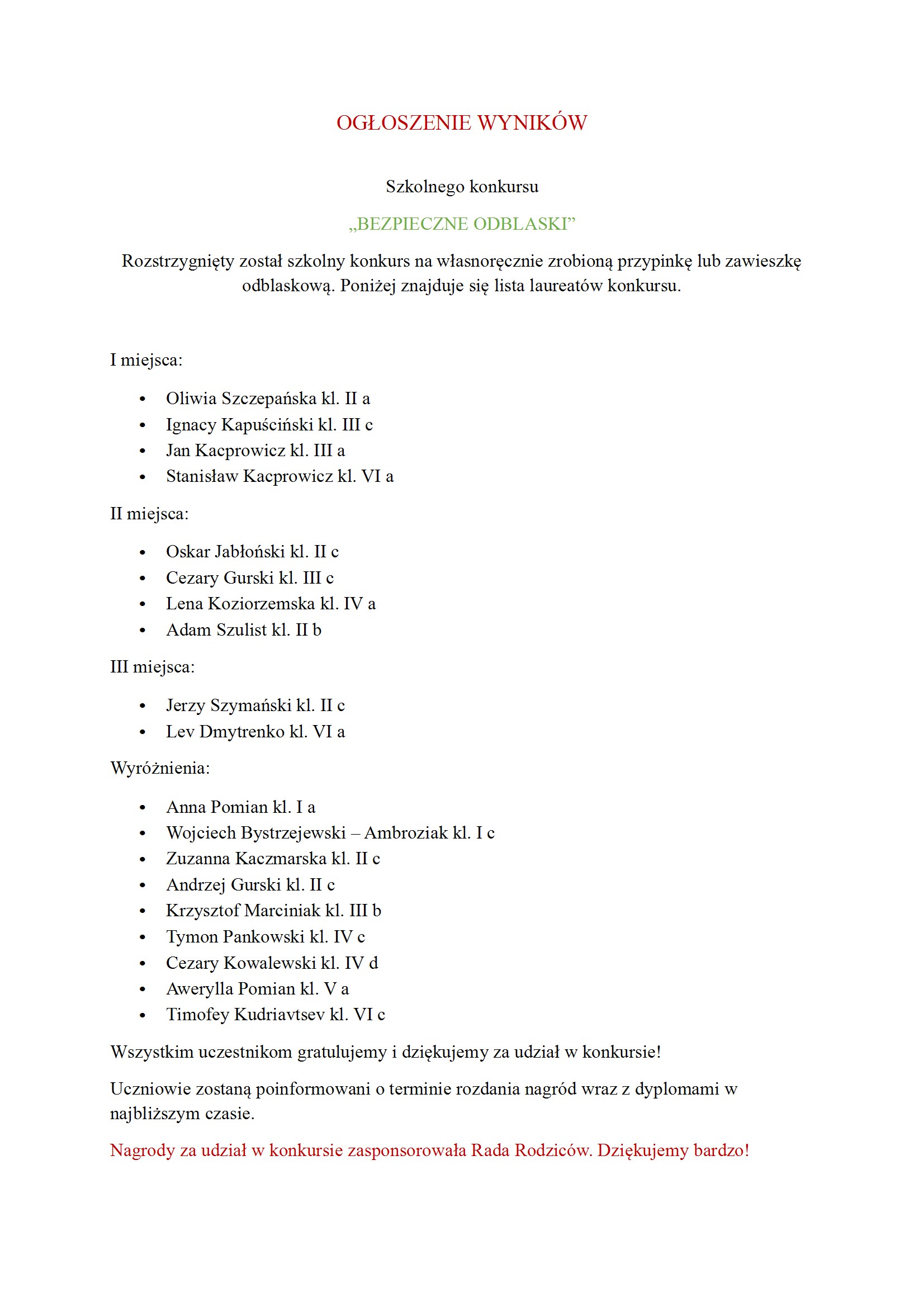 OGŁOSZENIE WYNIKÓW Szkolnego konkursu „BEZPIECZNE ODBLASKI”