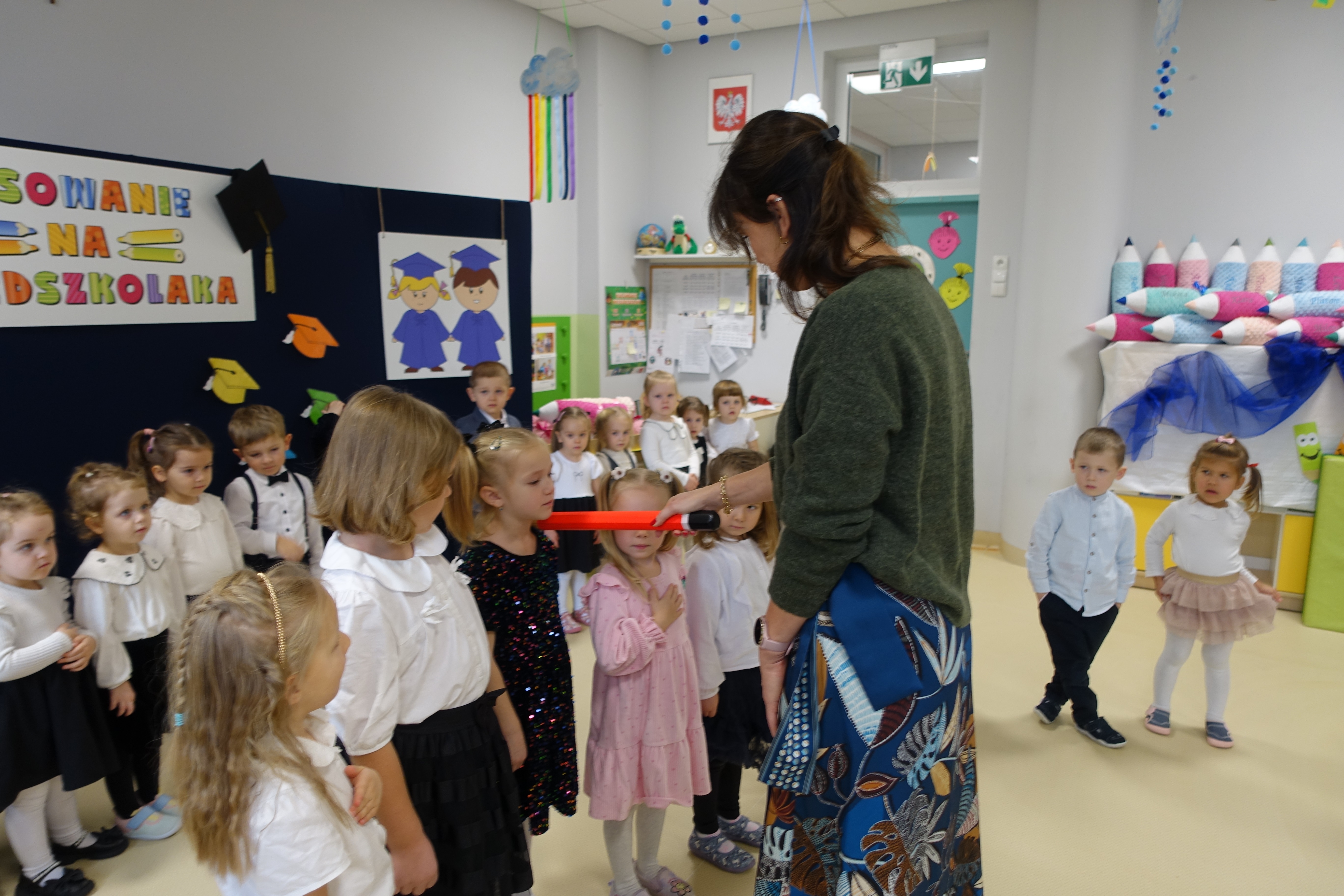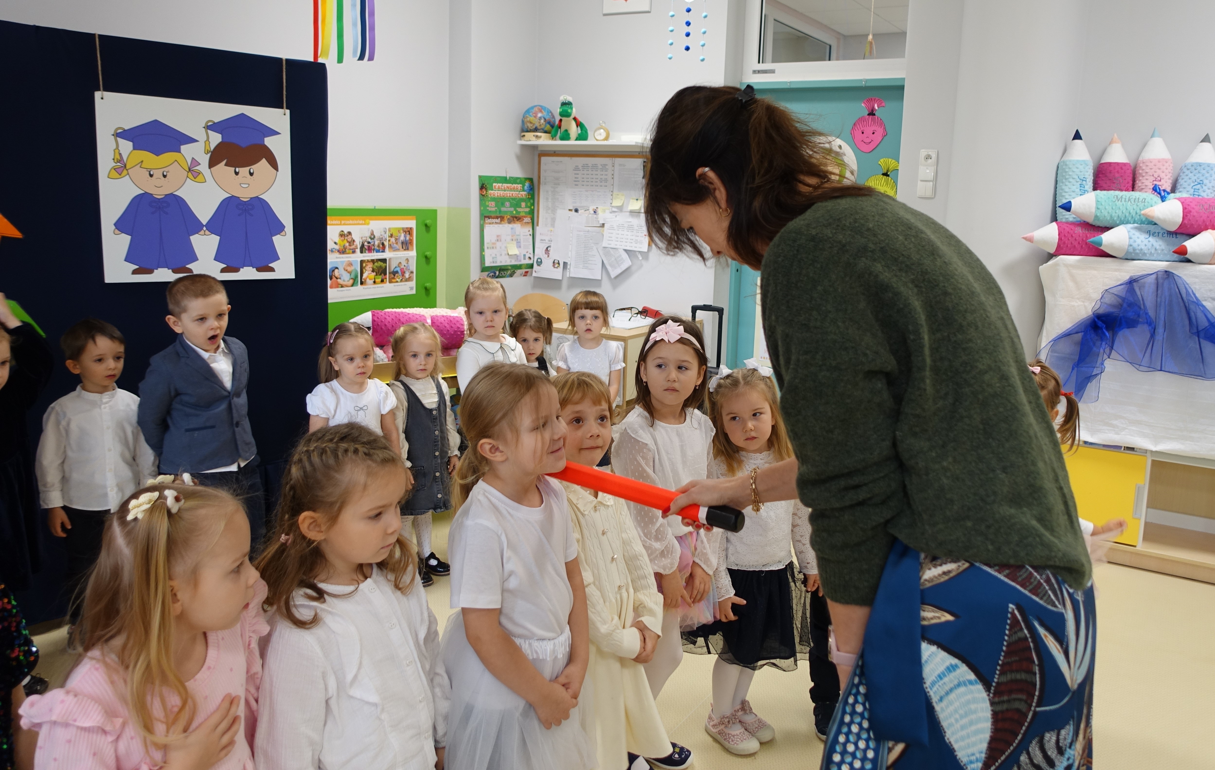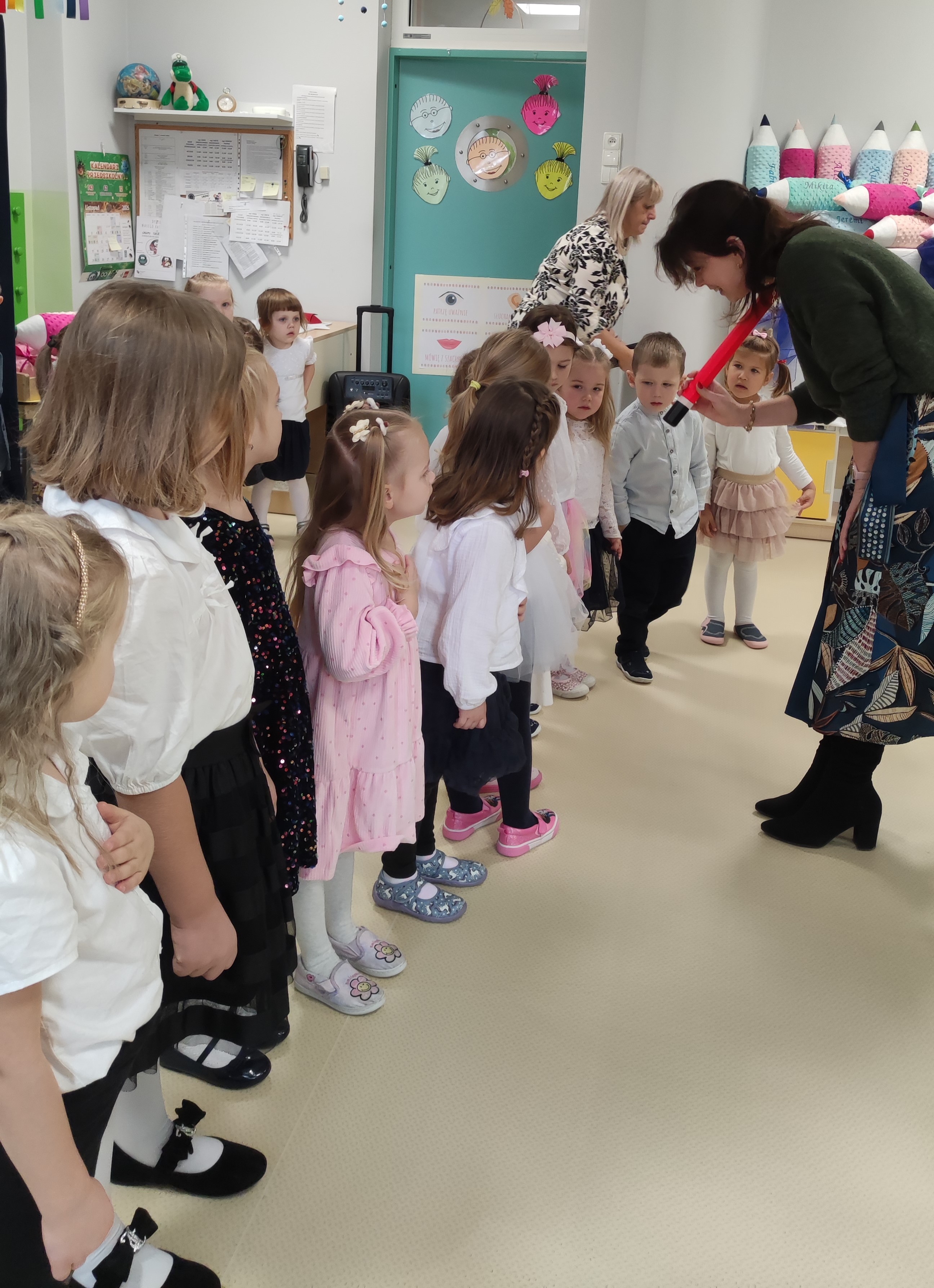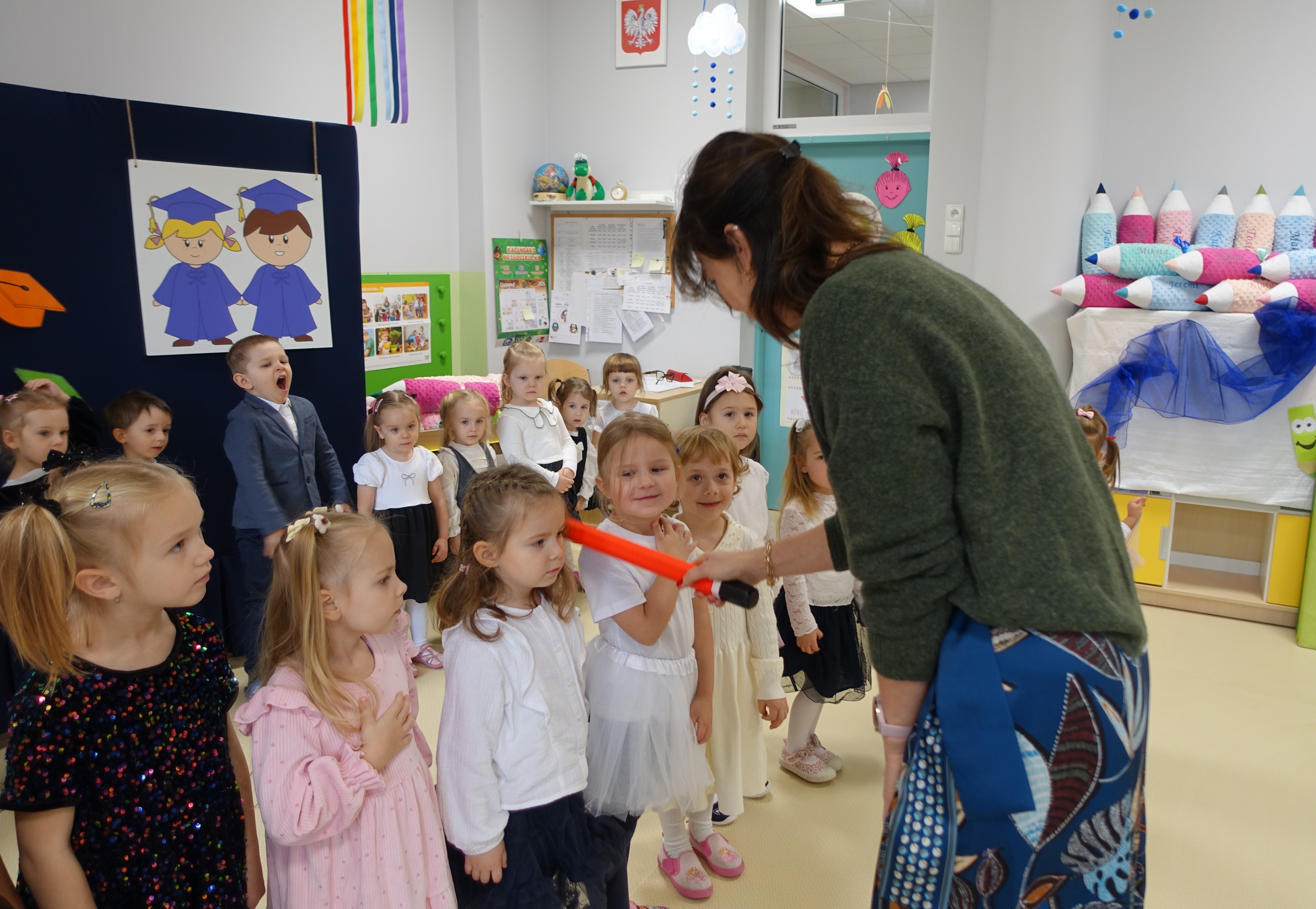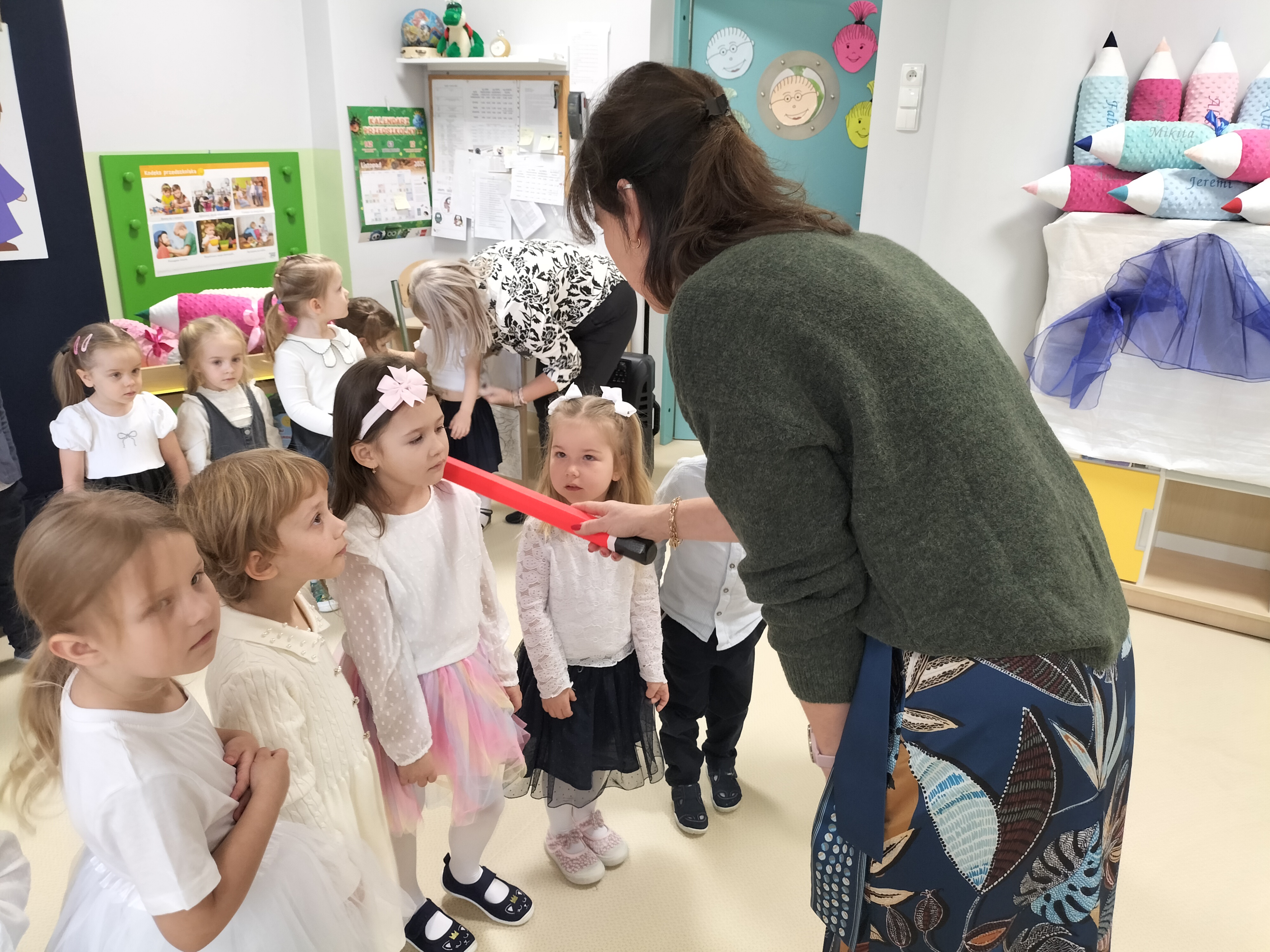 Kulminacyjnym momentem wydarzenia było pasowanie symboliczną kredką, którego dokonała Pani Dyrektor. Tego wyjątkowego zaszczytu dostąpiły wszystkie dzieci uczęszczające do naszego przedszkola od września tego roku, oficjalnie wstępując tym samym do społeczności przedszkolnej.