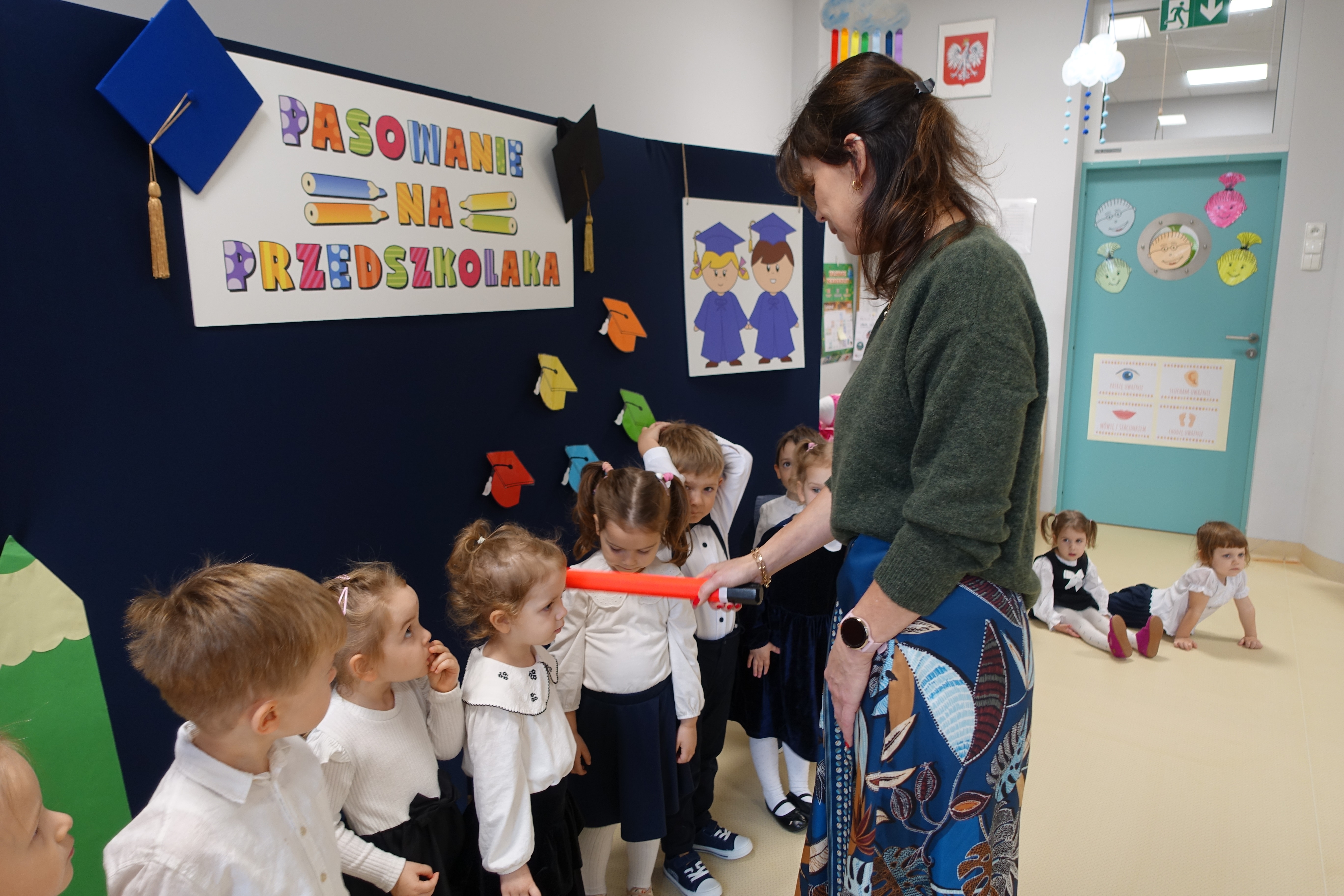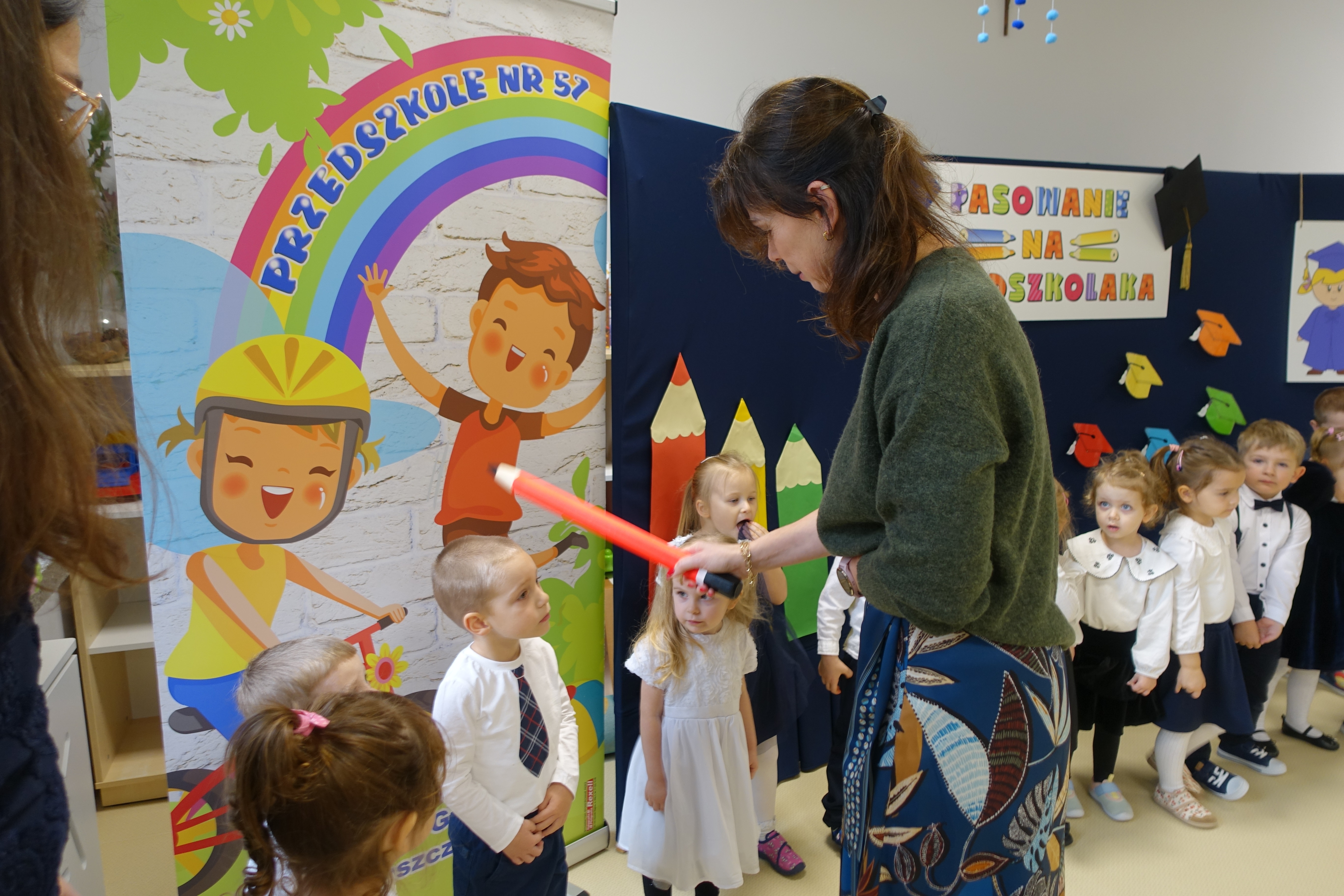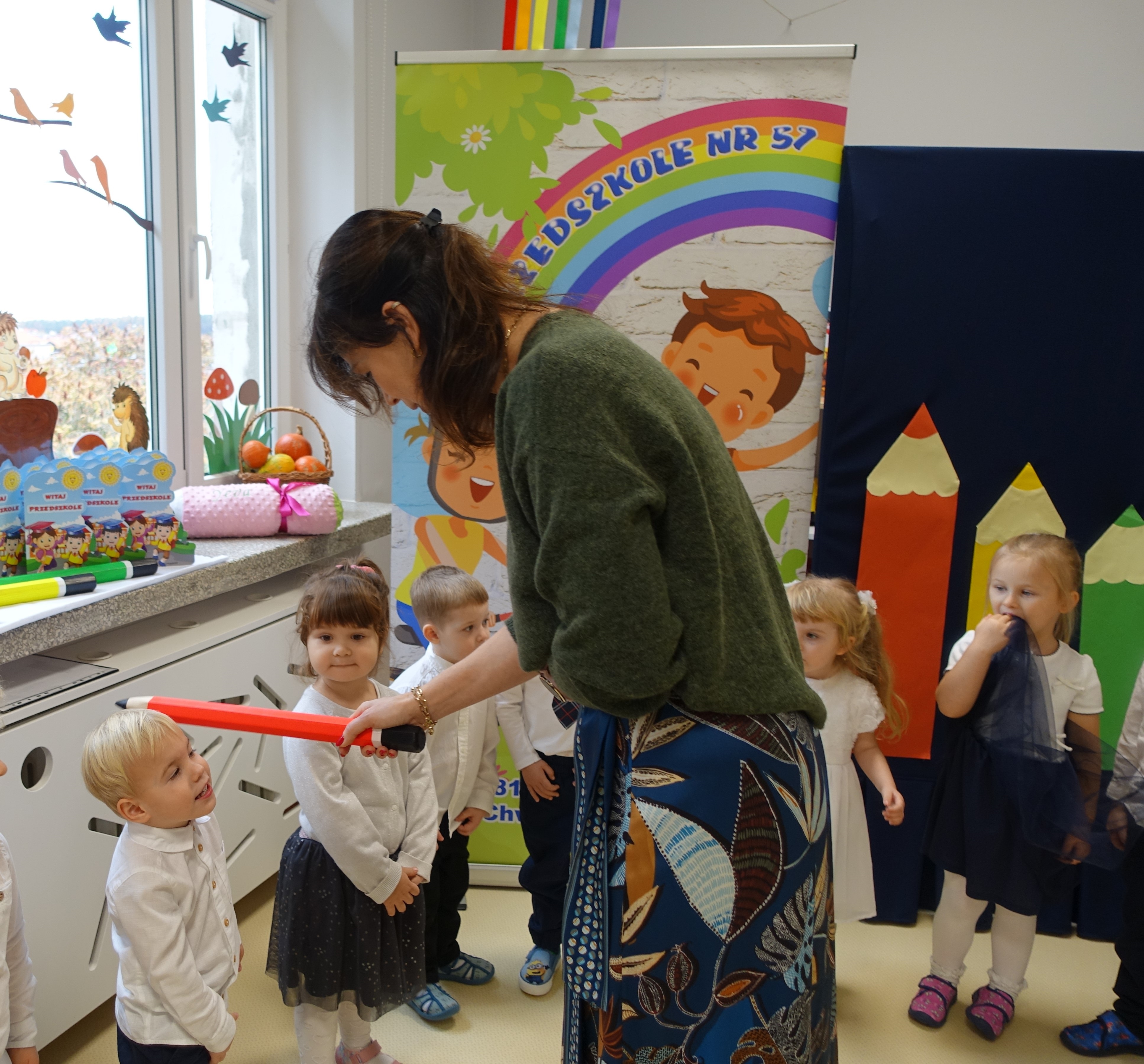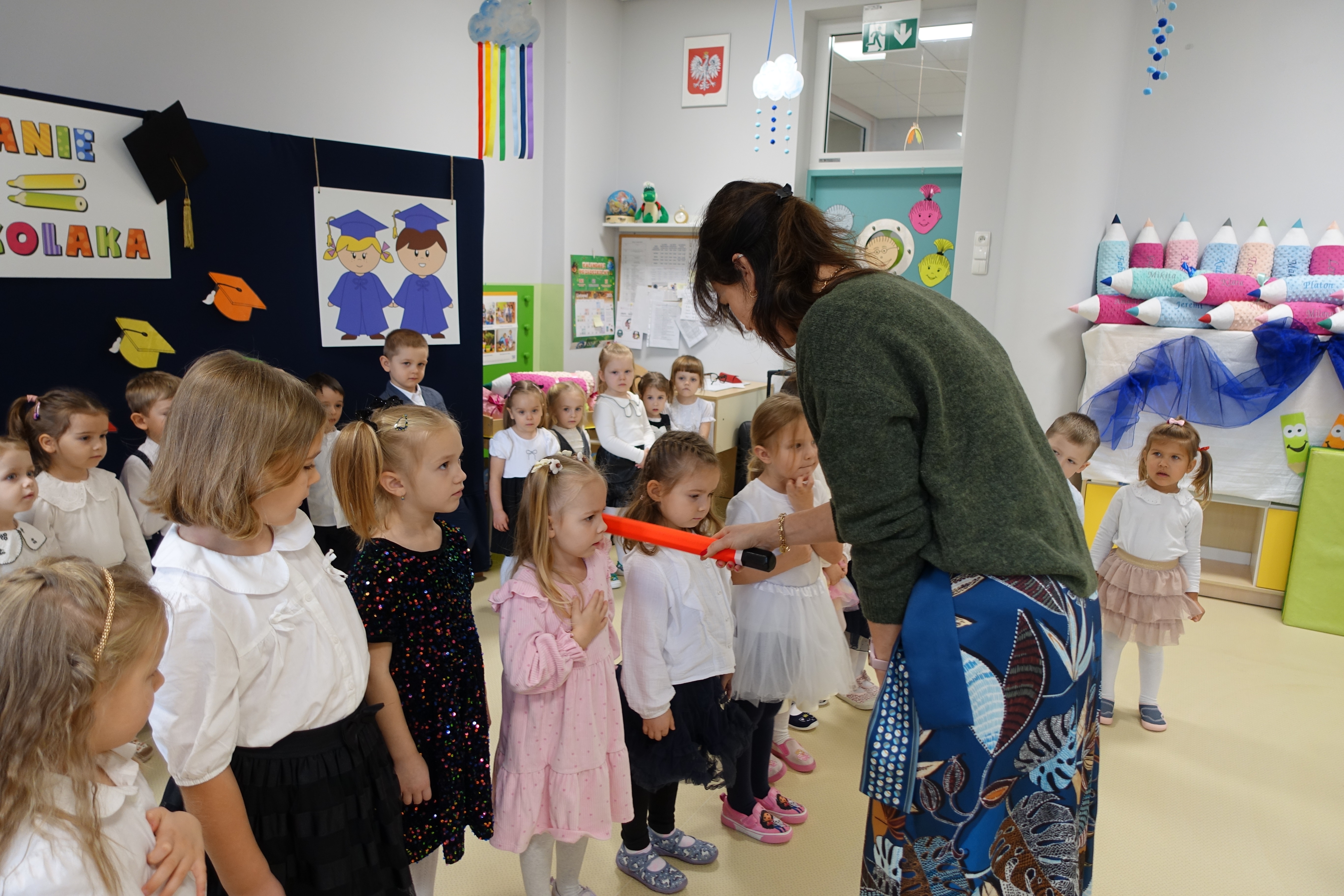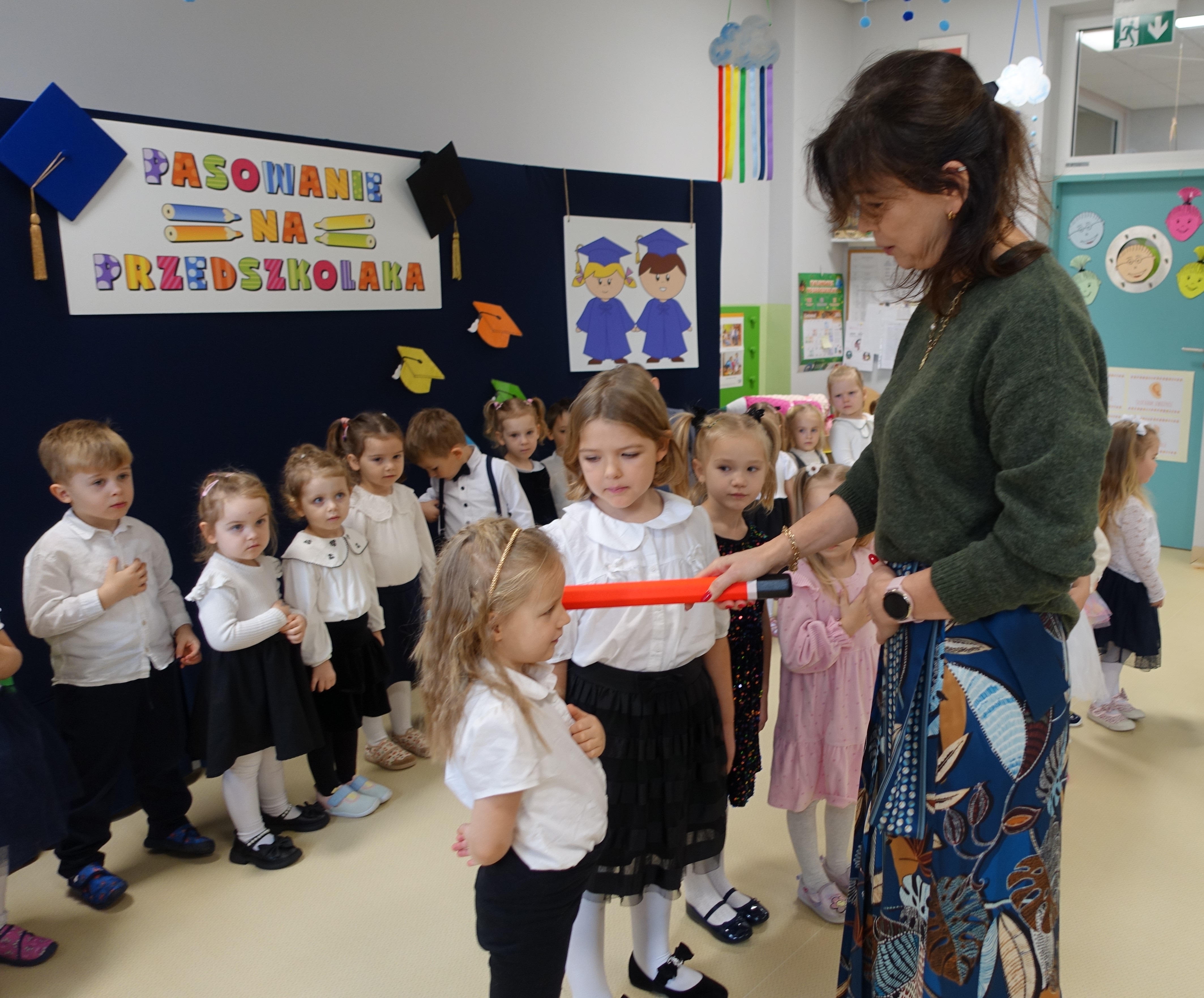 Kulminacyjnym momentem wydarzenia było pasowanie symboliczną kredką, którego dokonała Pani Dyrektor. Tego wyjątkowego zaszczytu dostąpiły wszystkie dzieci uczęszczające do naszego przedszkola od września tego roku, oficjalnie wstępując tym samym do społeczności przedszkolnej.