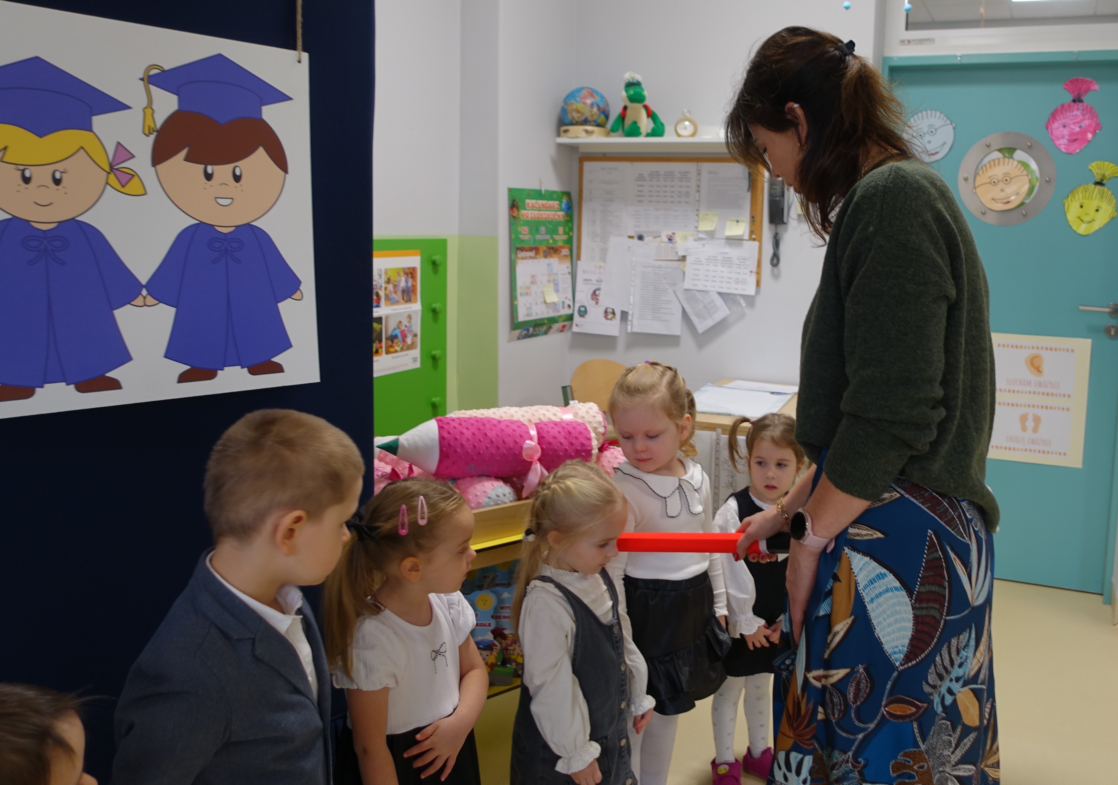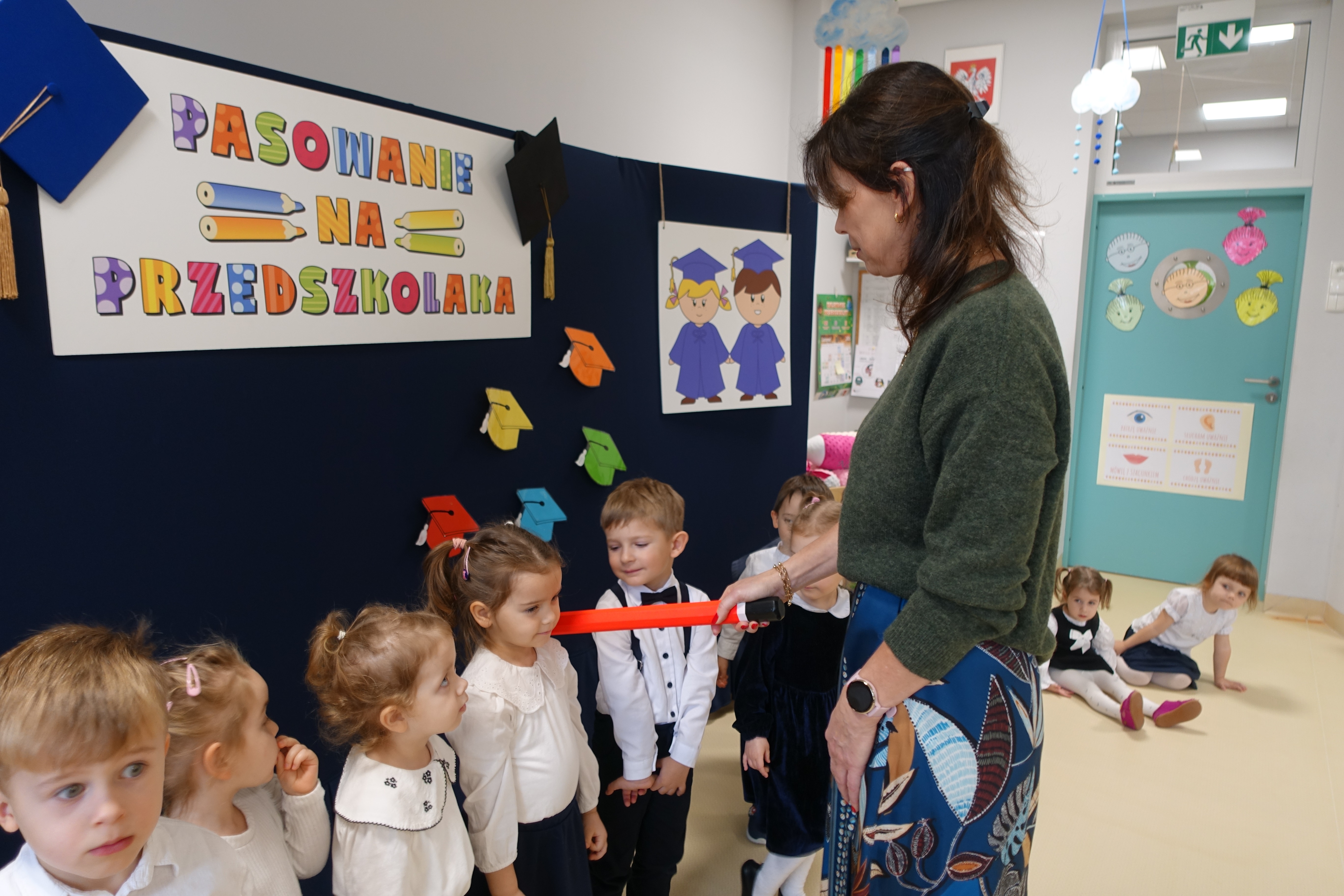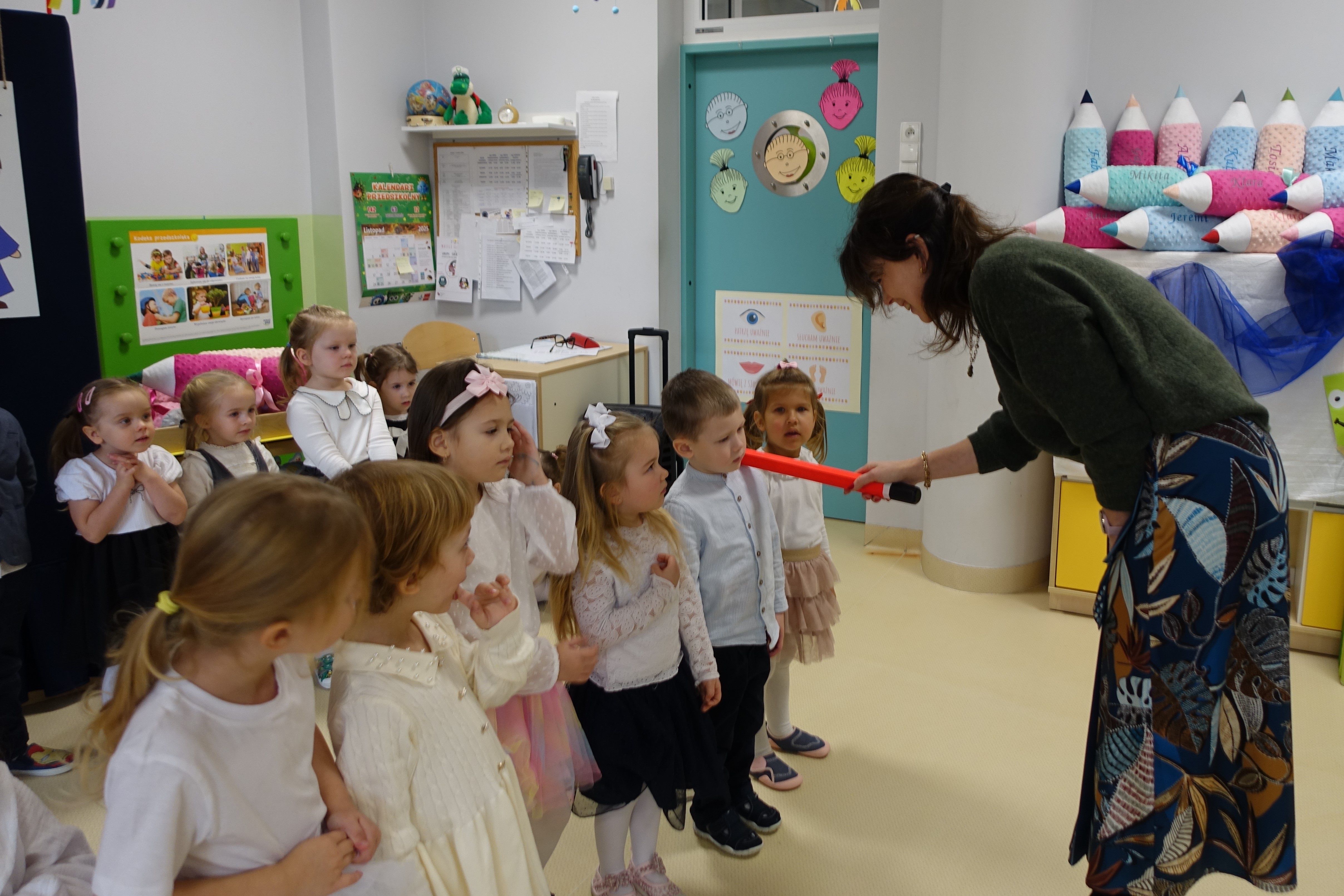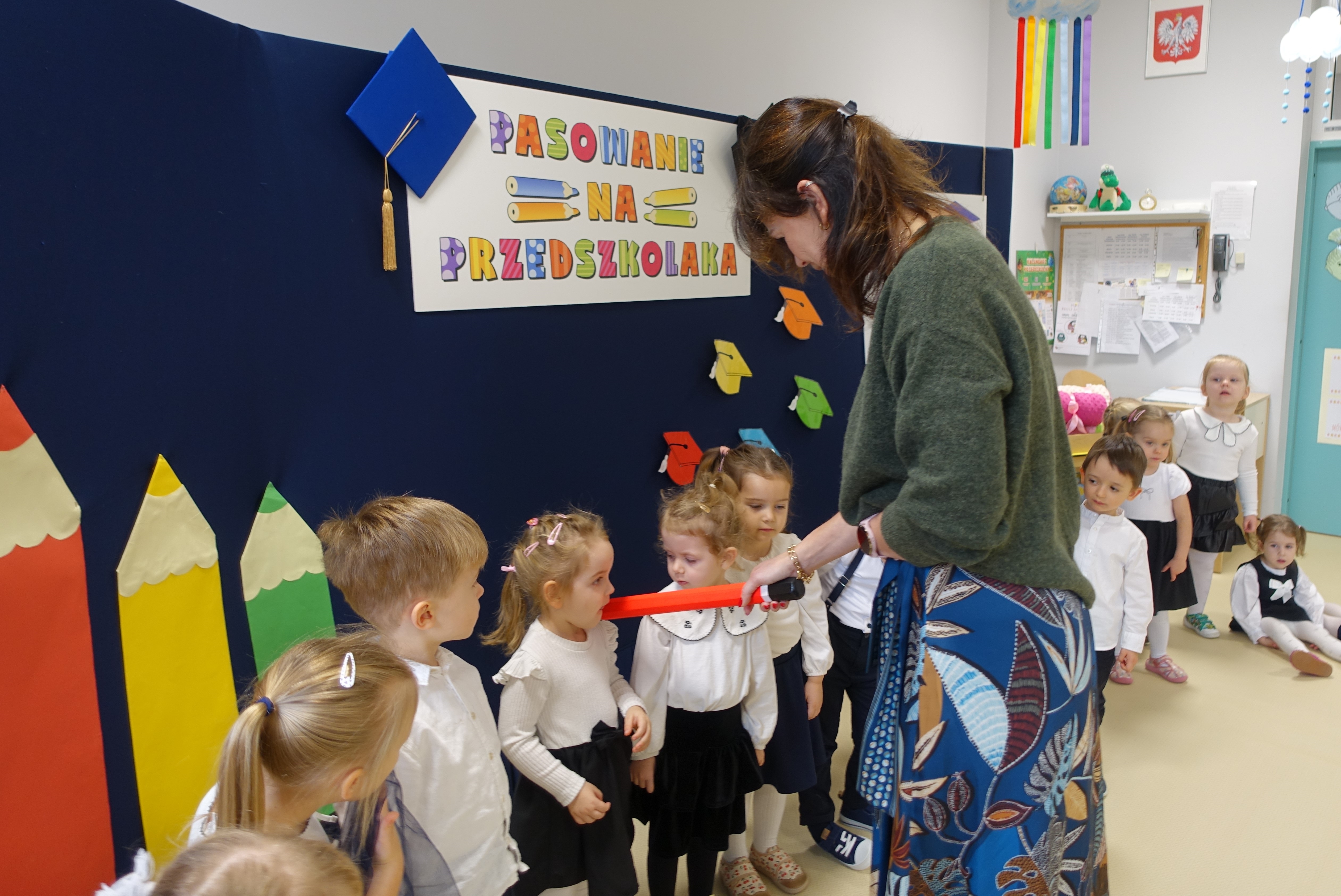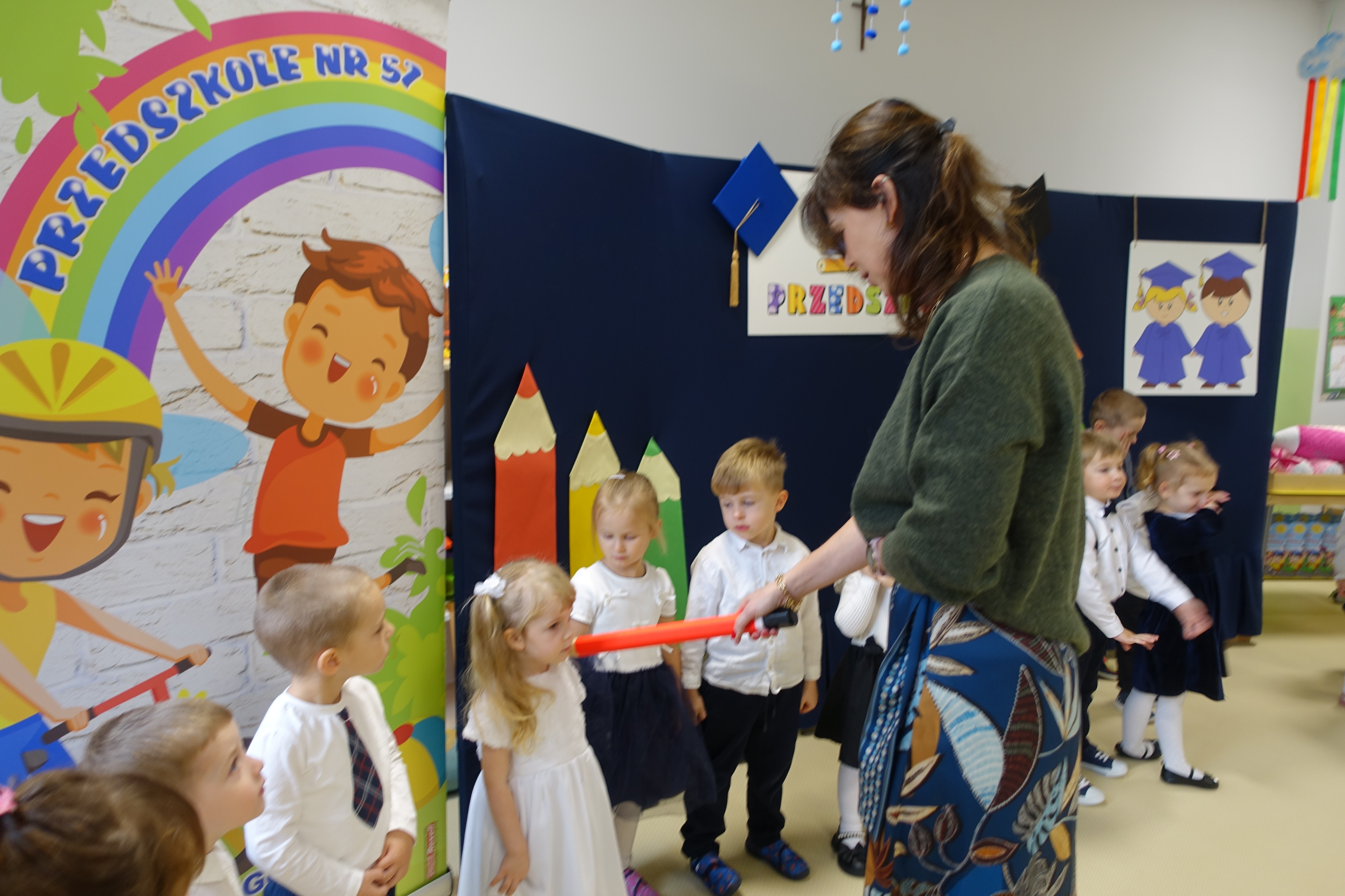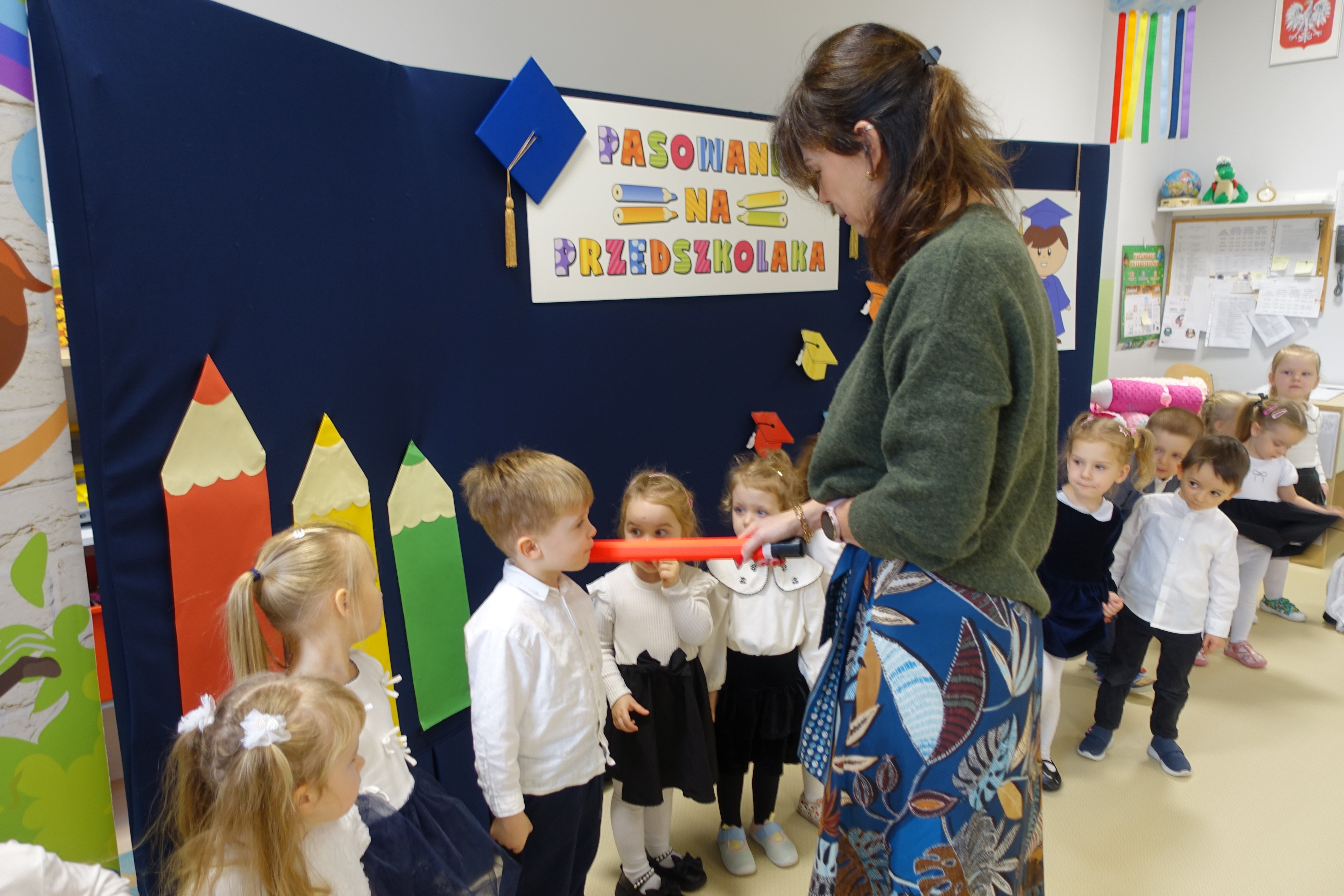 Kulminacyjnym momentem wydarzenia było pasowanie symboliczną kredką, którego dokonała Pani Dyrektor. Tego wyjątkowego zaszczytu dostąpiły wszystkie dzieci uczęszczające do naszego przedszkola od września tego roku, oficjalnie wstępując tym samym do społeczności przedszkolnej.