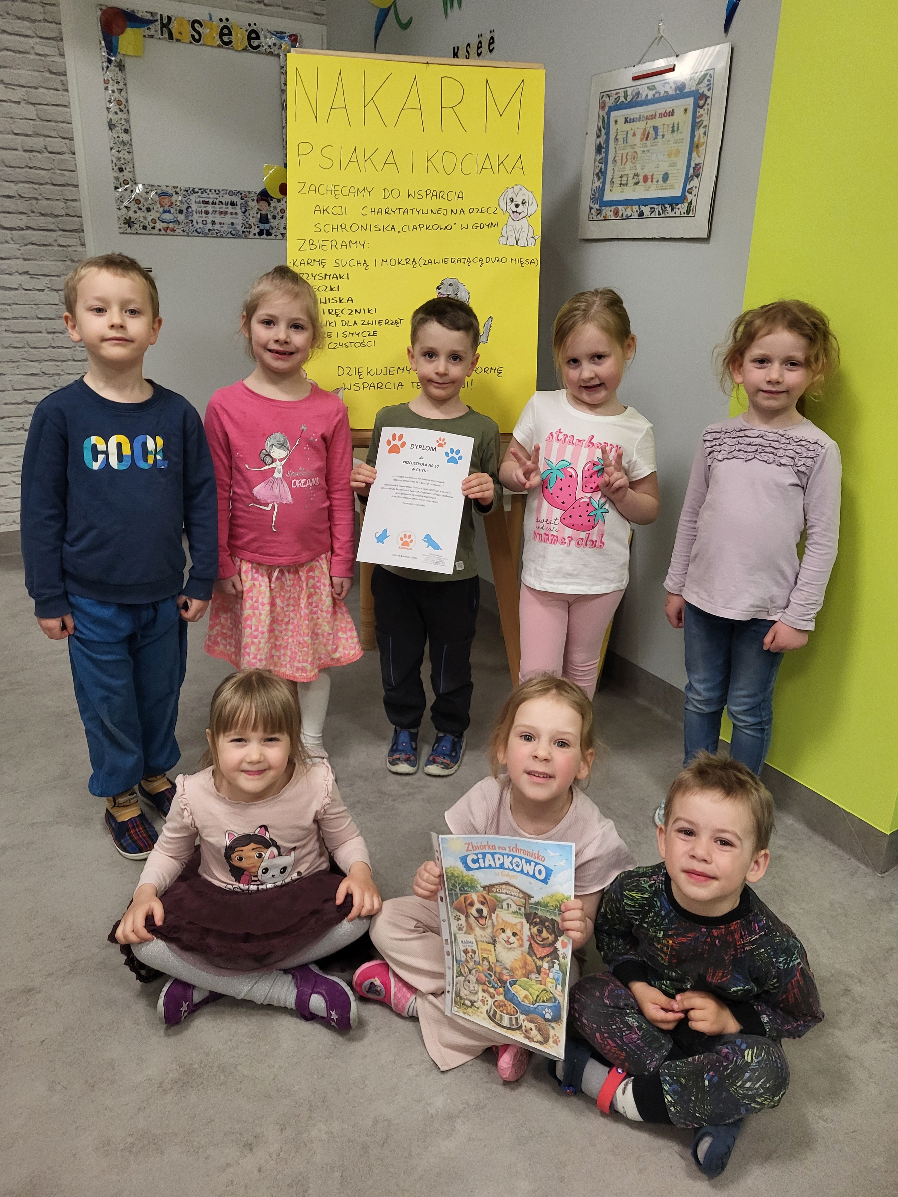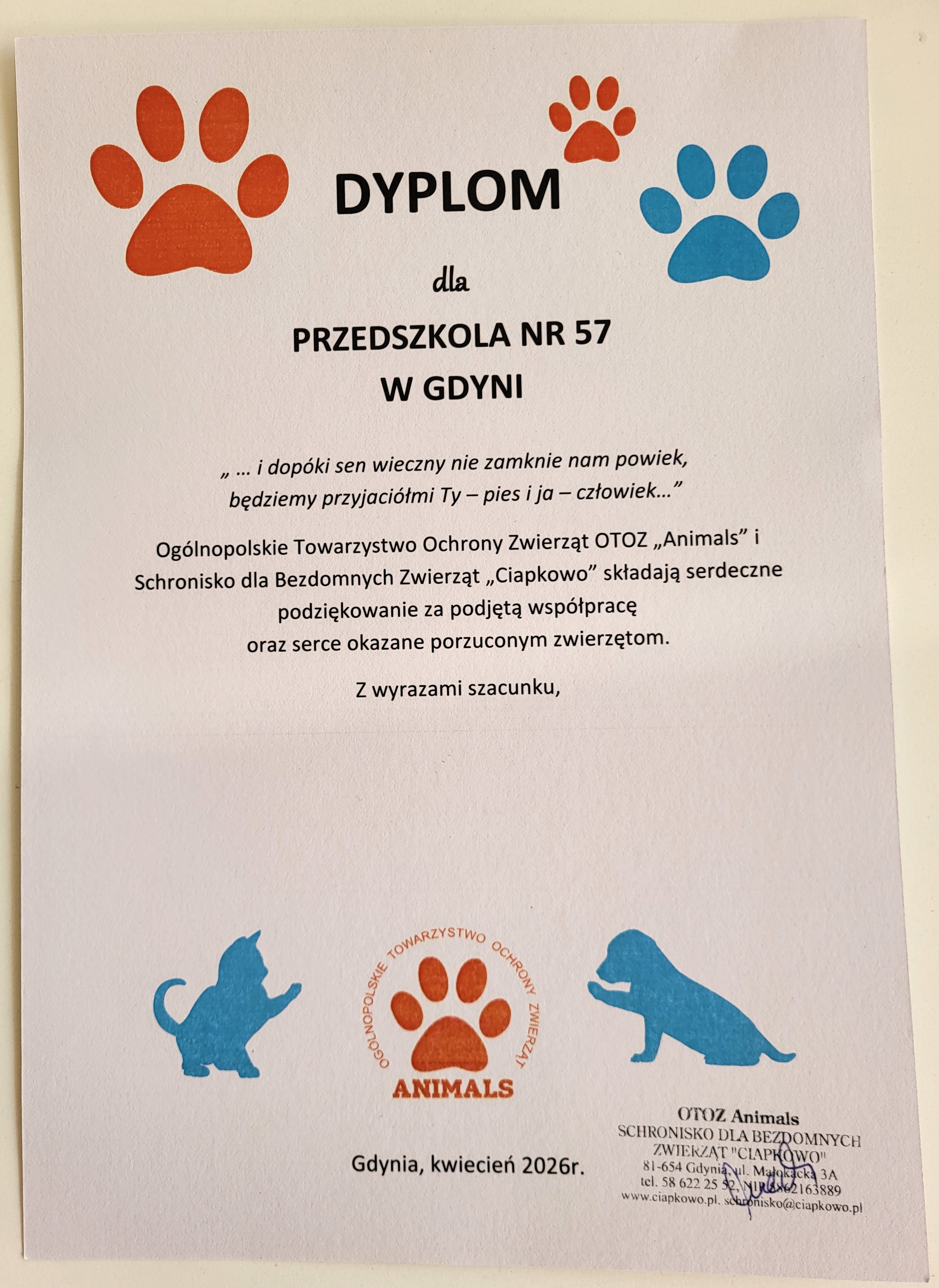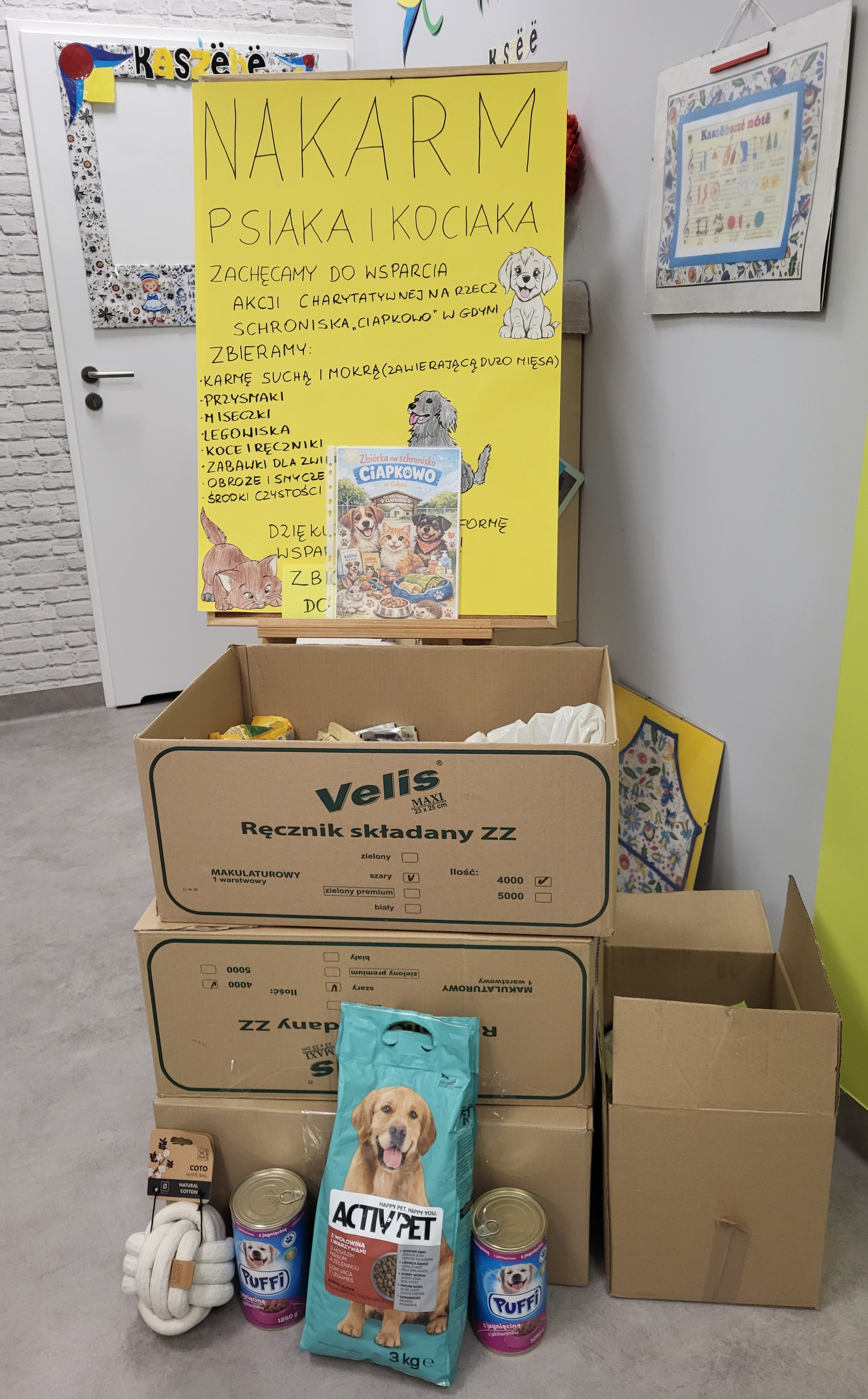 Składamy serdeczne podziękowania rodzicom i dzieciom, którzy włączyli się do zbiórki na rzecz schroniska "Ciapkowo" w Gdyni. Zgromadziliśmy duże ilości karmy, zabawek i innych akcesoriów, które zostały przekazane do schroniska. Celem tych działań było wzmacnianie poczucia empatii, prawidłowych postaw społecznych oraz chęci do dzielenia się z potrzebującymi.