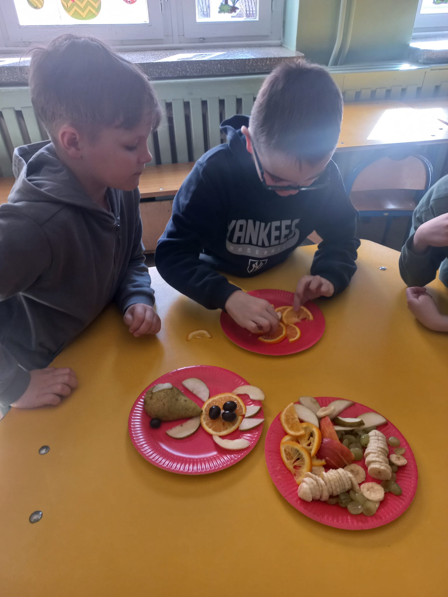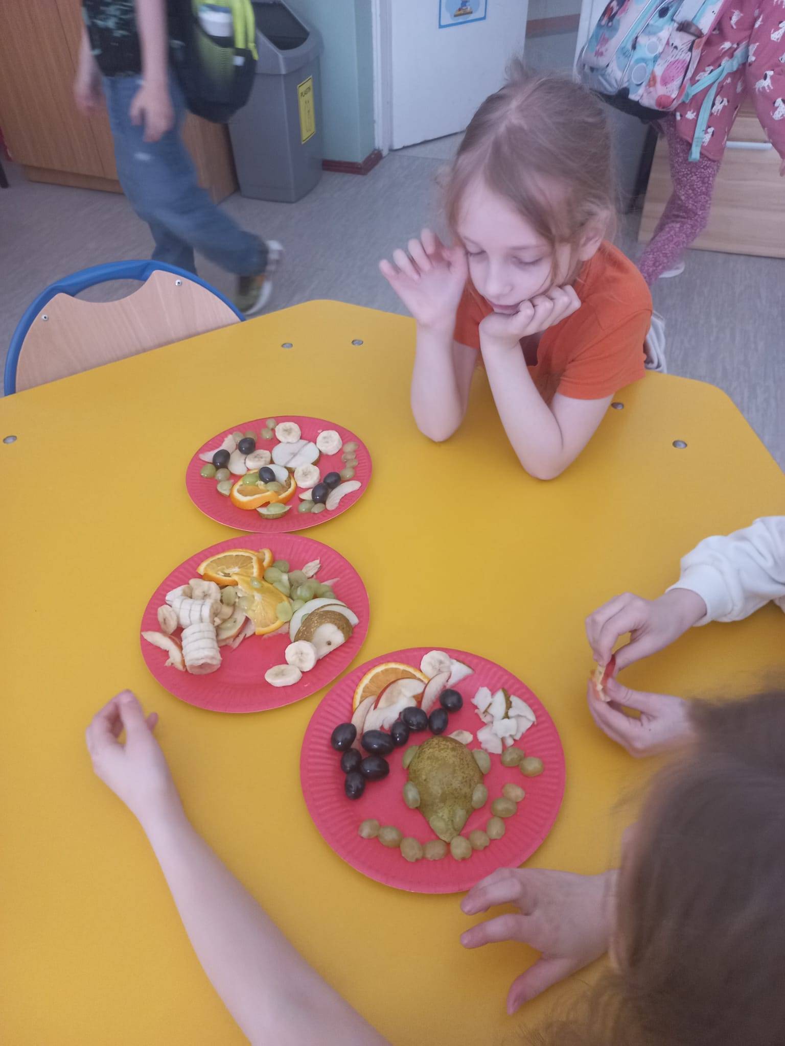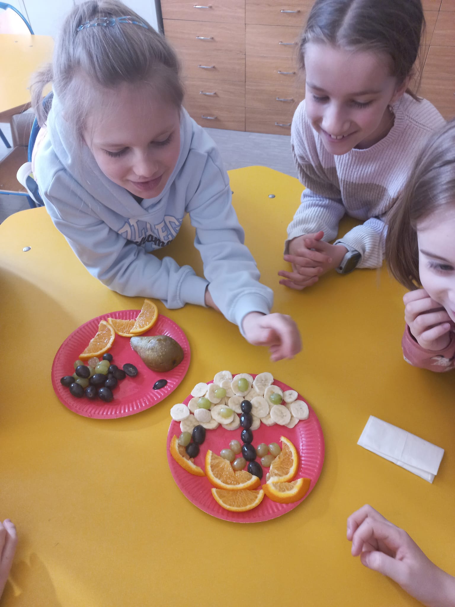 Z tej okazji gościliśmy w świetlicy szkolnej szefową kuchni i panią kucharkę, które opowiedziały dzieciom o sposobie przygotowania zbilansowanych posiłków w szkole i programie „Owoce i warzywa w szkole”. Rozmawialiśmy także na temat znaczenia warzyw i owoców w diecie. Następnie dzieci wykonały owocowe kompozycje na talerzu.