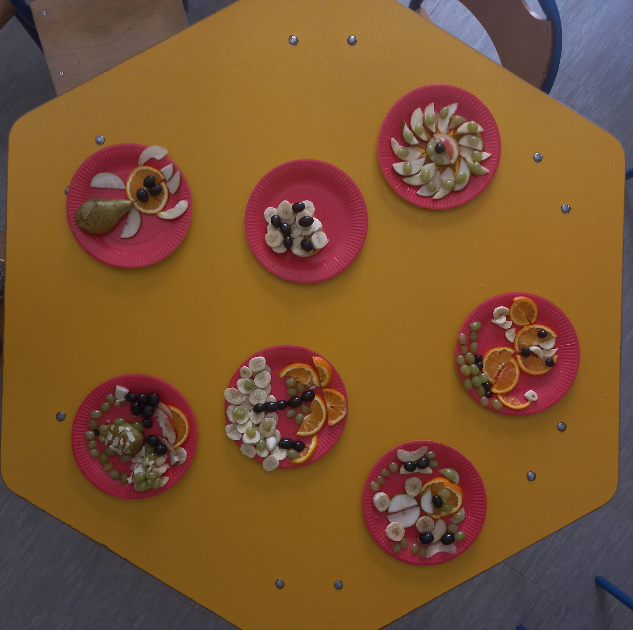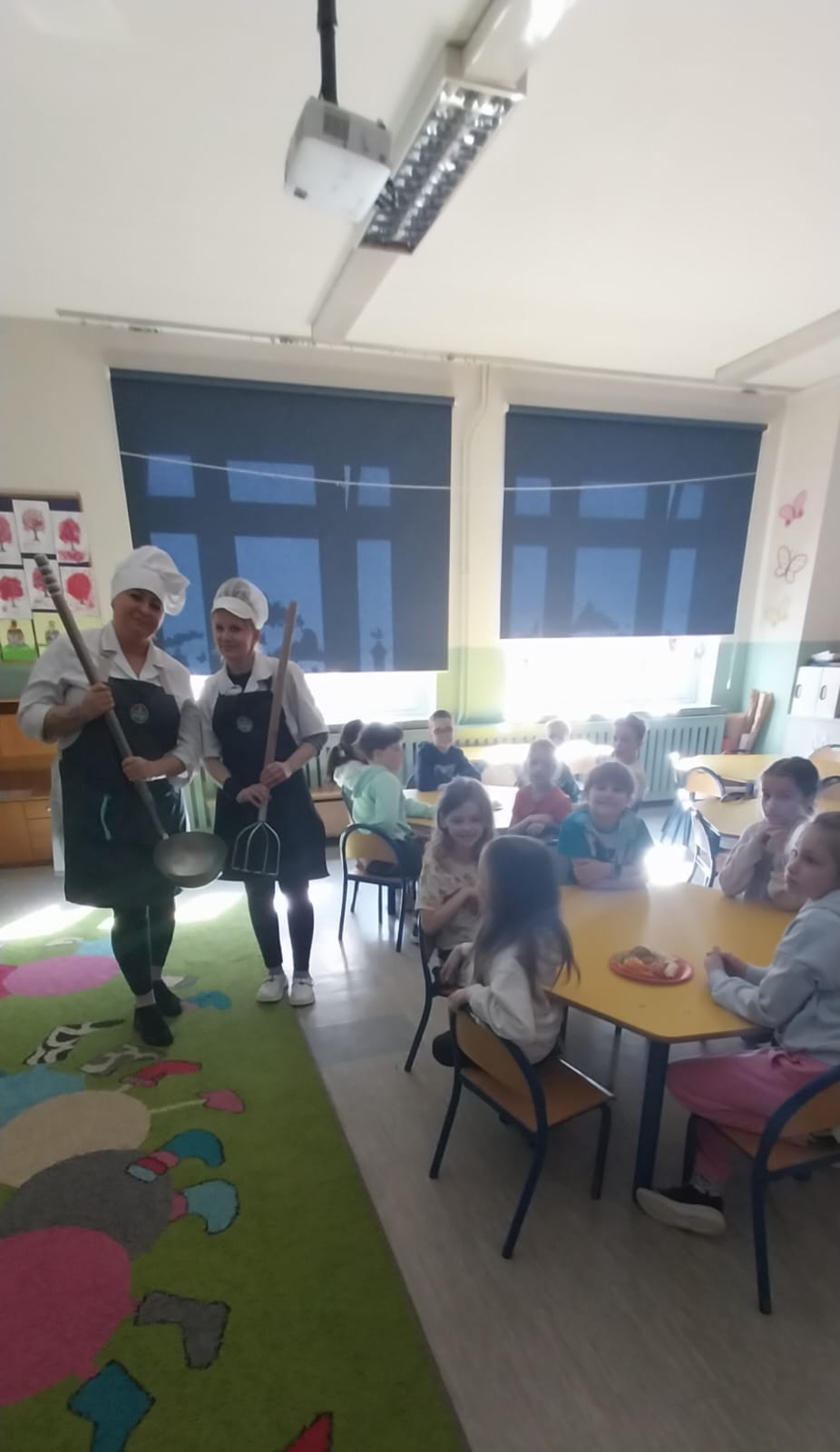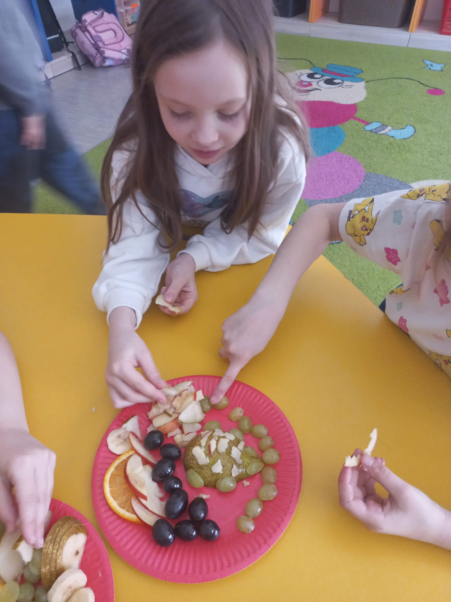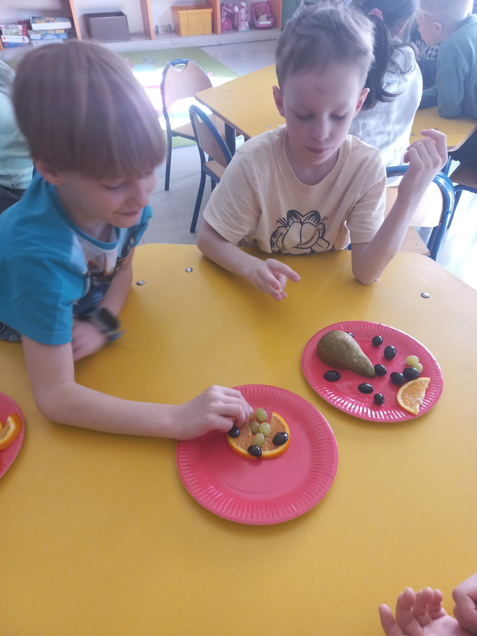 Z tej okazji gościliśmy w świetlicy szkolnej szefową kuchni i panią kucharkę, które opowiedziały dzieciom o sposobie przygotowania zbilansowanych posiłków w szkole i programie „Owoce i warzywa w szkole”. Rozmawialiśmy także na temat znaczenia warzyw i owoców w diecie. Następnie dzieci wykonały owocowe kompozycje na talerzu.