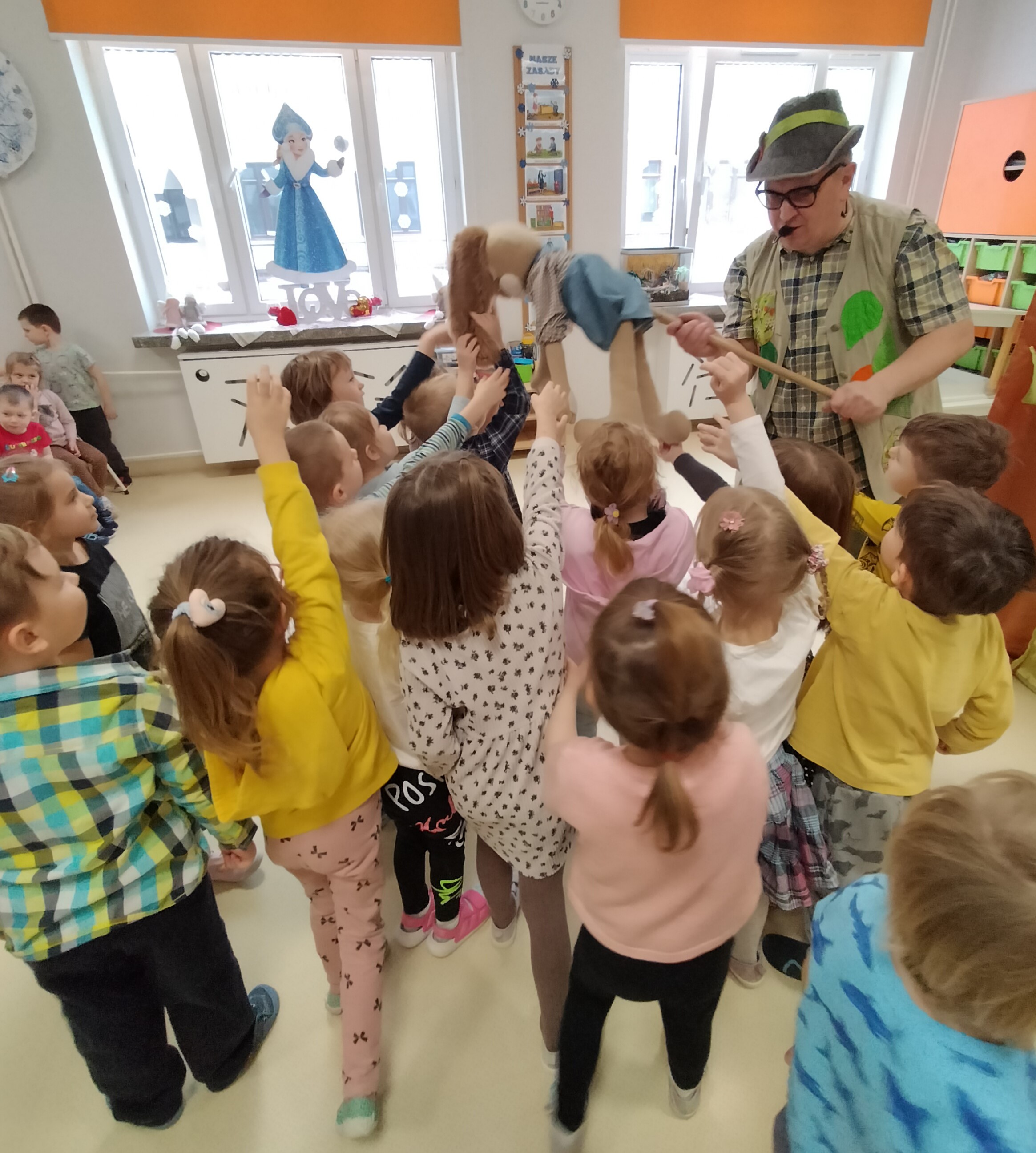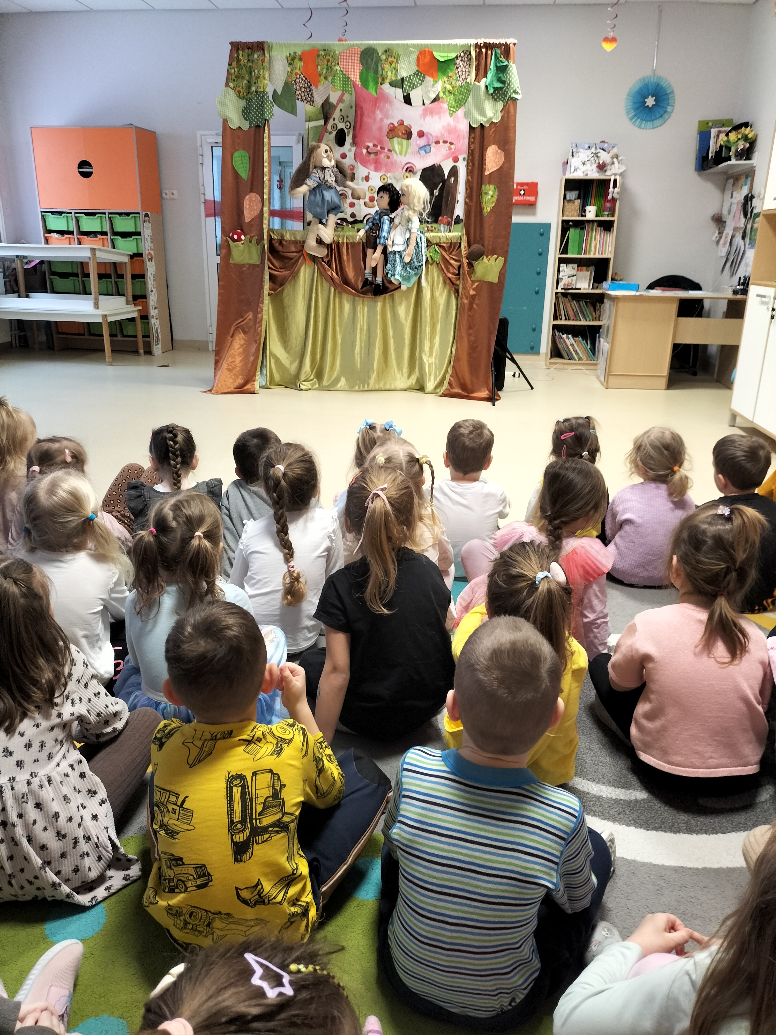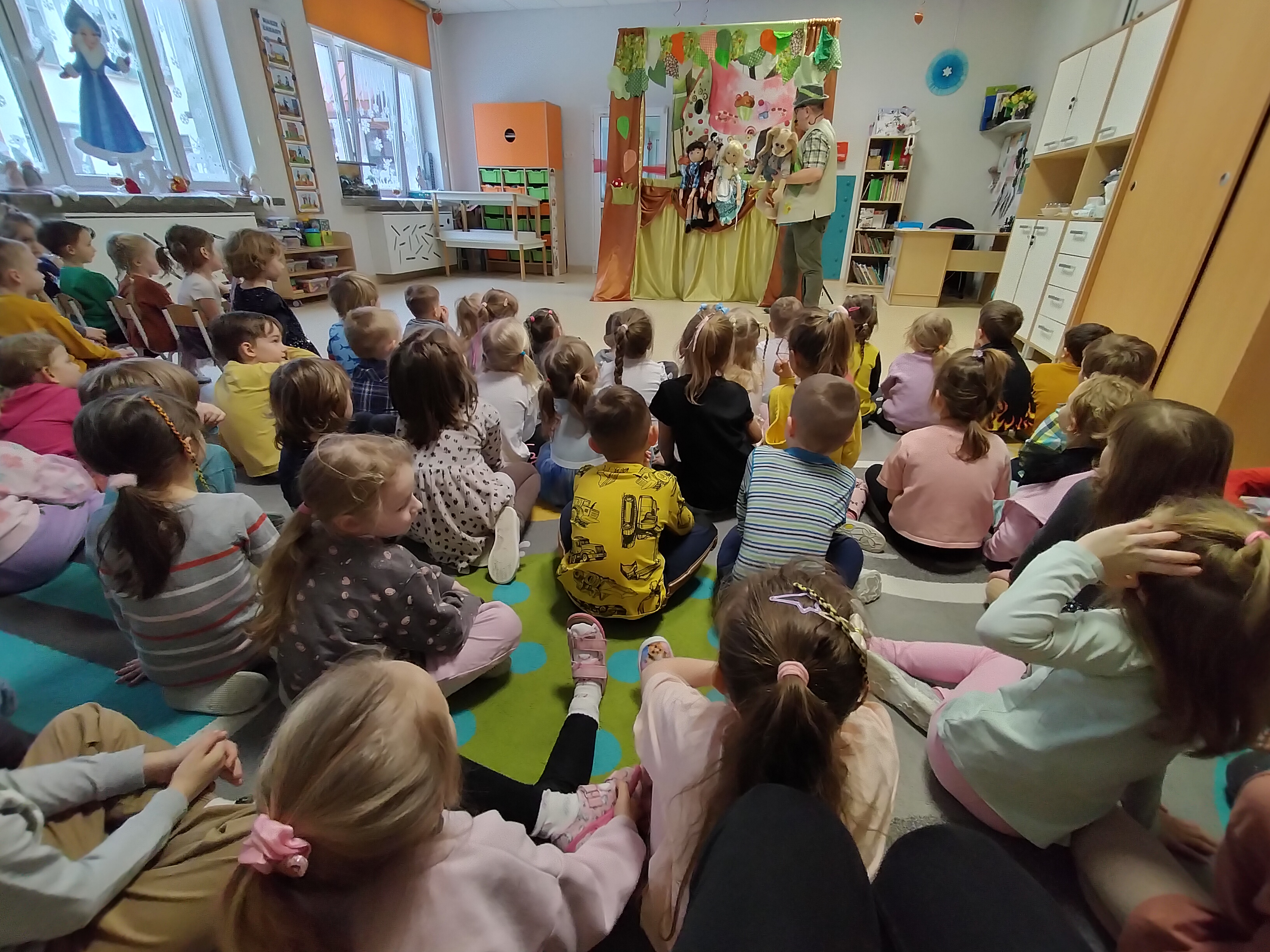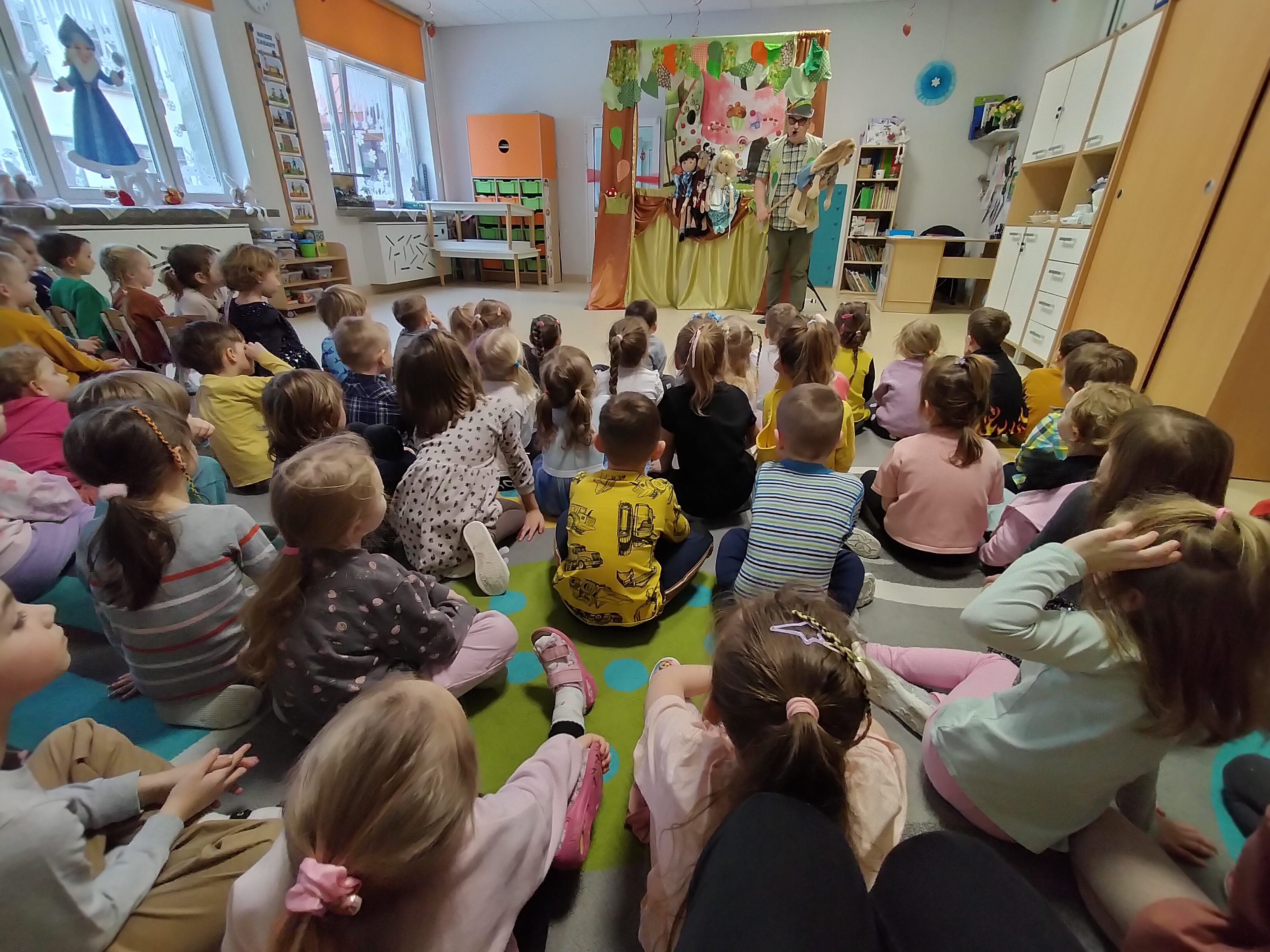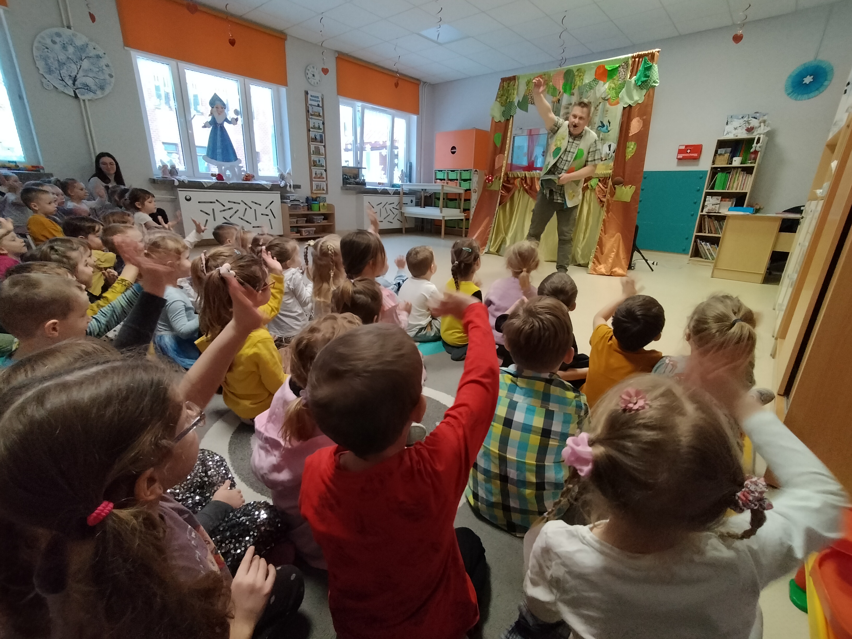 Poniedziałkowy ranek był pełen emocji i radości za sprawą występu Teatru LOKOMOTYWA. Dzieci miały okazję obejrzeć teatrzyk kukiełkowy „Jaś i Małgosia”, który od pierwszych chwil wprowadził je w niezwykły, leśny świat przygód.