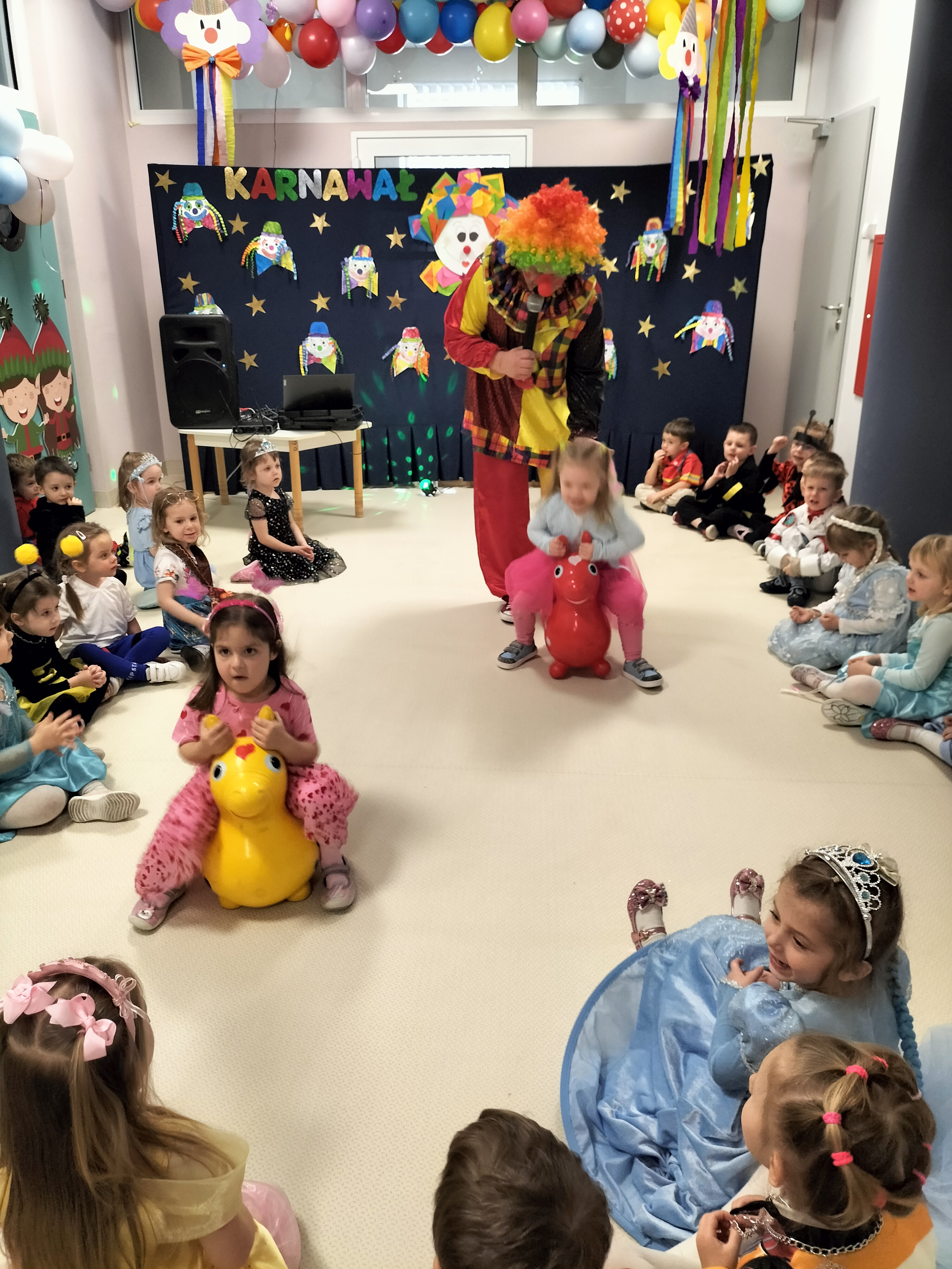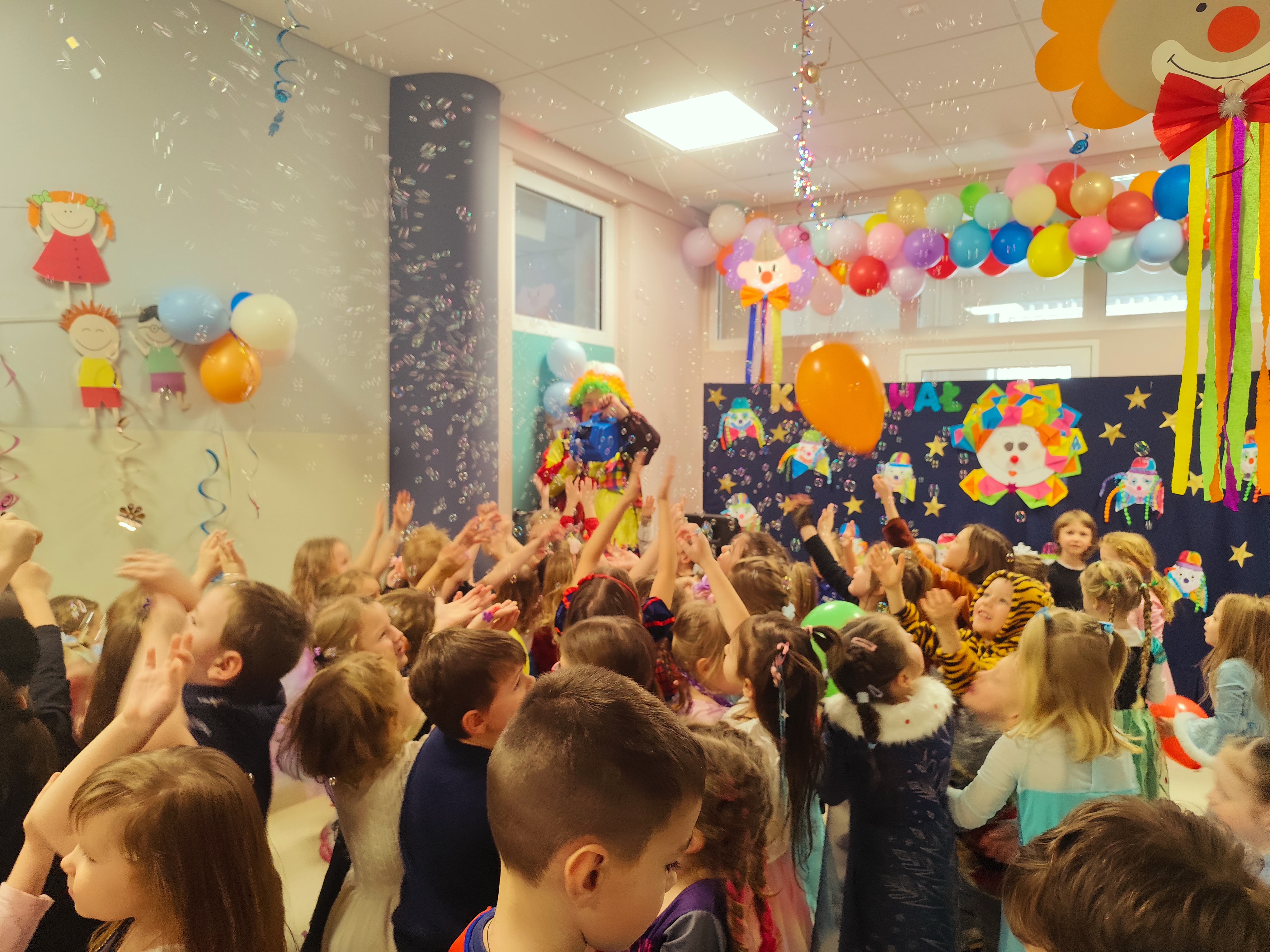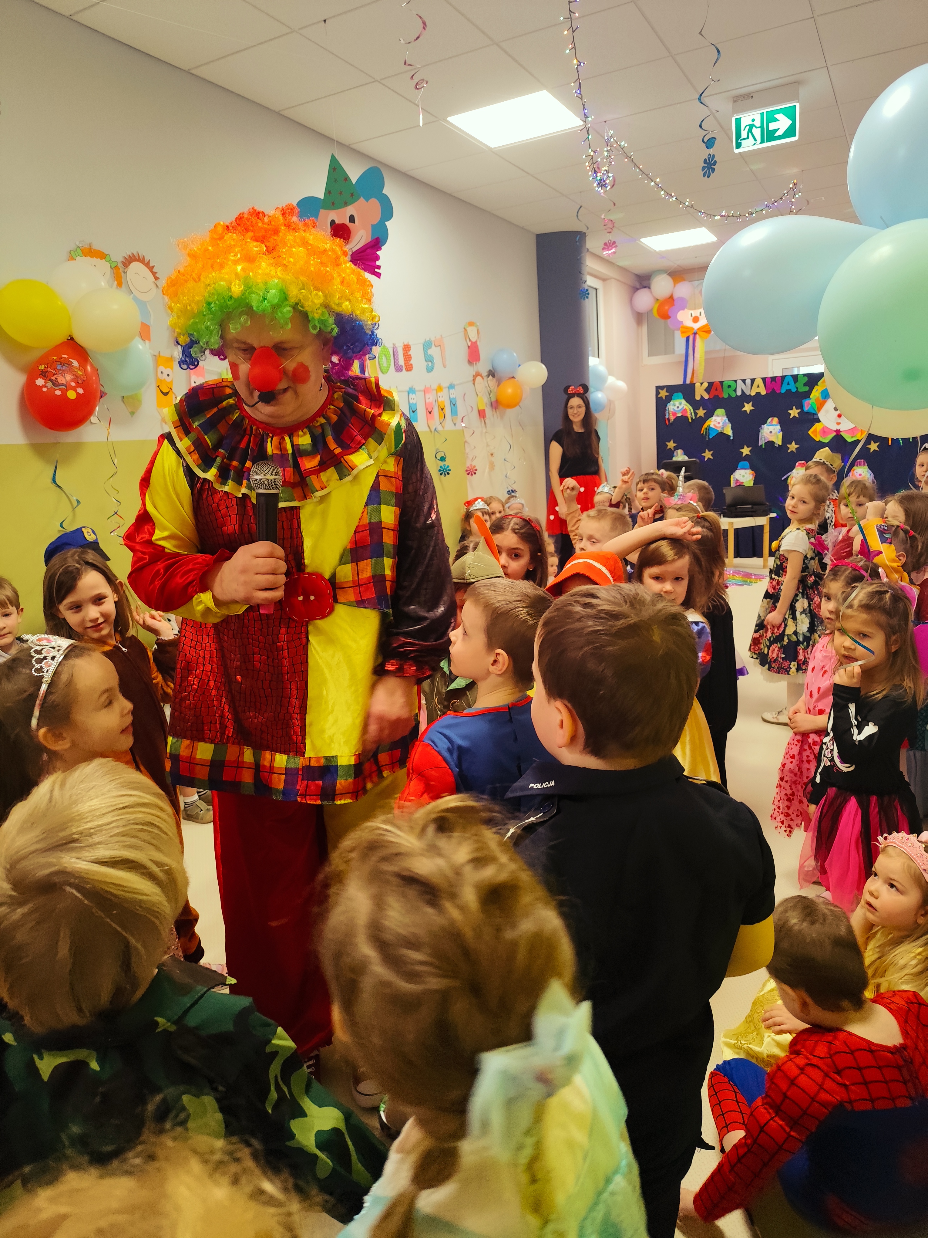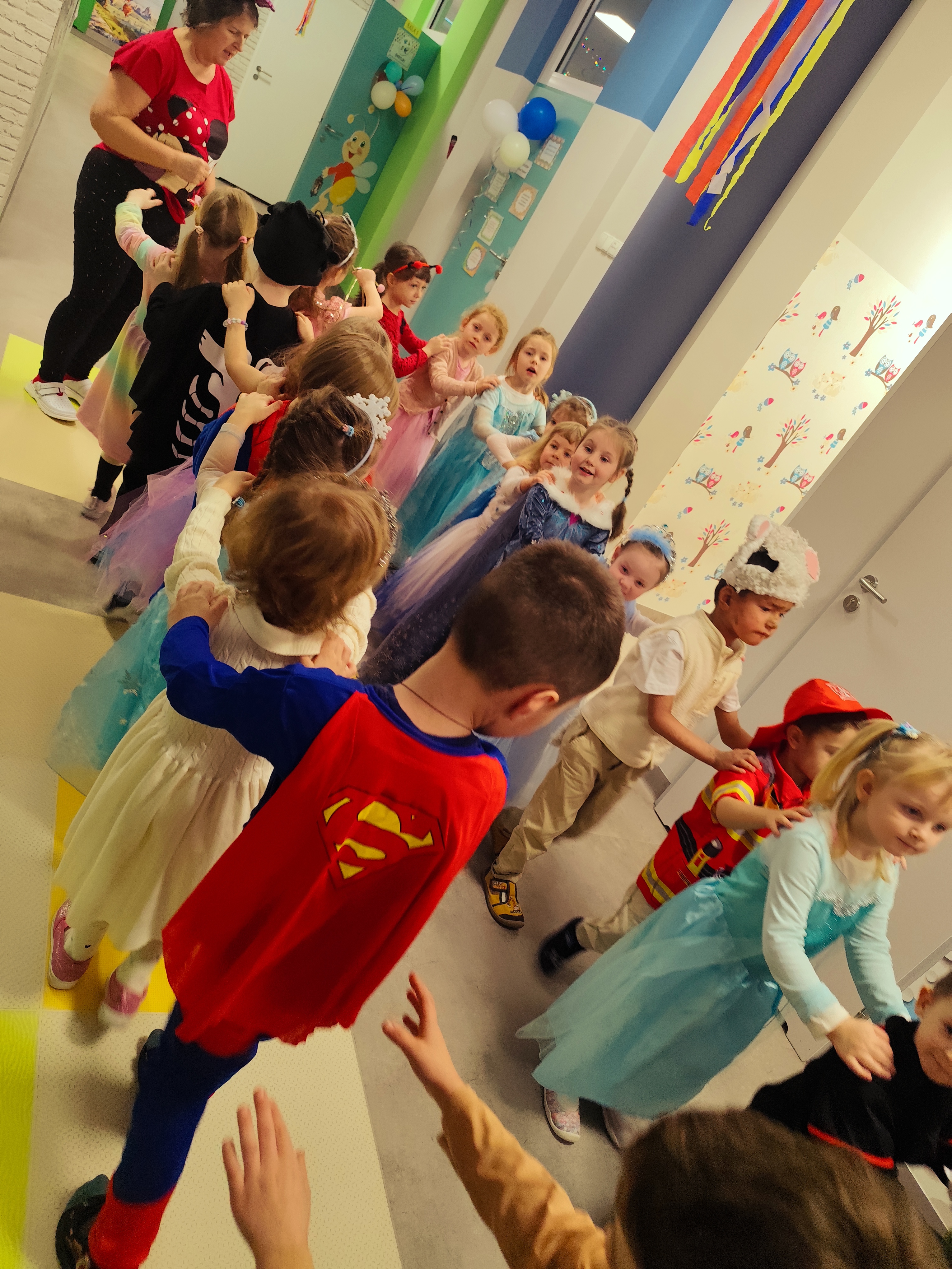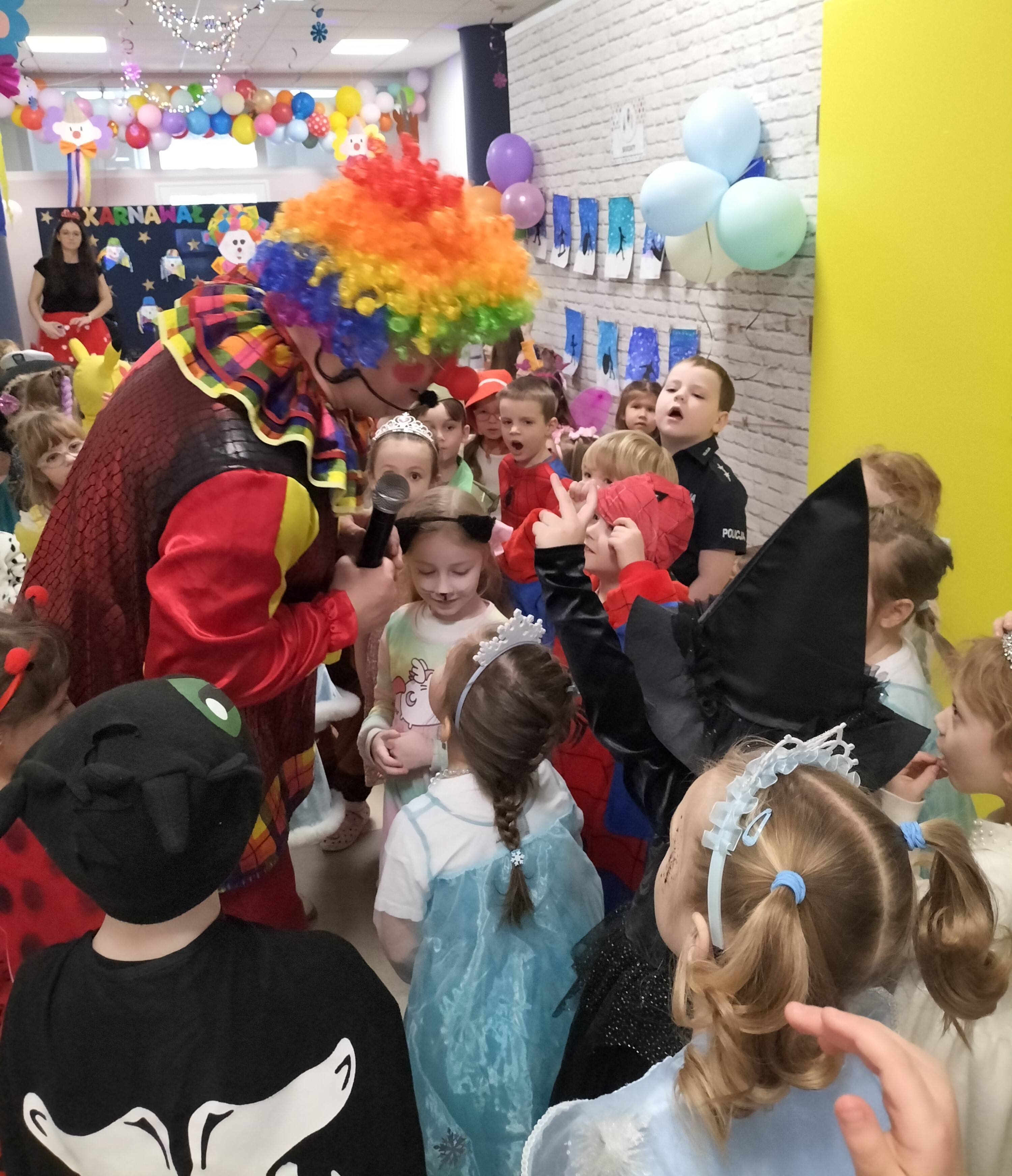 W poniedziałek, 9 lutego, w naszym przedszkolu odbył się bal karnawałowy, który przebiegł w radosnej i uroczystej atmosferze. Wydarzenie poprowadził Pan Artur Kochański - Firma Lokomotywa, zapewniając dzieciom bogaty program obejmujący tańce, zabawy integracyjne oraz konkursy. Dużą atrakcją były efektowne bańki mydlane, które dostarczyły uczestnikom wiele radości. W krótkiej przerwie na dzieci czekał poczęstunek.