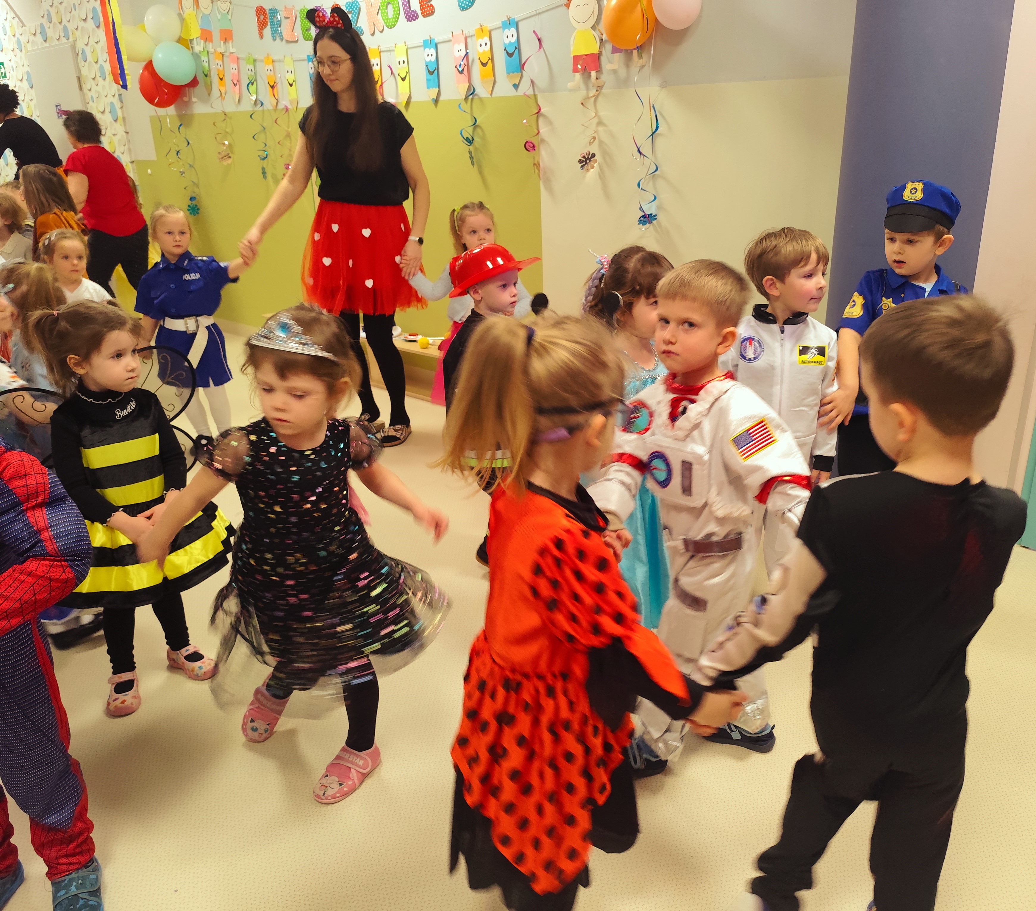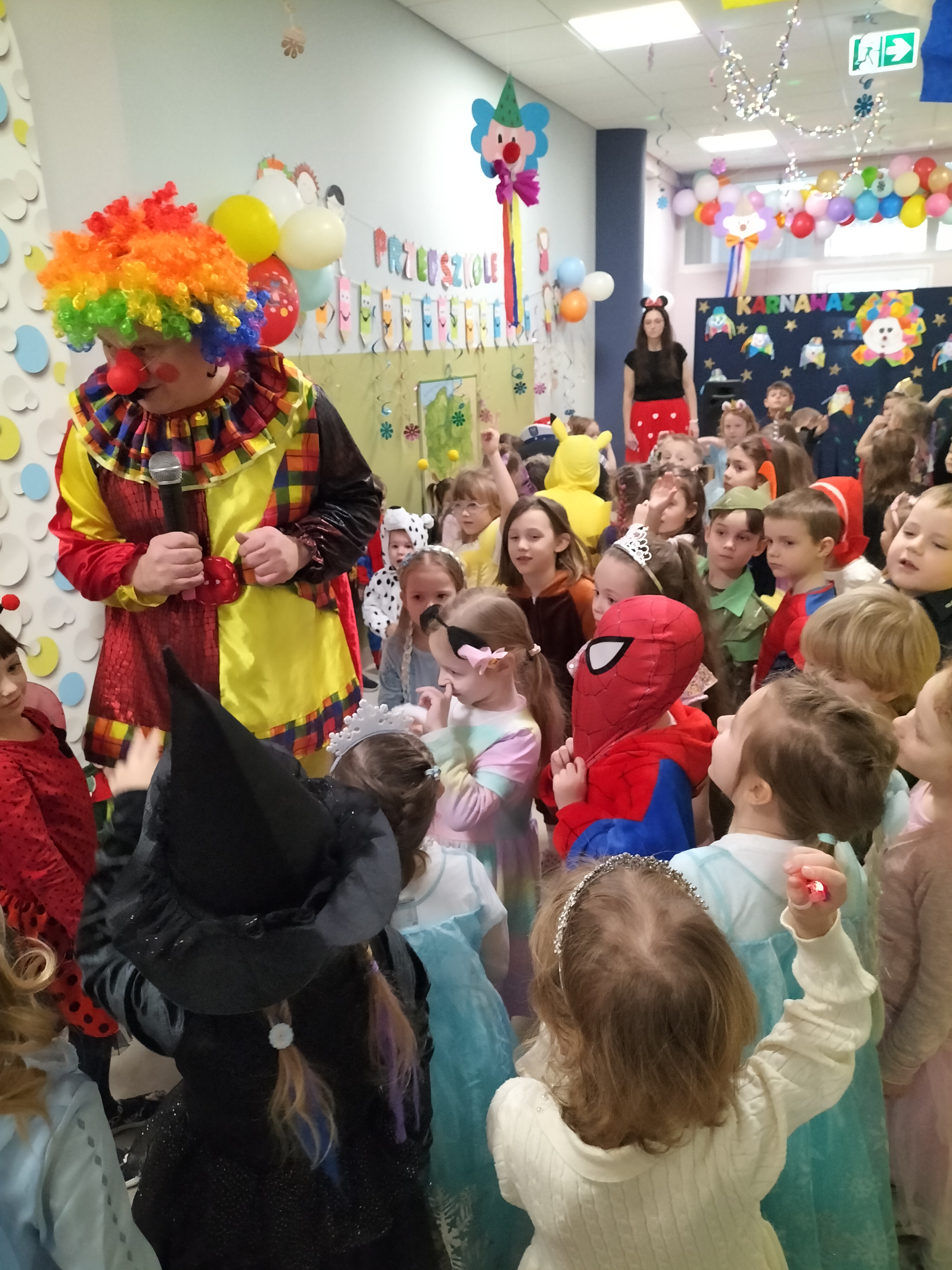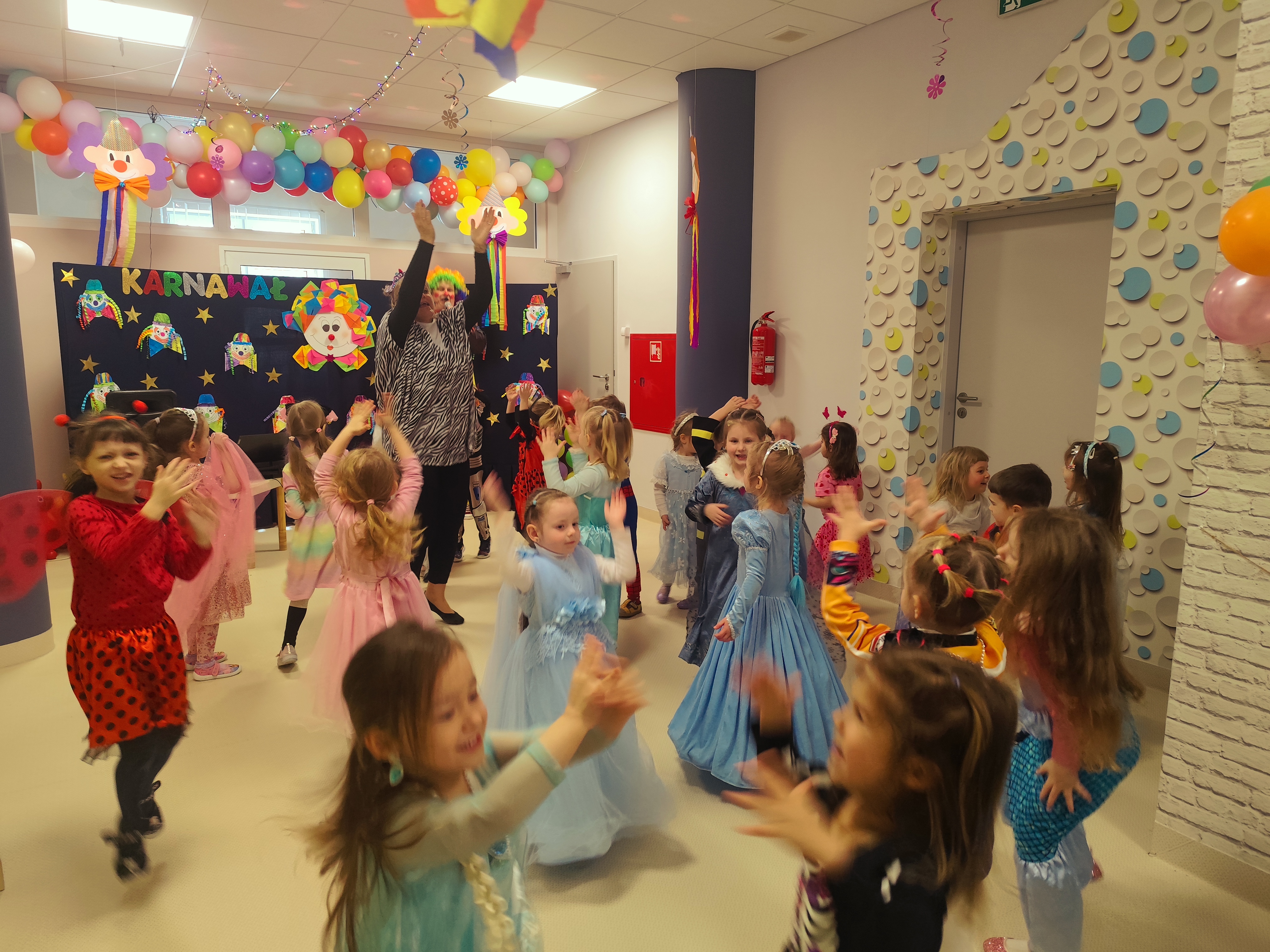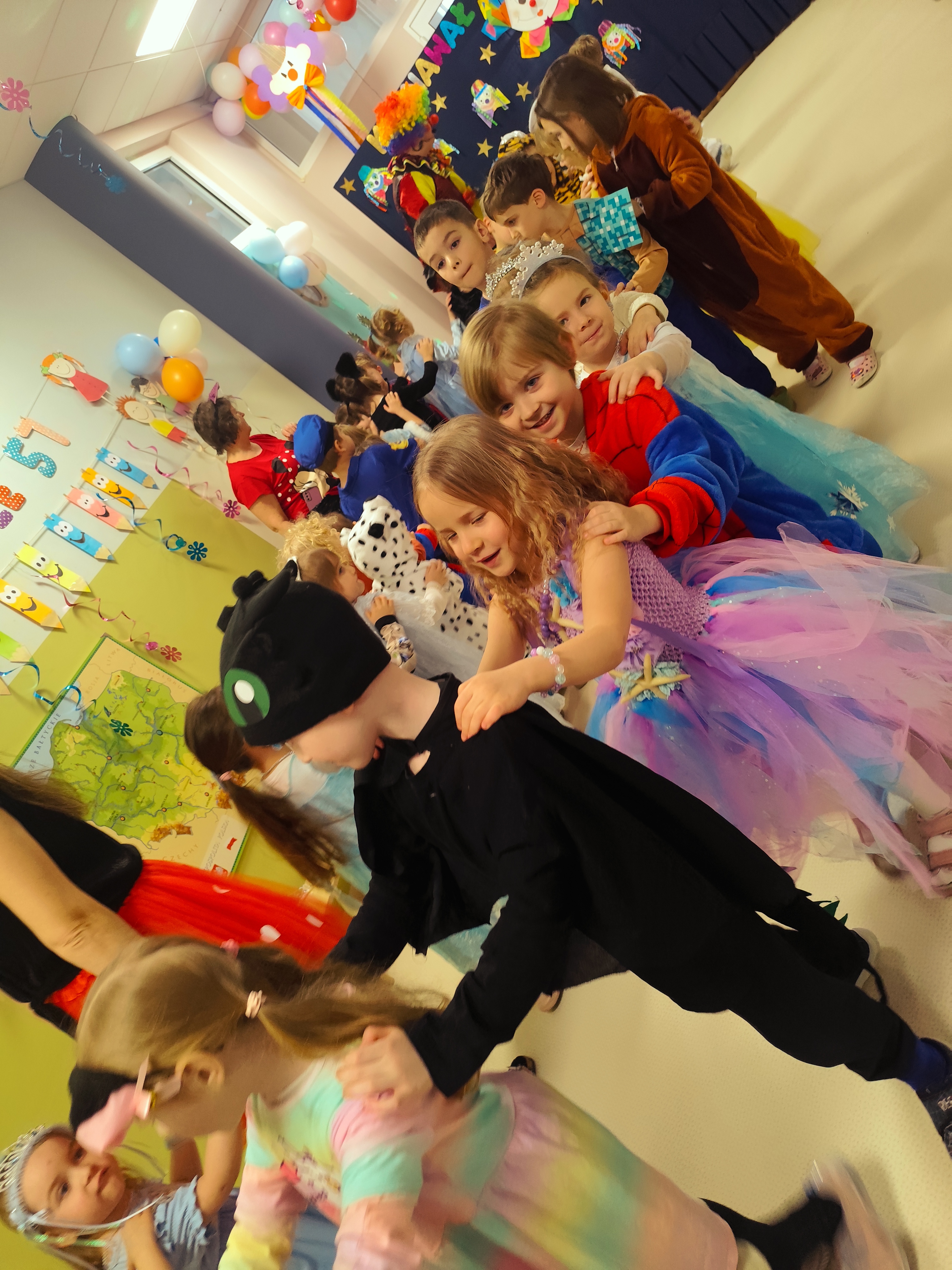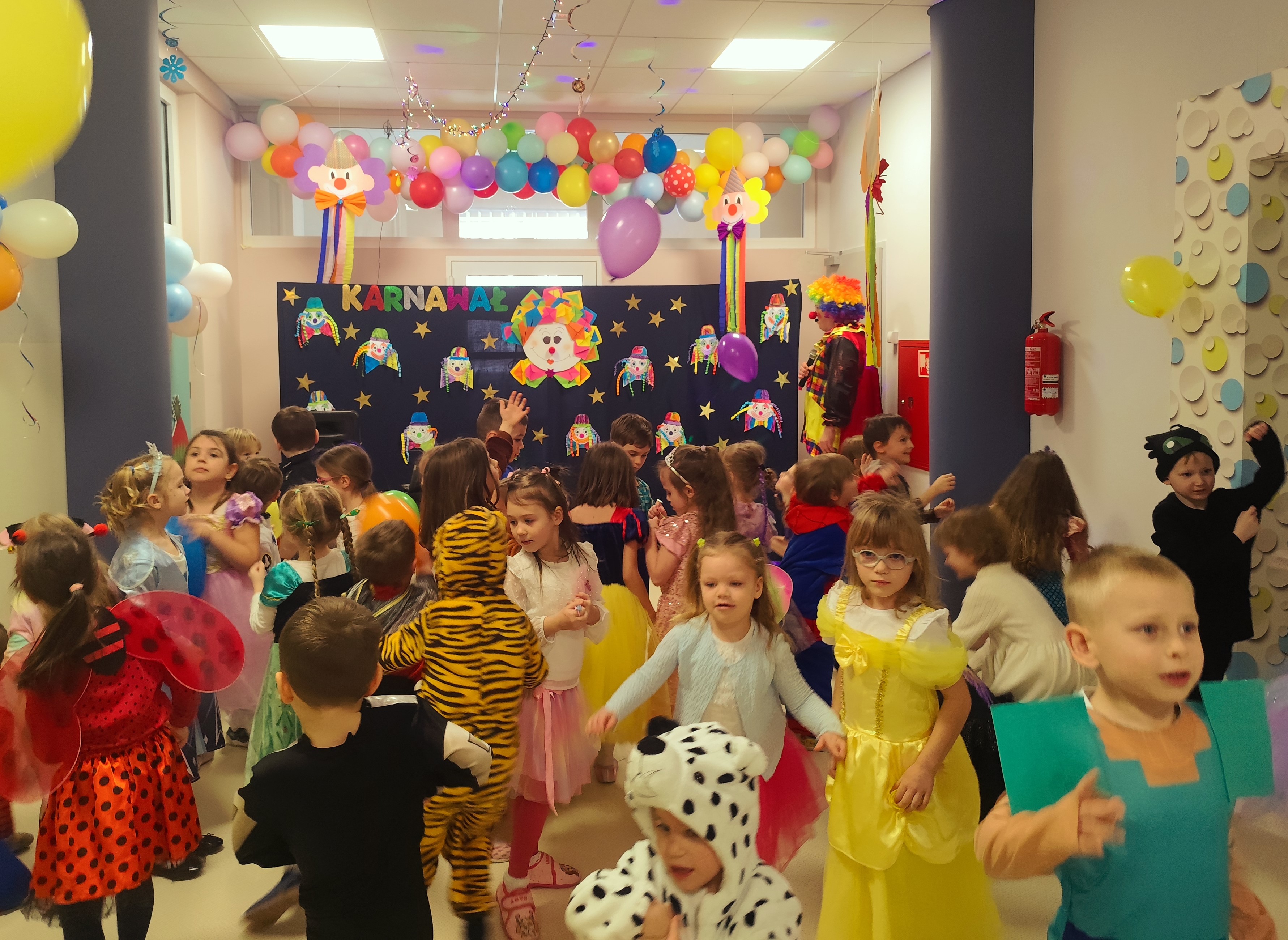 W poniedziałek, 9 lutego, w naszym przedszkolu odbył się bal karnawałowy, który przebiegł w radosnej i uroczystej atmosferze. Wydarzenie poprowadził Pan Artur Kochański - Firma Lokomotywa, zapewniając dzieciom bogaty program obejmujący tańce, zabawy integracyjne oraz konkursy. Dużą atrakcją były efektowne bańki mydlane, które dostarczyły uczestnikom wiele radości. W krótkiej przerwie na dzieci czekał poczęstunek.
