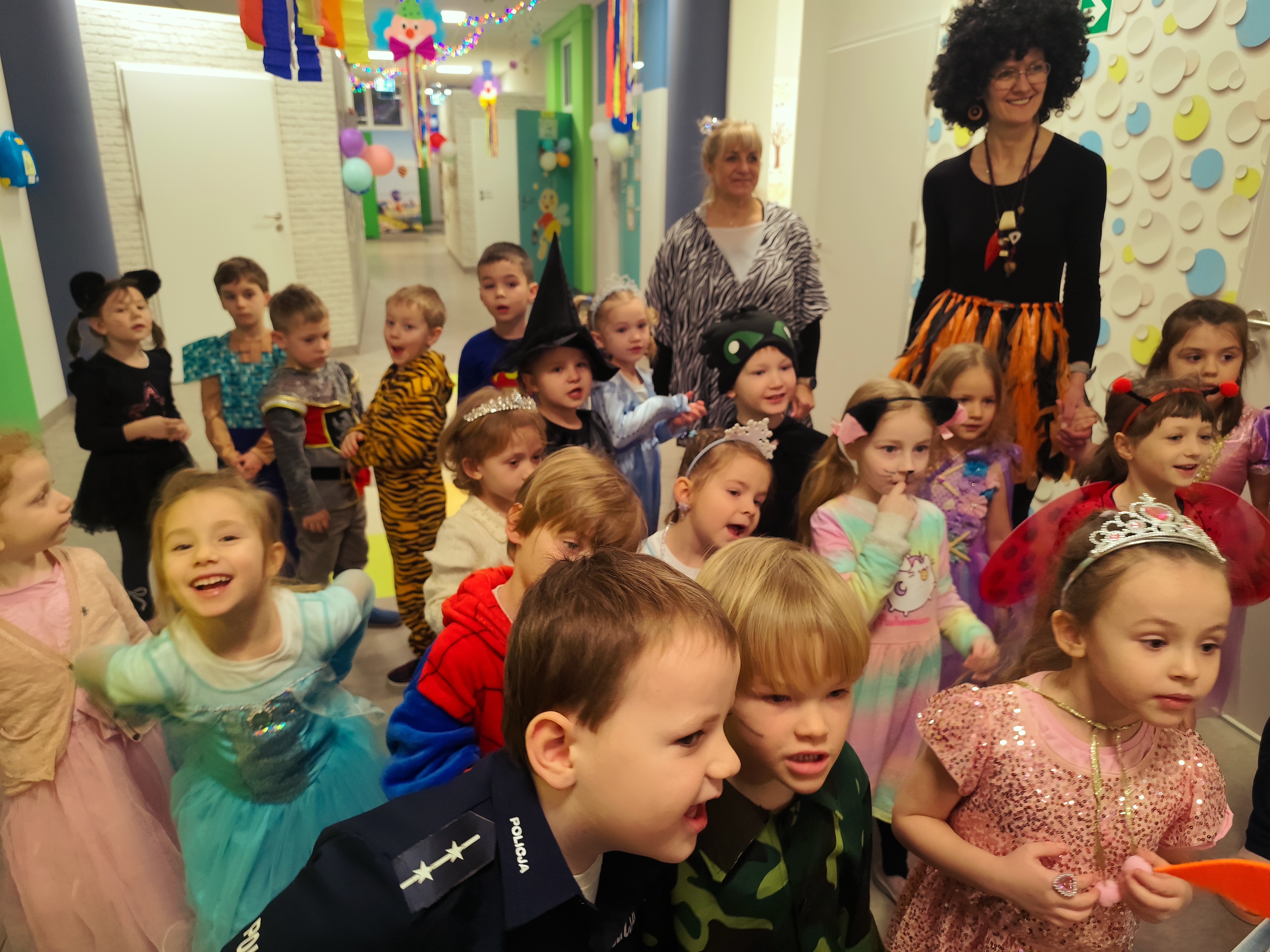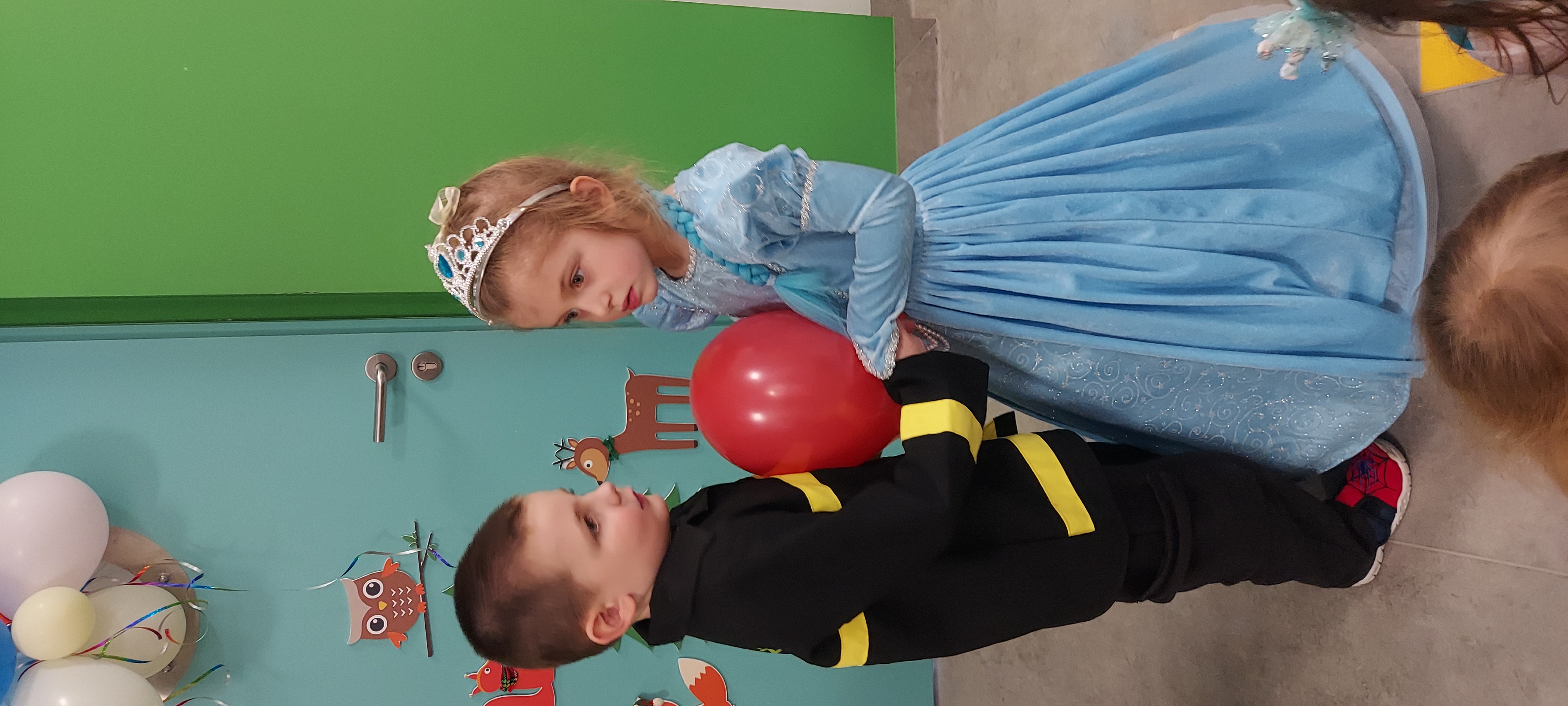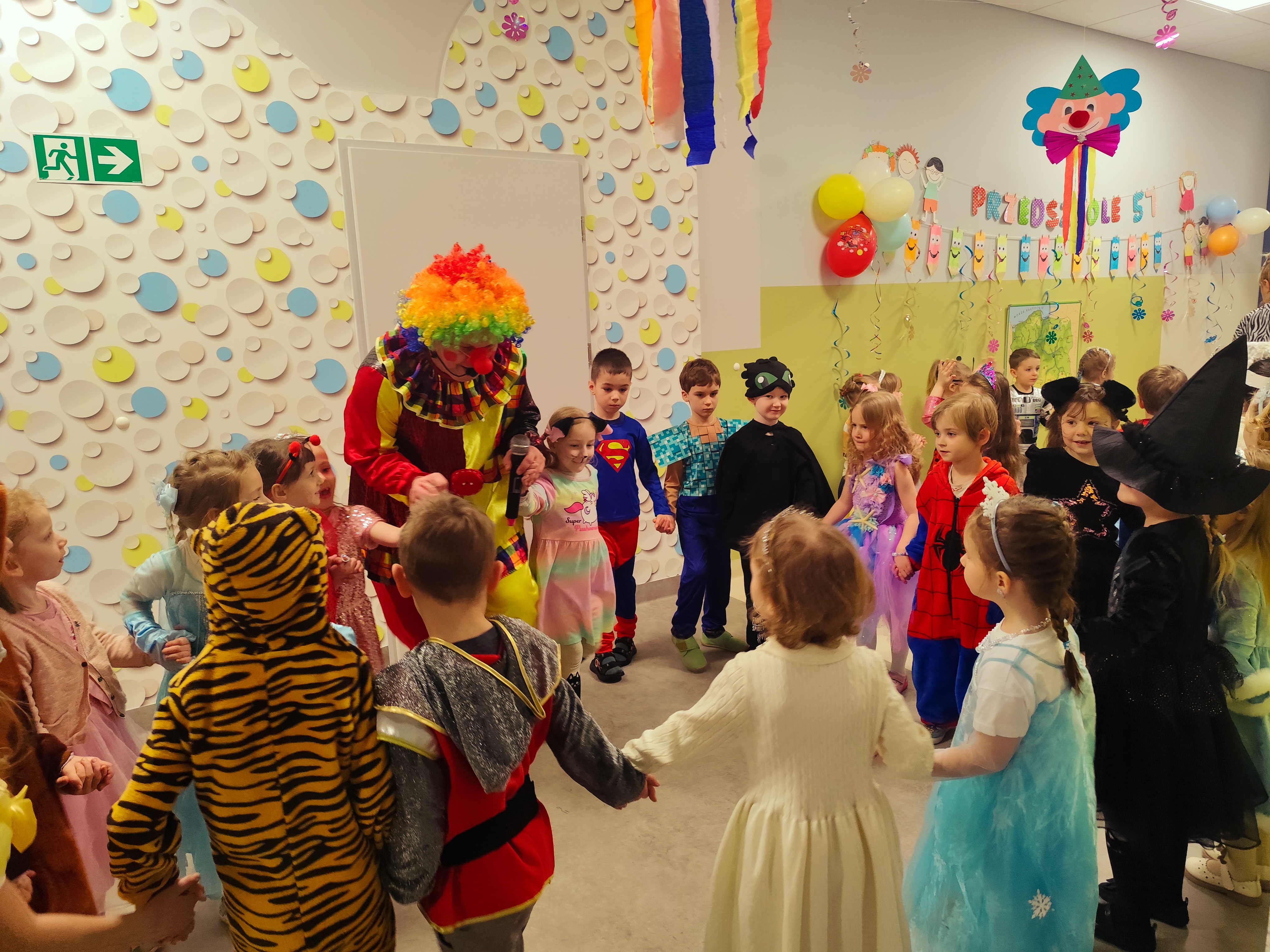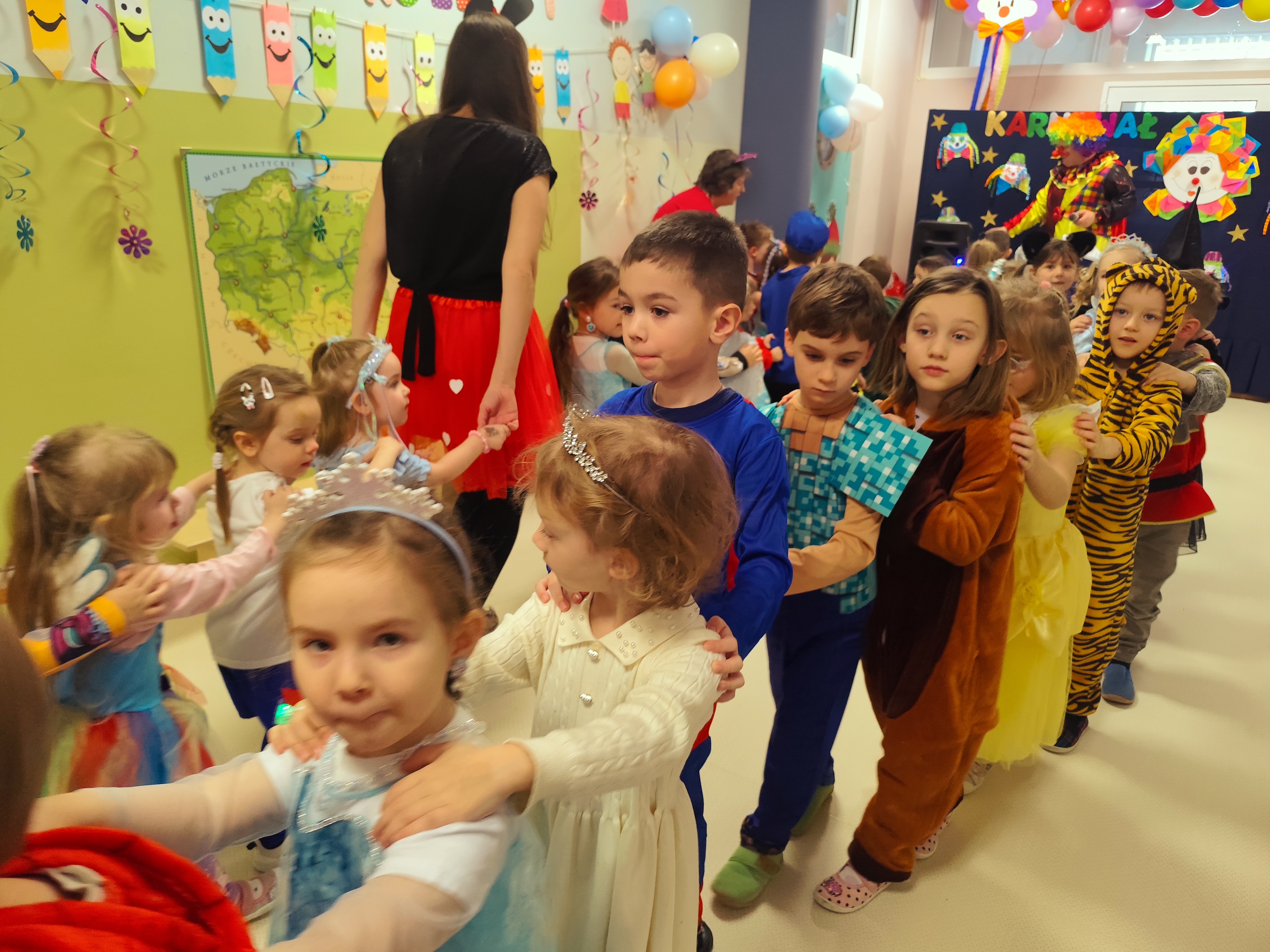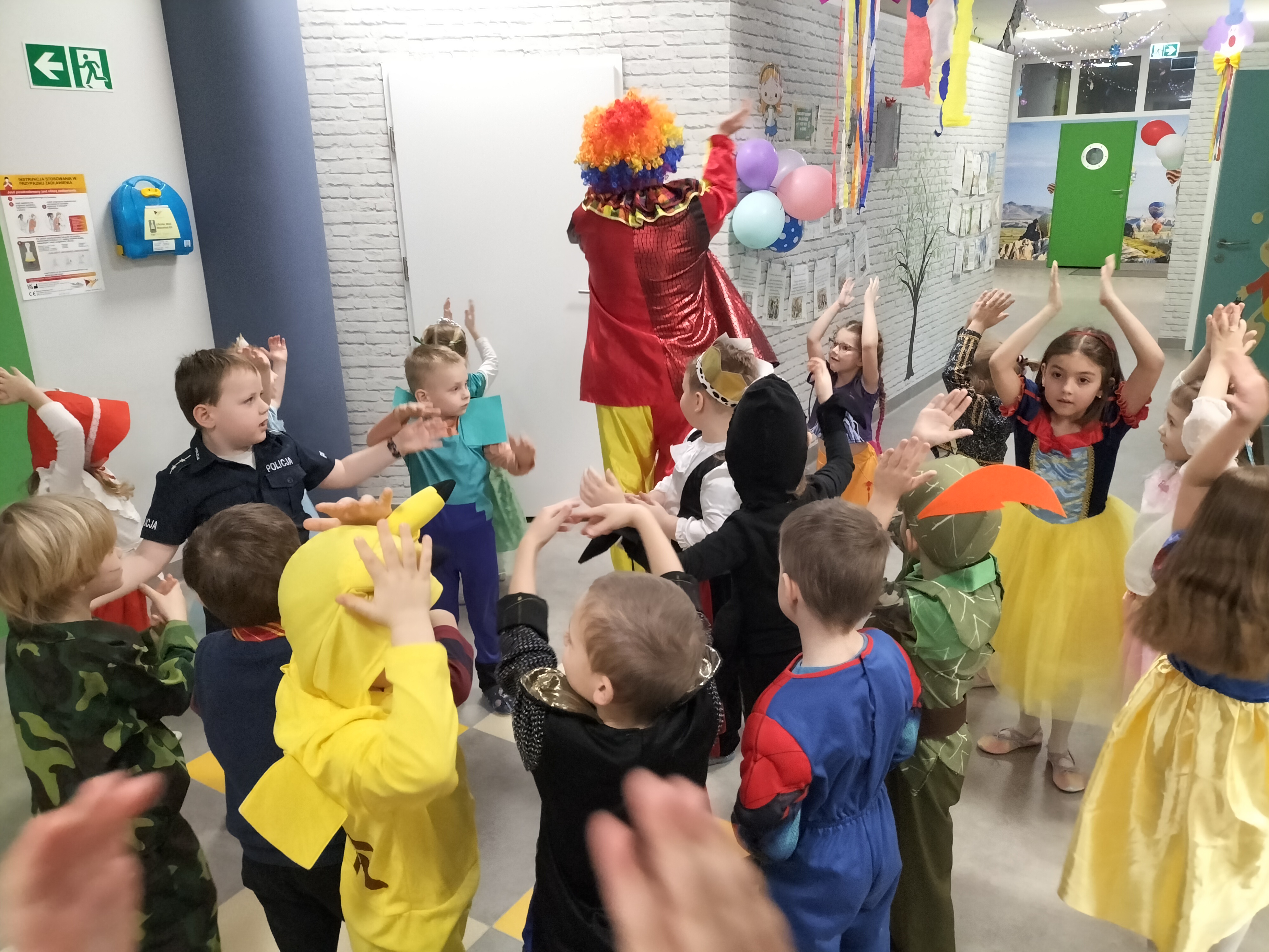 W poniedziałek, 9 lutego, w naszym przedszkolu odbył się bal karnawałowy, który przebiegł w radosnej i uroczystej atmosferze. Wydarzenie poprowadził Pan Artur Kochański - Firma Lokomotywa, zapewniając dzieciom bogaty program obejmujący tańce, zabawy integracyjne oraz konkursy. Dużą atrakcją były efektowne bańki mydlane, które dostarczyły uczestnikom wiele radości. W krótkiej przerwie na dzieci czekał poczęstunek.