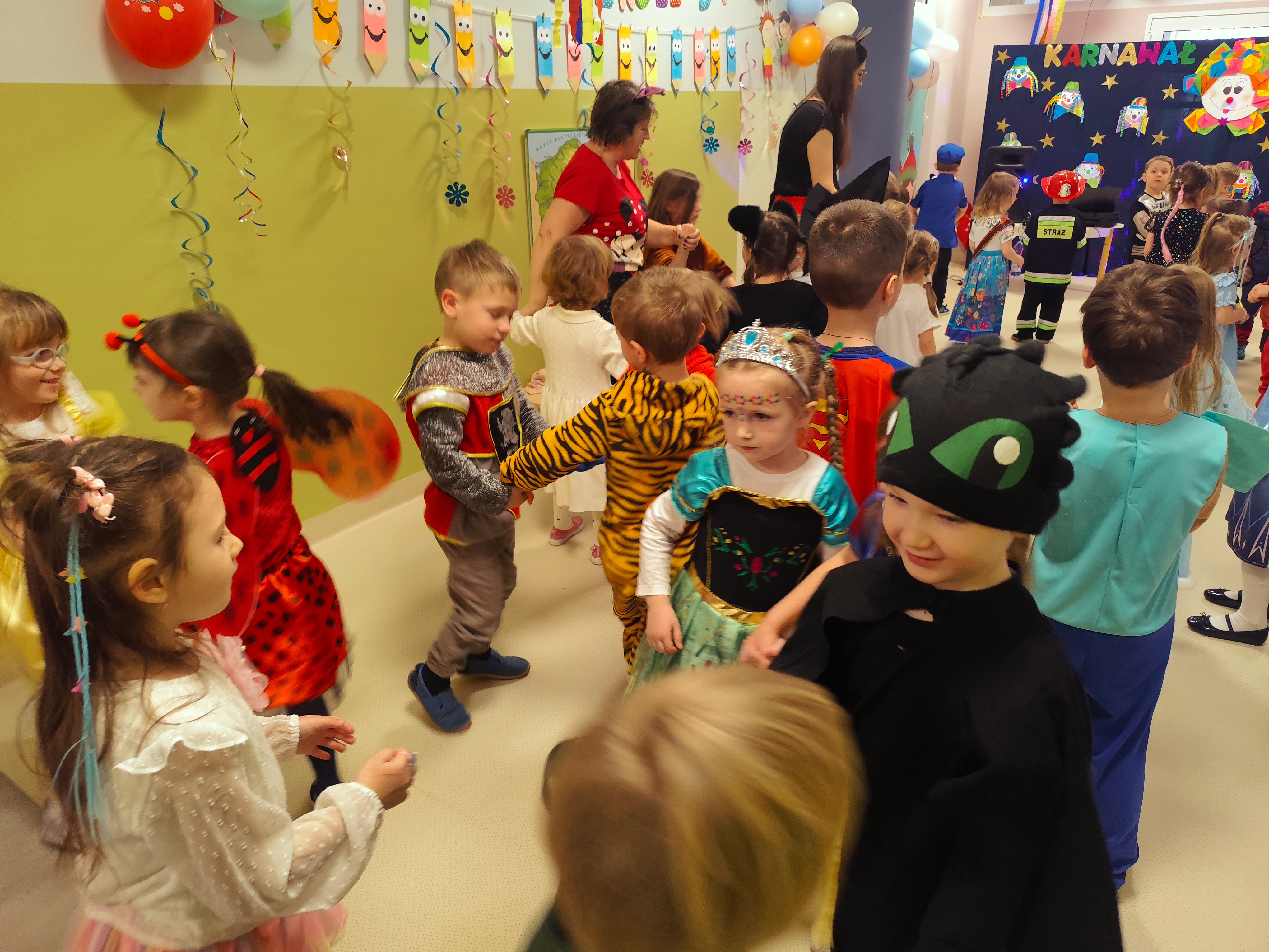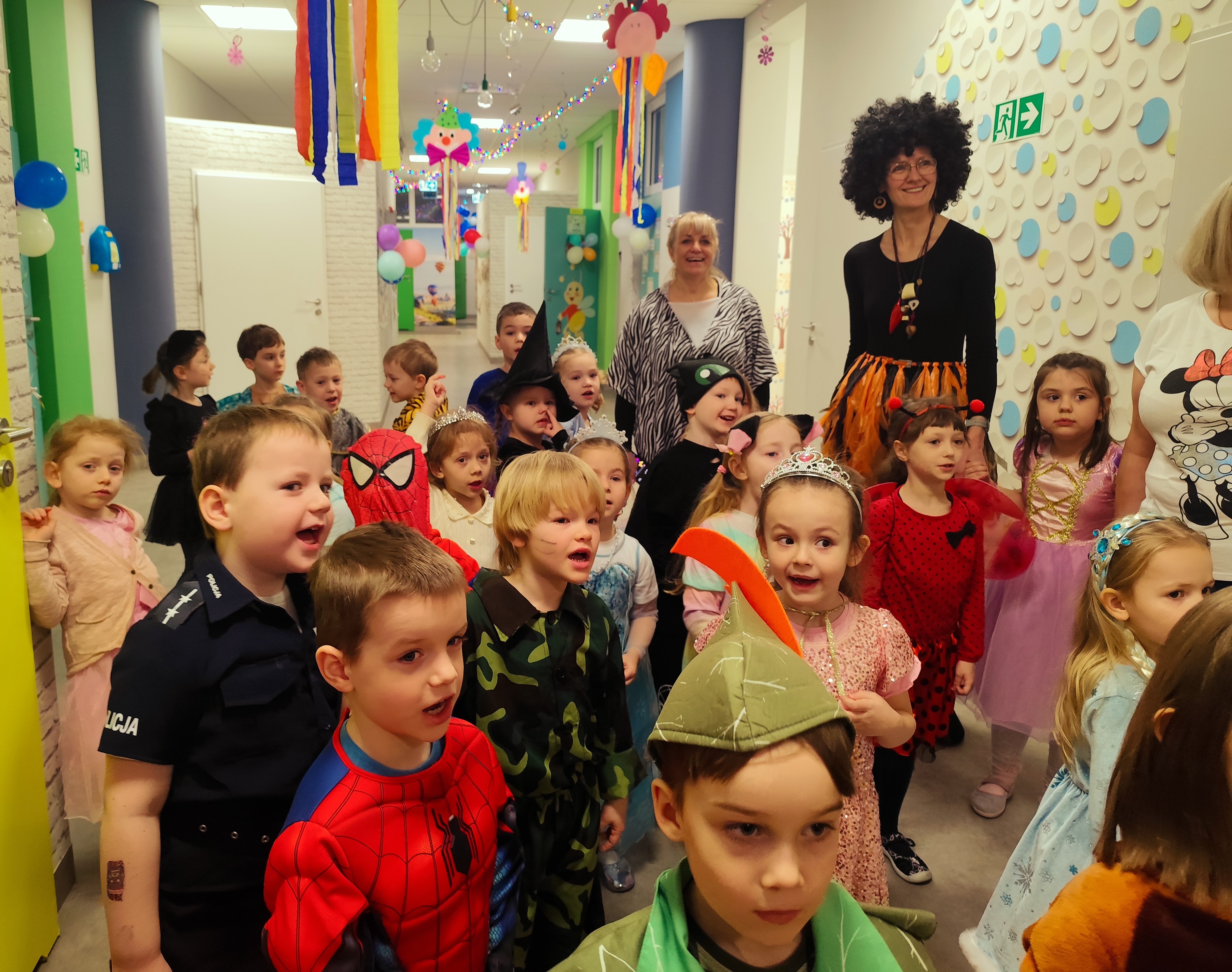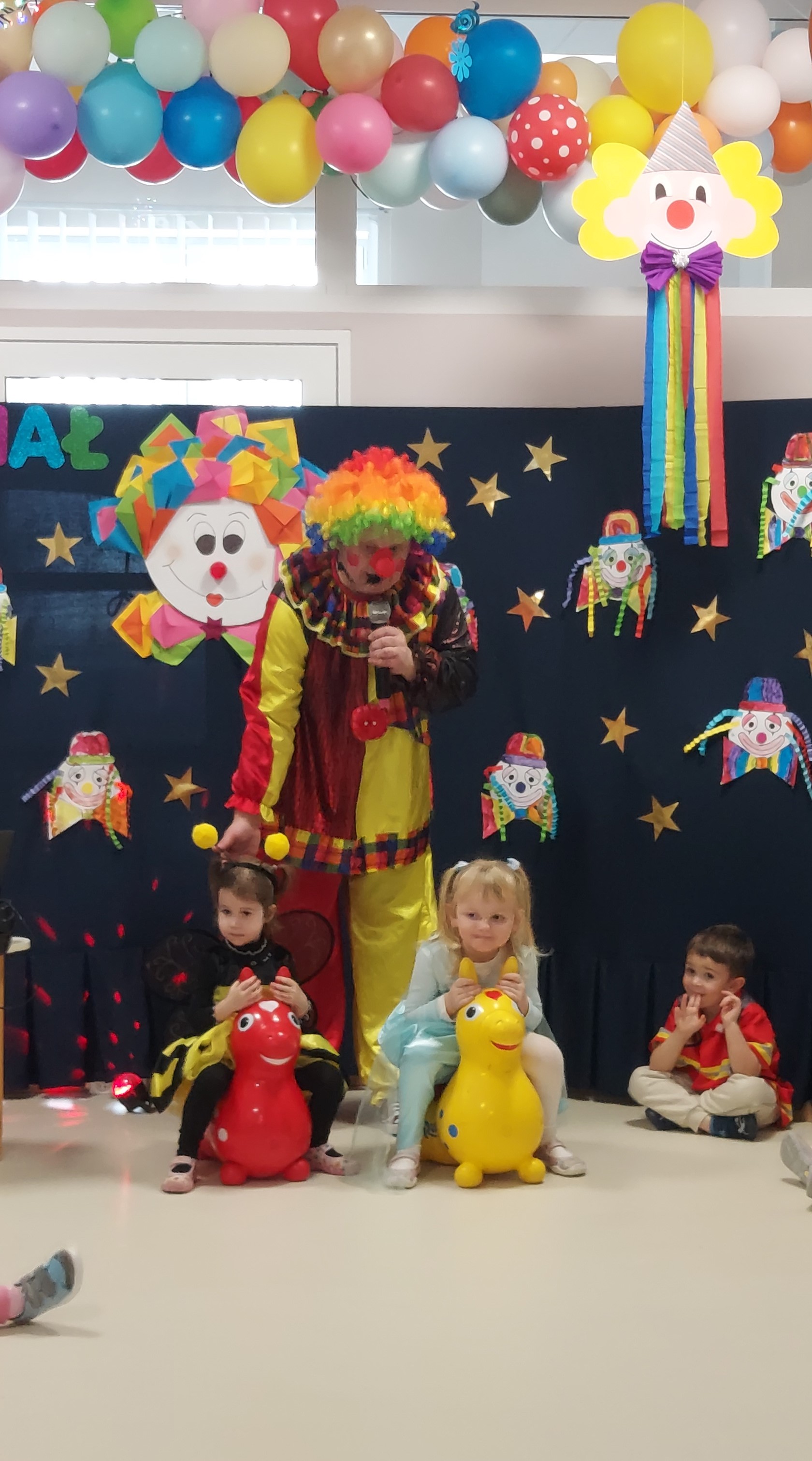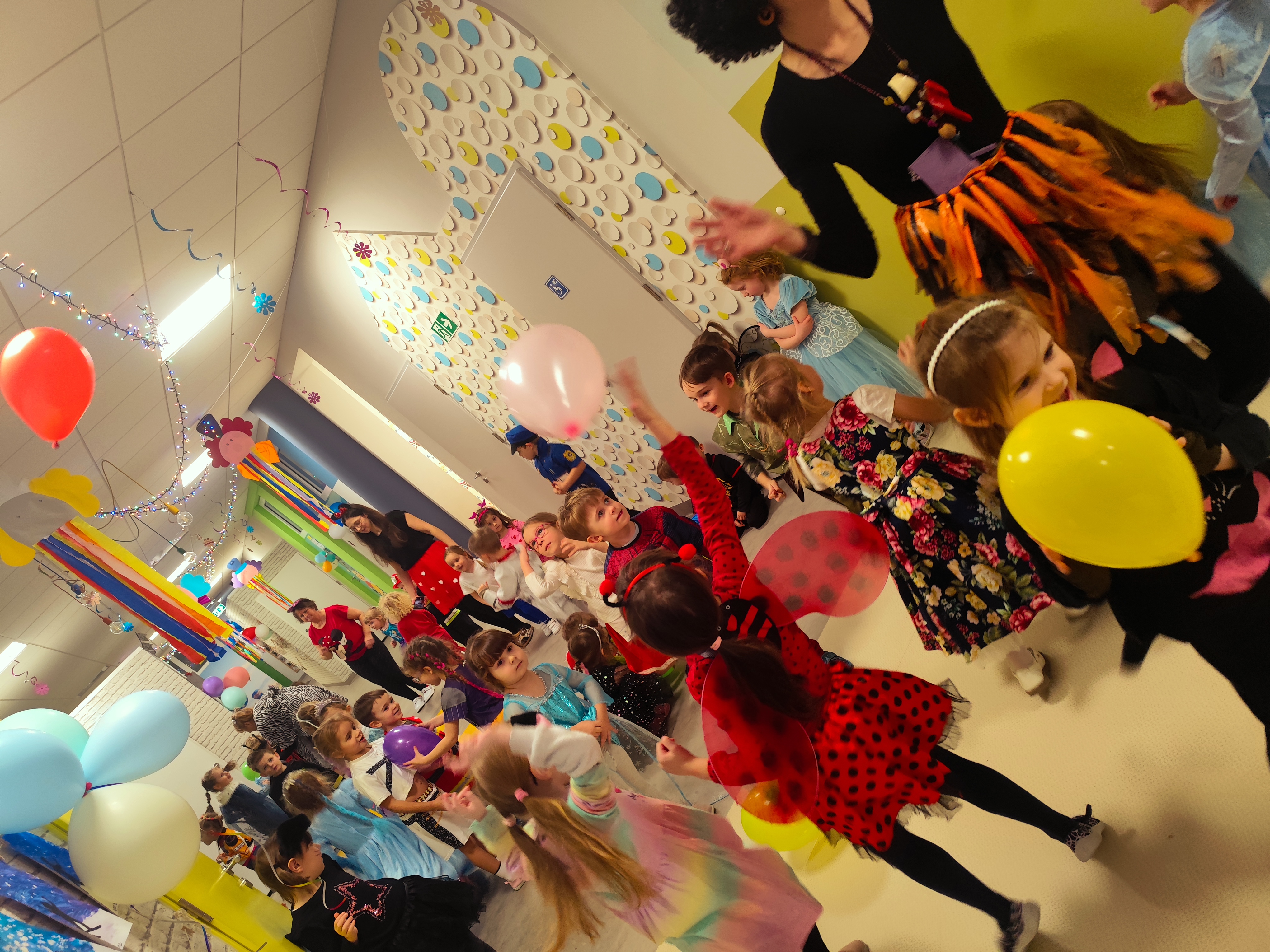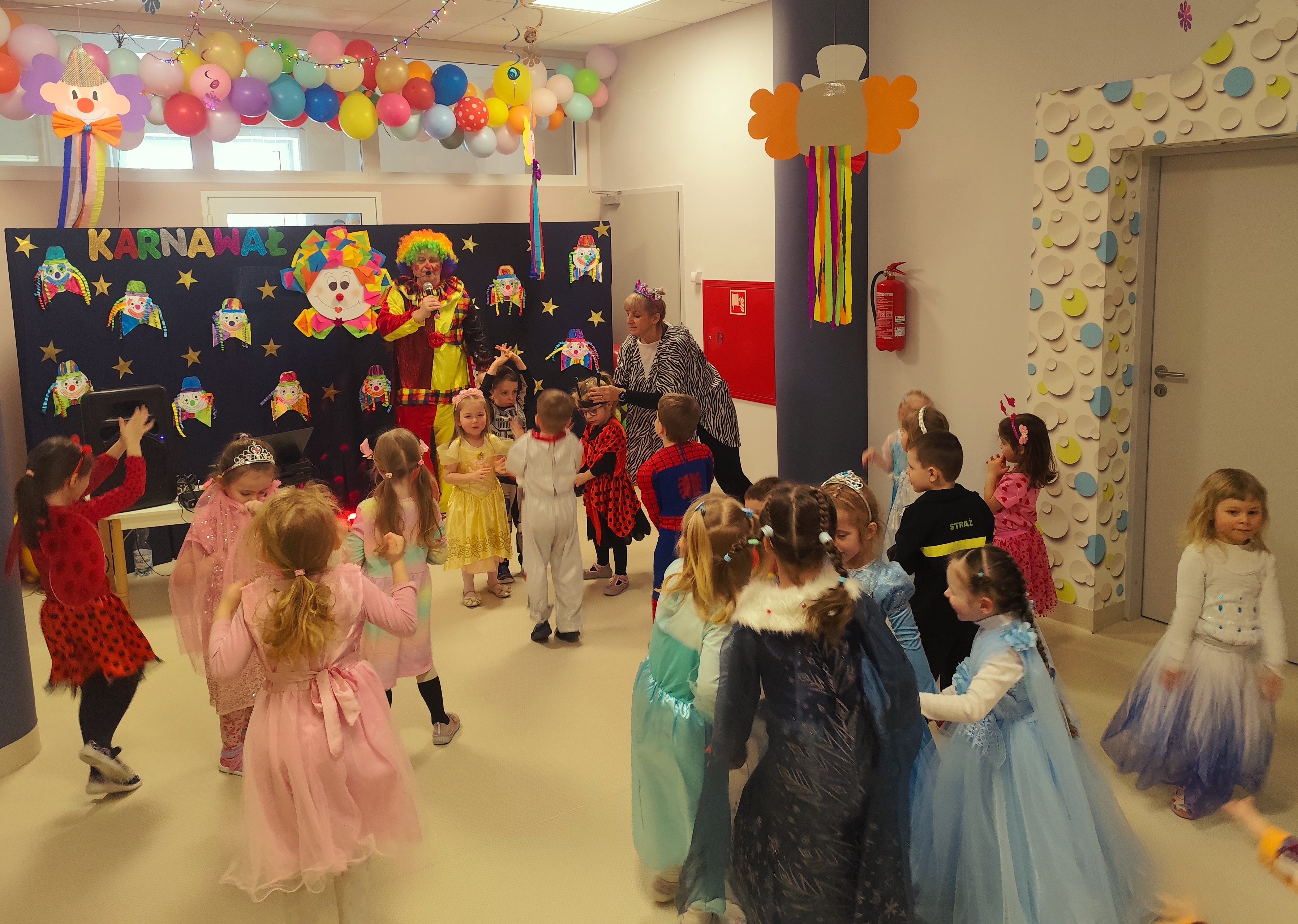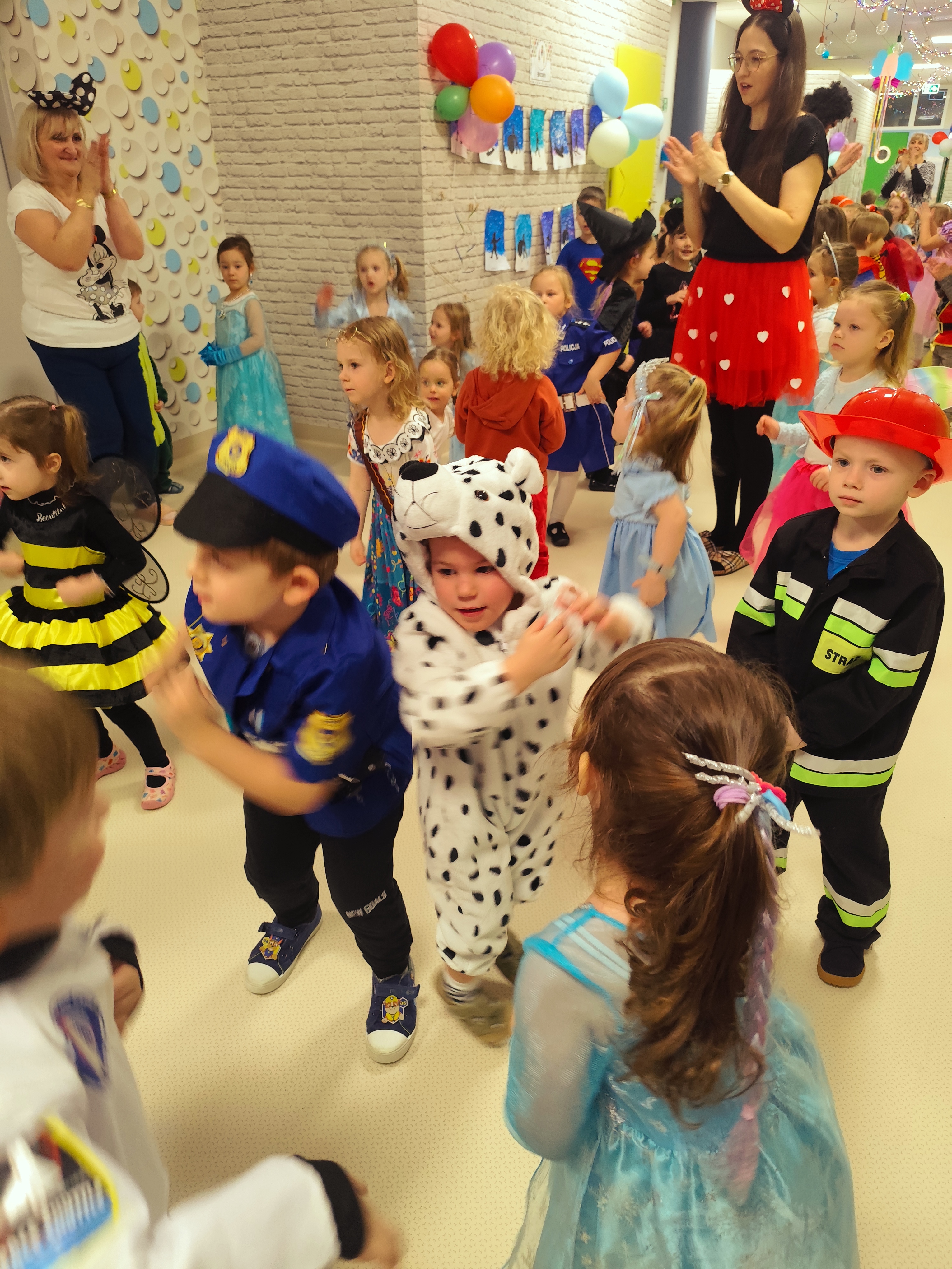 W poniedziałek, 9 lutego, w naszym przedszkolu odbył się bal karnawałowy, który przebiegł w radosnej i uroczystej atmosferze. Wydarzenie poprowadził Pan Artur Kochański - Firma Lokomotywa, zapewniając dzieciom bogaty program obejmujący tańce, zabawy integracyjne oraz konkursy. Dużą atrakcją były efektowne bańki mydlane, które dostarczyły uczestnikom wiele radości. W krótkiej przerwie na dzieci czekał poczęstunek.