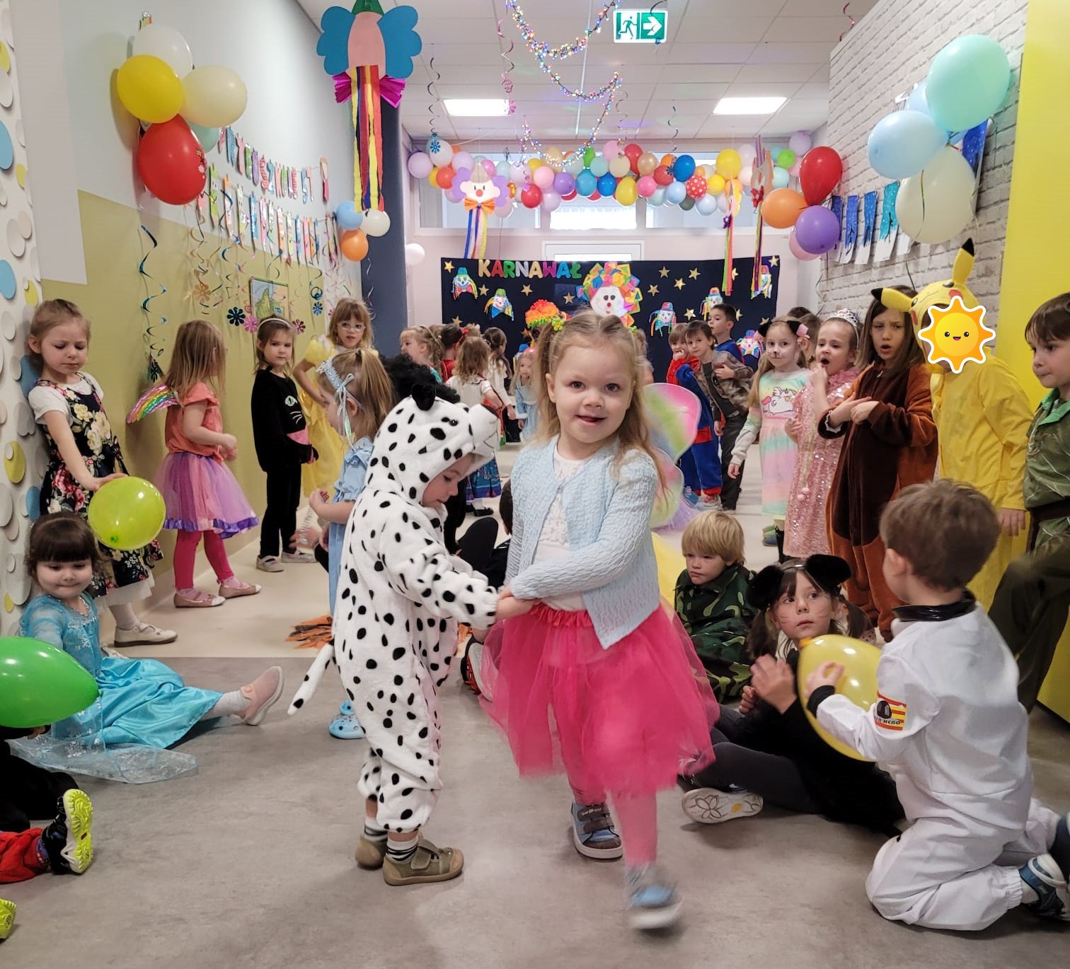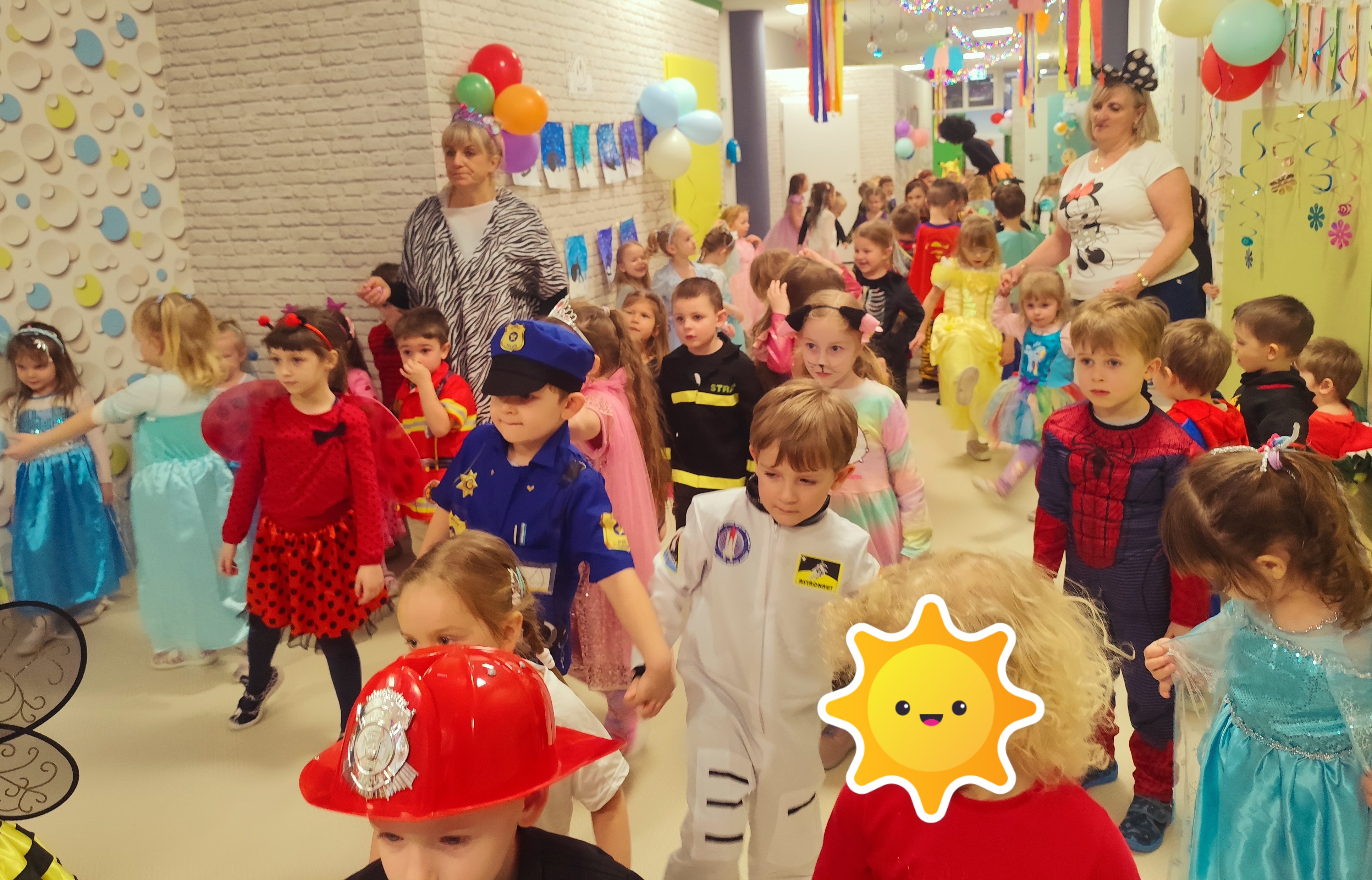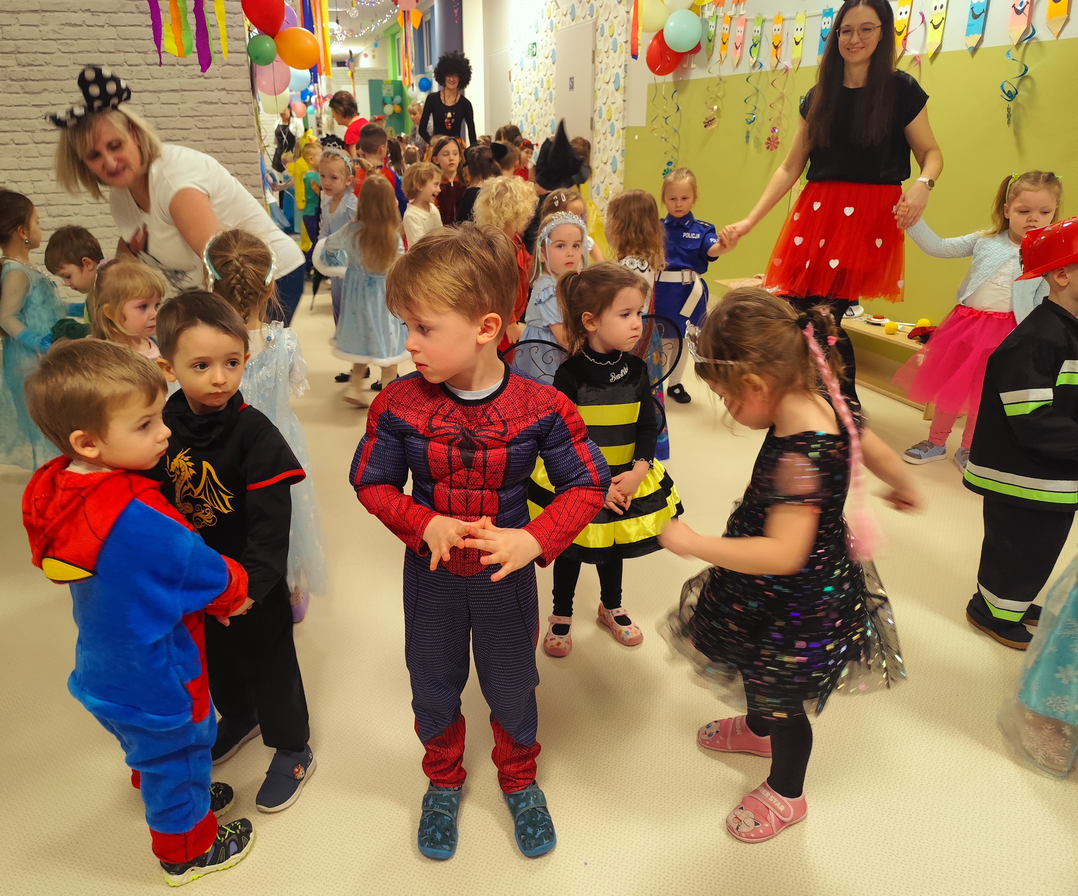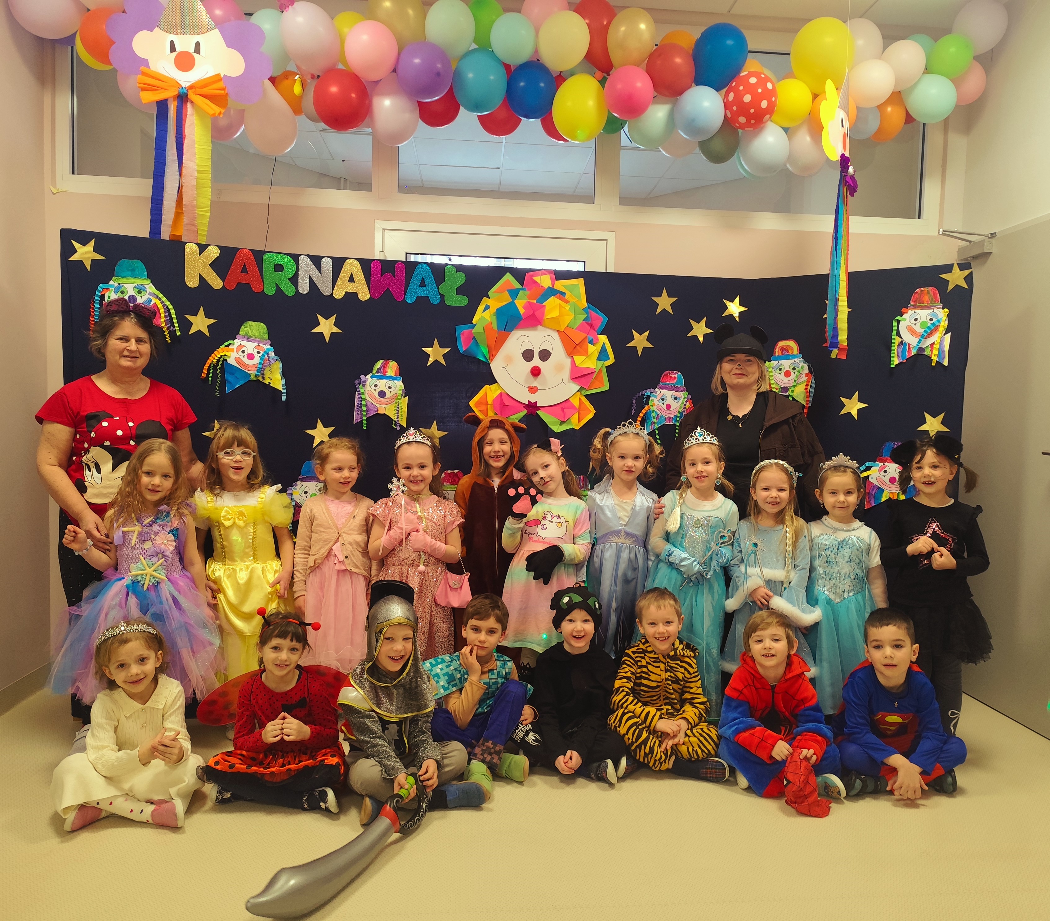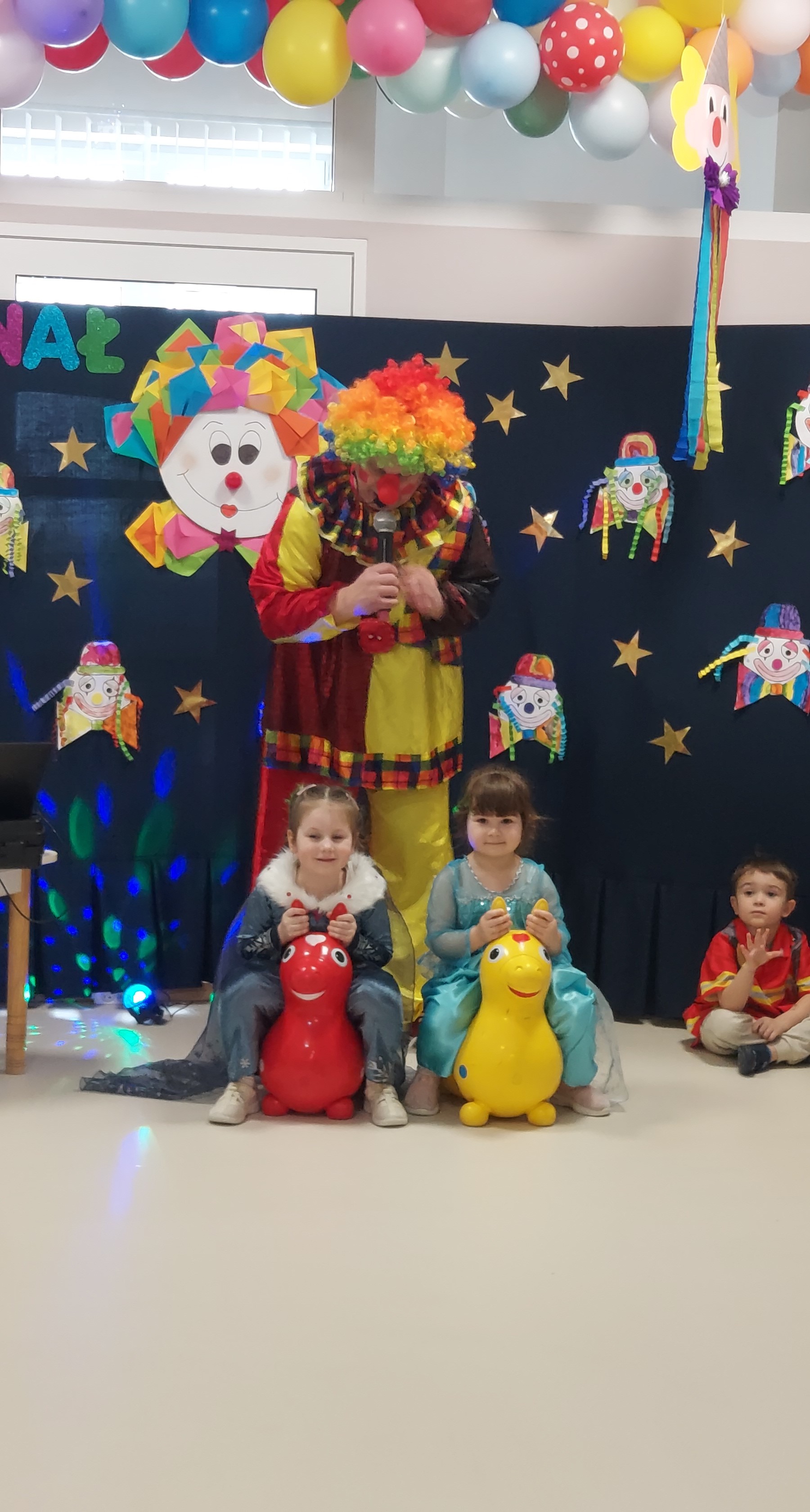 W poniedziałek, 9 lutego, w naszym przedszkolu odbył się bal karnawałowy, który przebiegł w radosnej i uroczystej atmosferze. Wydarzenie poprowadził Pan Artur Kochański - Firma Lokomotywa, zapewniając dzieciom bogaty program obejmujący tańce, zabawy integracyjne oraz konkursy. Dużą atrakcją były efektowne bańki mydlane, które dostarczyły uczestnikom wiele radości. W krótkiej przerwie na dzieci czekał poczęstunek.