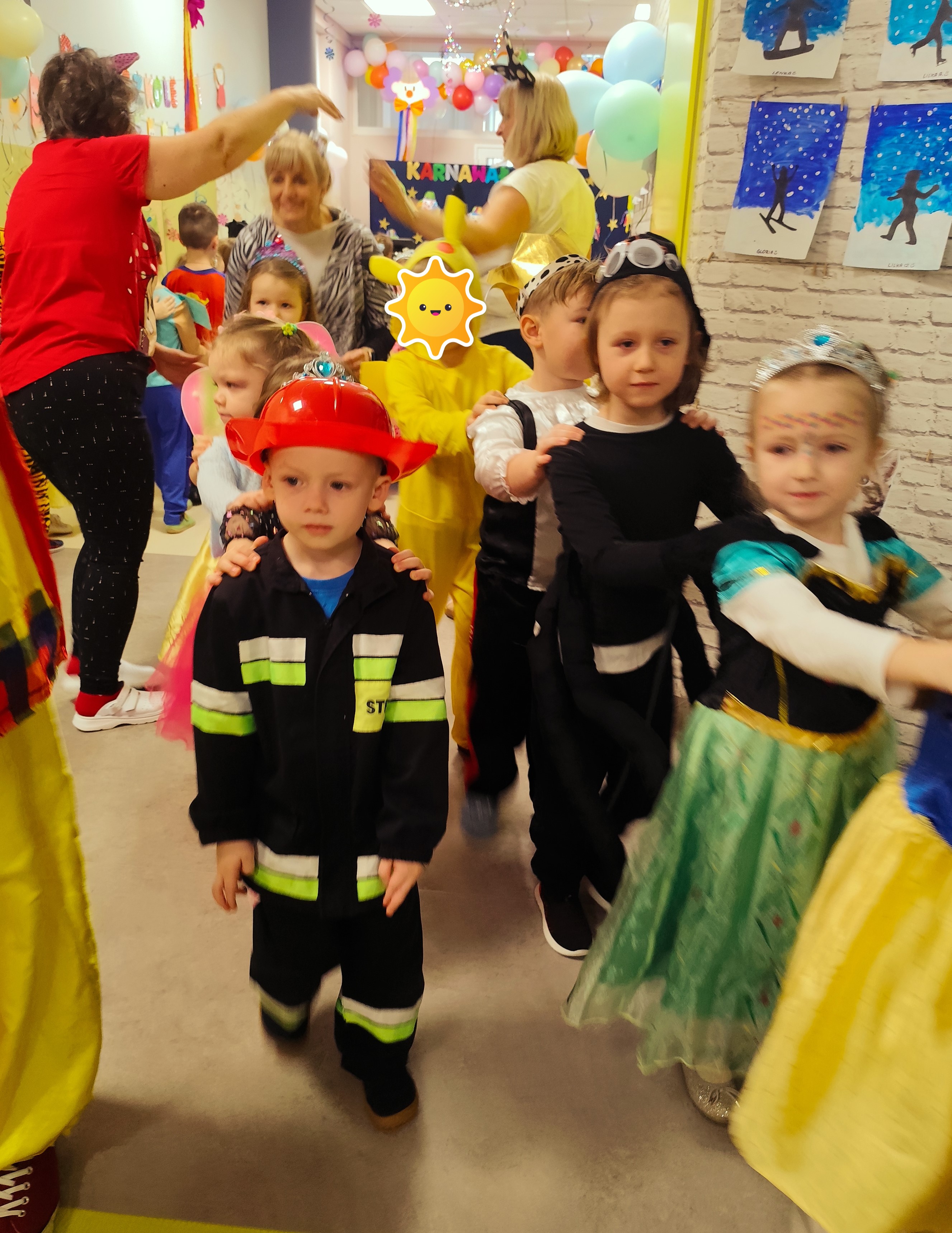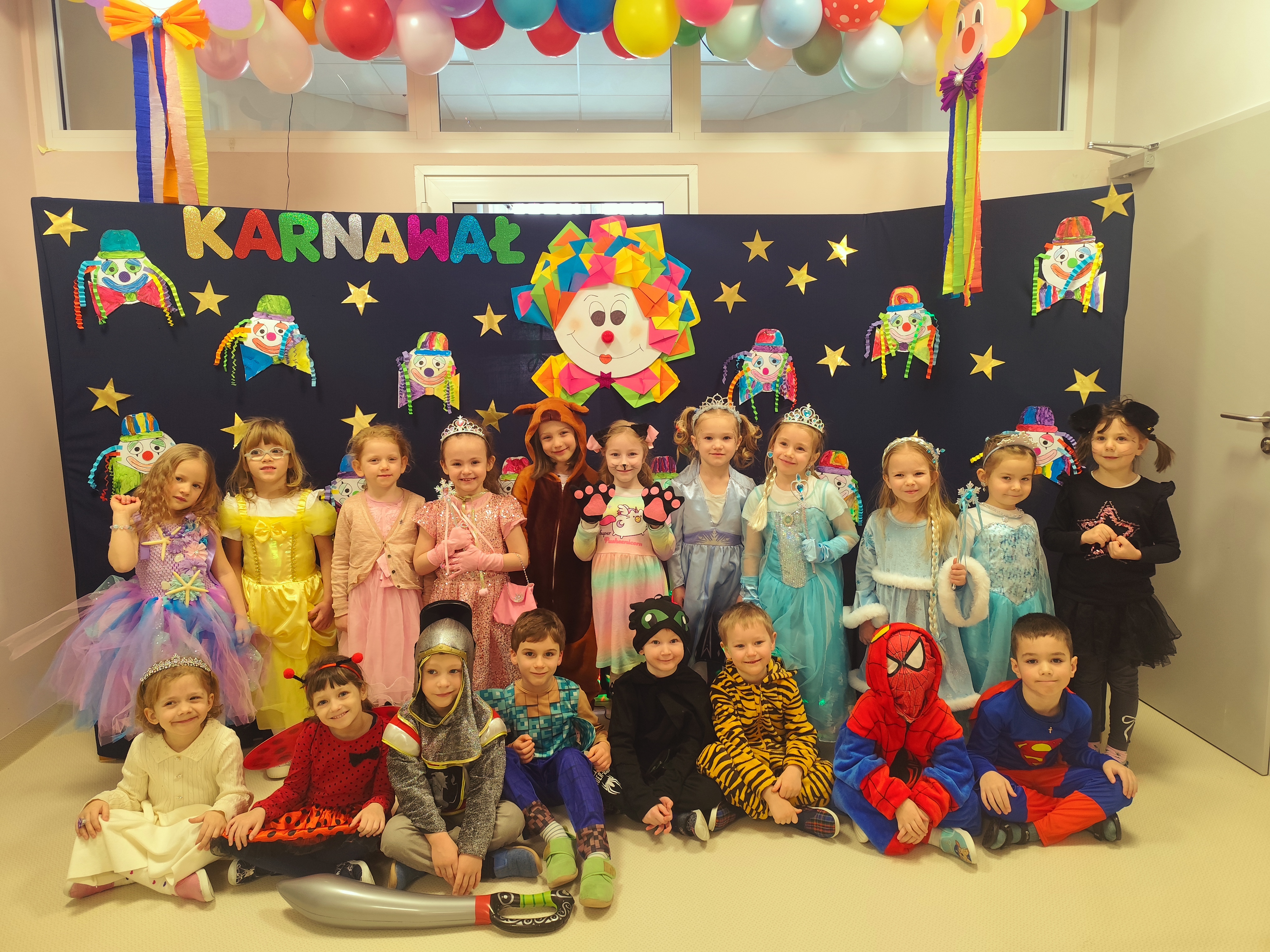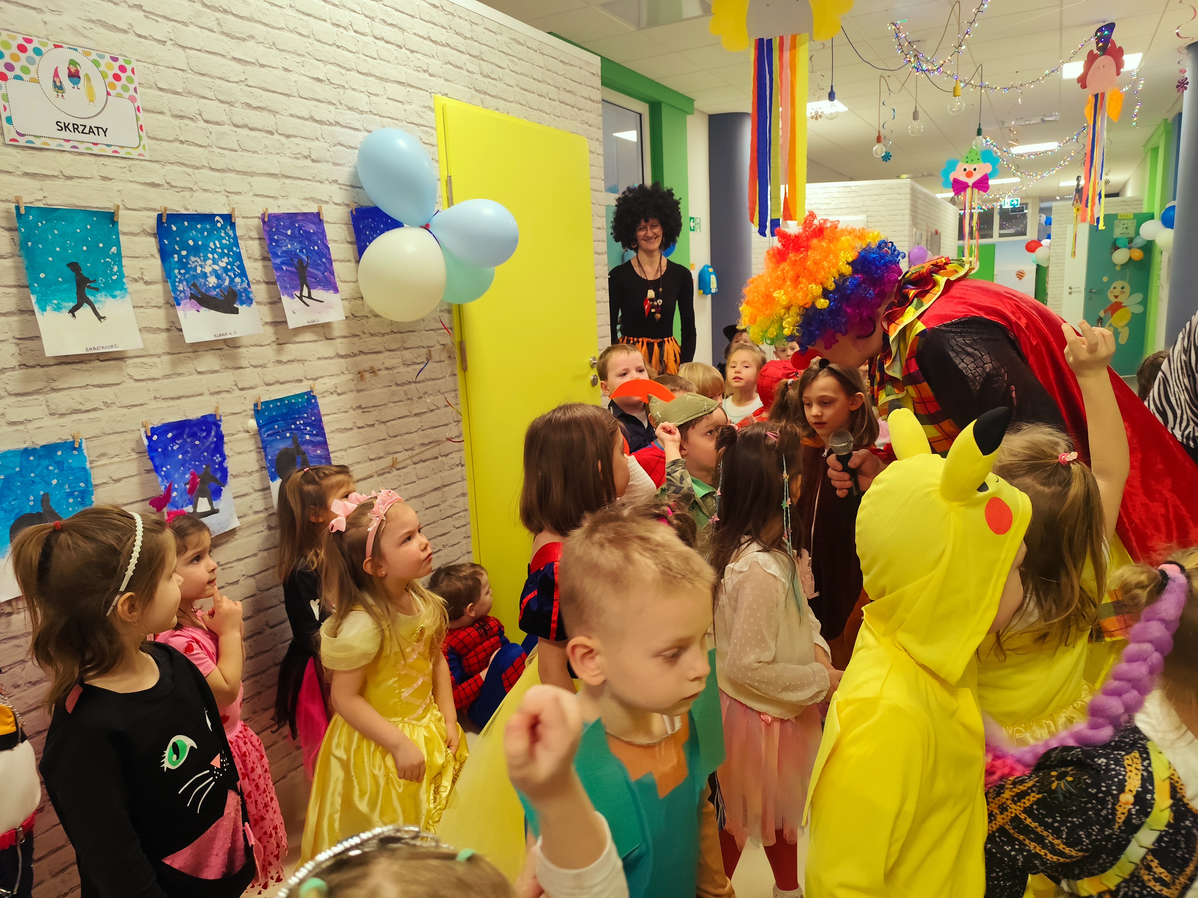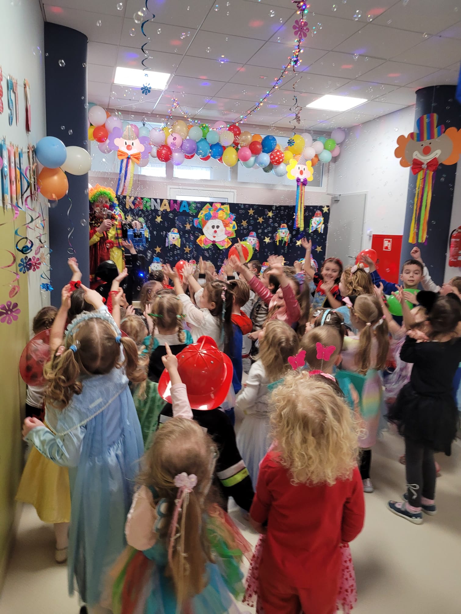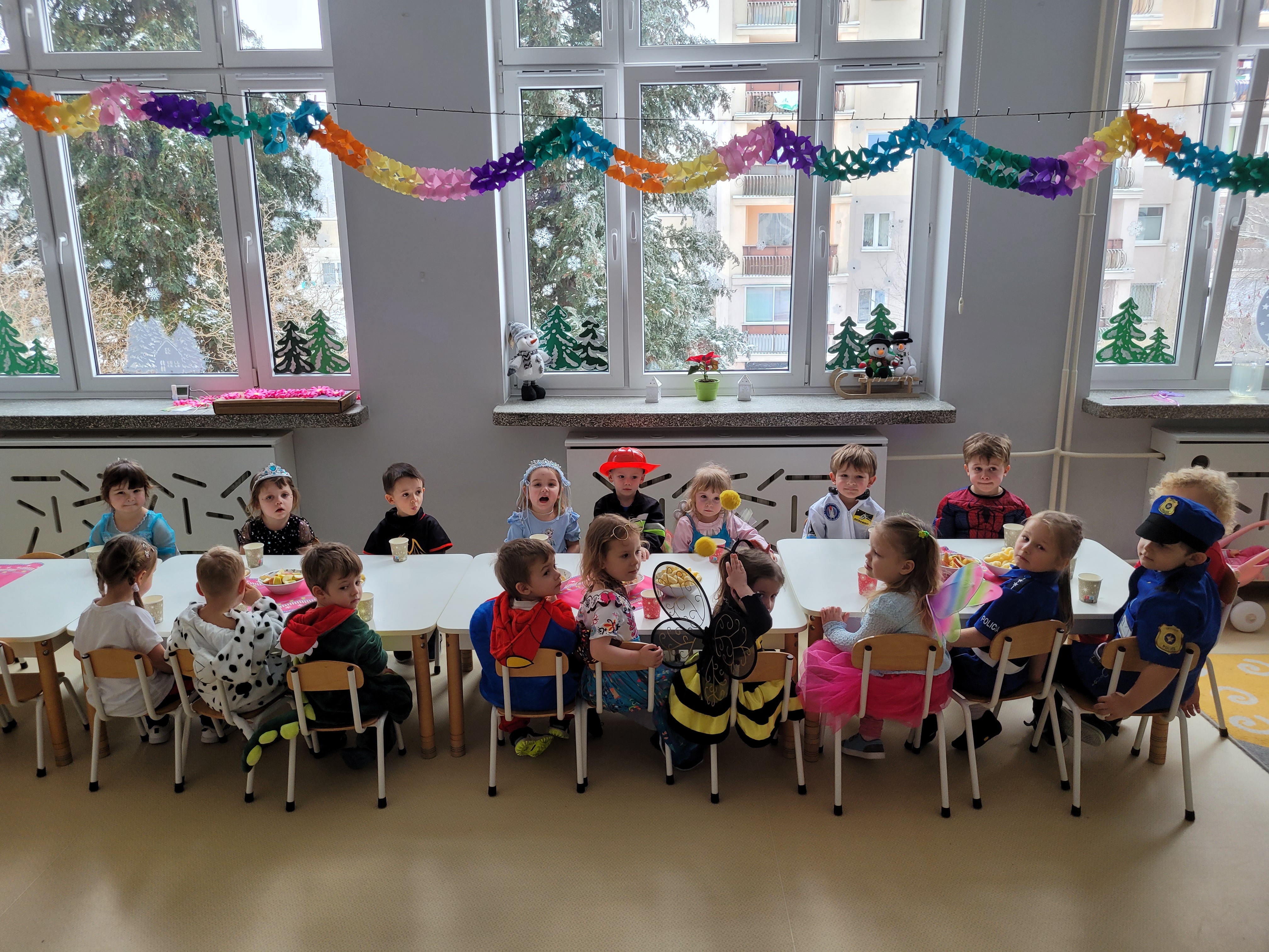 W poniedziałek, 9 lutego, w naszym przedszkolu odbył się bal karnawałowy, który przebiegł w radosnej i uroczystej atmosferze. Wydarzenie poprowadził Pan Artur Kochański - Firma Lokomotywa, zapewniając dzieciom bogaty program obejmujący tańce, zabawy integracyjne oraz konkursy. Dużą atrakcją były efektowne bańki mydlane, które dostarczyły uczestnikom wiele radości. W krótkiej przerwie na dzieci czekał poczęstunek.