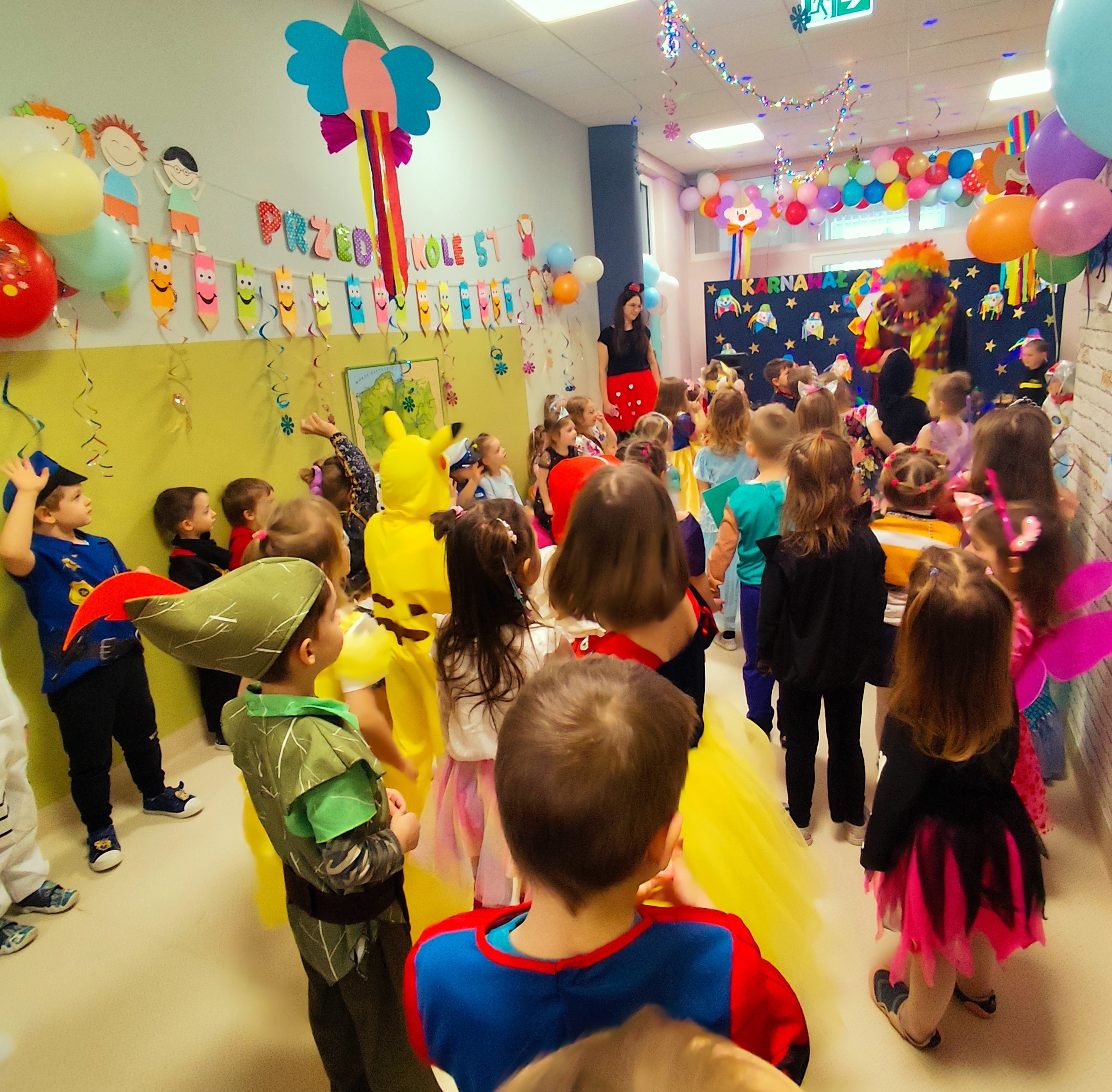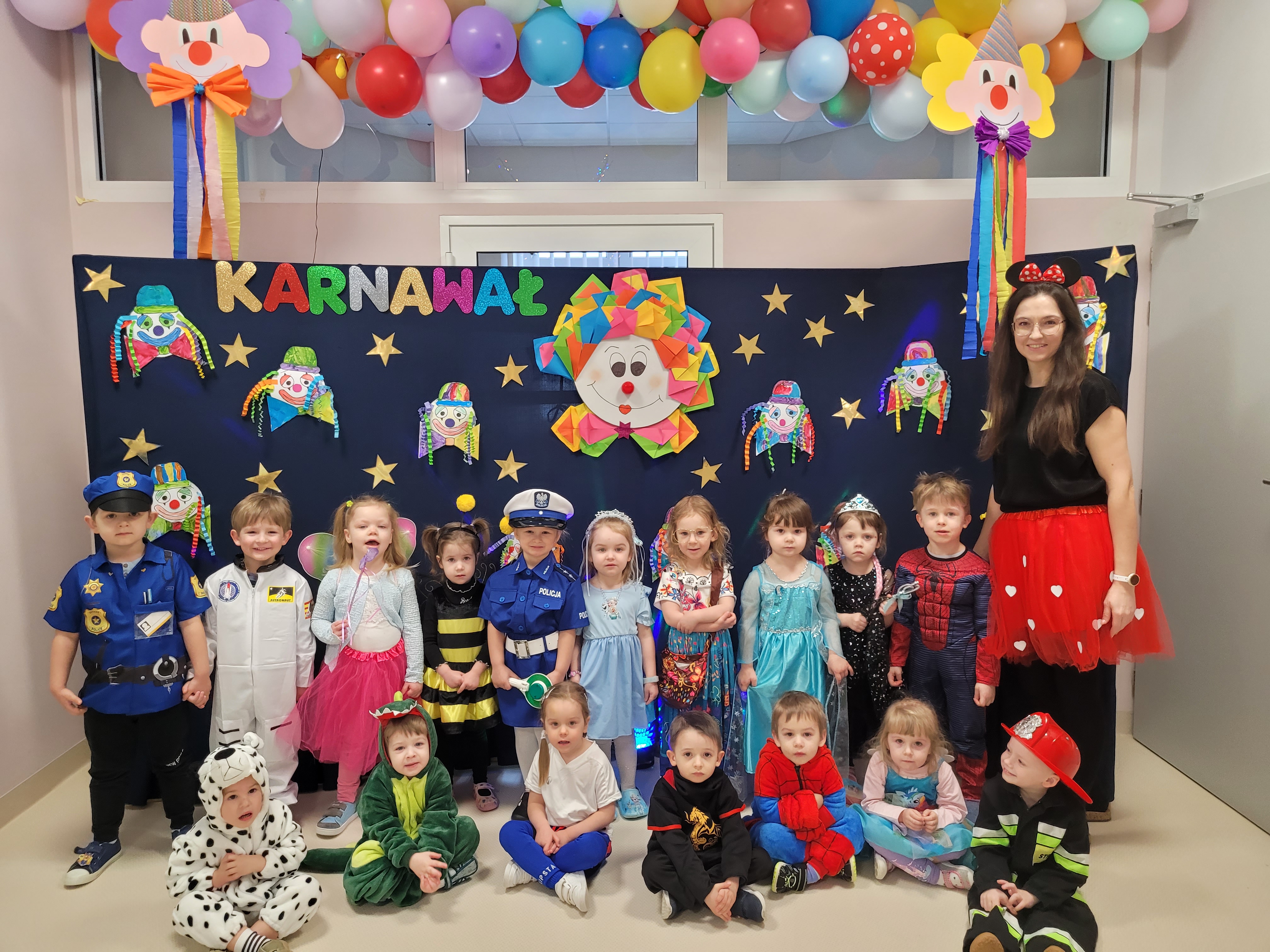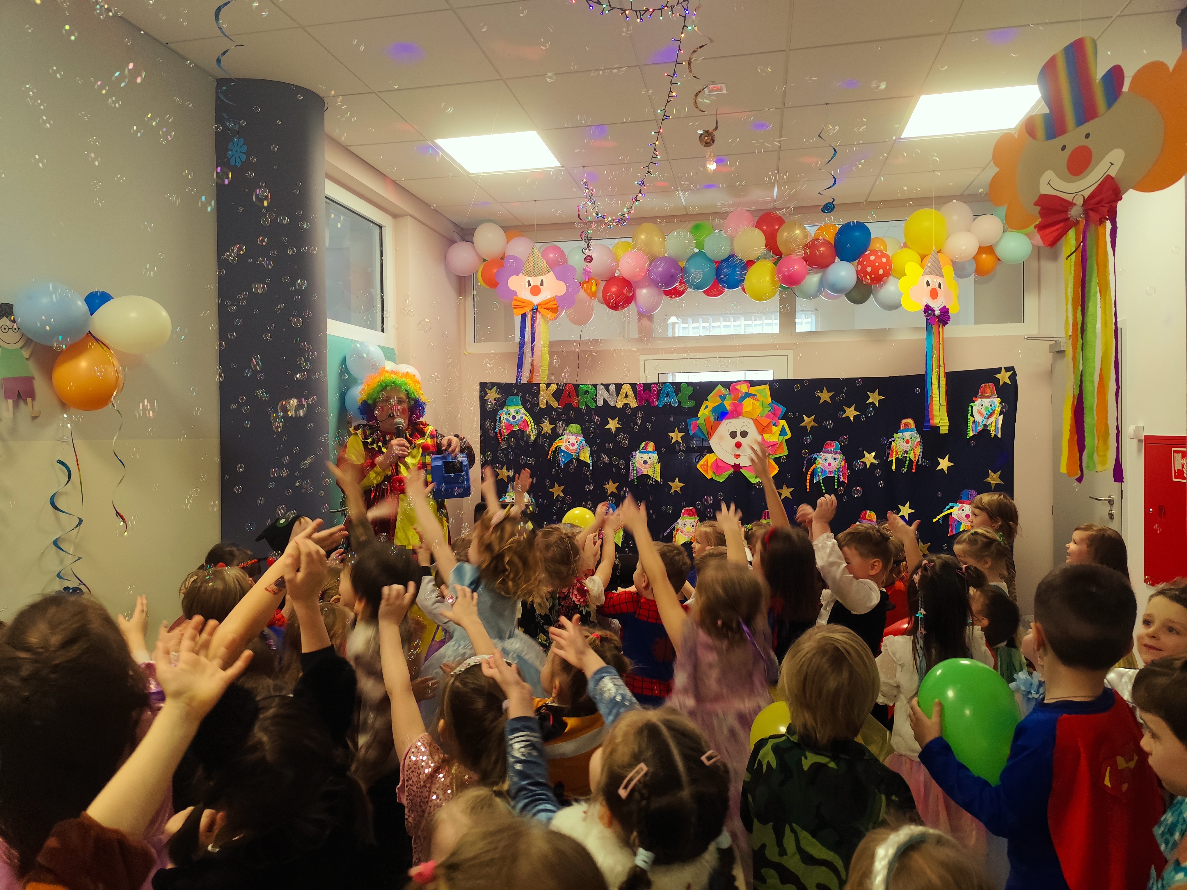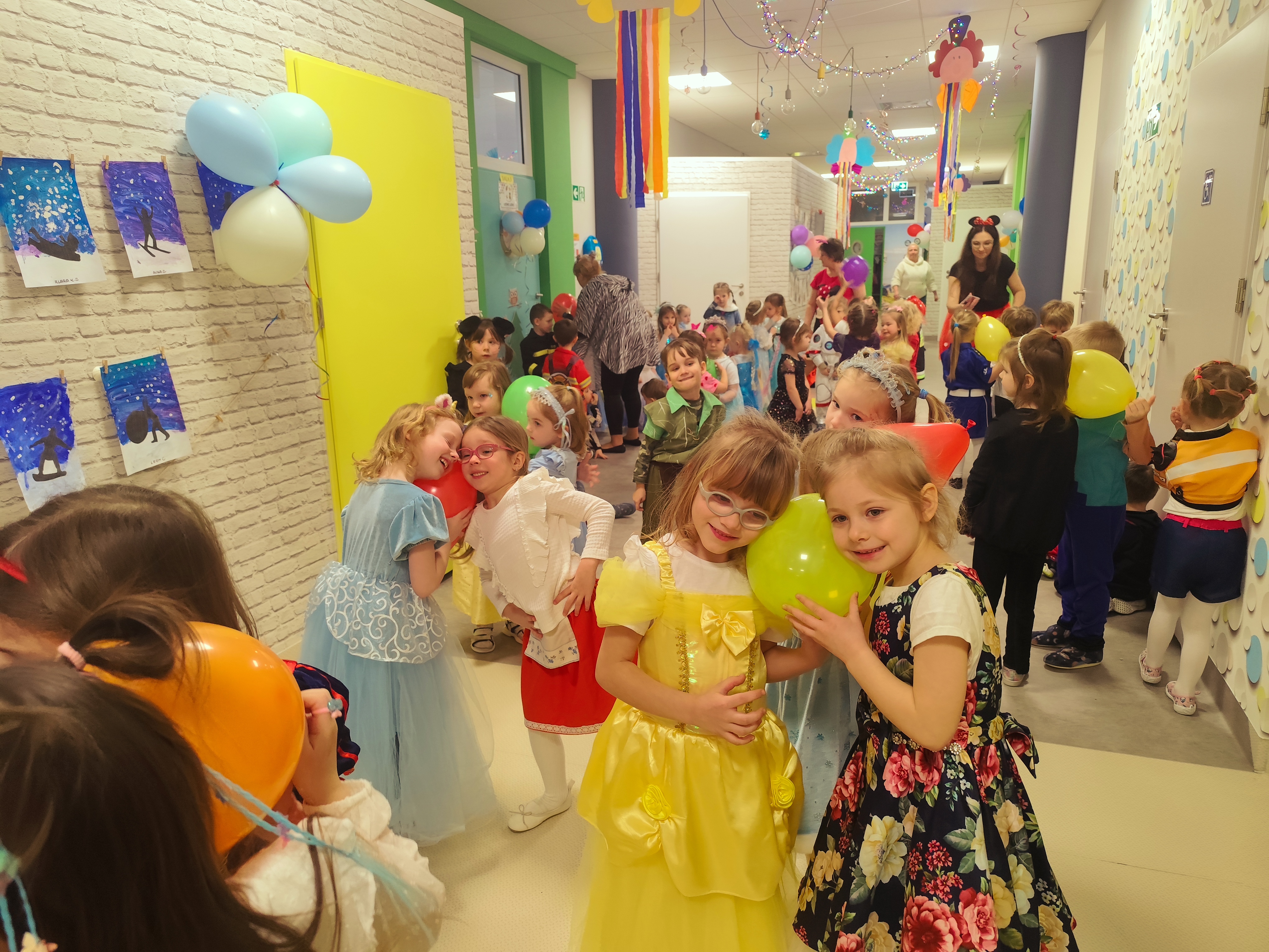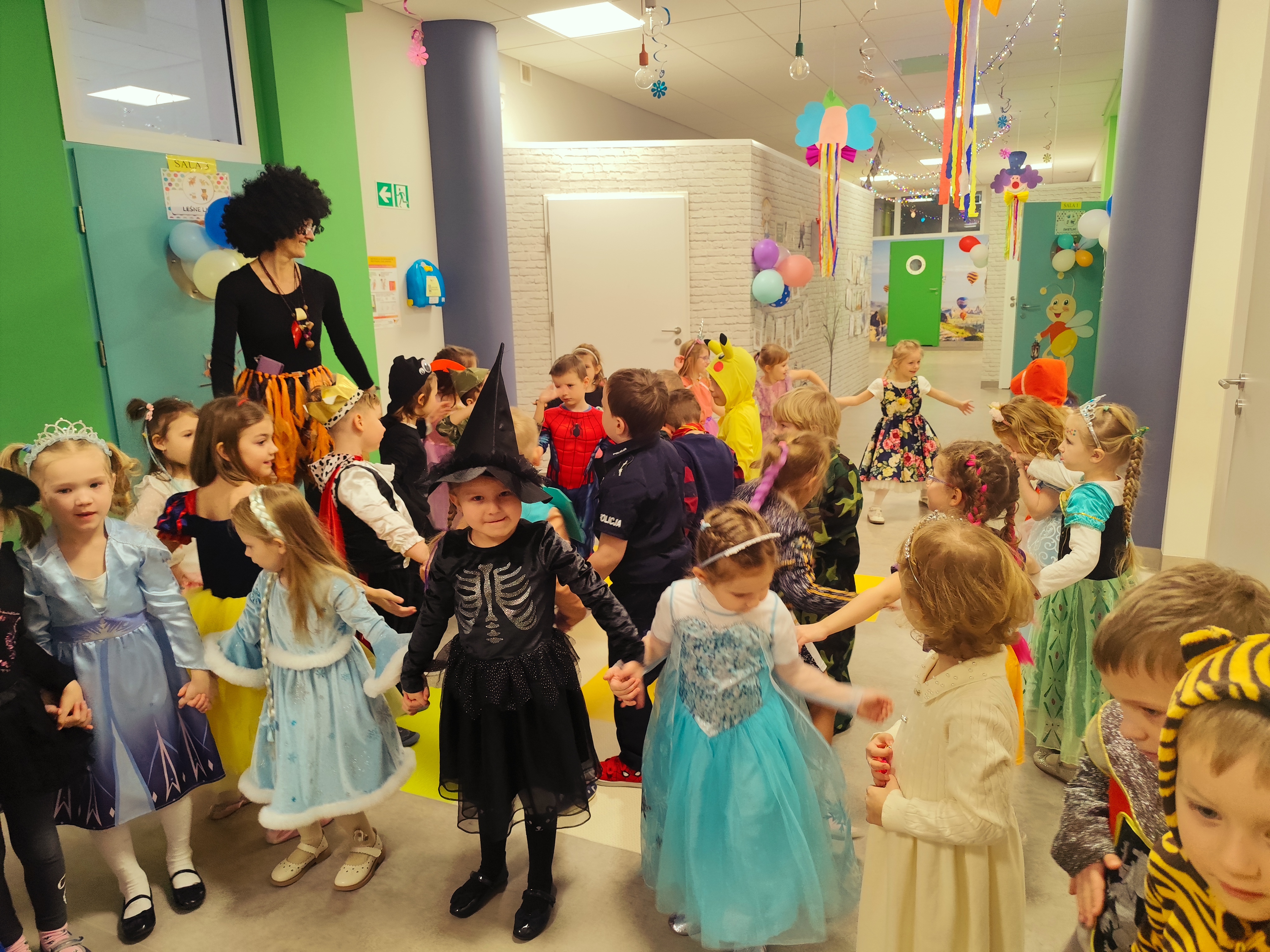 W poniedziałek, 9 lutego, w naszym przedszkolu odbył się bal karnawałowy, który przebiegł w radosnej i uroczystej atmosferze. Wydarzenie poprowadził Pan Artur Kochański - Firma Lokomotywa, zapewniając dzieciom bogaty program obejmujący tańce, zabawy integracyjne oraz konkursy. Dużą atrakcją były efektowne bańki mydlane, które dostarczyły uczestnikom wiele radości. W krótkiej przerwie na dzieci czekał poczęstunek.