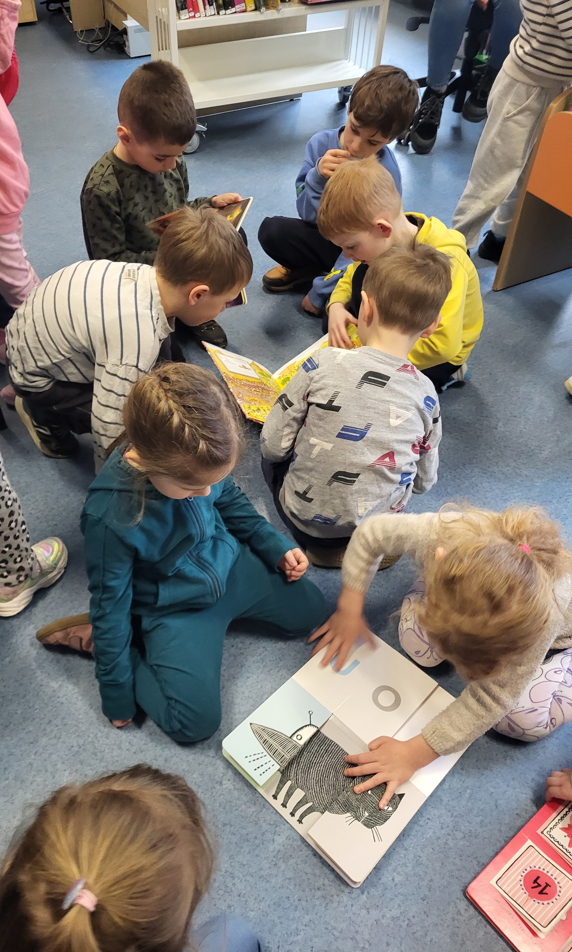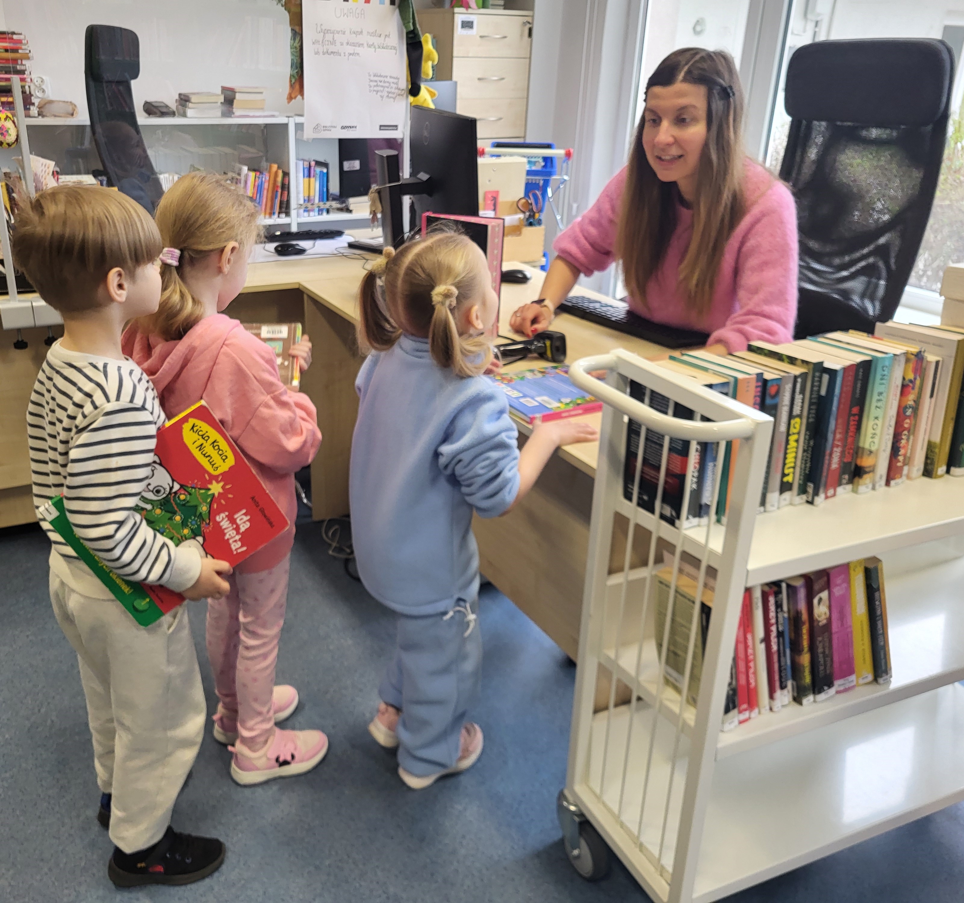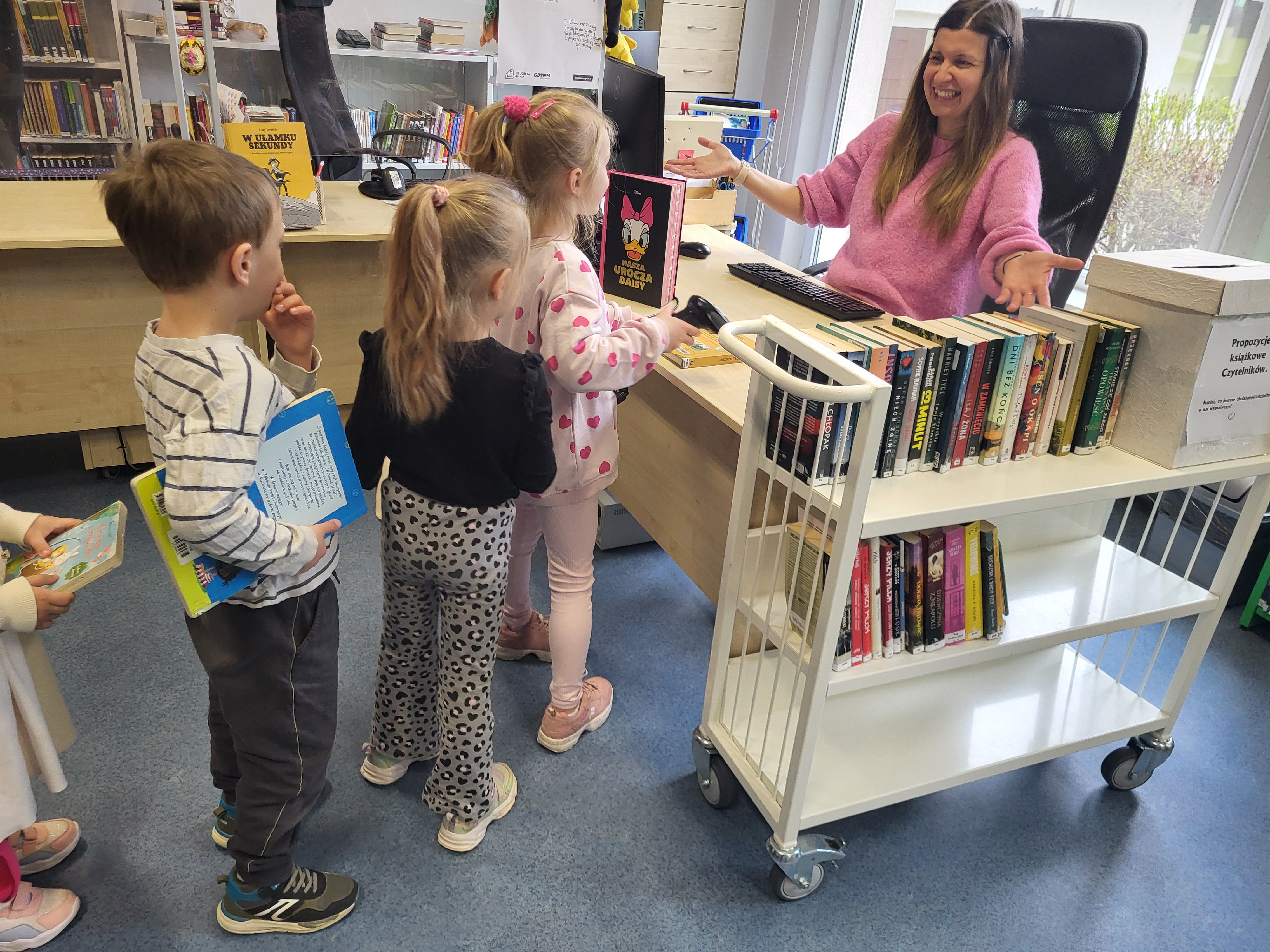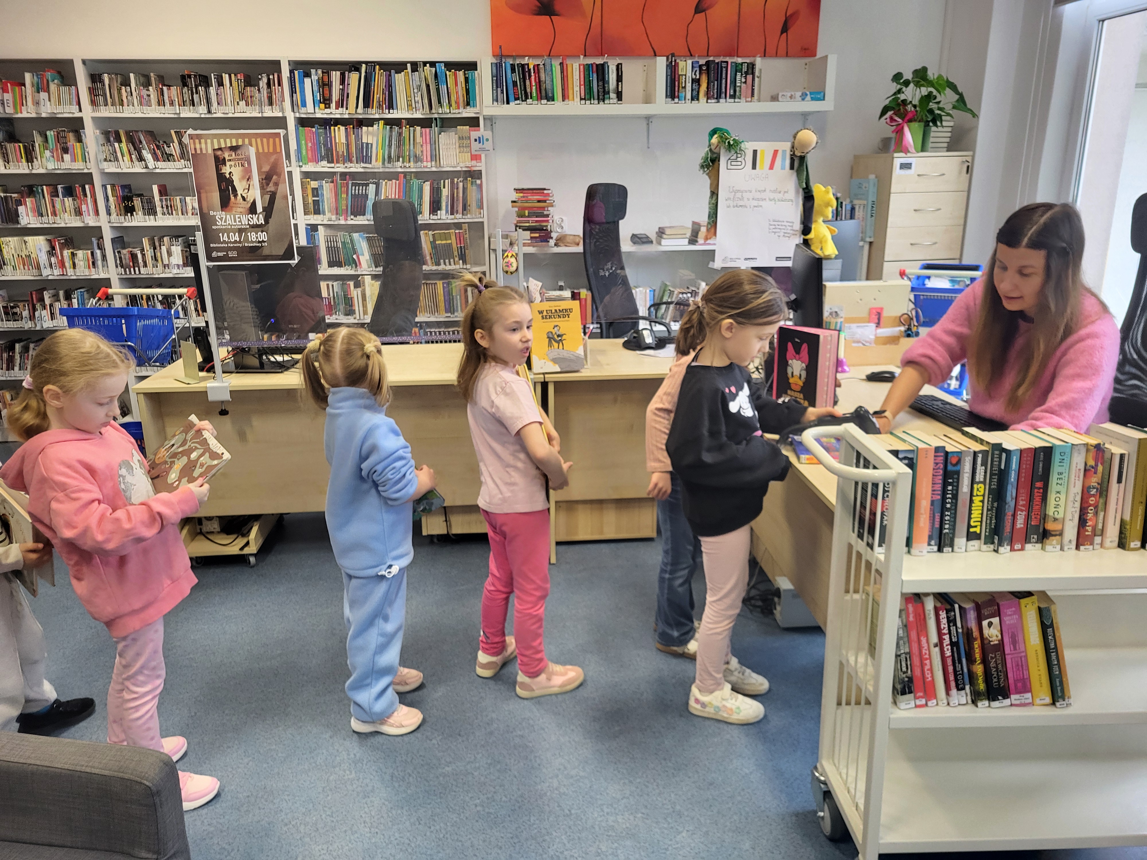 Dziś Świetliki odwiedziły bibliotekę publiczną obok naszego przedszkola. Celem wizyty było rozwijanie zainteresowań czytelniczych wśród dzieci. Przywitała nas pani bibliotekarka. Najpierw przedszkolaki wysłuchały bajki, a następnie poszukiwały kart bibliotecznych. Potem, Świetliki zapoznały się ze sposobem wypożyczania książek. Bawiły się również w bibliotekarzy, samodzielnie skanując poszczególne egzemplarze książek. Dzieci zostały oprowadzone po bibliotece i z wielkim zainteresowaniem oglądały książki znajdujące się na półkach. Szczególnie zainteresował ich dział dla najmłodszych. Na koniec wszystkie dzieci gorąco podziękowały pani bibliotekarce wręczając jej pamiątkowy dyplom oraz własnoręcznie przygotowane rysunki.