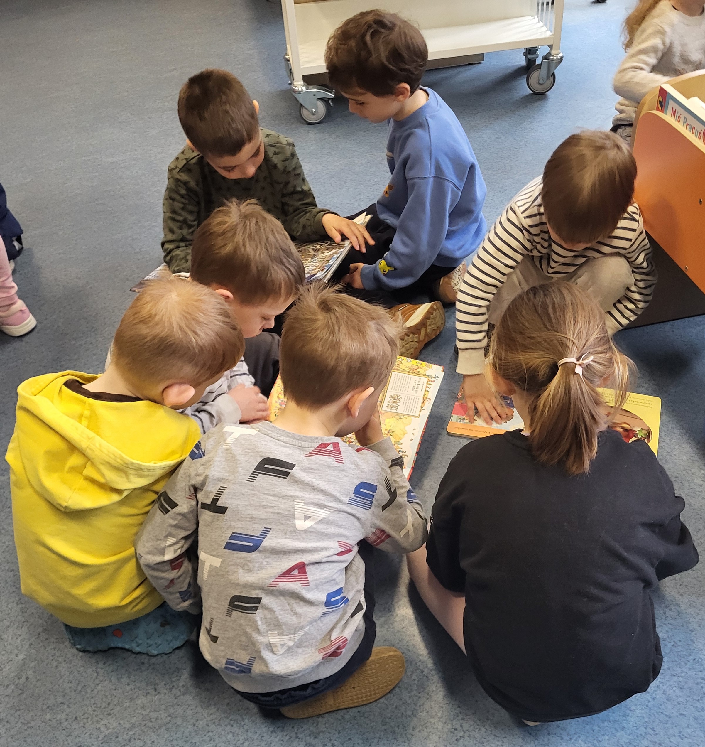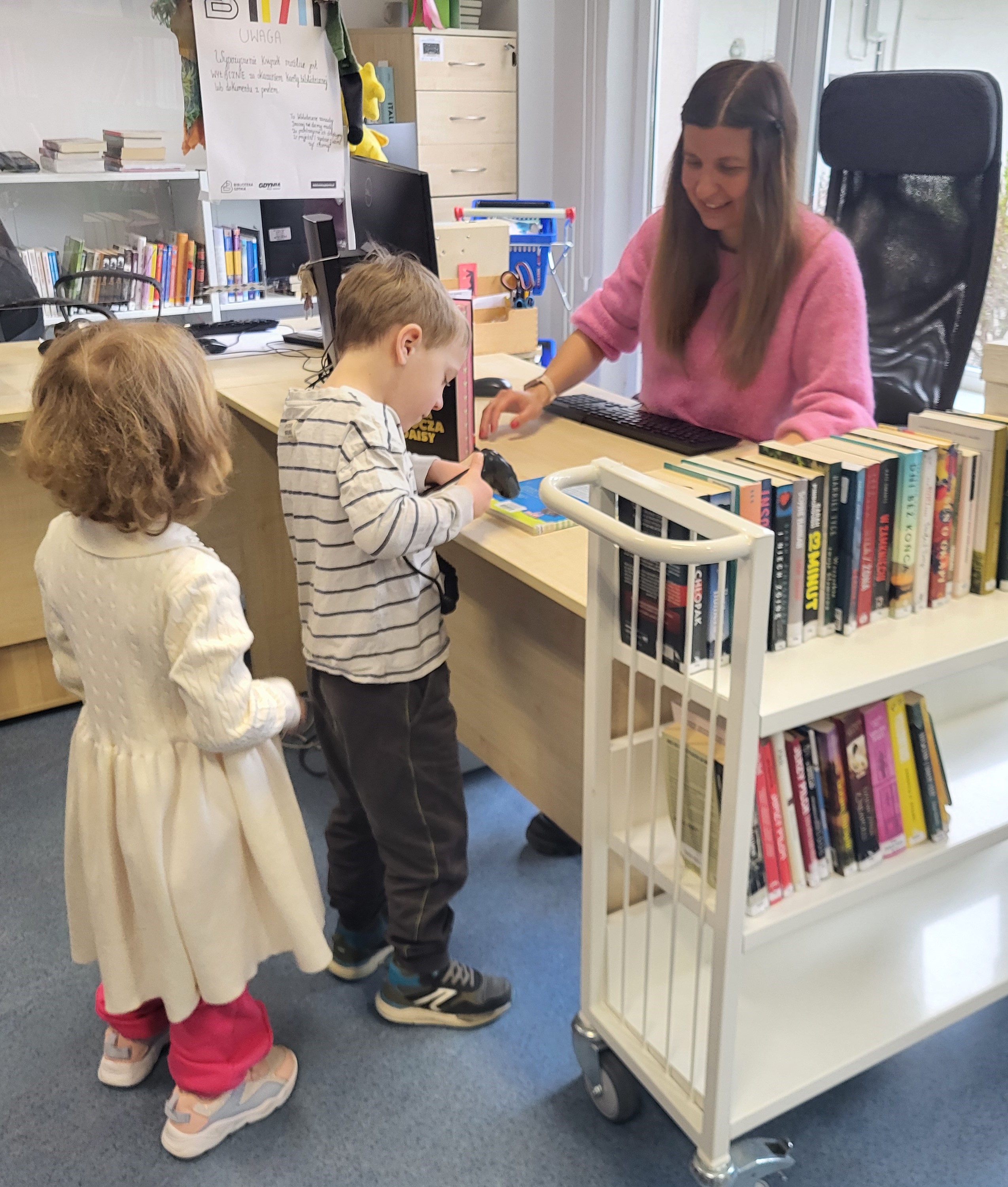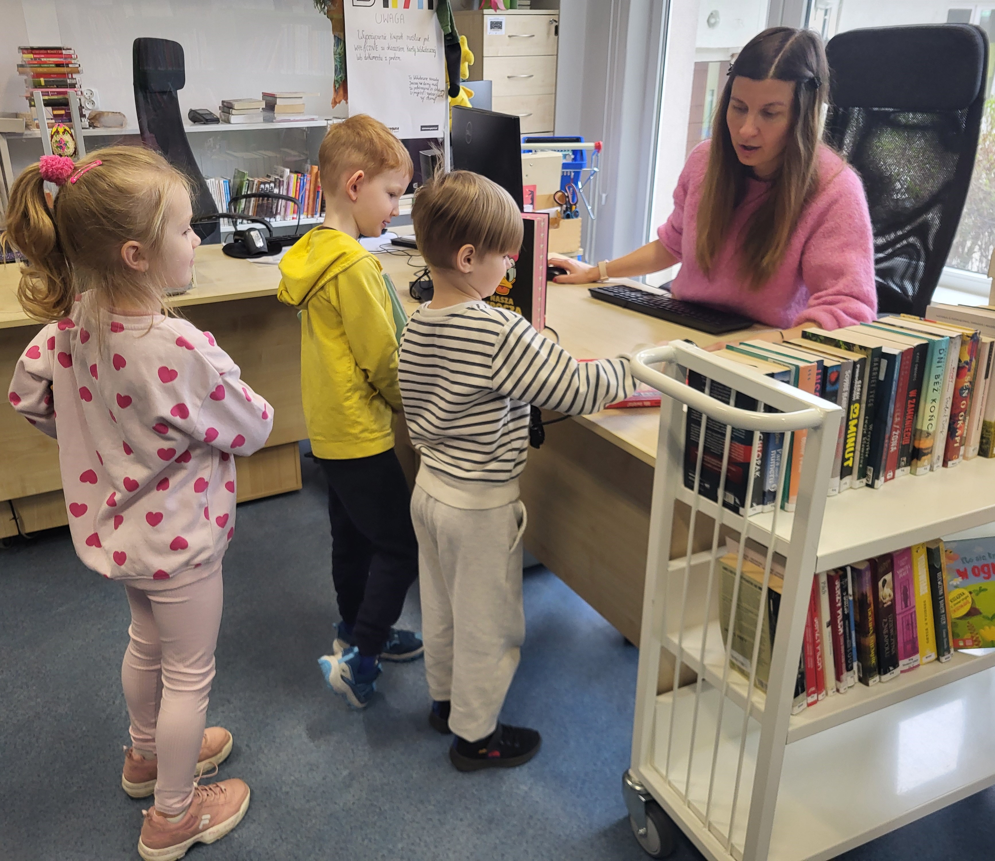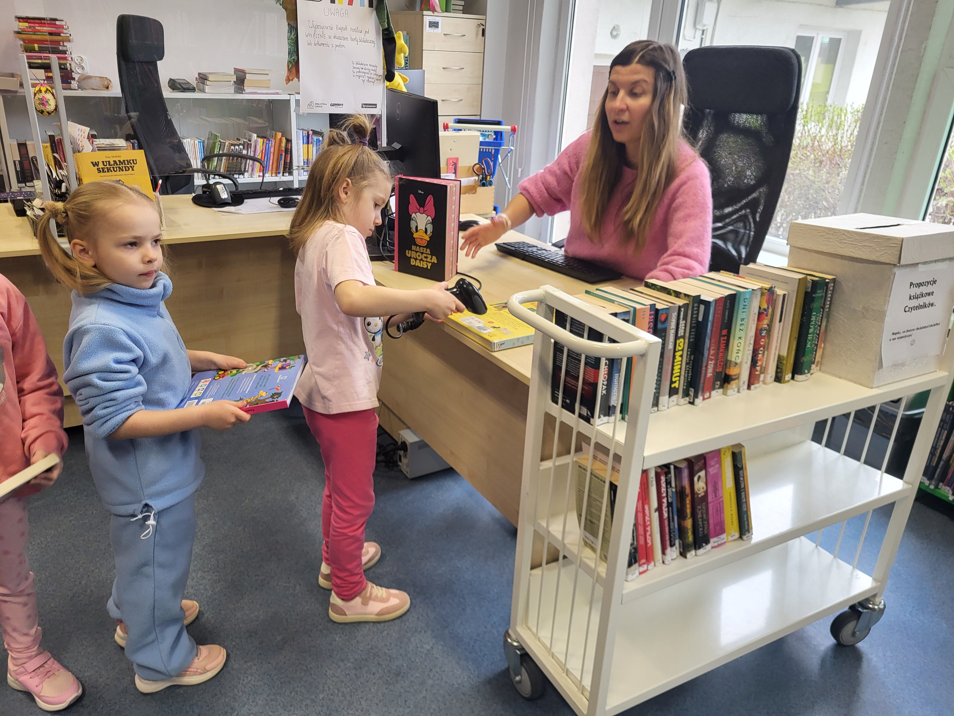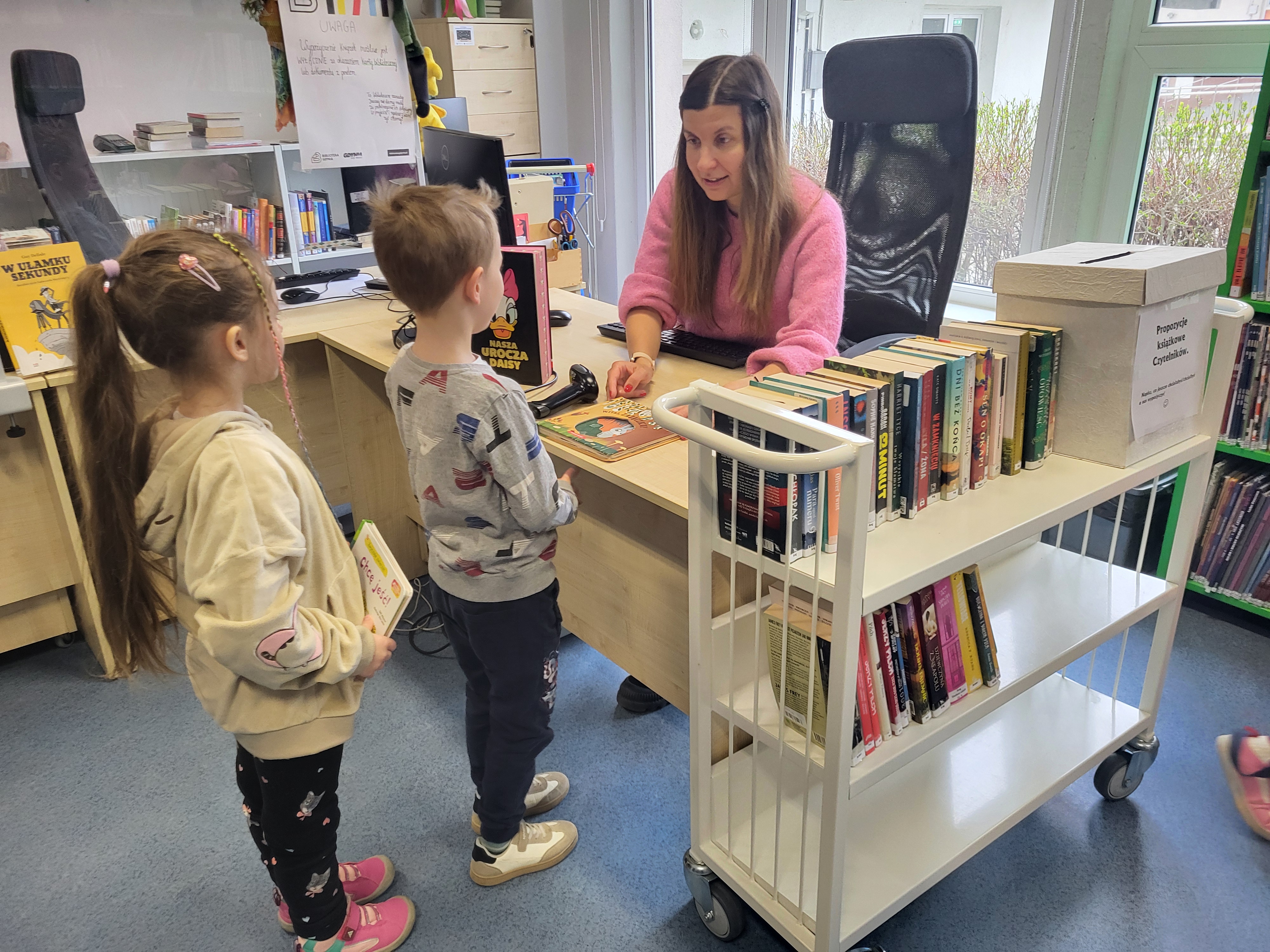 Dziś Świetliki odwiedziły bibliotekę publiczną obok naszego przedszkola. Celem wizyty było rozwijanie zainteresowań czytelniczych wśród dzieci. Przywitała nas pani bibliotekarka. Najpierw przedszkolaki wysłuchały bajki, a następnie poszukiwały kart bibliotecznych. Potem, Świetliki zapoznały się ze sposobem wypożyczania książek. Bawiły się również w bibliotekarzy, samodzielnie skanując poszczególne egzemplarze książek. Dzieci zostały oprowadzone po bibliotece i z wielkim zainteresowaniem oglądały książki znajdujące się na półkach. Szczególnie zainteresował ich dział dla najmłodszych. Na koniec wszystkie dzieci gorąco podziękowały pani bibliotekarce wręczając jej pamiątkowy dyplom oraz własnoręcznie przygotowane rysunki.